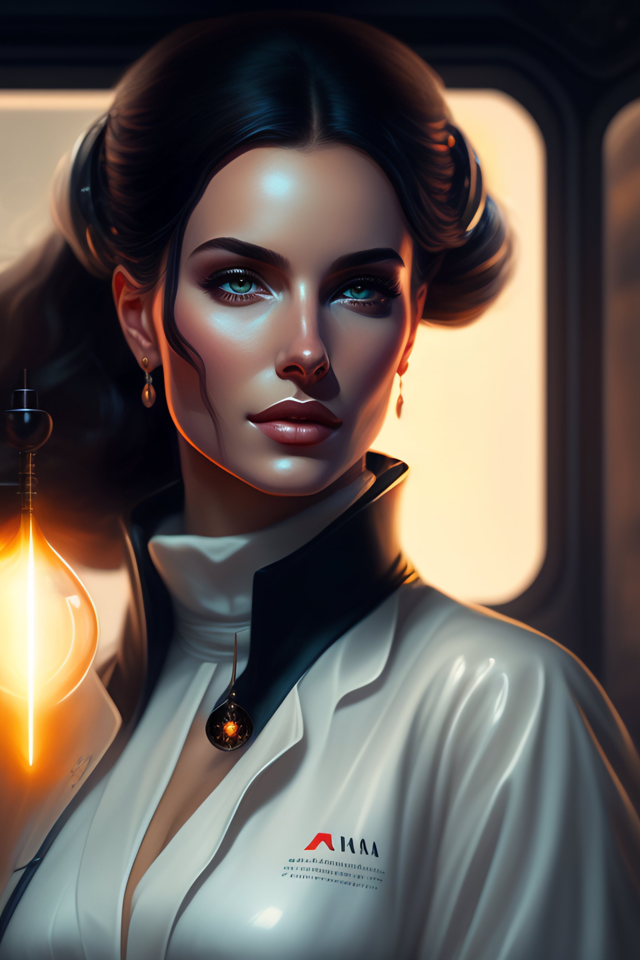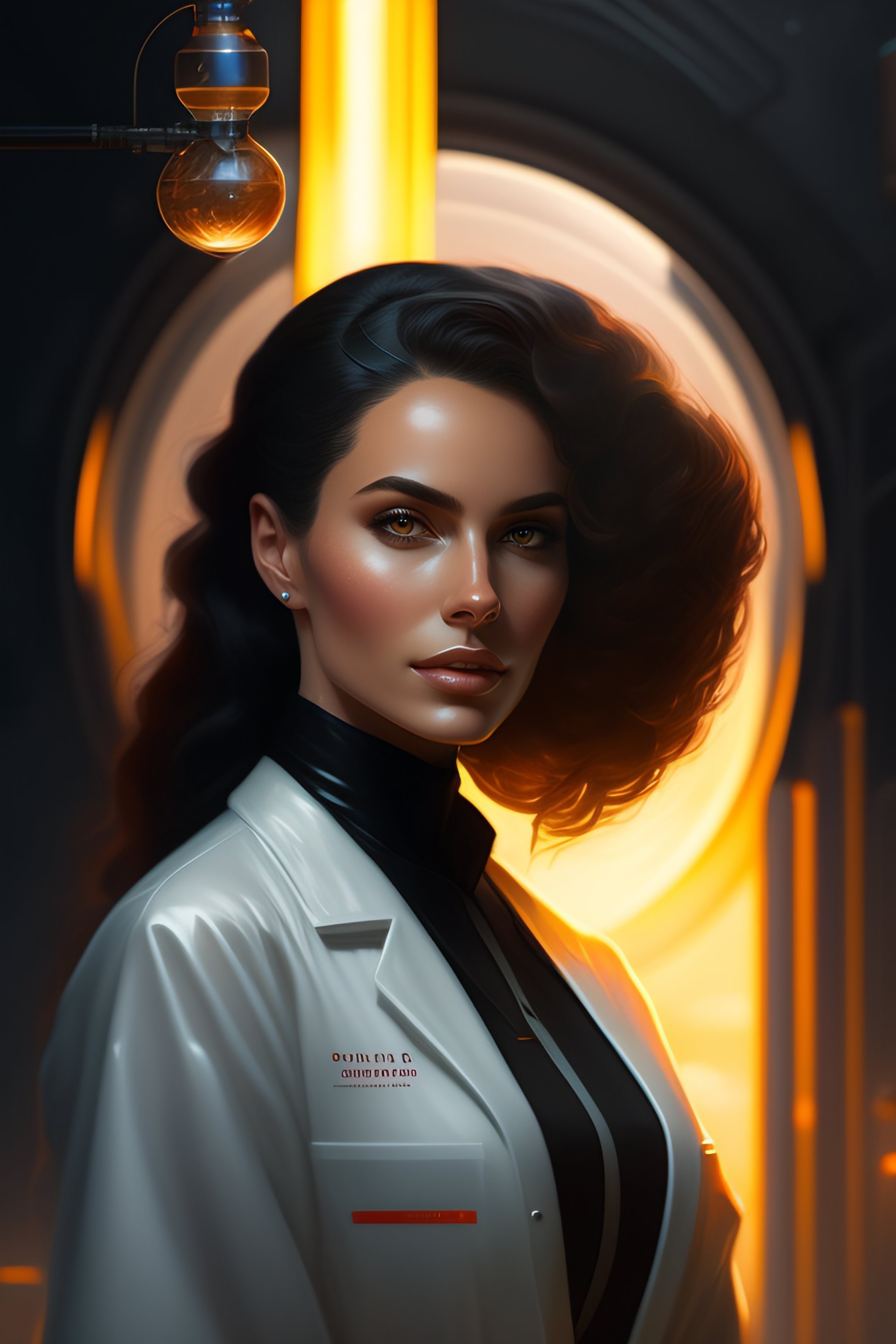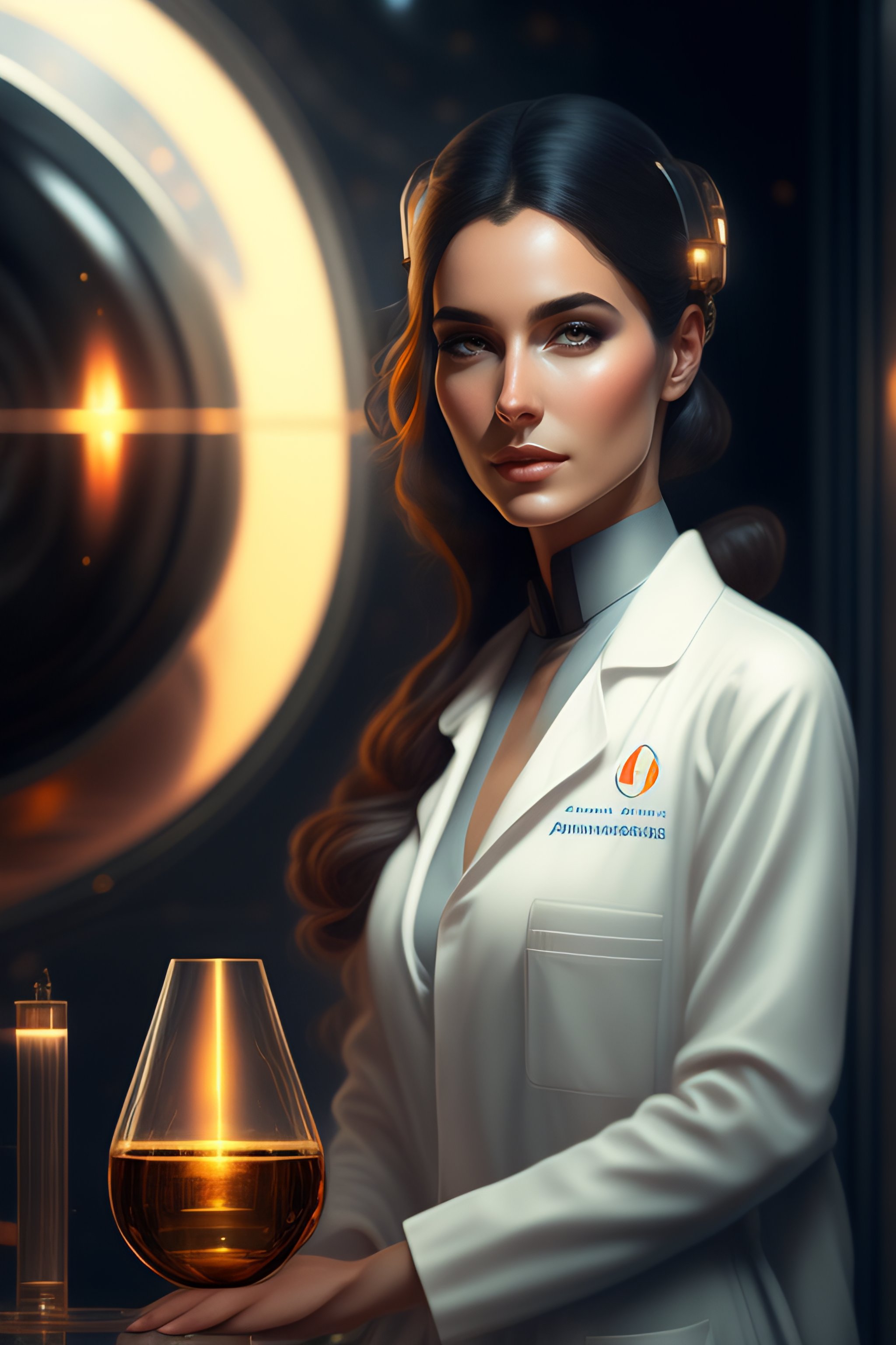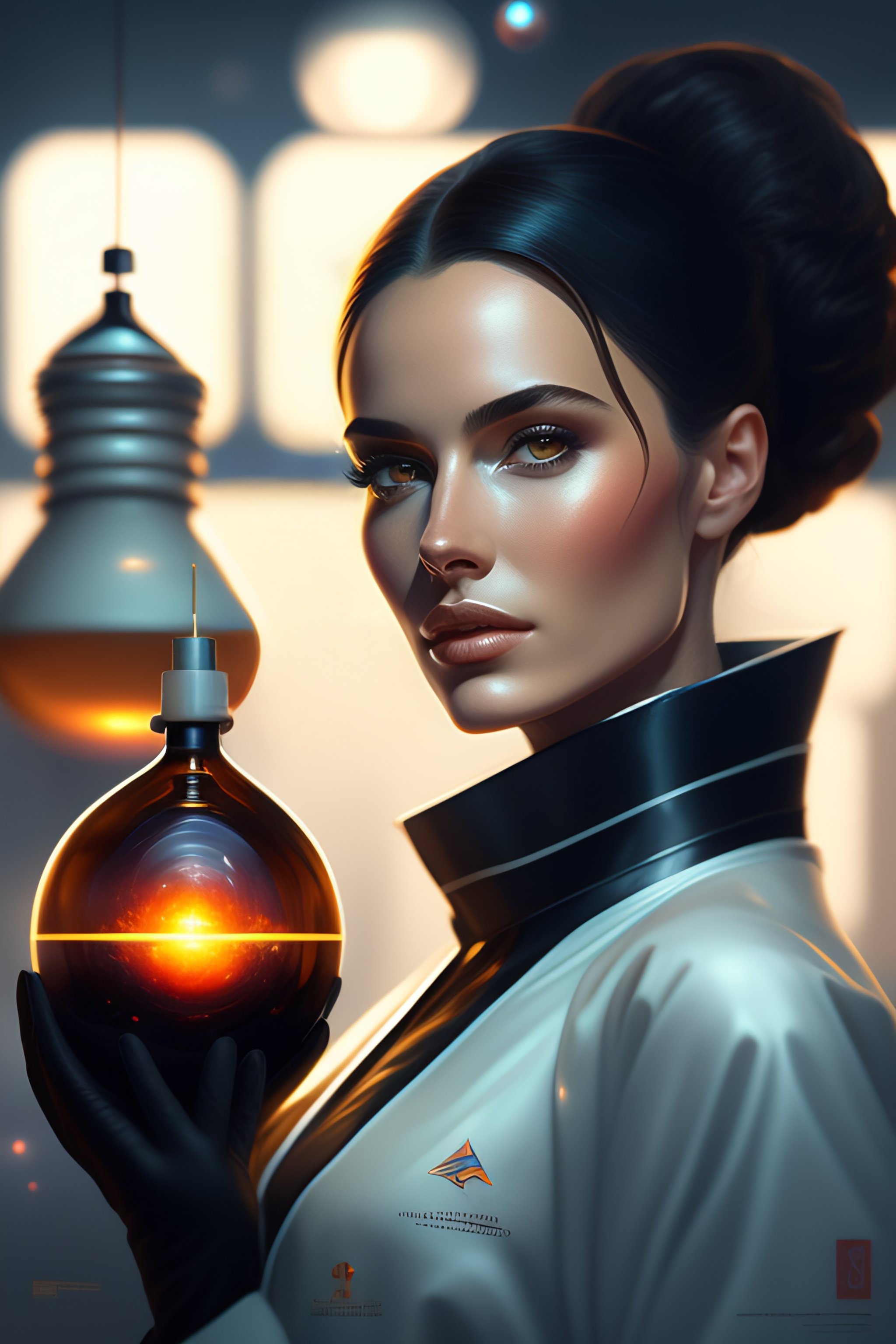 A portrait art of a beautiful female scientist in a laboratory holding a small black hole in her hands, inspired art by istvan pandolfi and greg rutkowski, concept art, stylized, elegant, illustration, high quality, highly detailed, long hair, digital art, futuristic art style, artstation