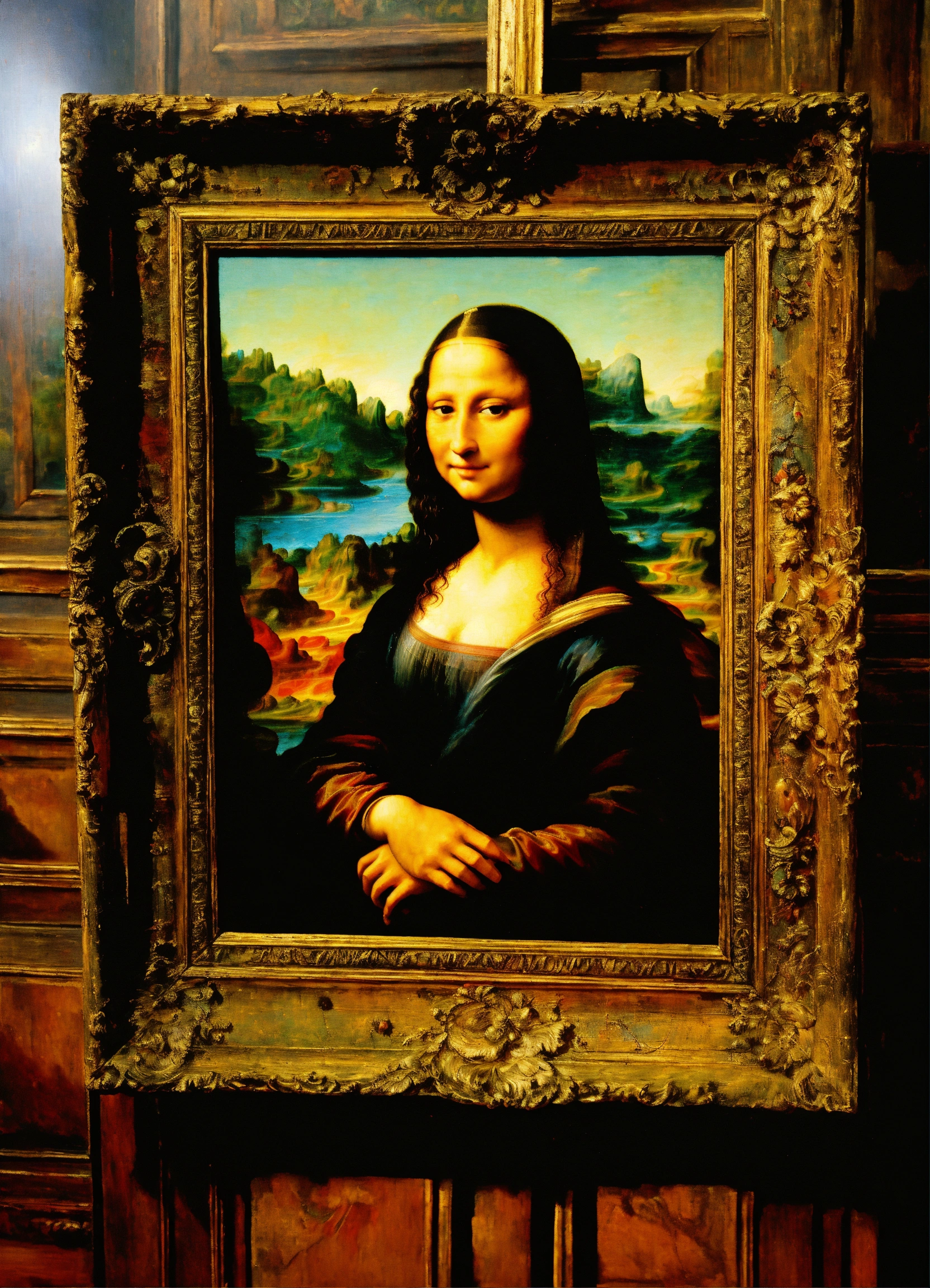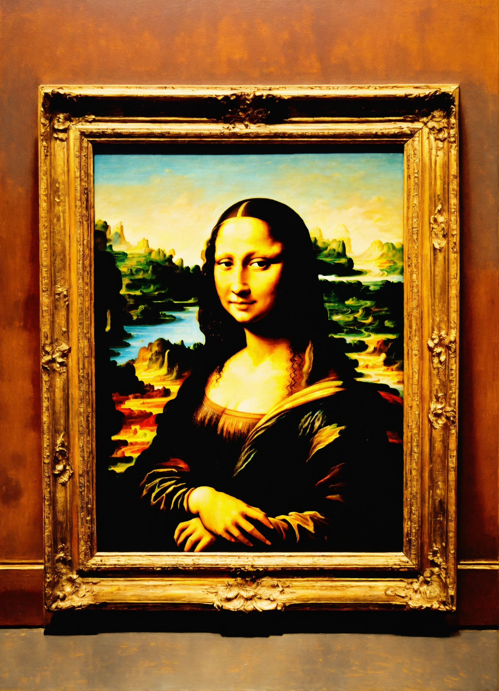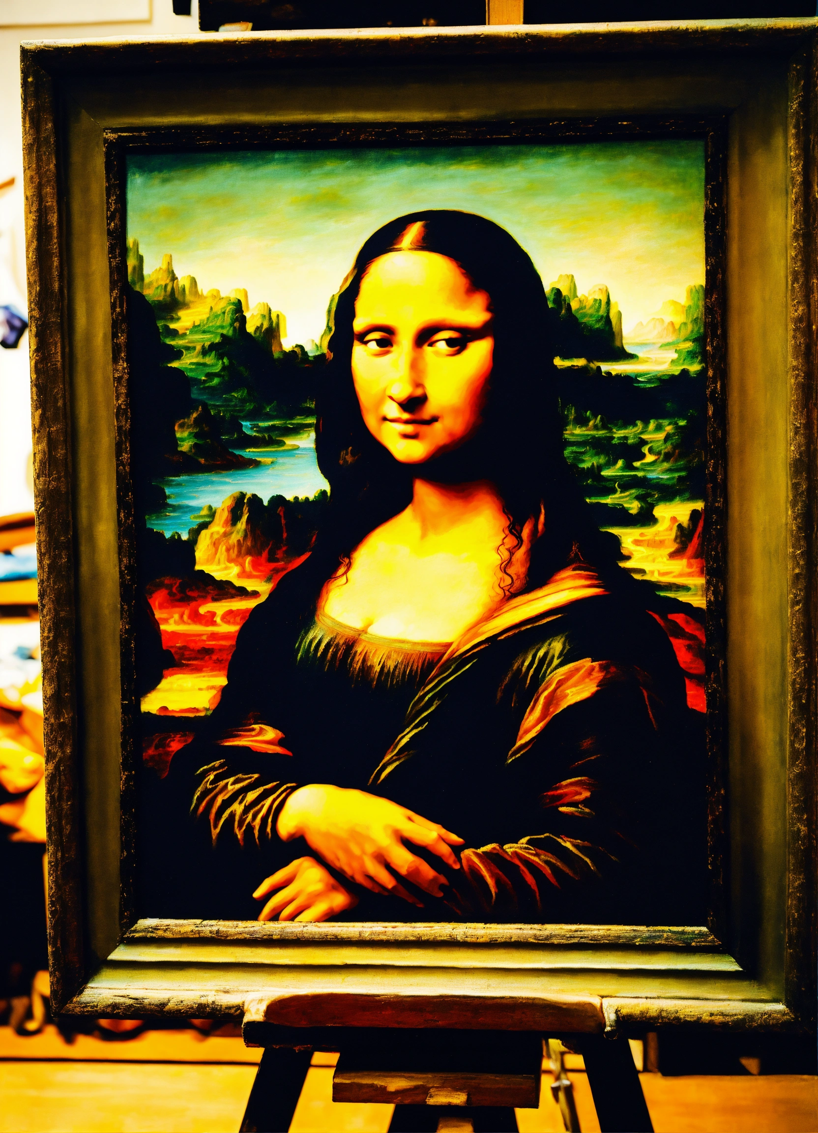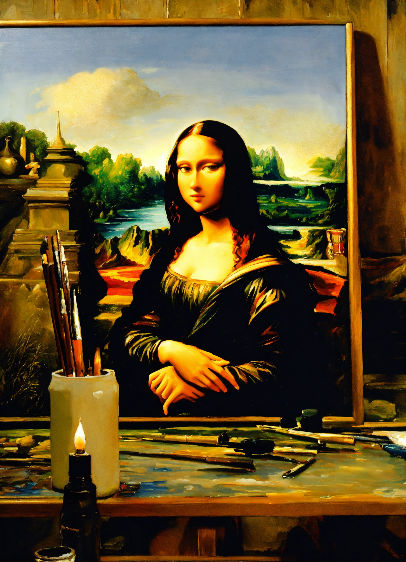 Detailed oil painting of the background of a canvas, which only shows the details of the landscape behind the portrait of the mona lisa, in a florentine art studio.
