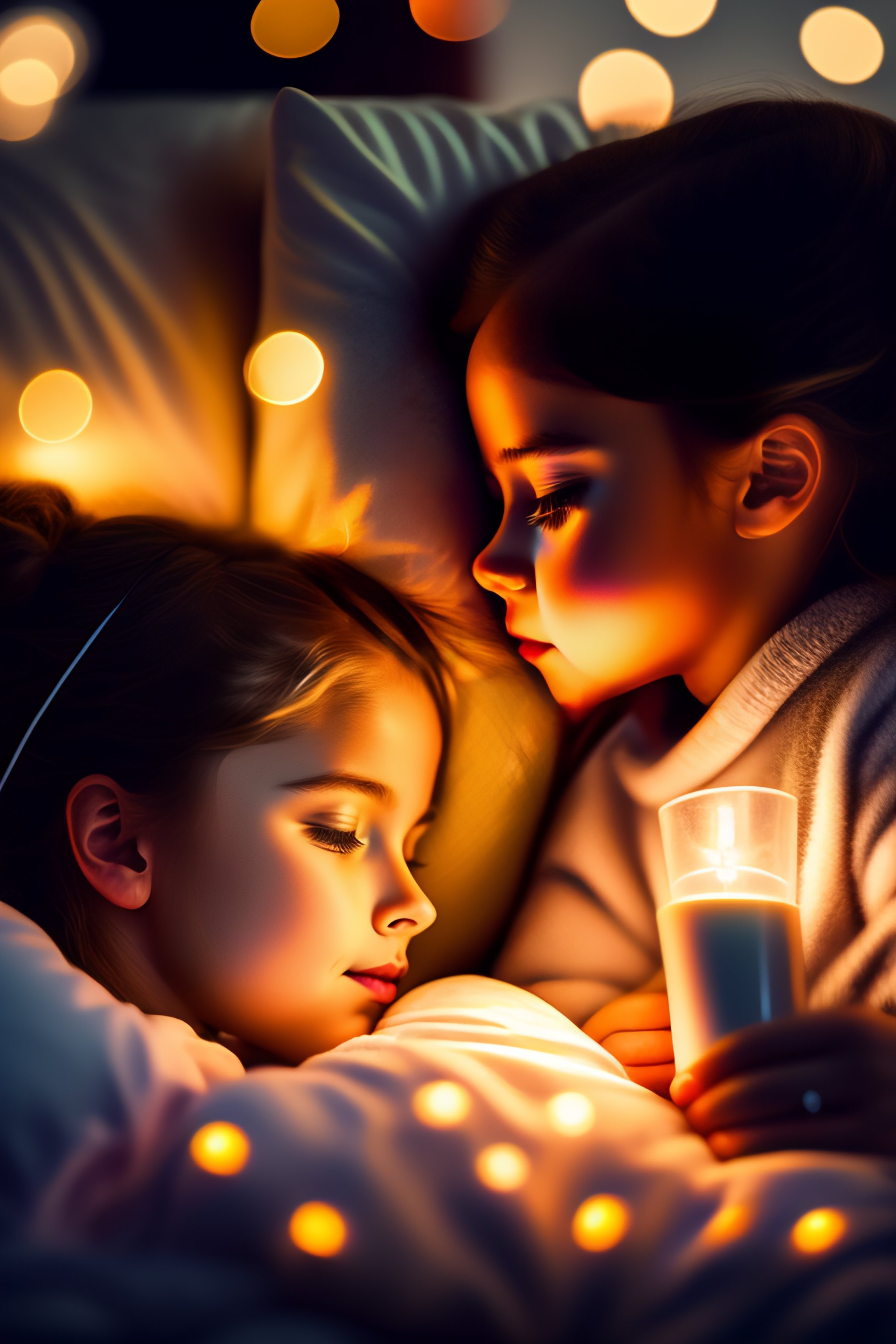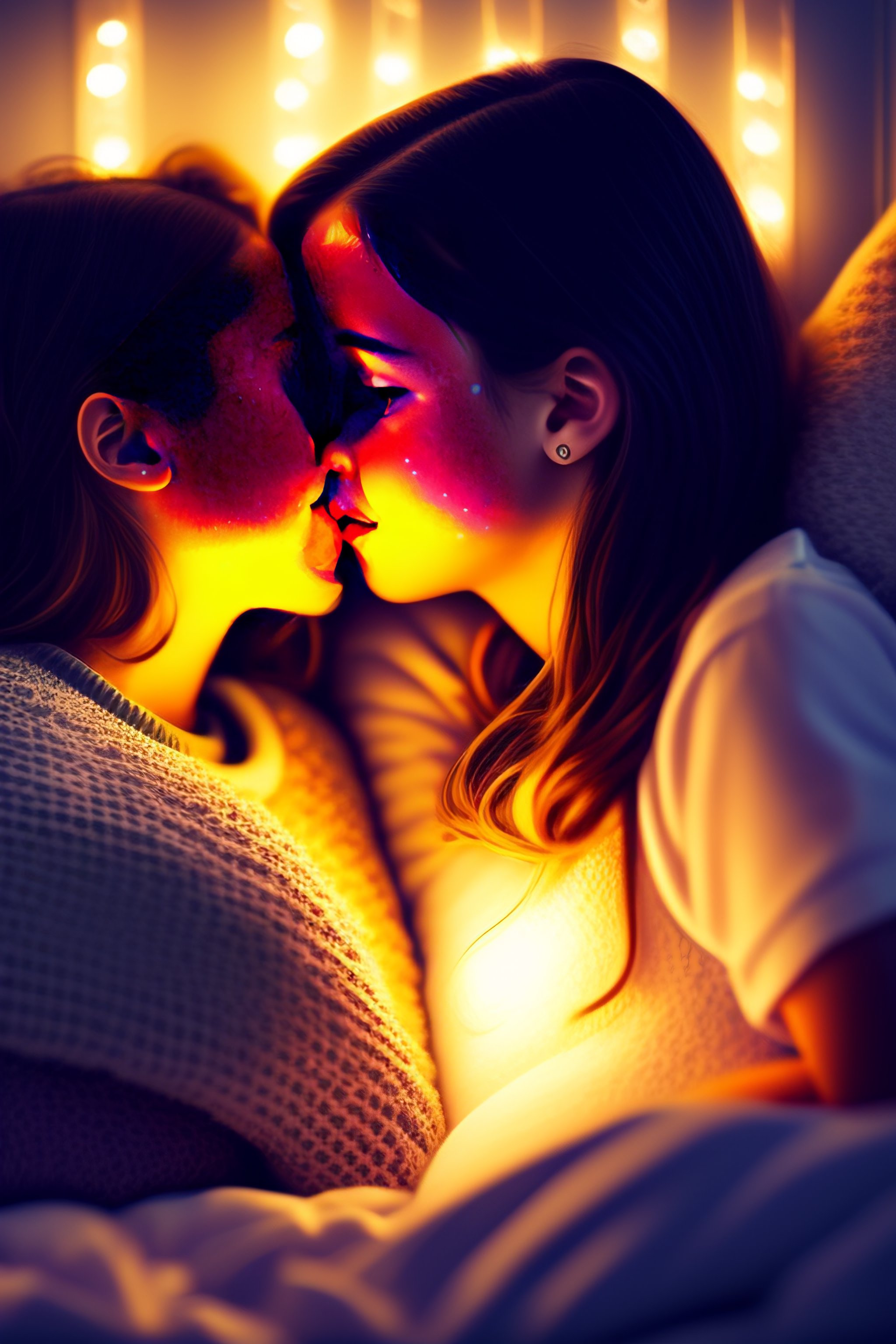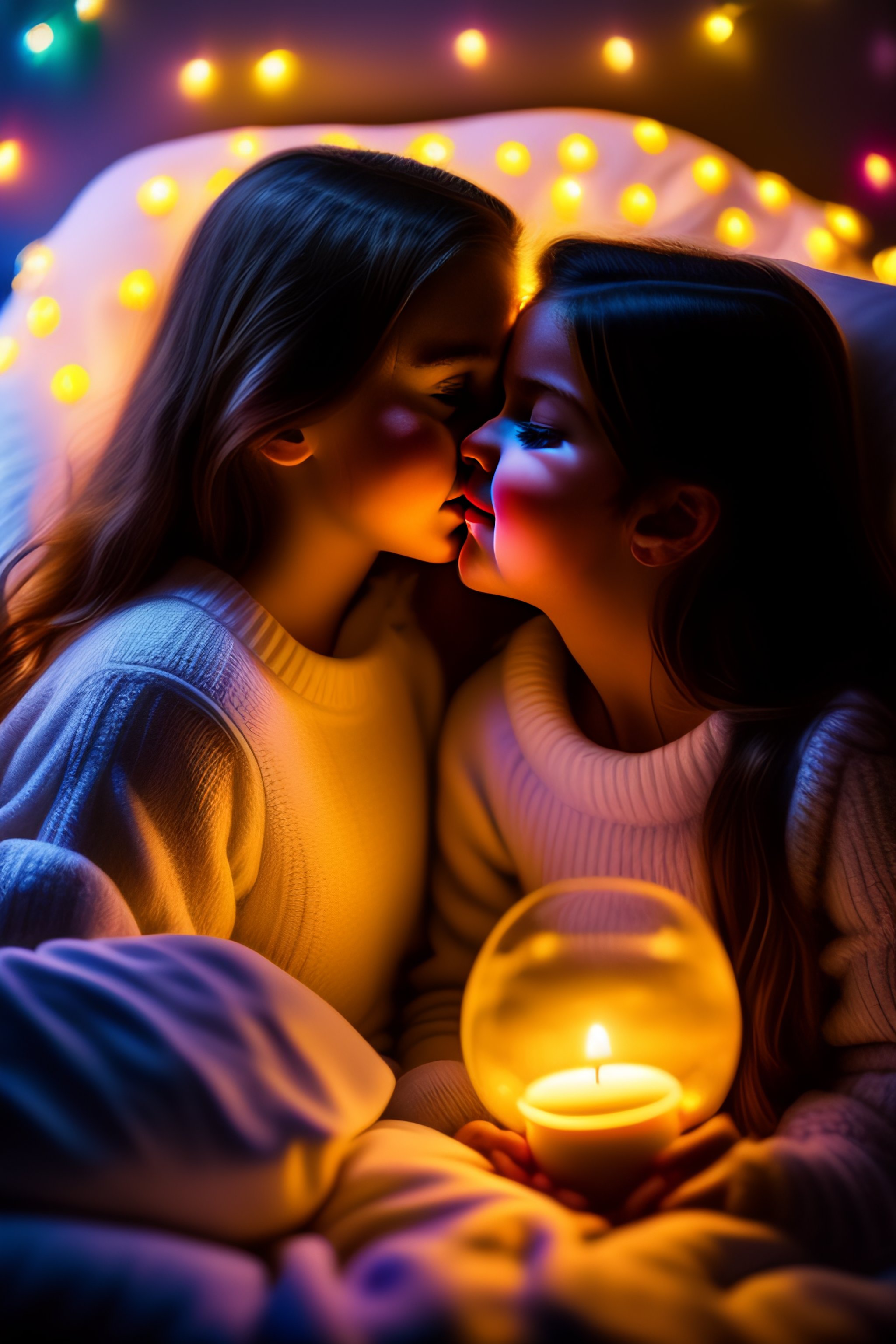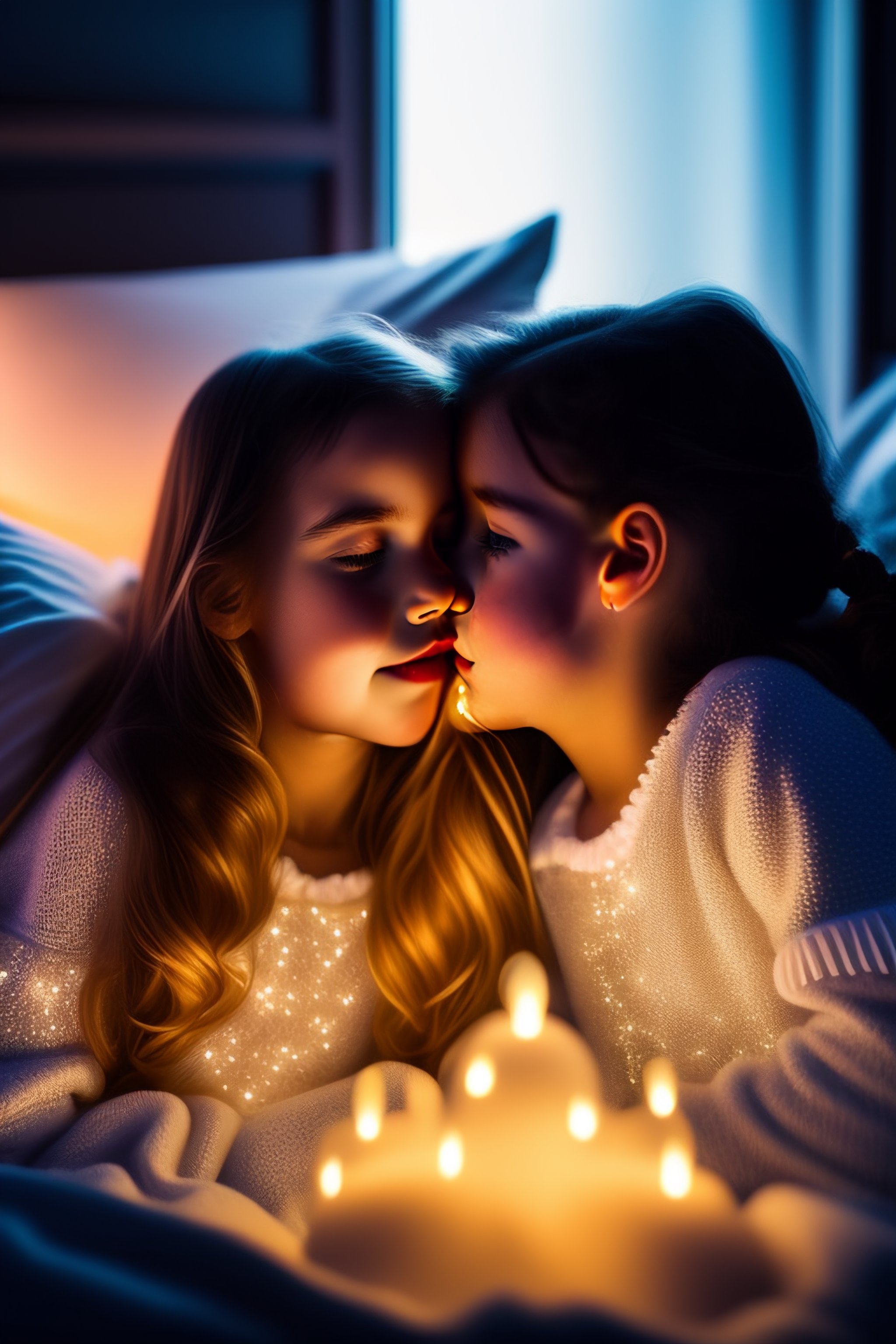 Beautiful, photo-realistic picture of two ten year old girls kissing and in bed!, intricate, elegant, glowing lights, highly detailed, photo-realistic, smooth, sharp focus, french maid
