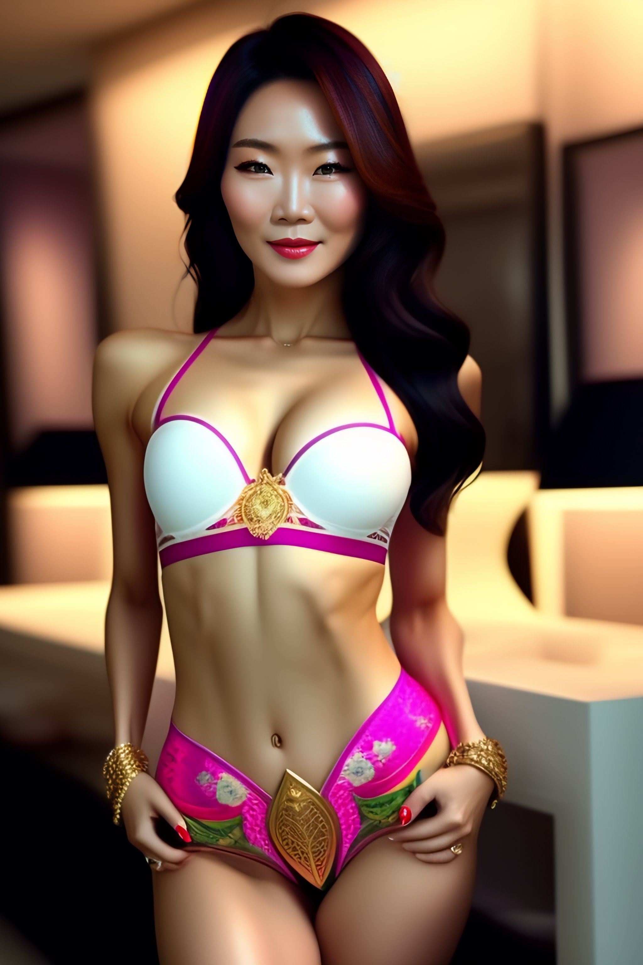 Attractive sexy korean female model in her forties wearing revealing ornate and decorative tight victoria secret, abs showing, posing like a model, slim and slender, barber chair and bed in the background