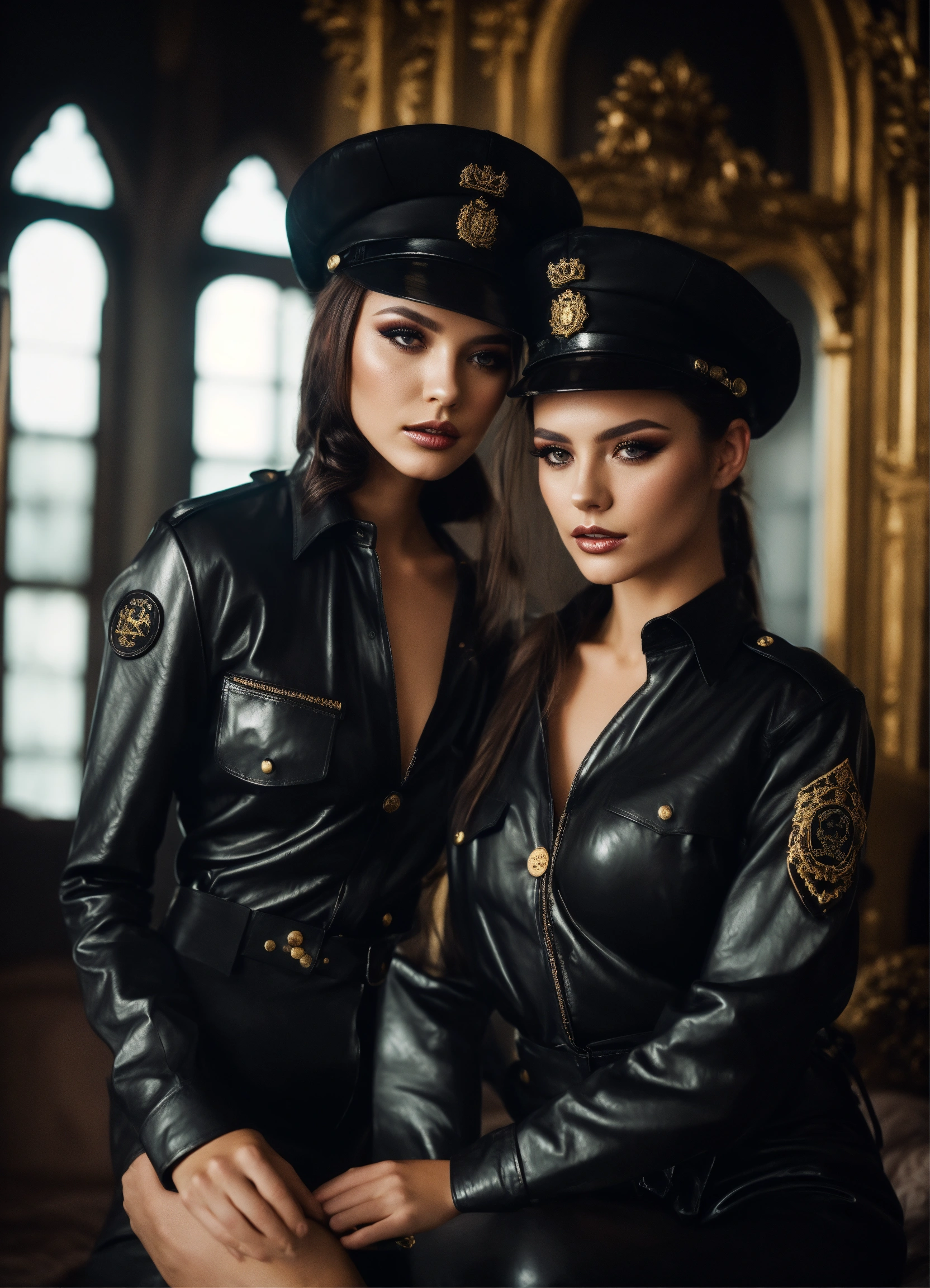 Brightly light photo, two stunning european women model, smoky eys makeup, brunette straight ponytail hair, strict black uniform shiny leather shirt with pockts and golden buttons short sleeves, black smooth shiny leather military cap, castle bedroom, leather bed linen