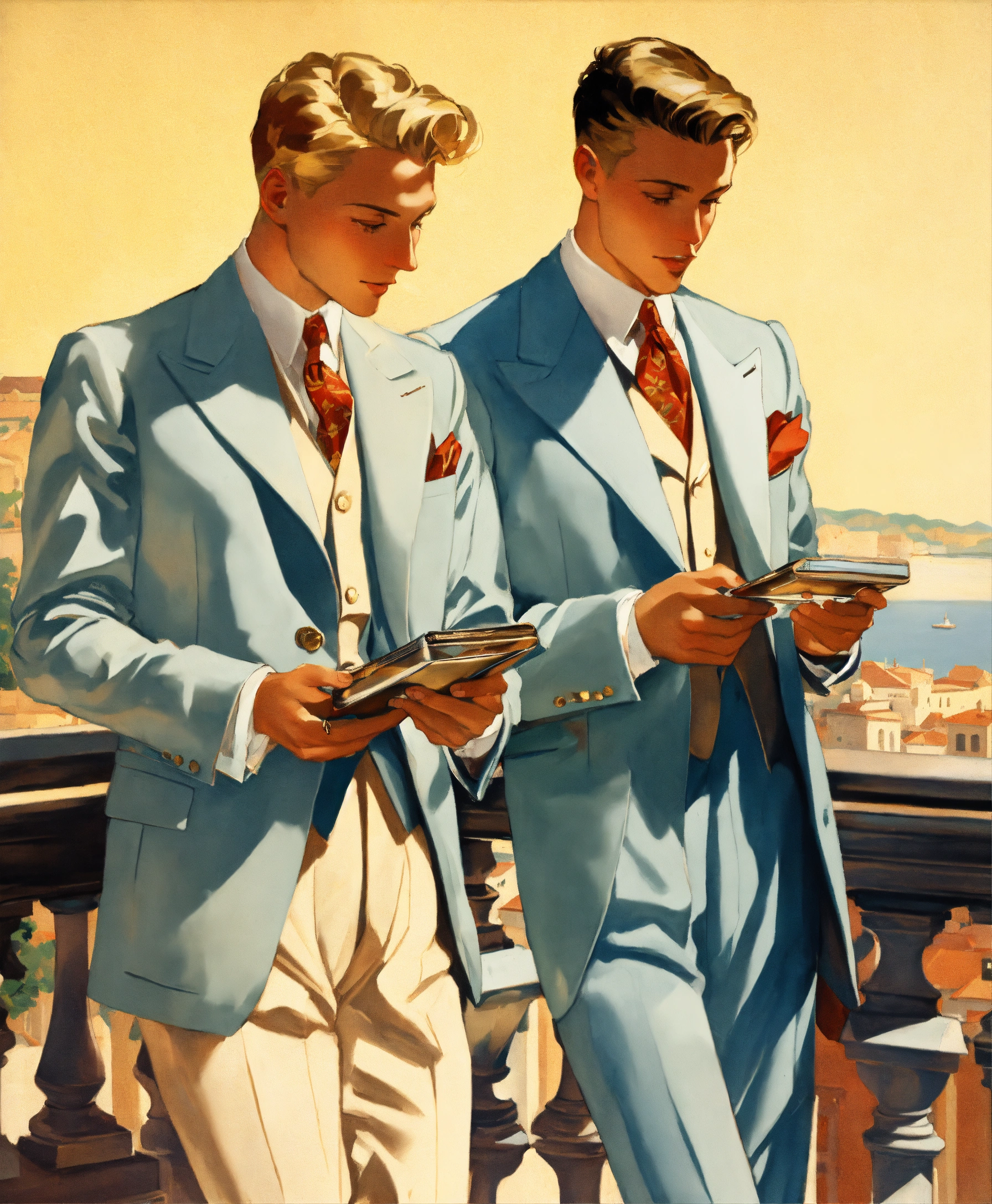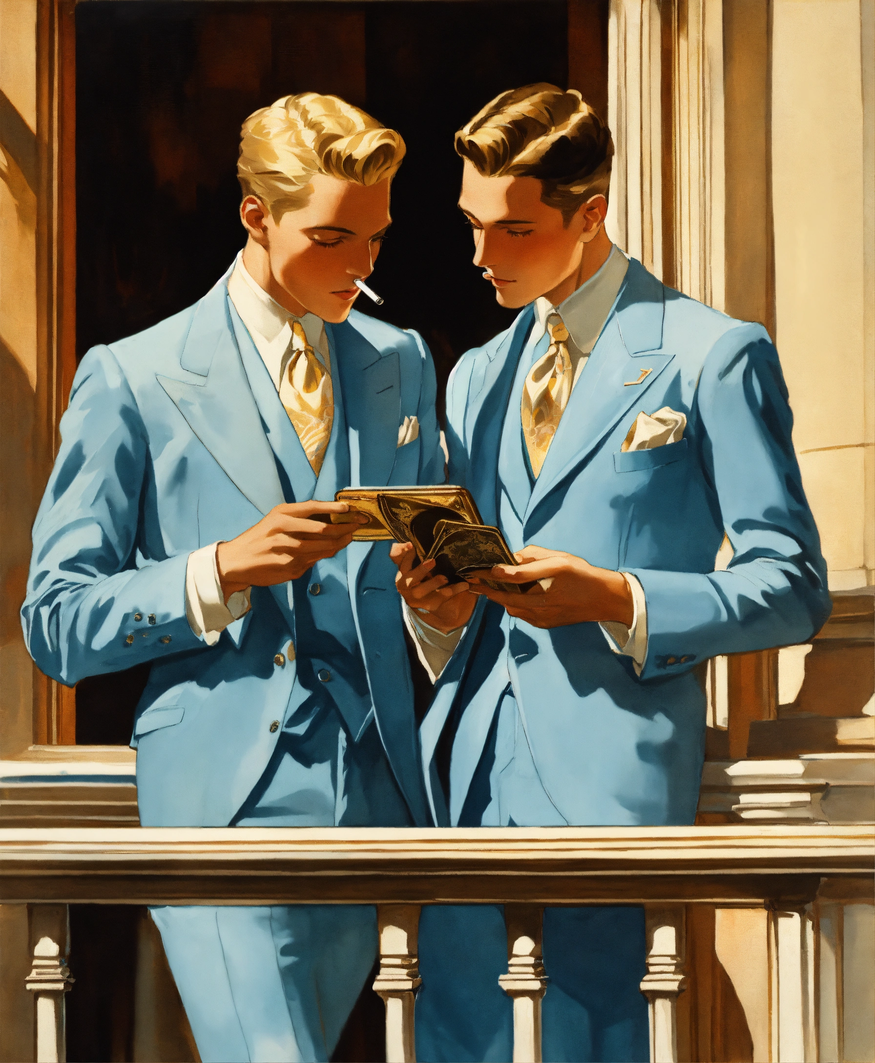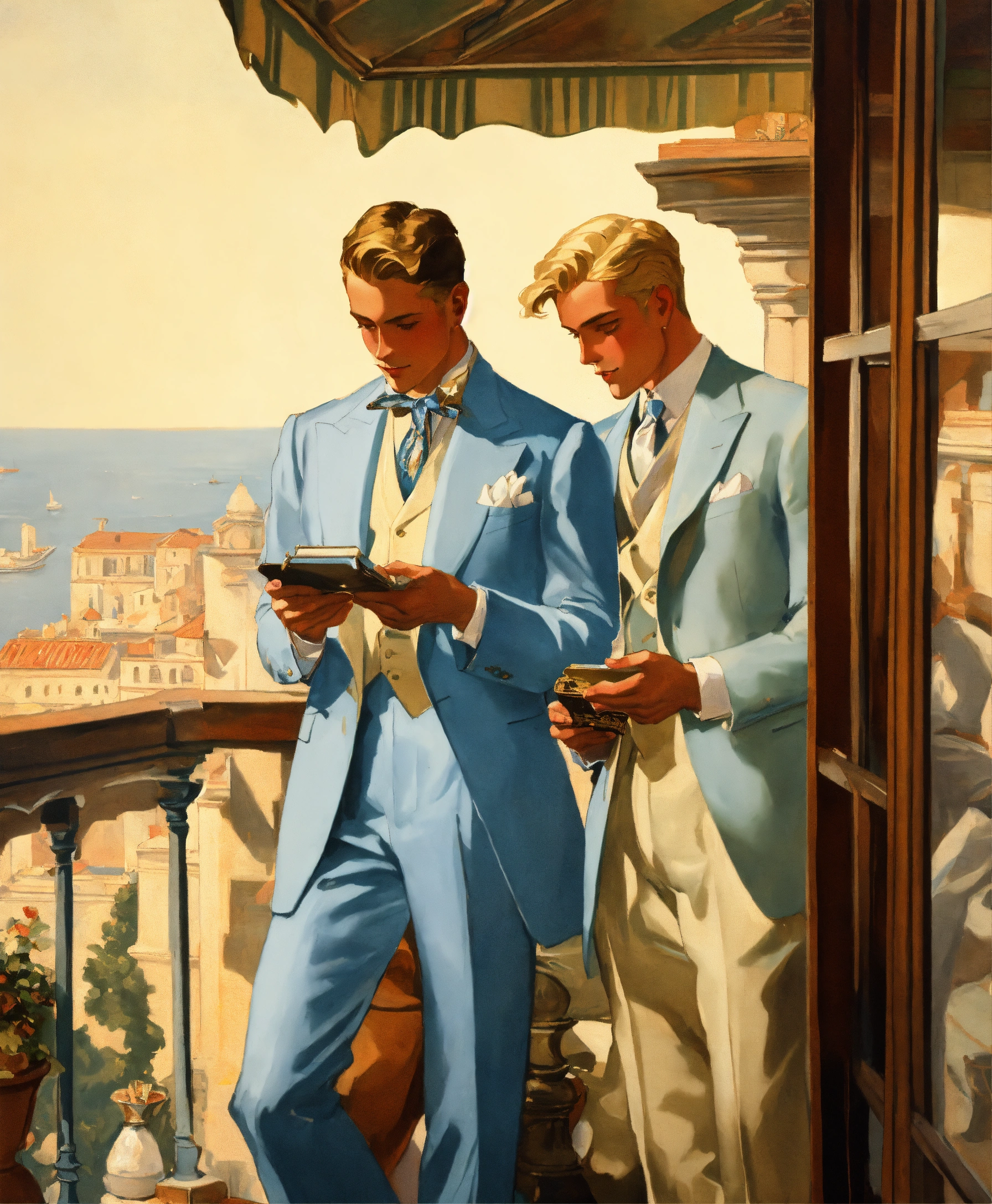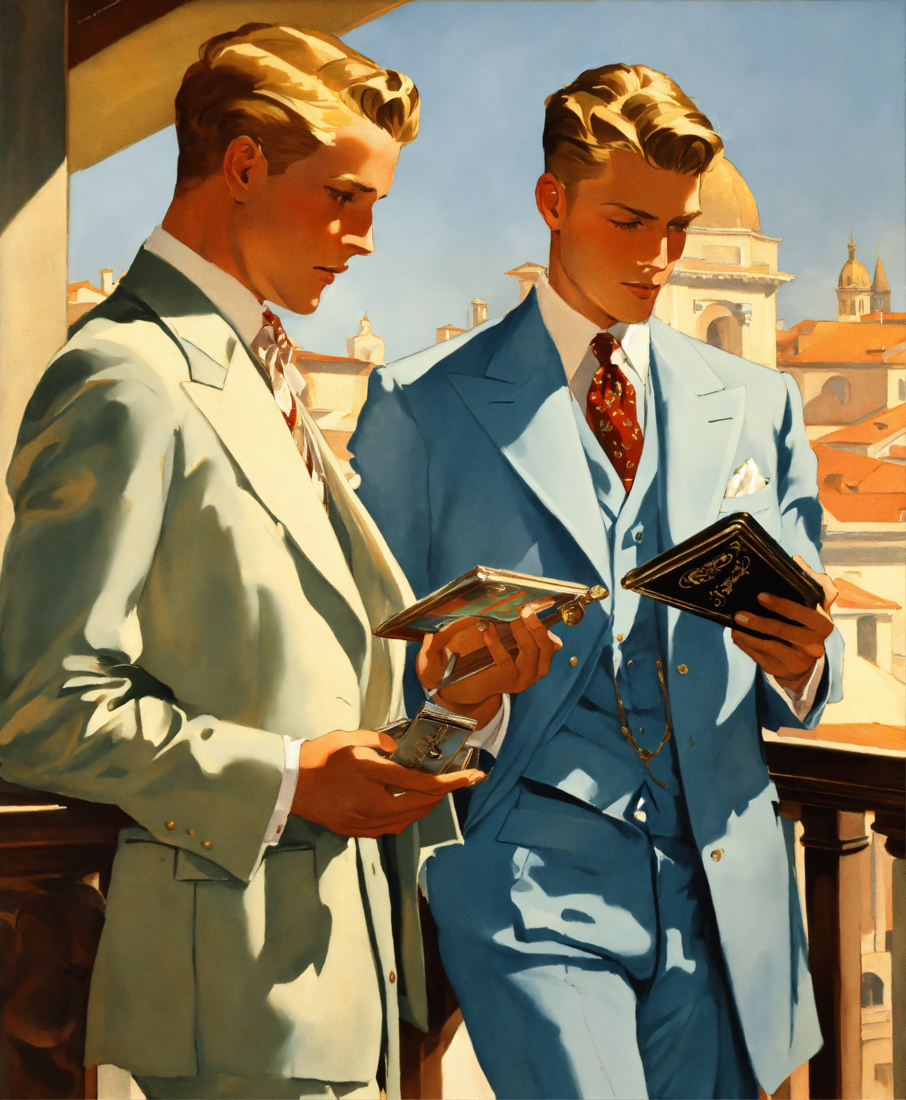 Two blonde businessmen in pale blue summer vested suit, opening their cigarette case on an italian balcony, leyendecker style