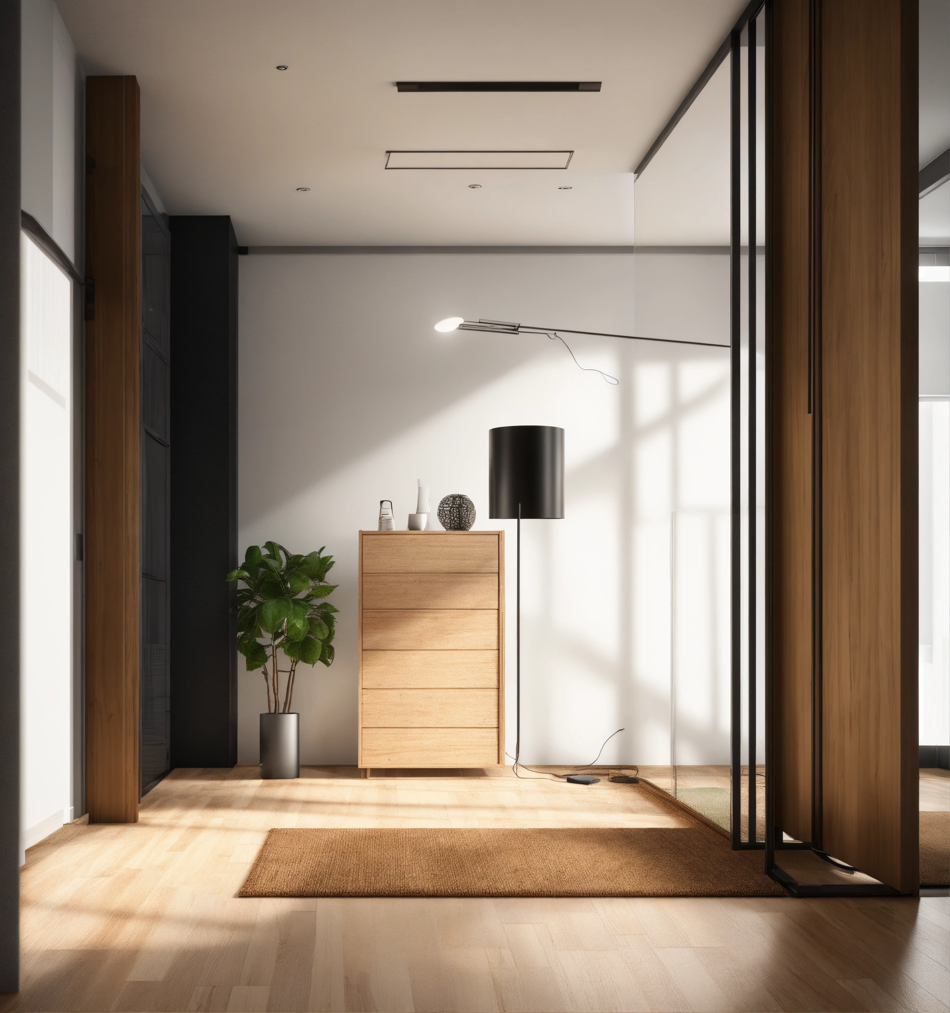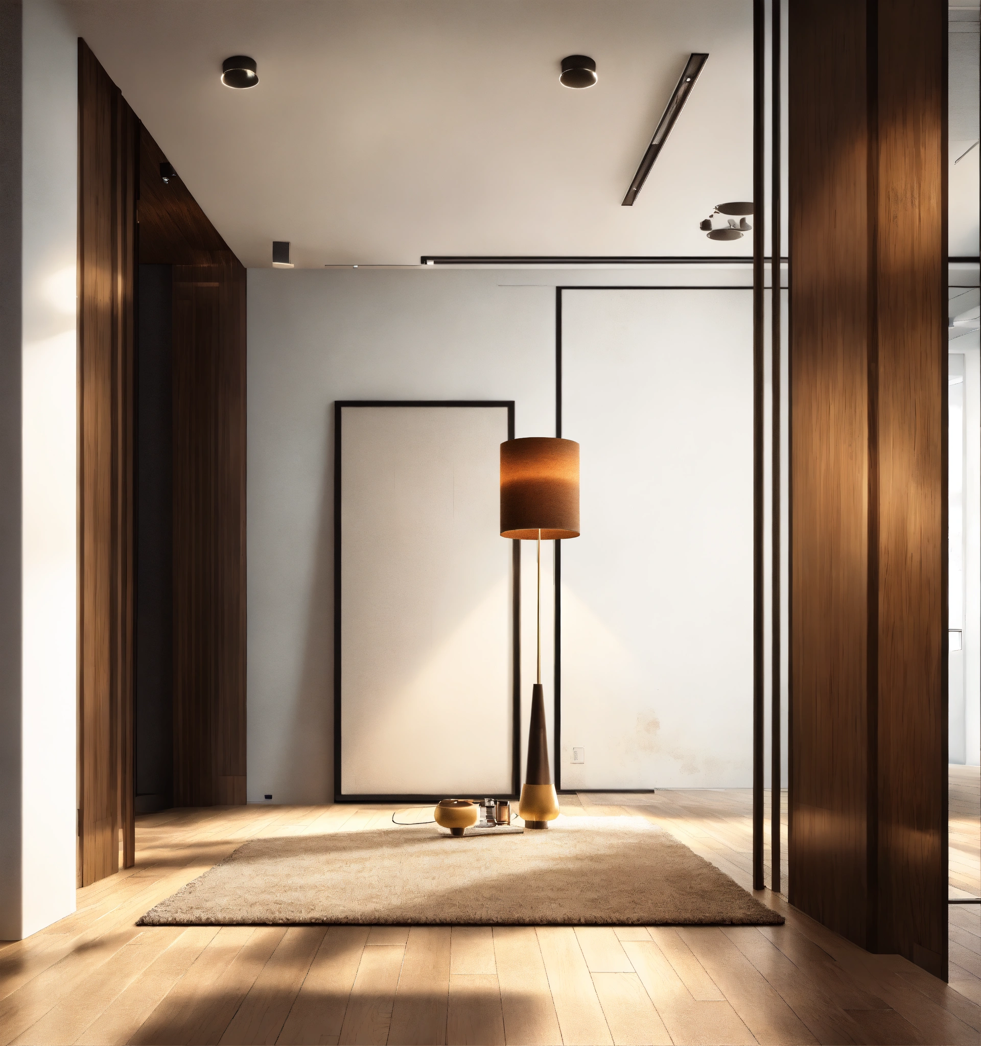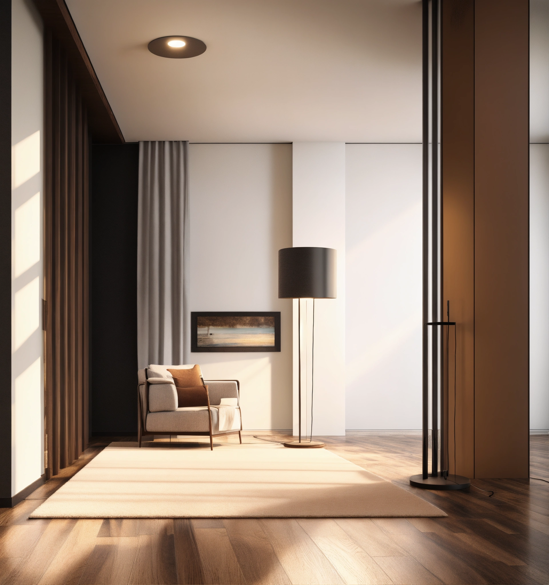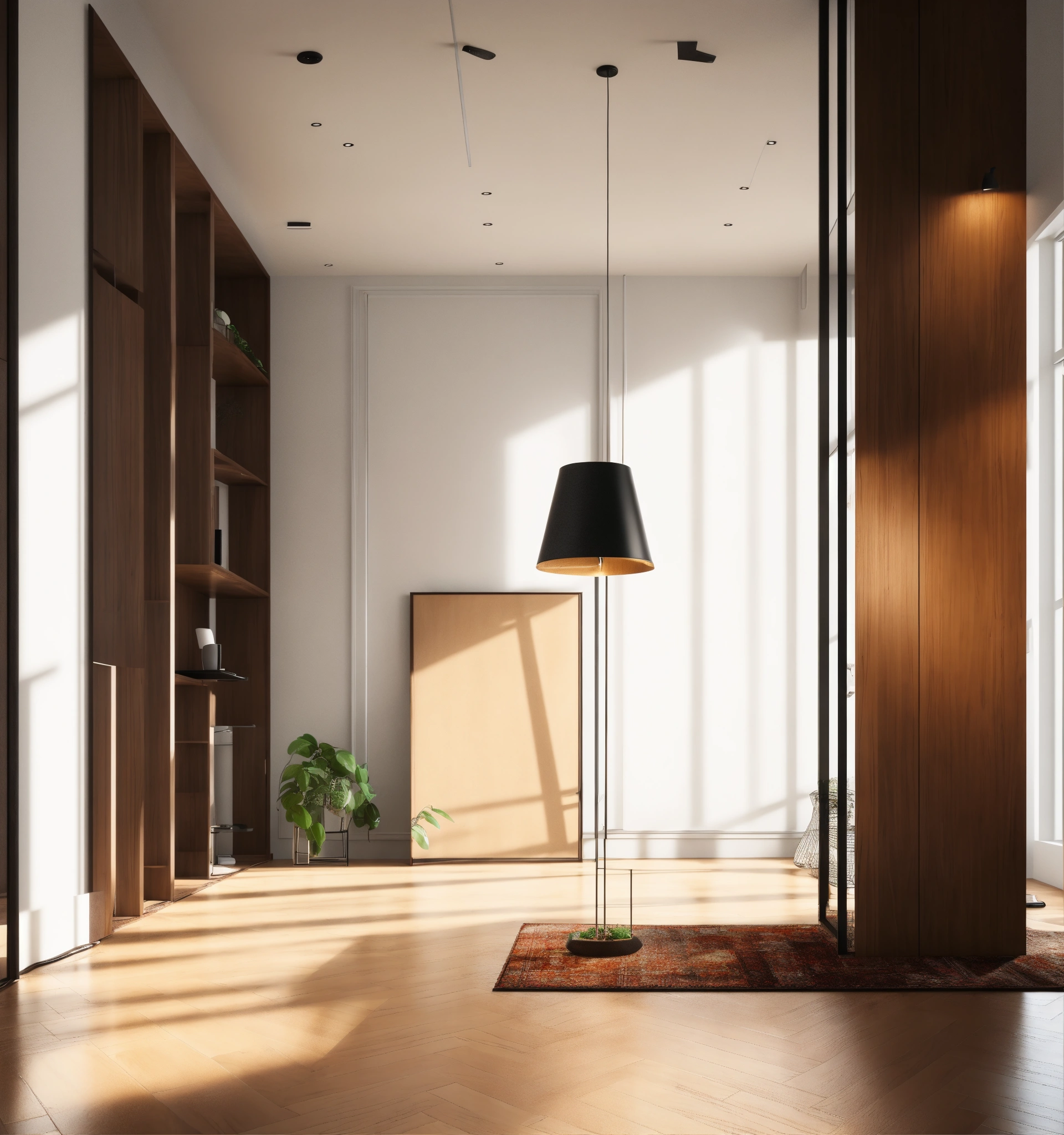 Generate a highly realistic image of a completely empty room, in a modern style, showcasing a modern design, only carpet and wood floor, and ceiling lamp. there should only be a coffee table, only one plant. a big room with a diagonal perspective, three-quarter view.