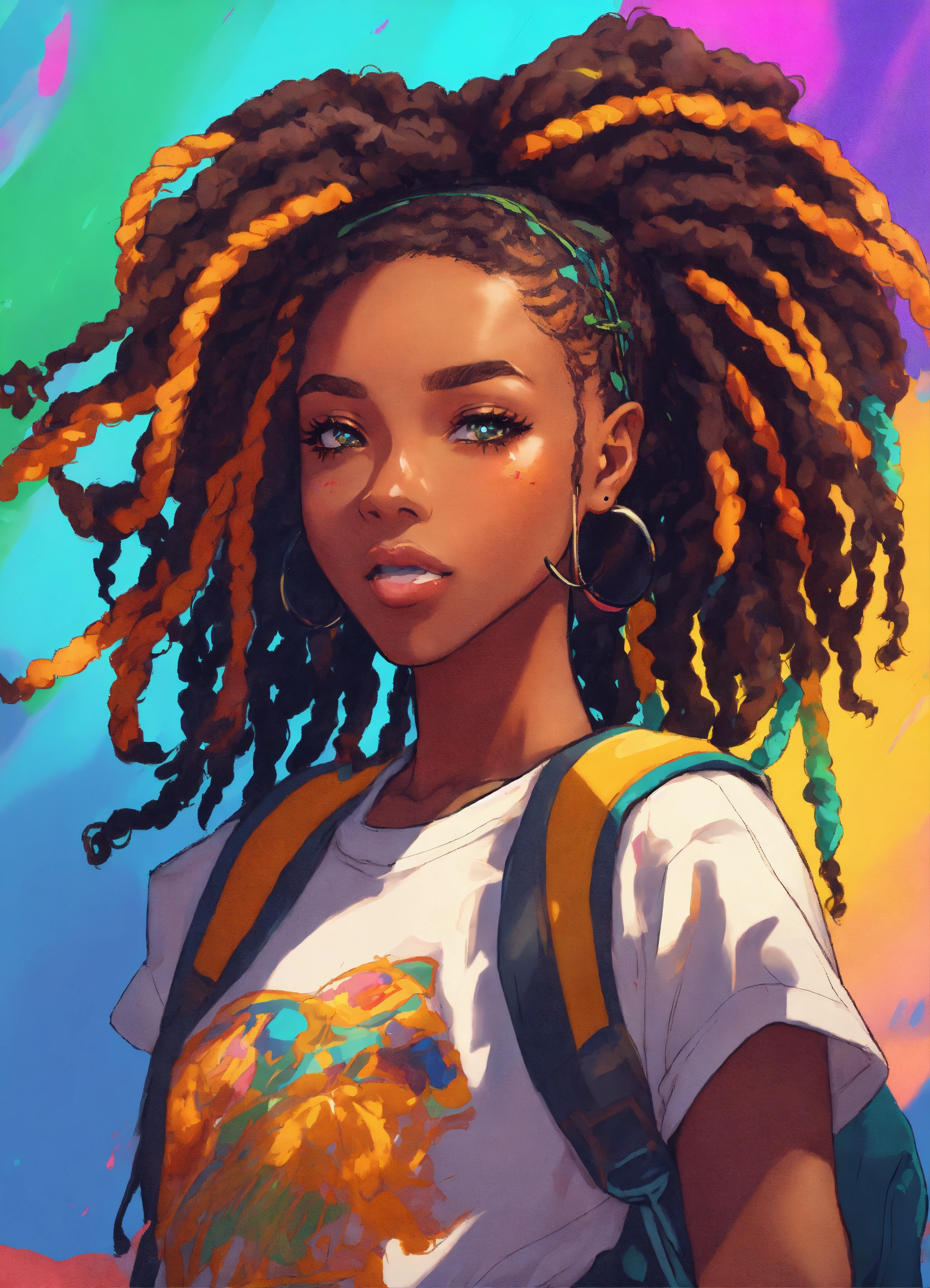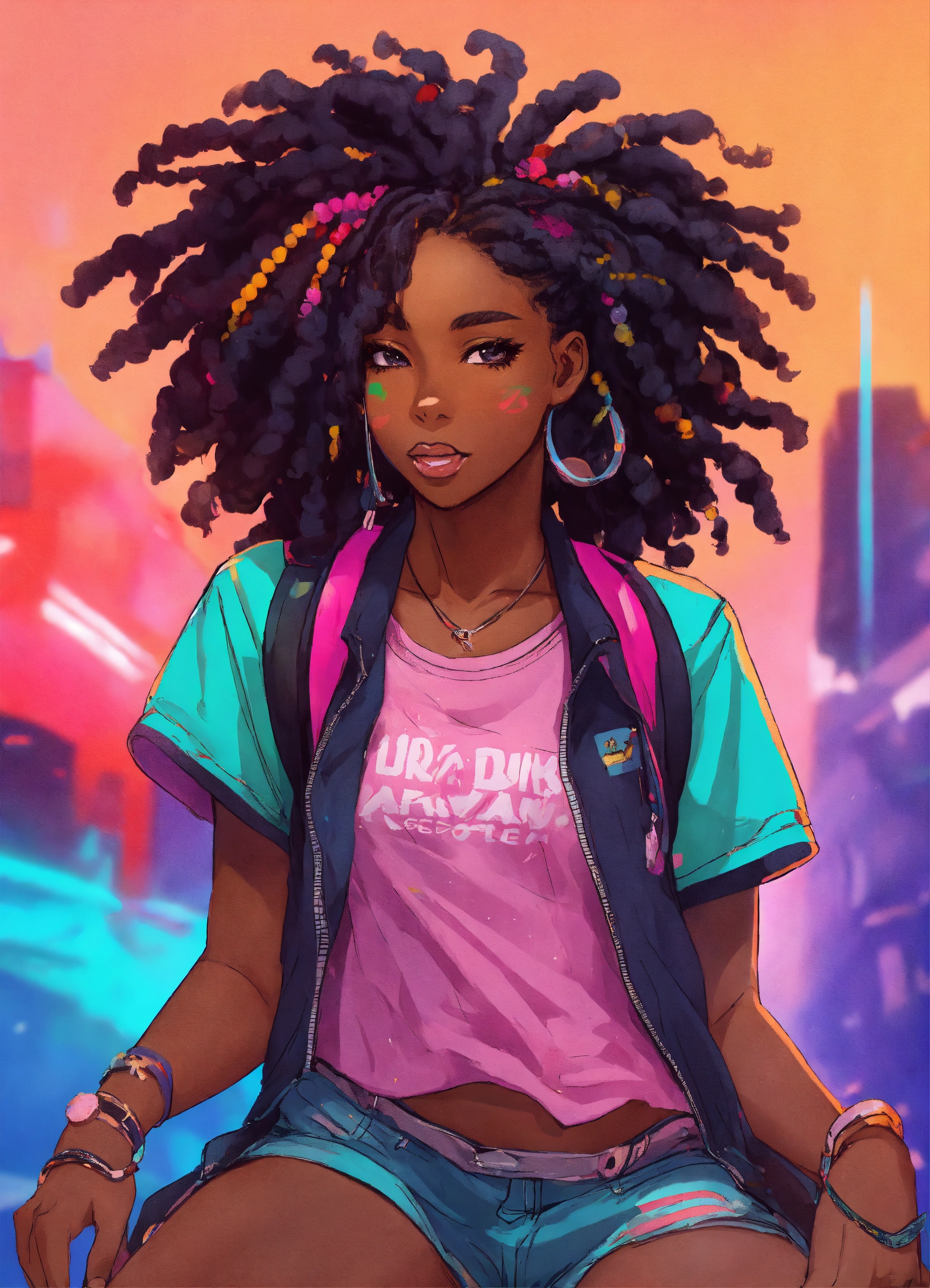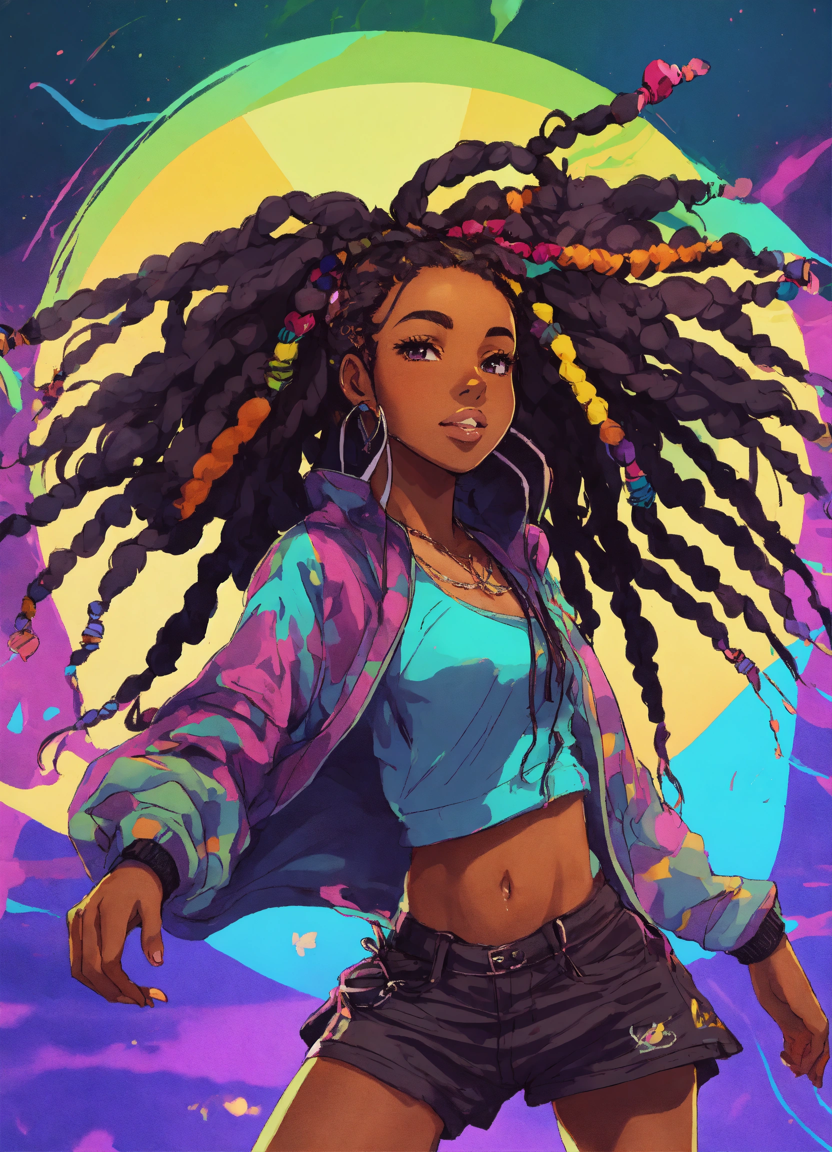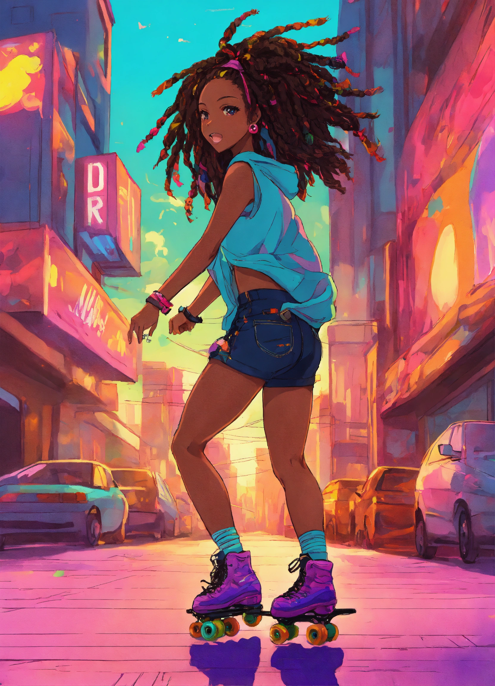 A beautiful anime black girl roller skating with dreads in her hair using vibrant colors