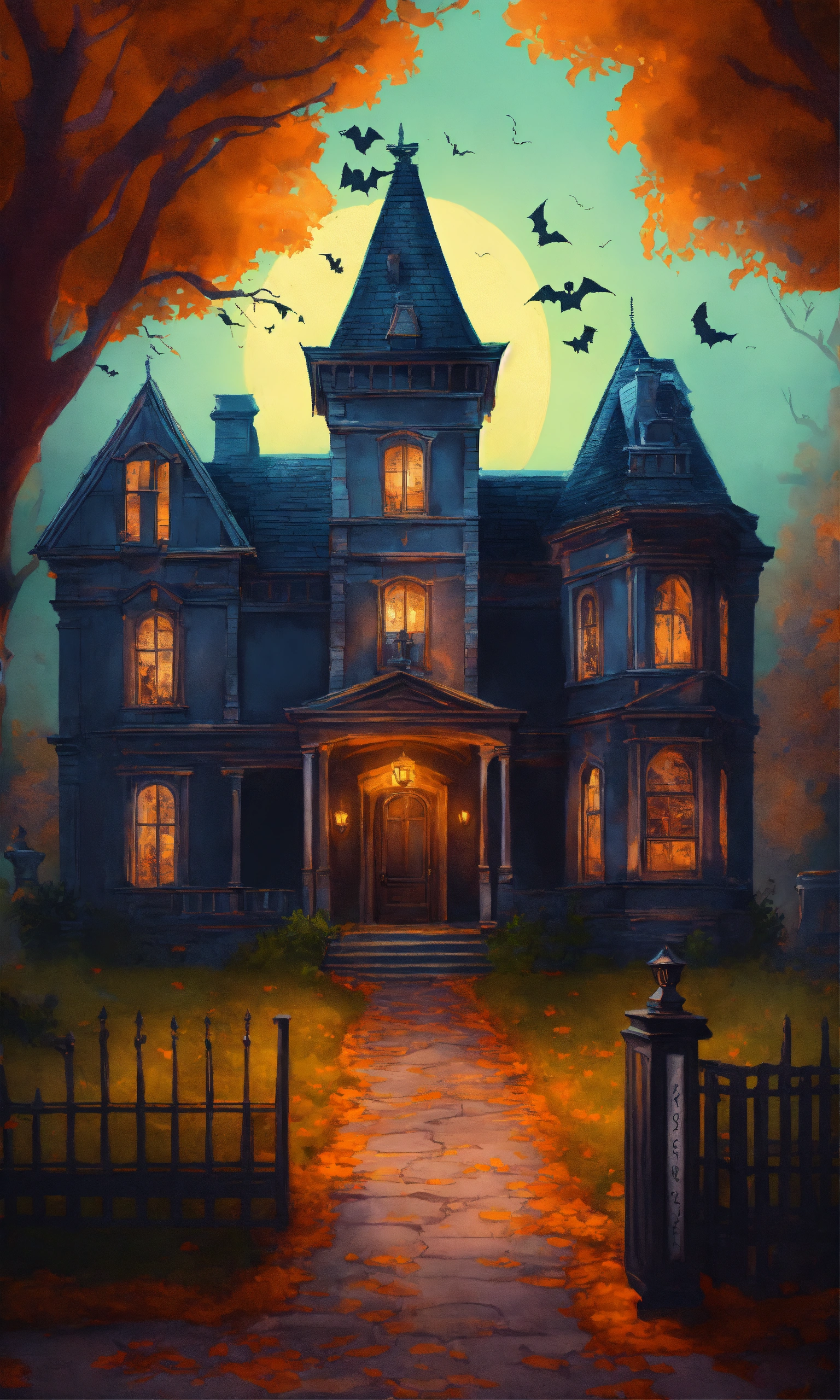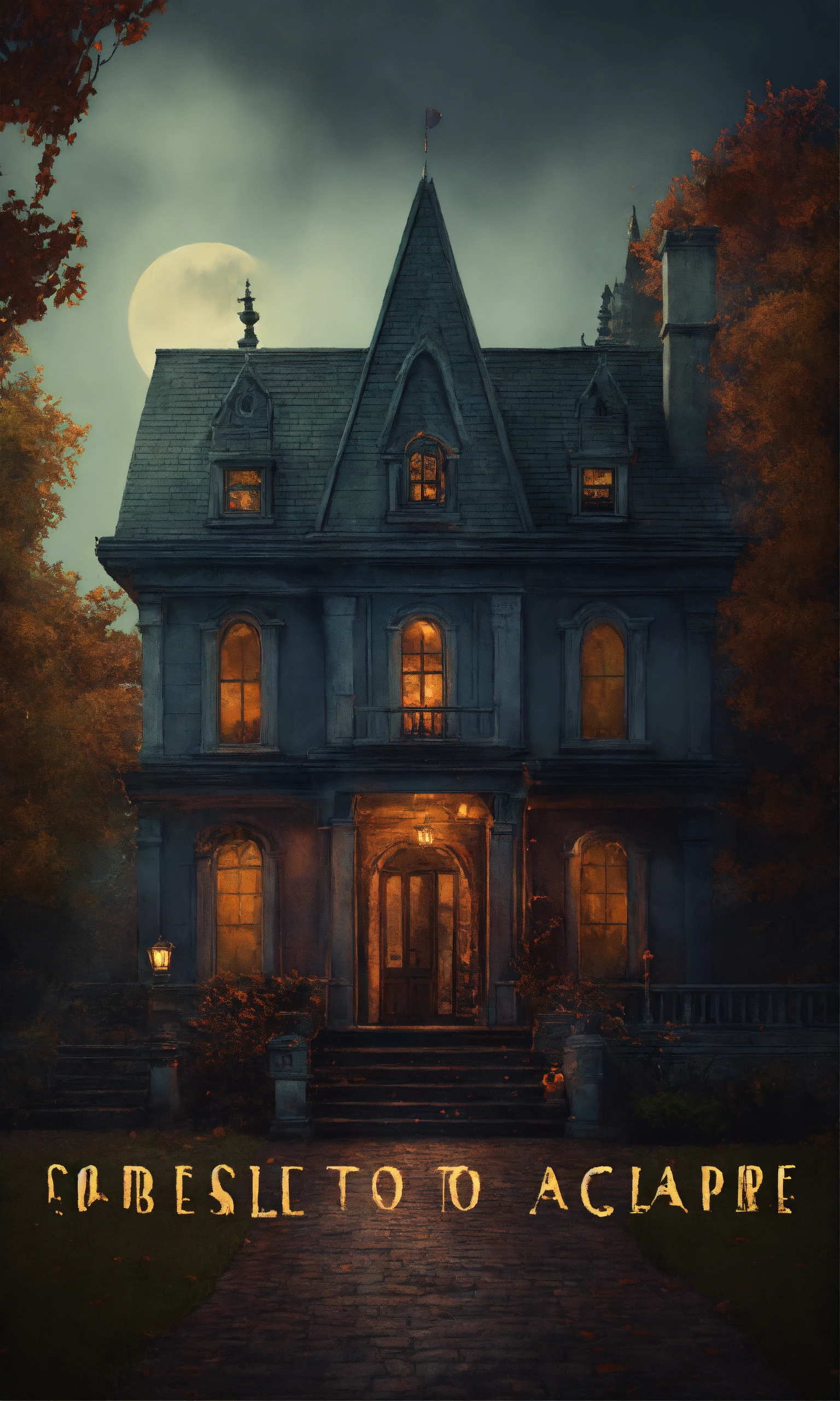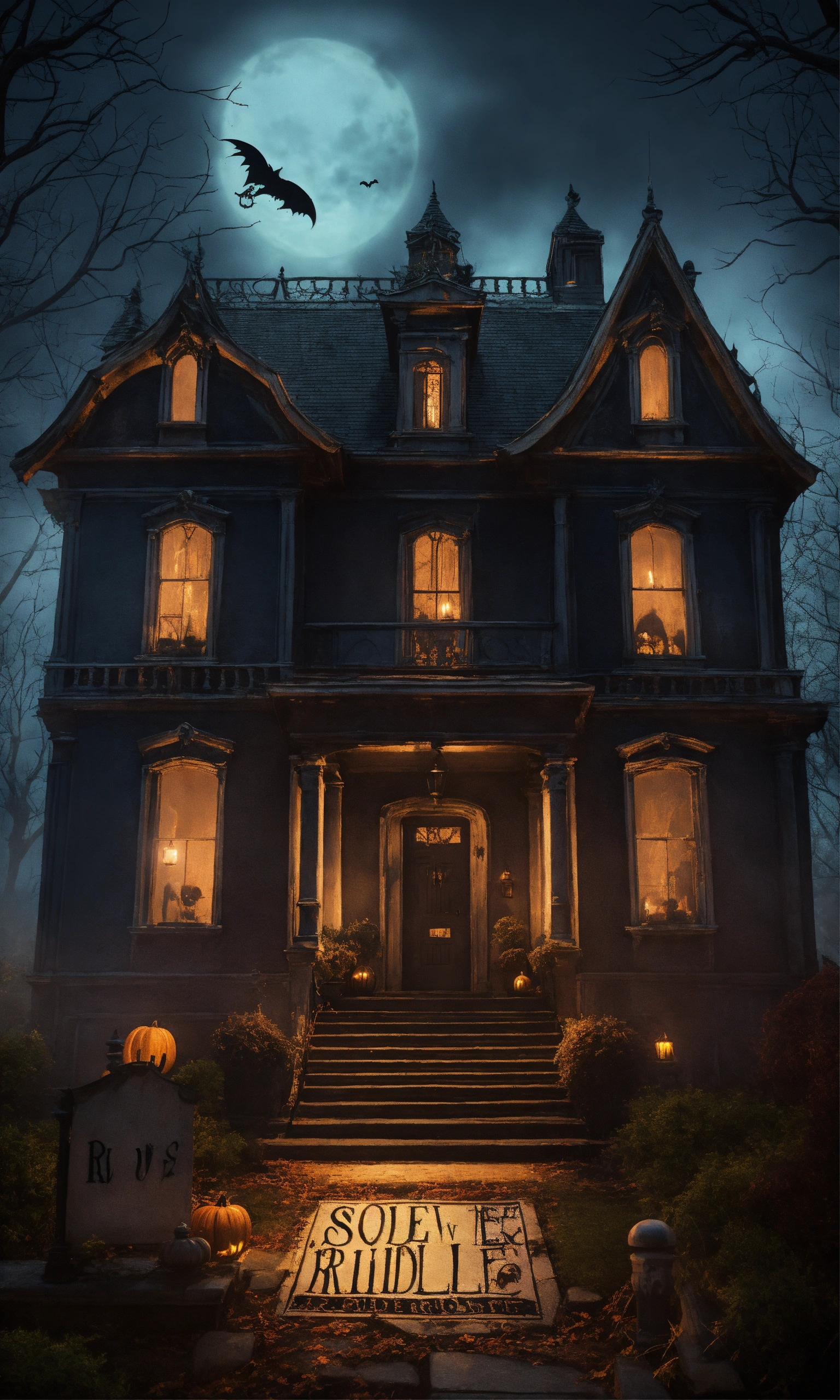A spooky manor with a macabre placard in front yard that reads solve riddle to enter