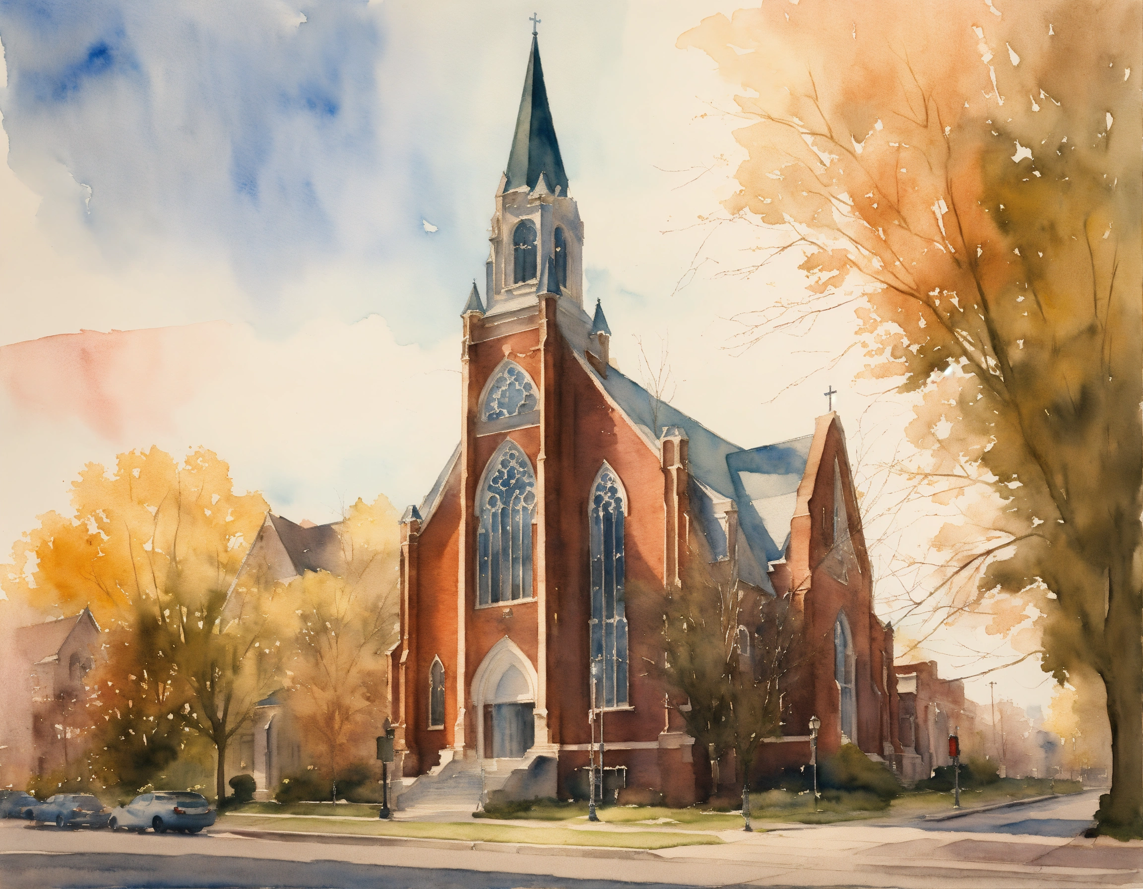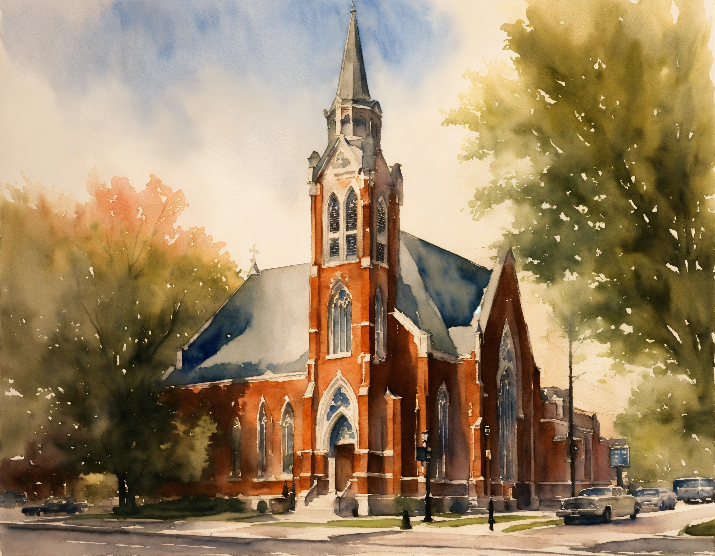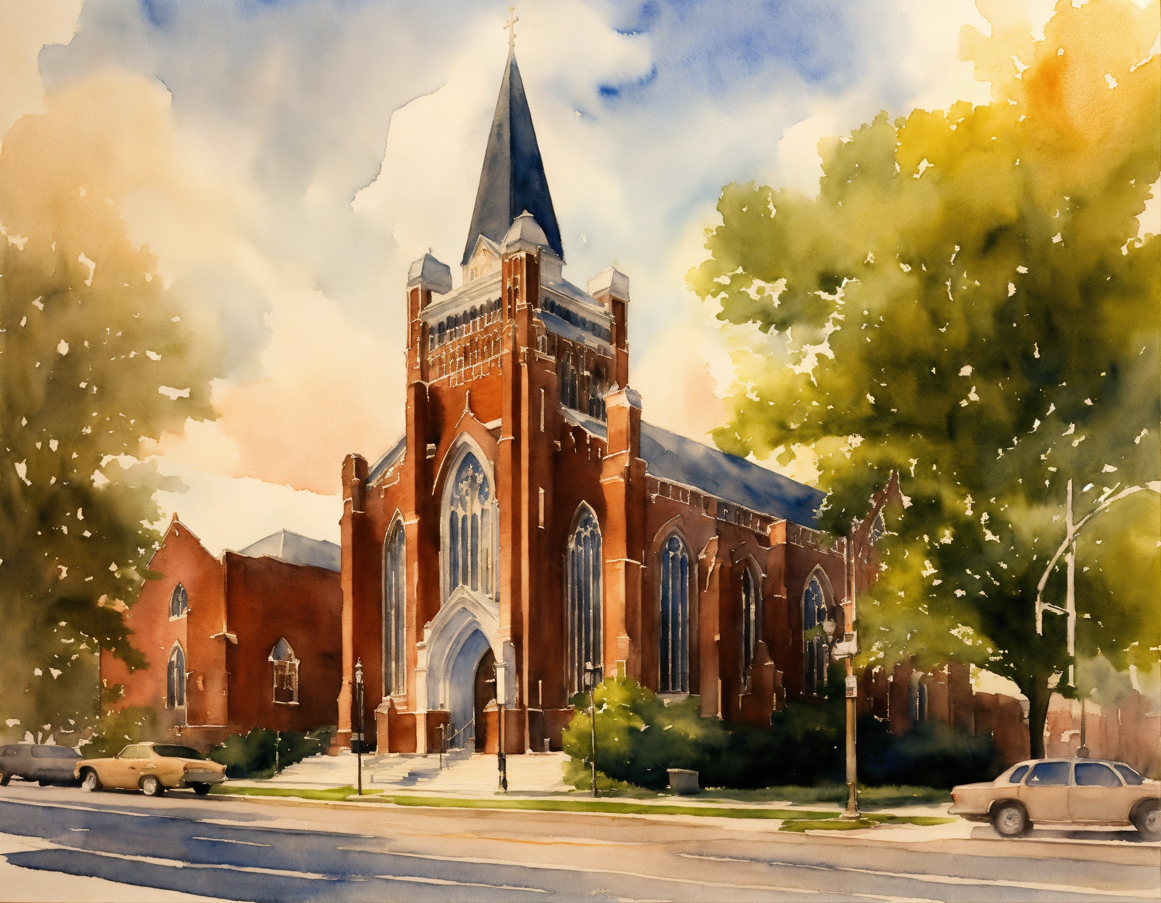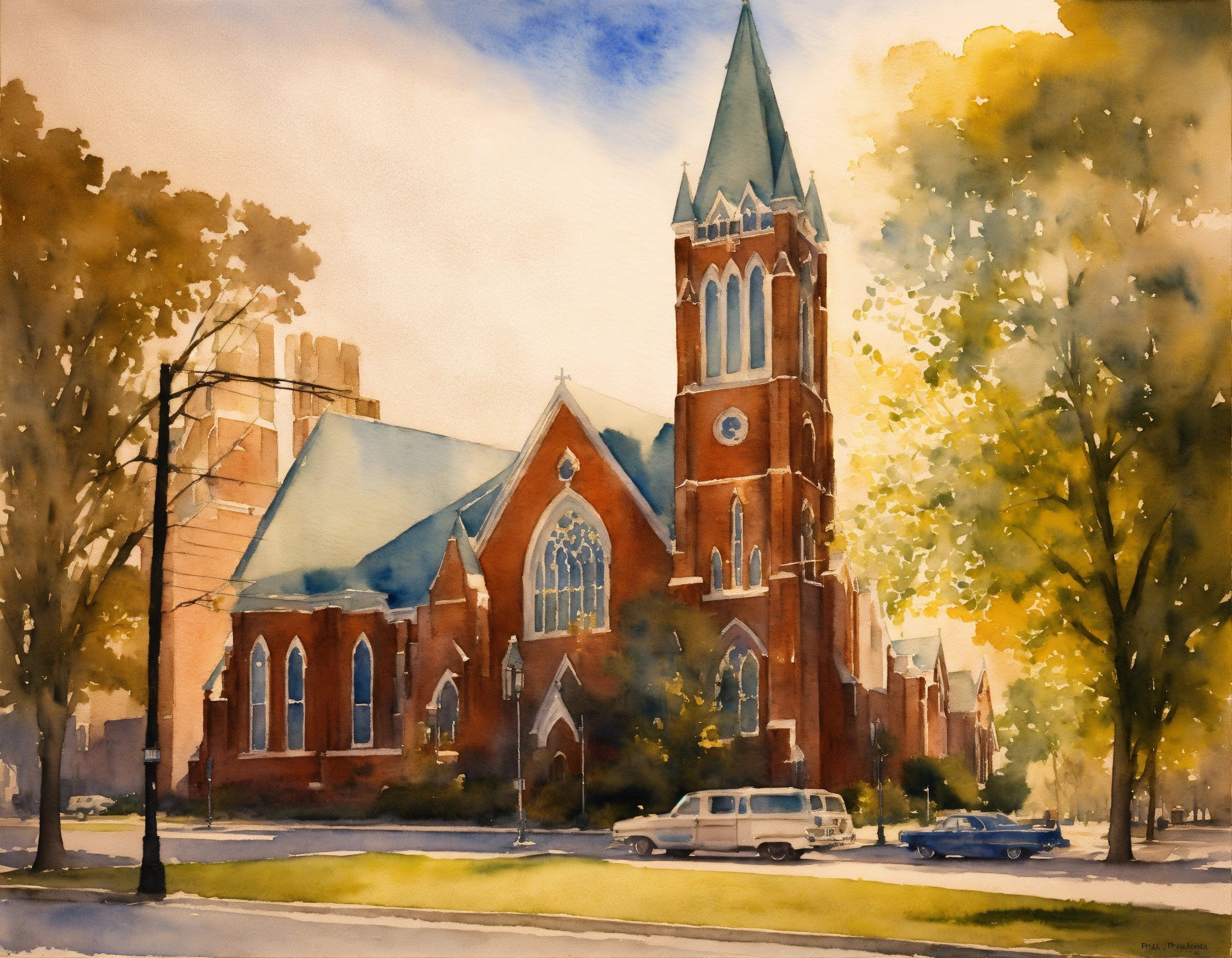 Watercolor painting, subtle faded colors, first presbyterian church on woodward avenue near detroit michigan