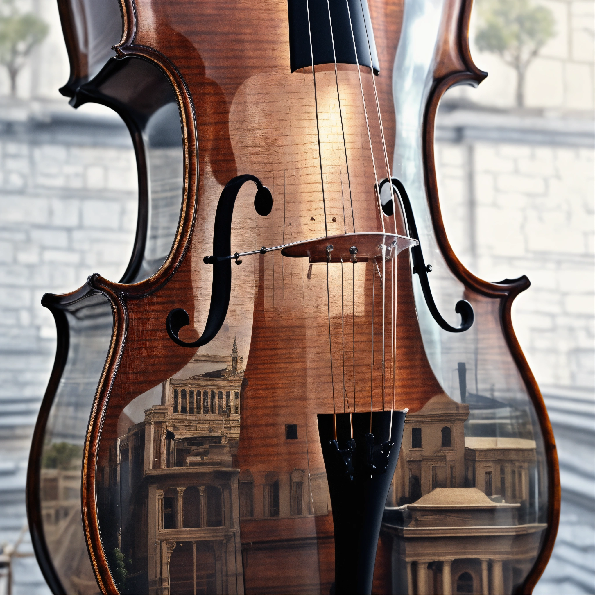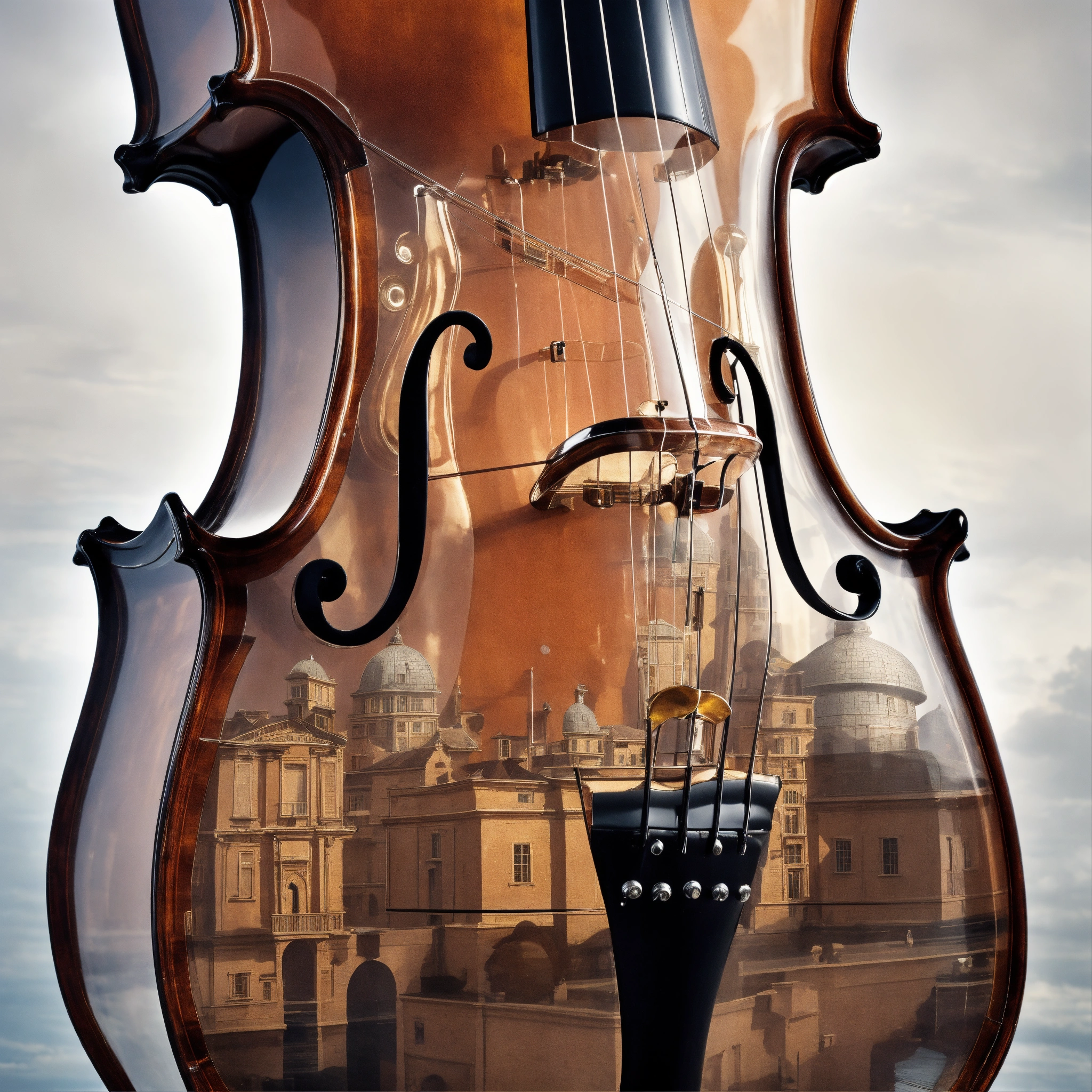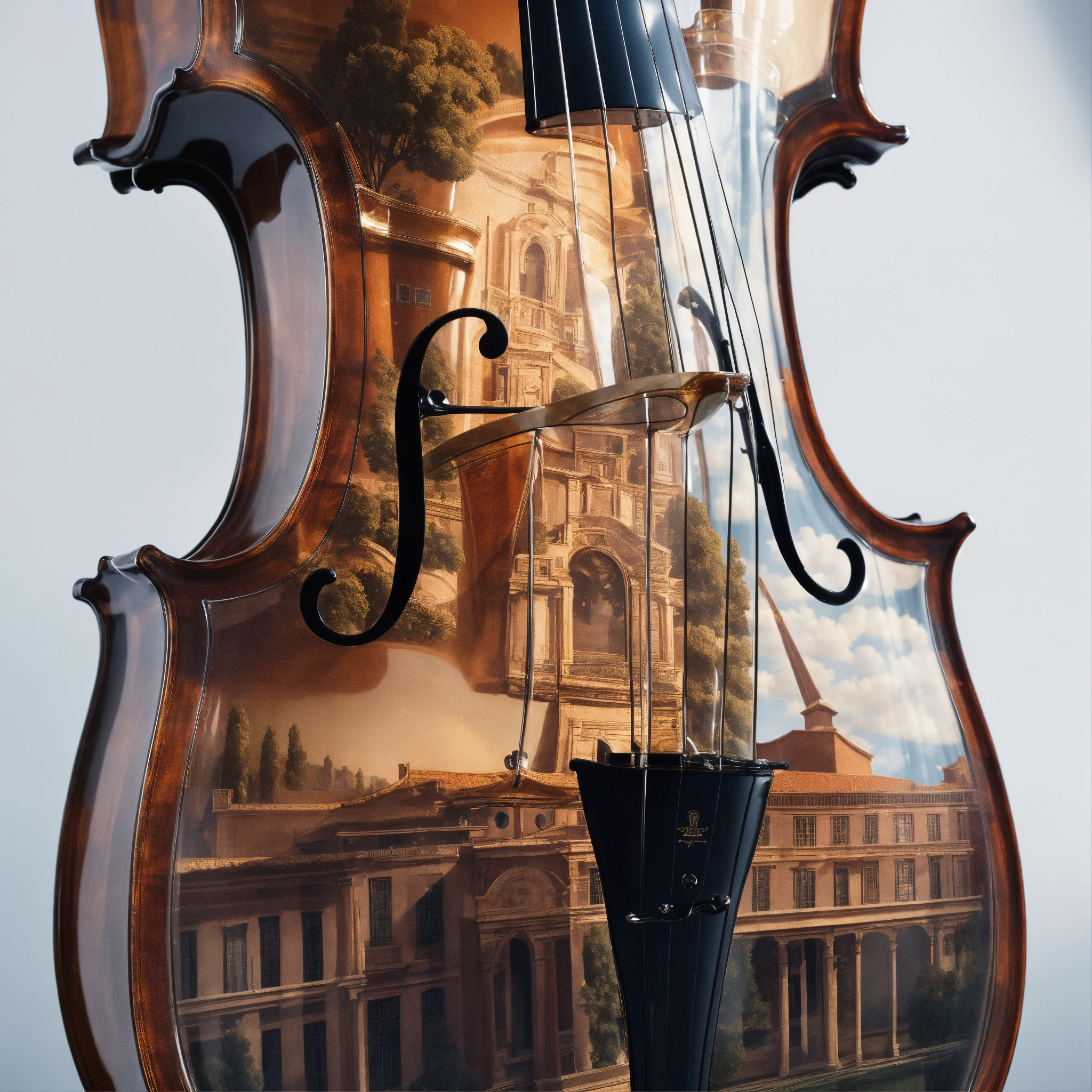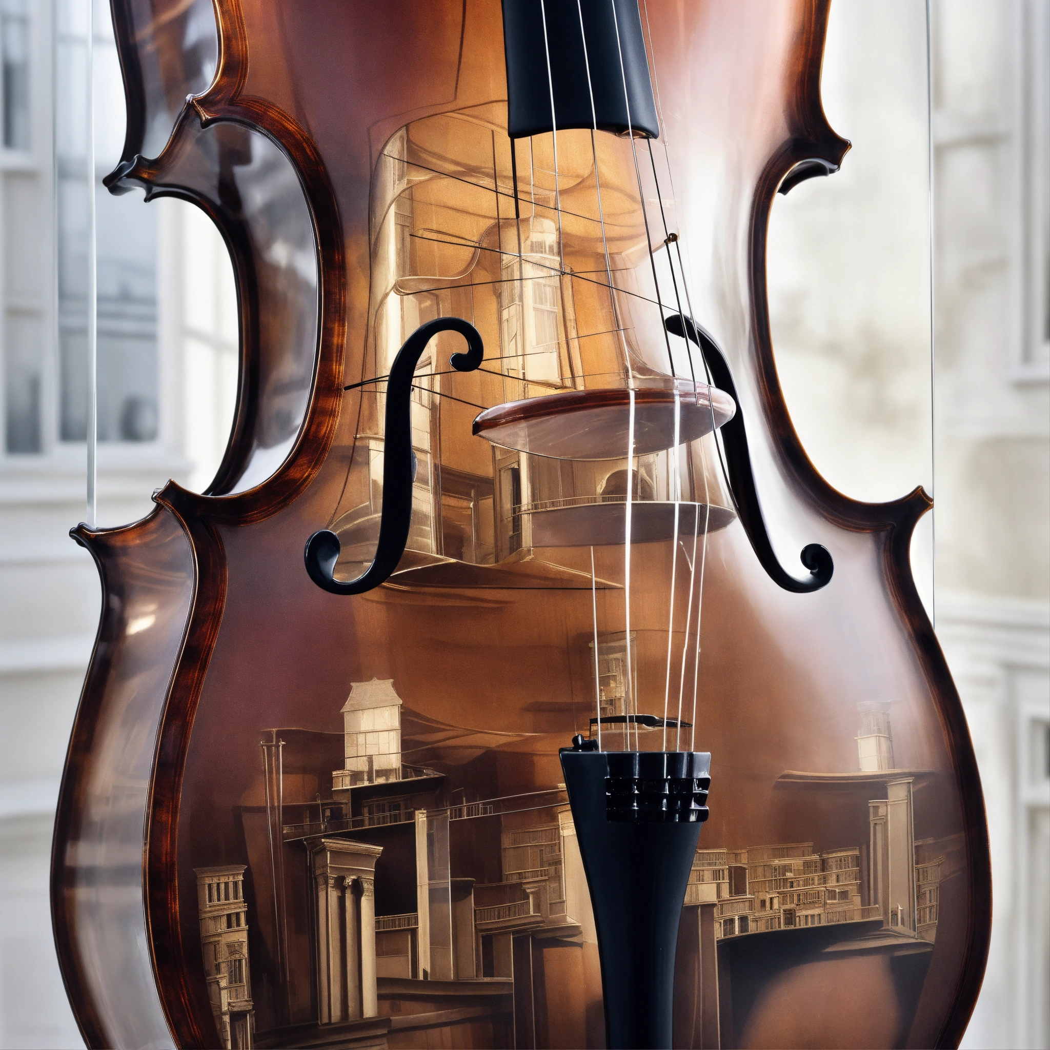 A photorealistic closeup view of inside a transparent cello, imagine someone is standing inside of a glass cello and watching the architecture of the instrument, by rene magritte, don't show the outside of the instrument, just inside, the hidden part from eyes. created by canaletto, highly detailed image, extremely high resolution, surrealistic construction inside the cello