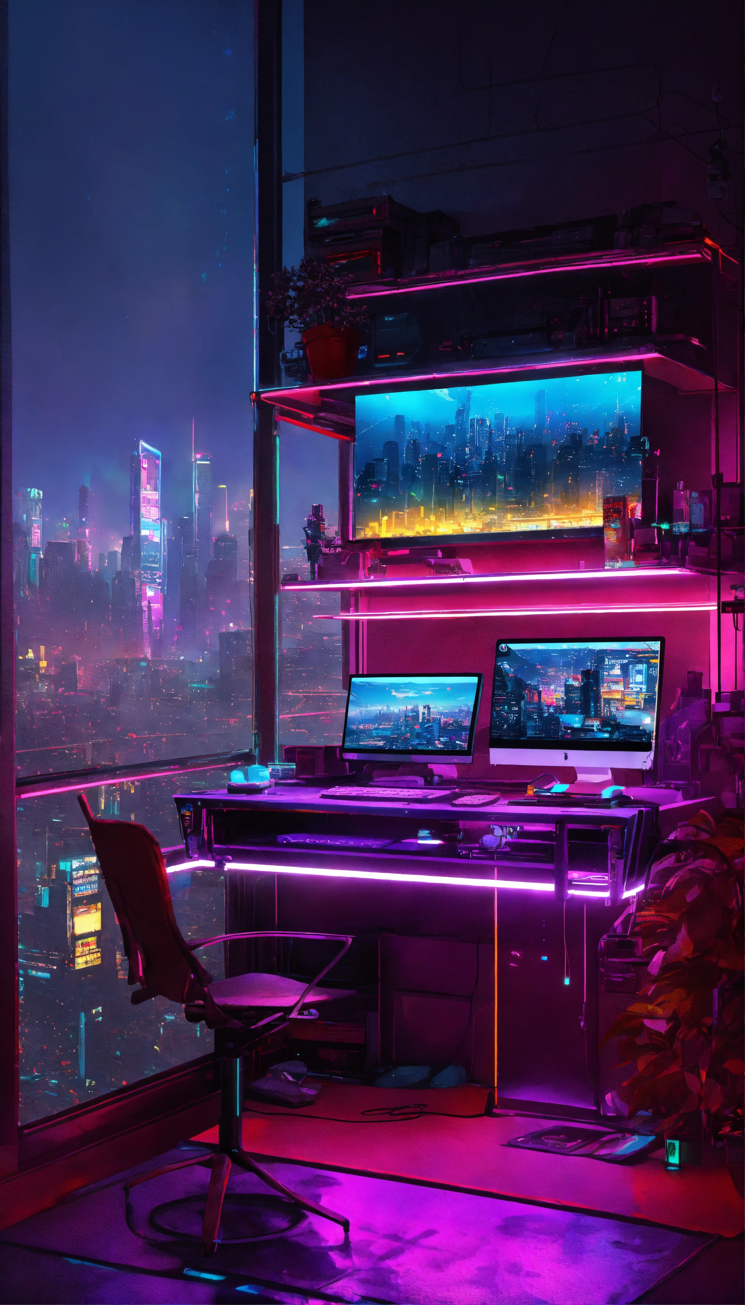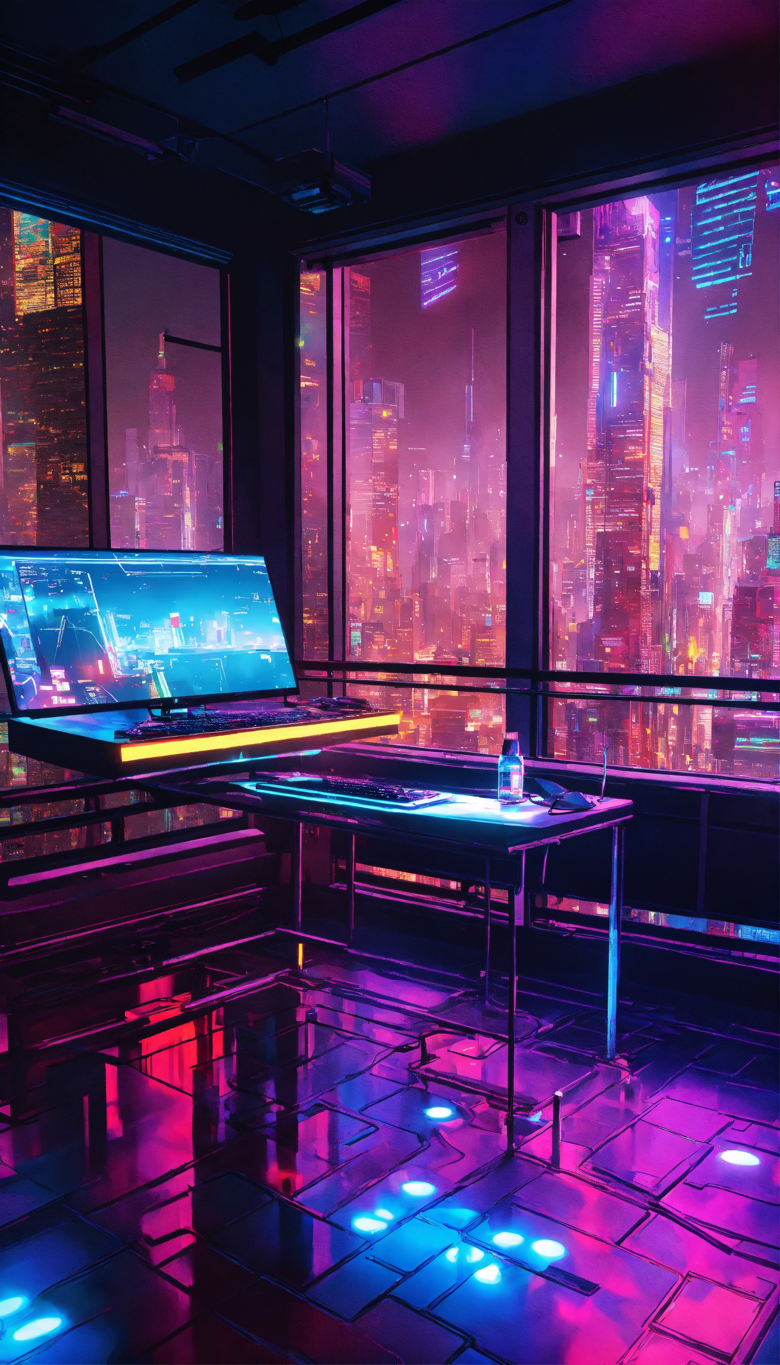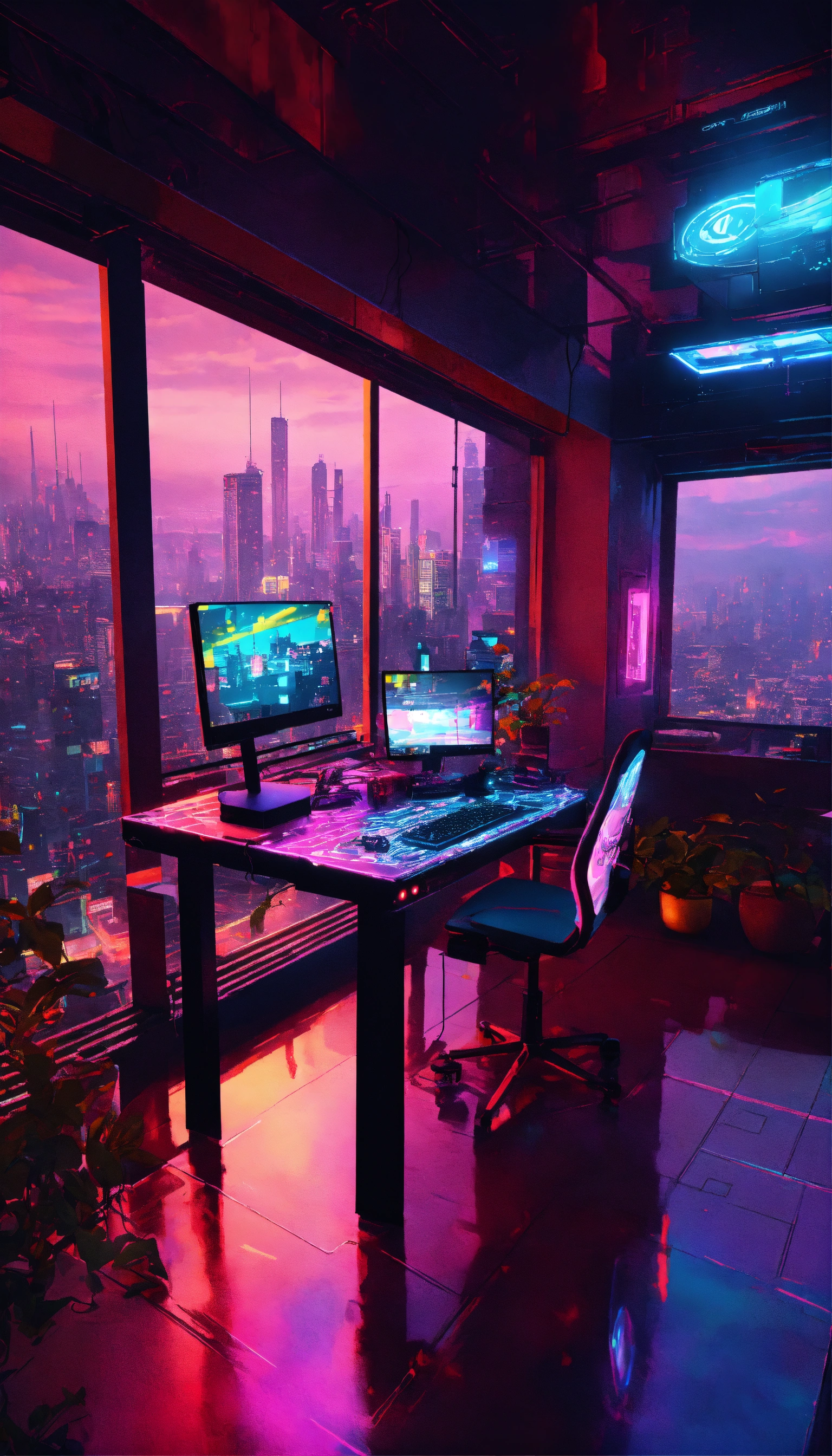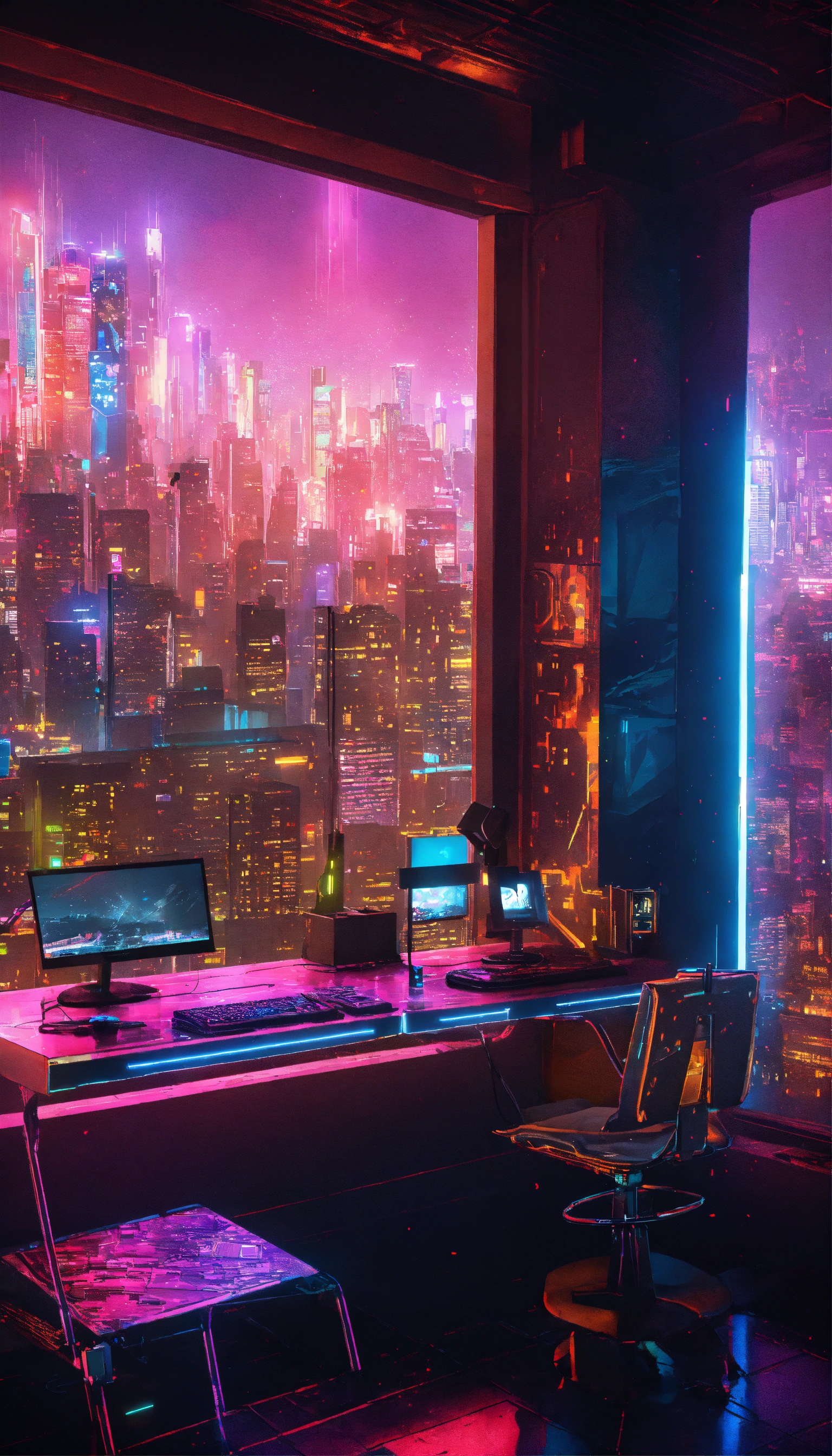 A cyberpunk balcony at night, awash with neon reflections on wet surfaces. a powerful pc with rgb lights sits on a metal table, with hovering holographic screens. graffiti-covered walls bear glowing cyber gear. city skyscrapers form a lit grid in the backdrop. details pop at 8k resolution, enhanced by realistic ray-tracing.