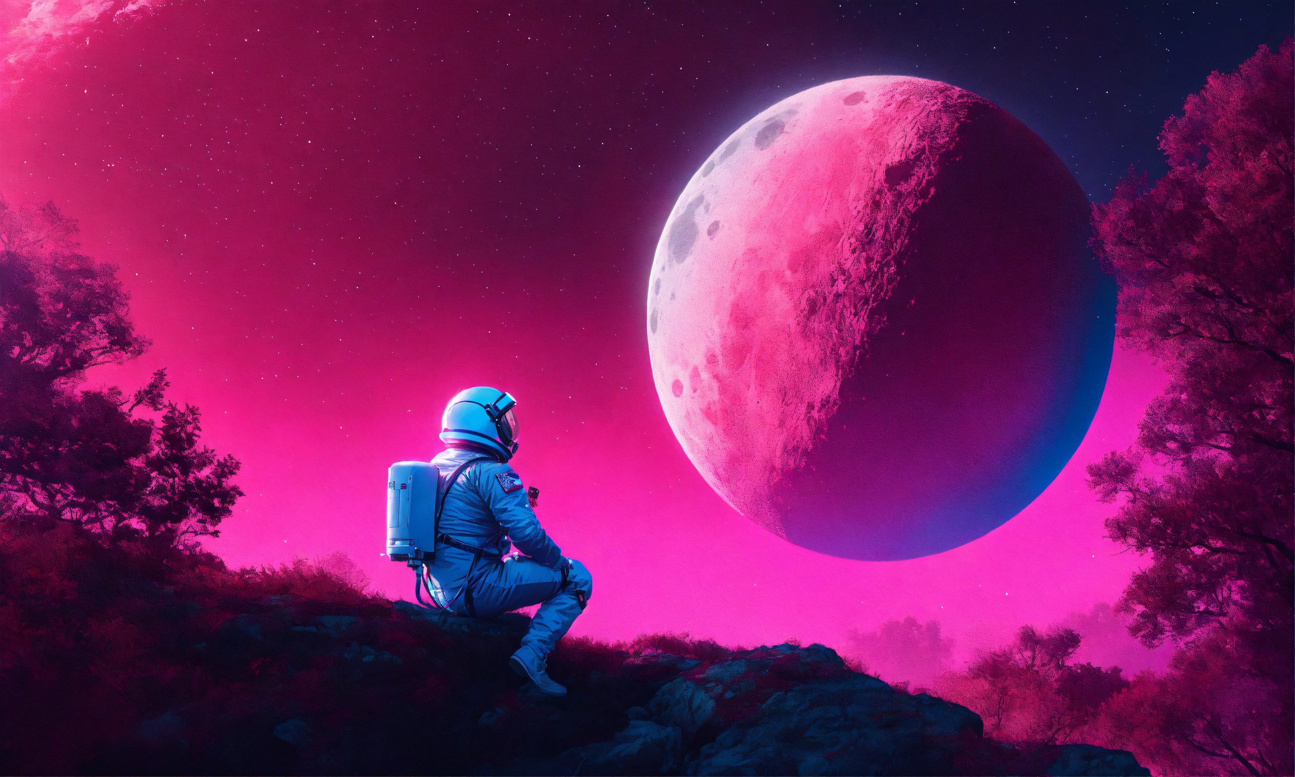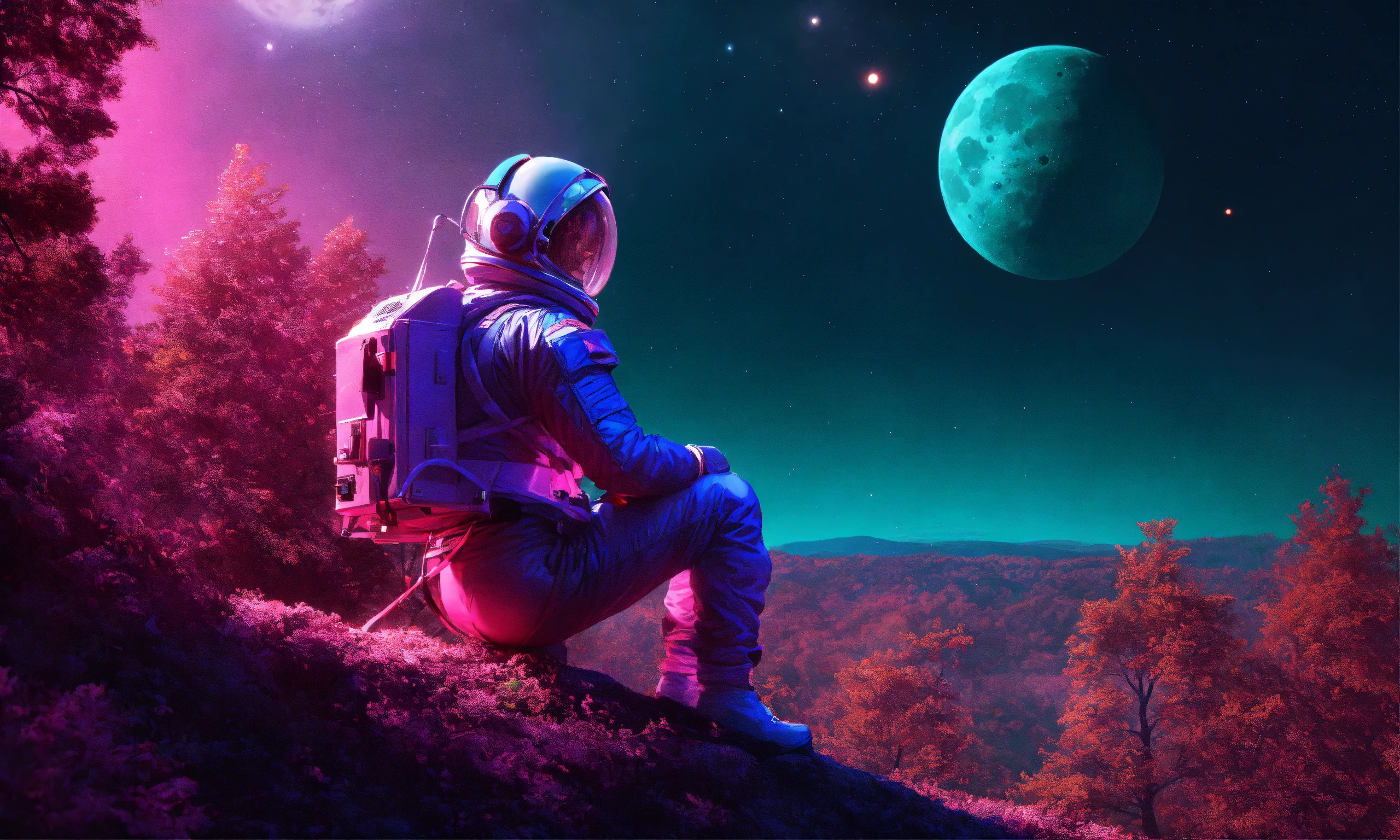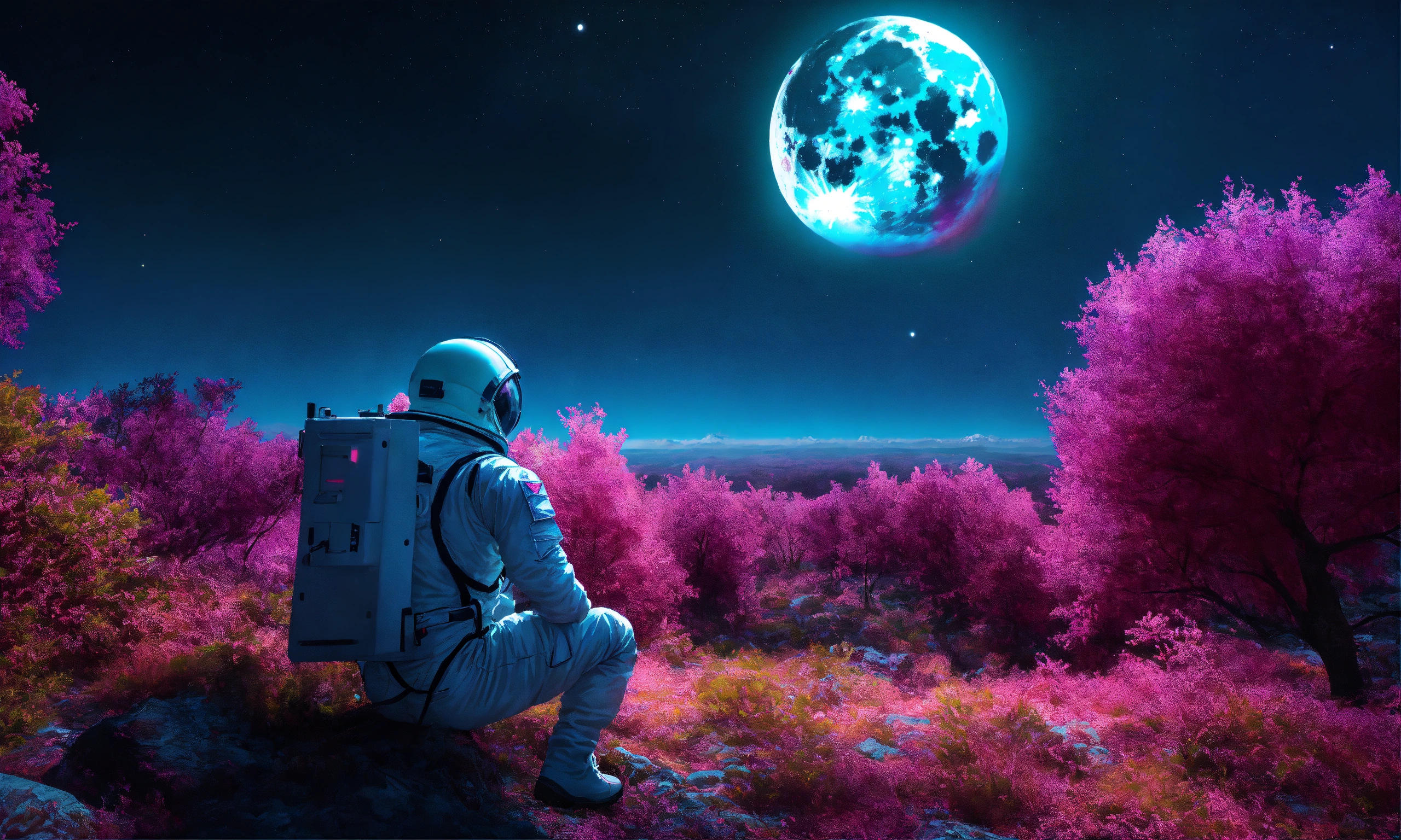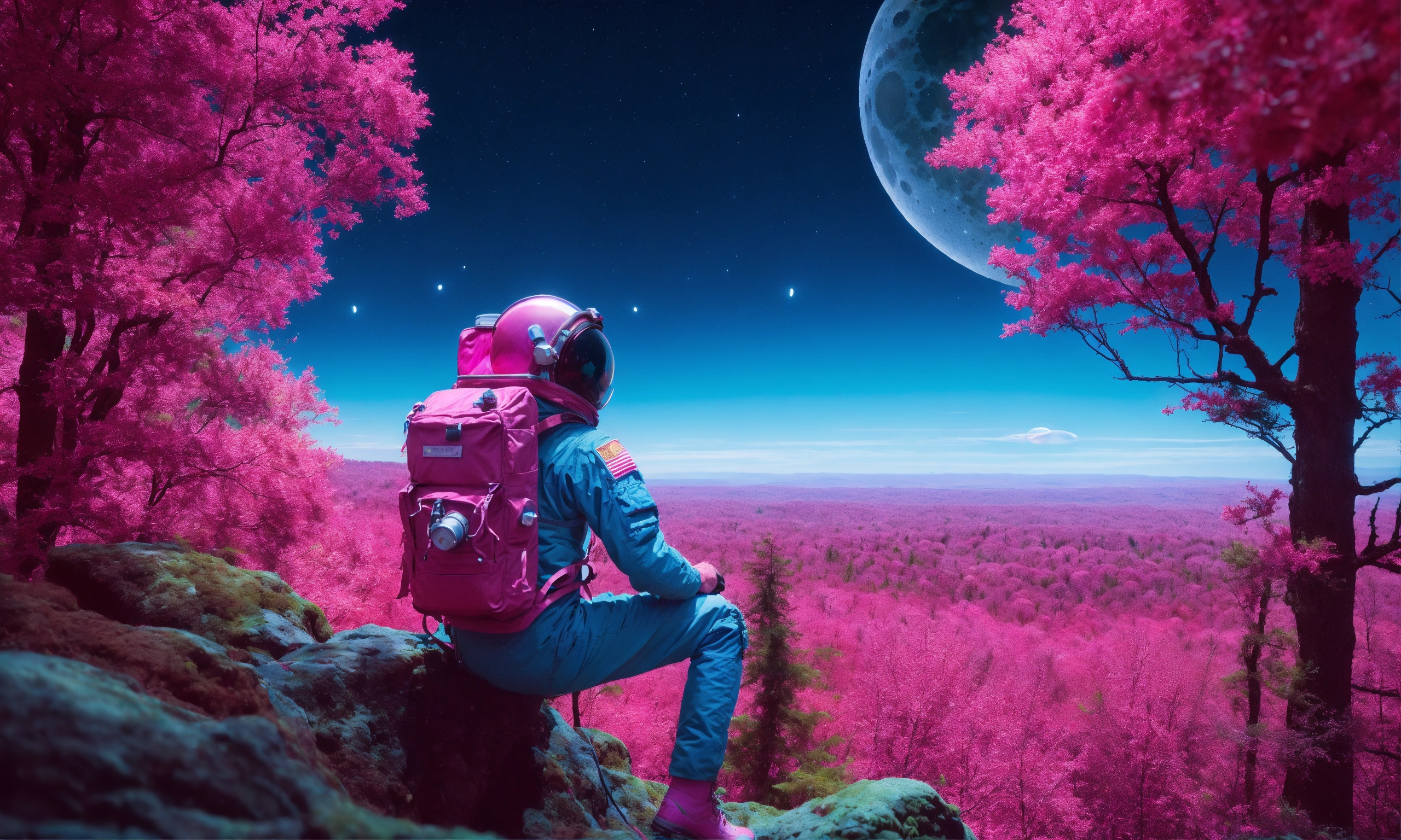 Astronaute assis sur un roché avec un environnement de foret verte observant la lune de couleur bleu ciel magenta en 8k