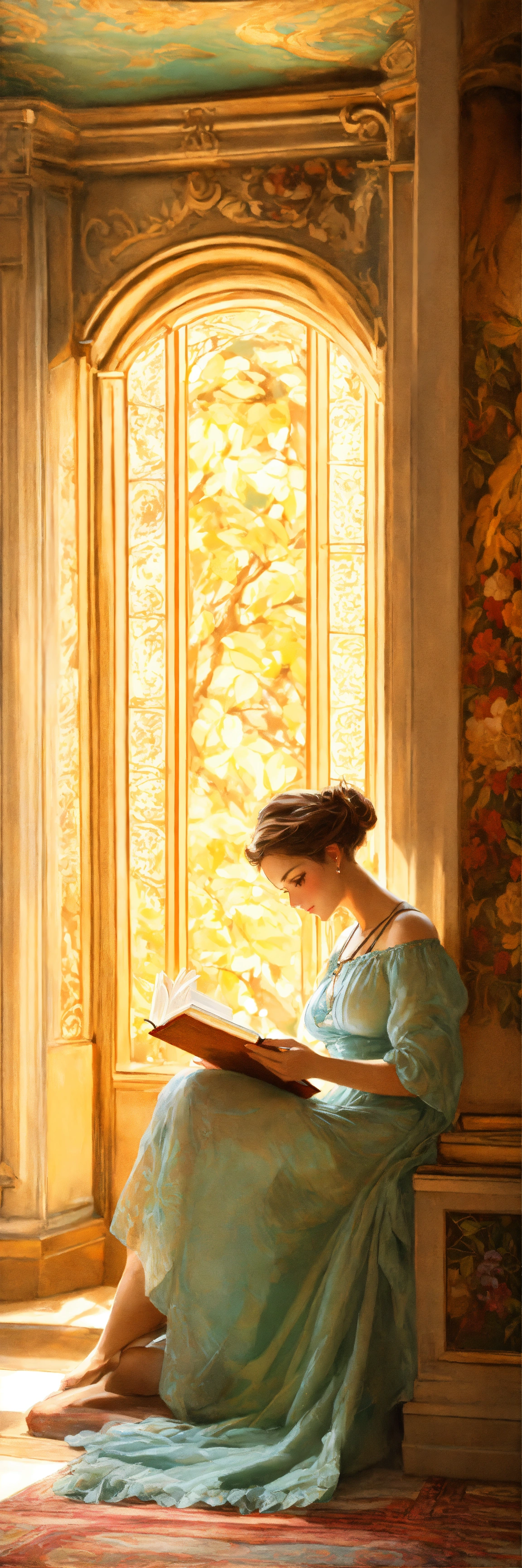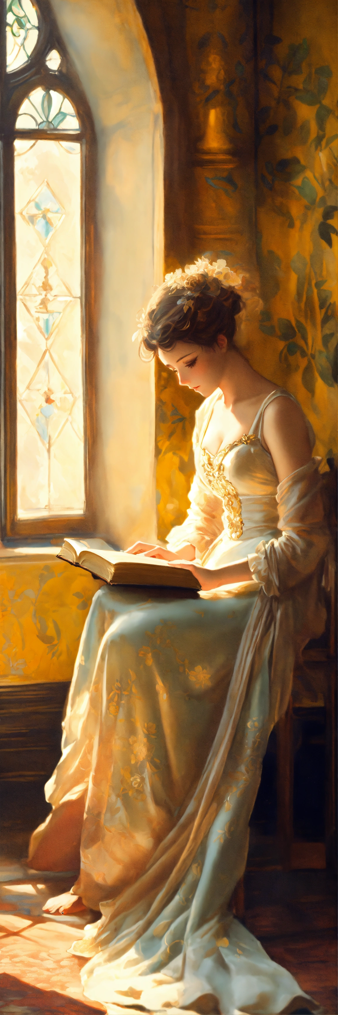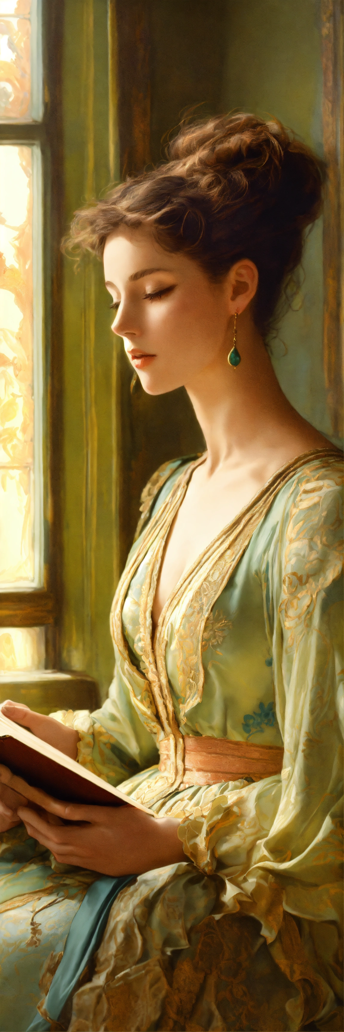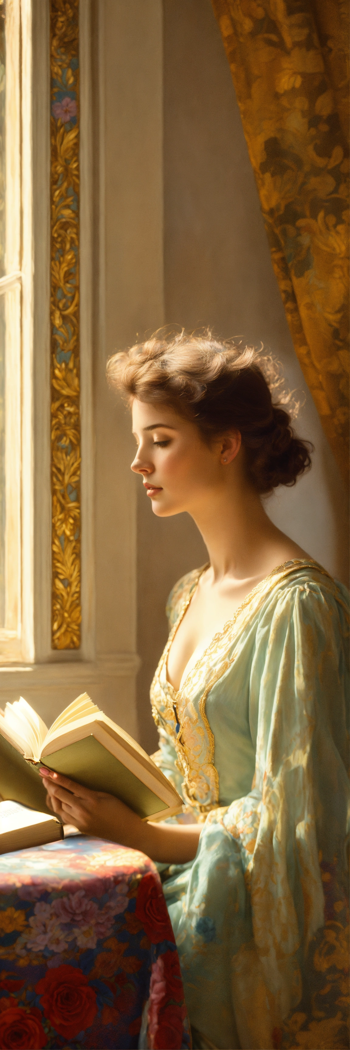 Dramatic light, a very beautiful woman reading a book, vitorian era, ultra detailed summer room, show all head, hide hands, alma tadema paint style, pastel colors