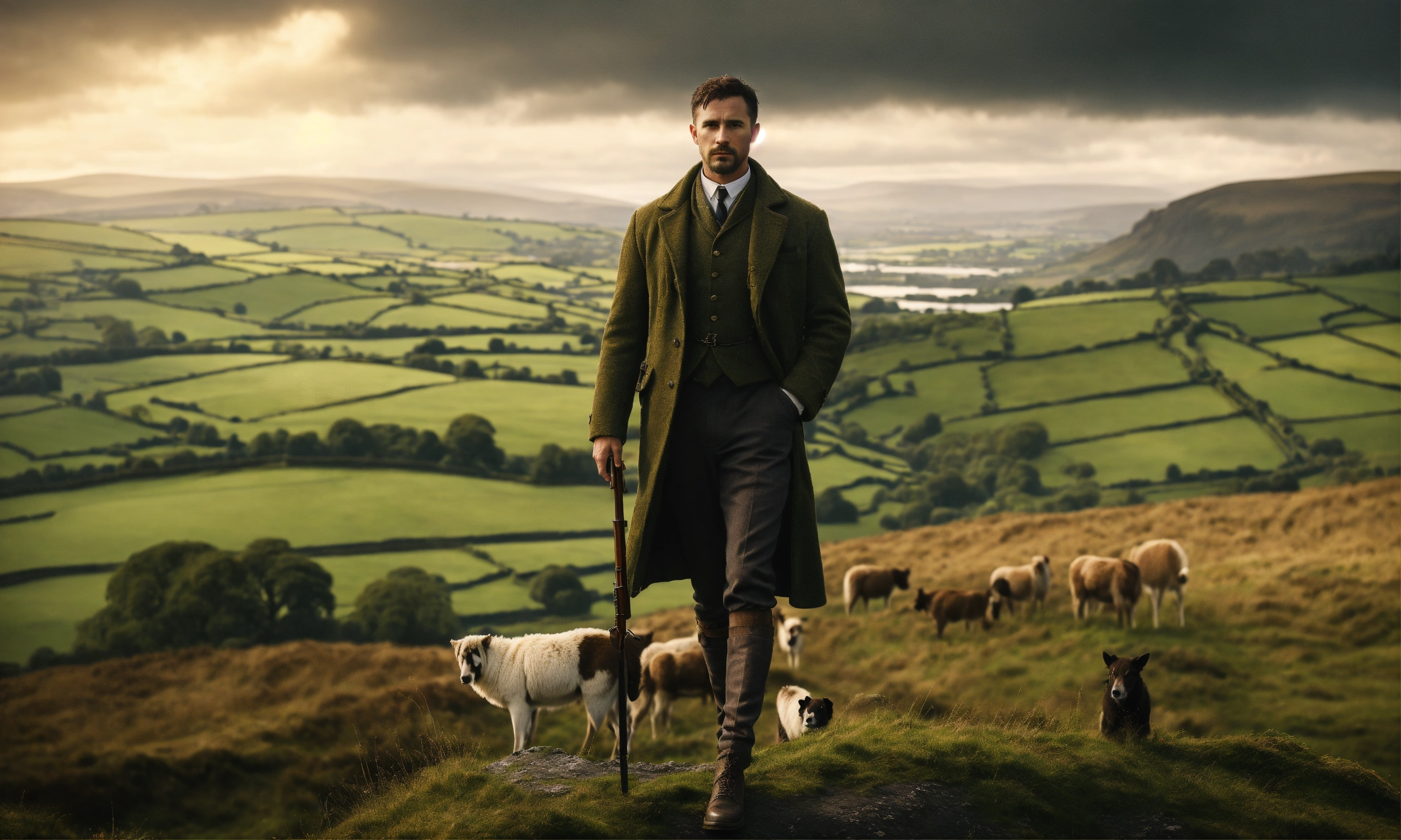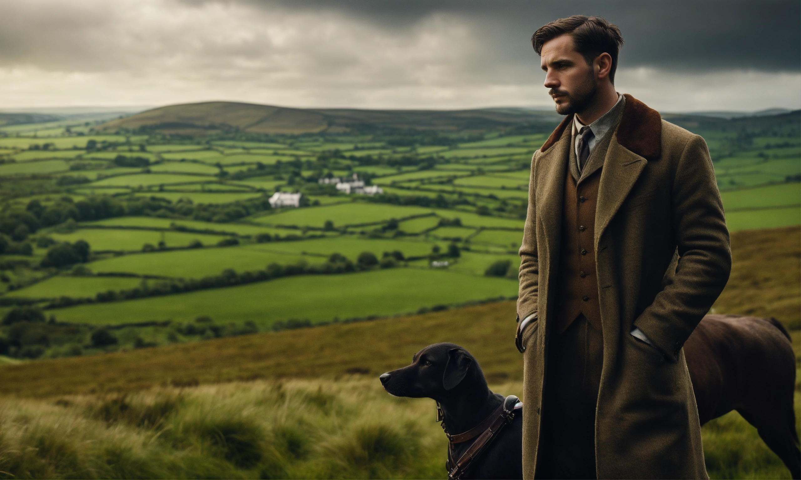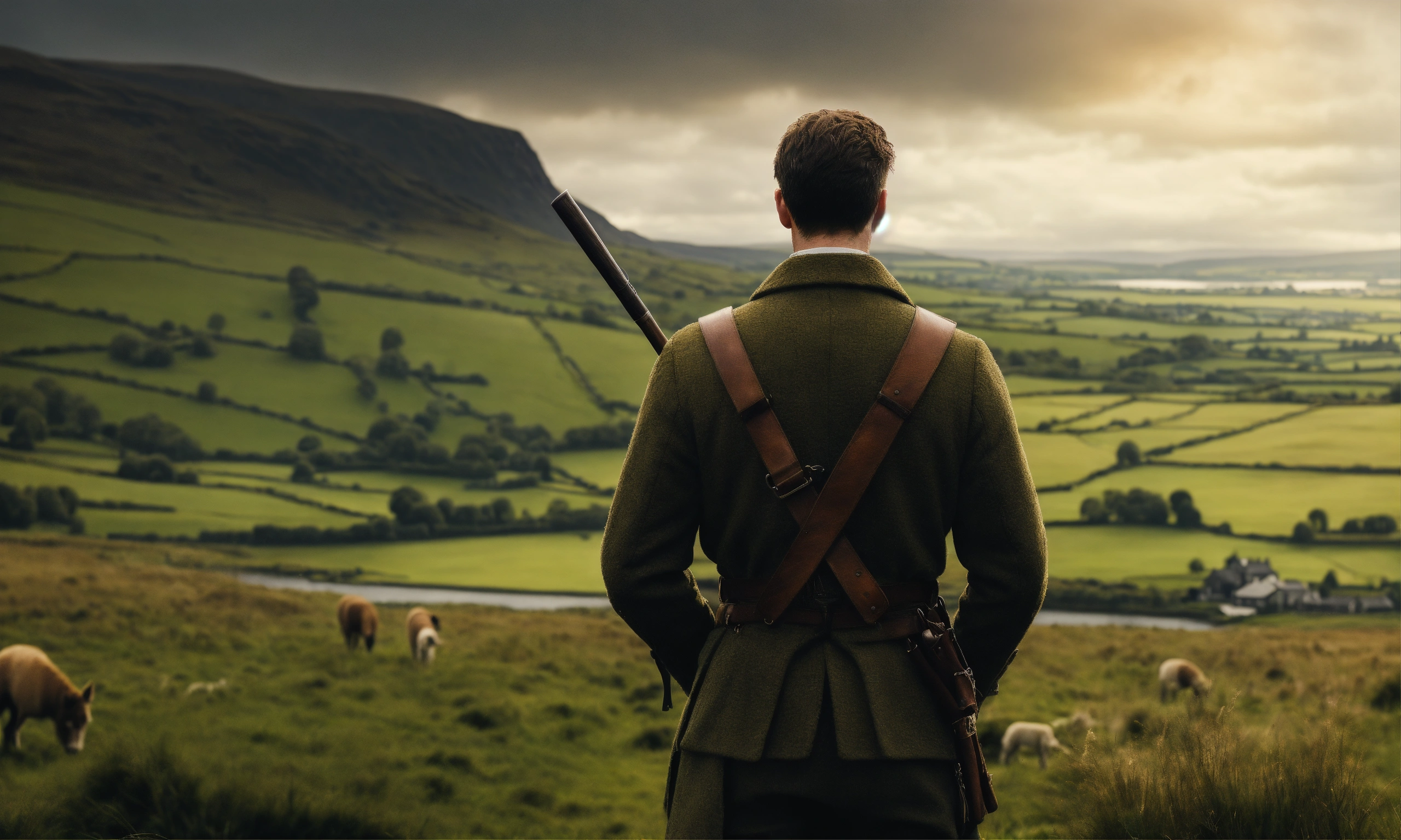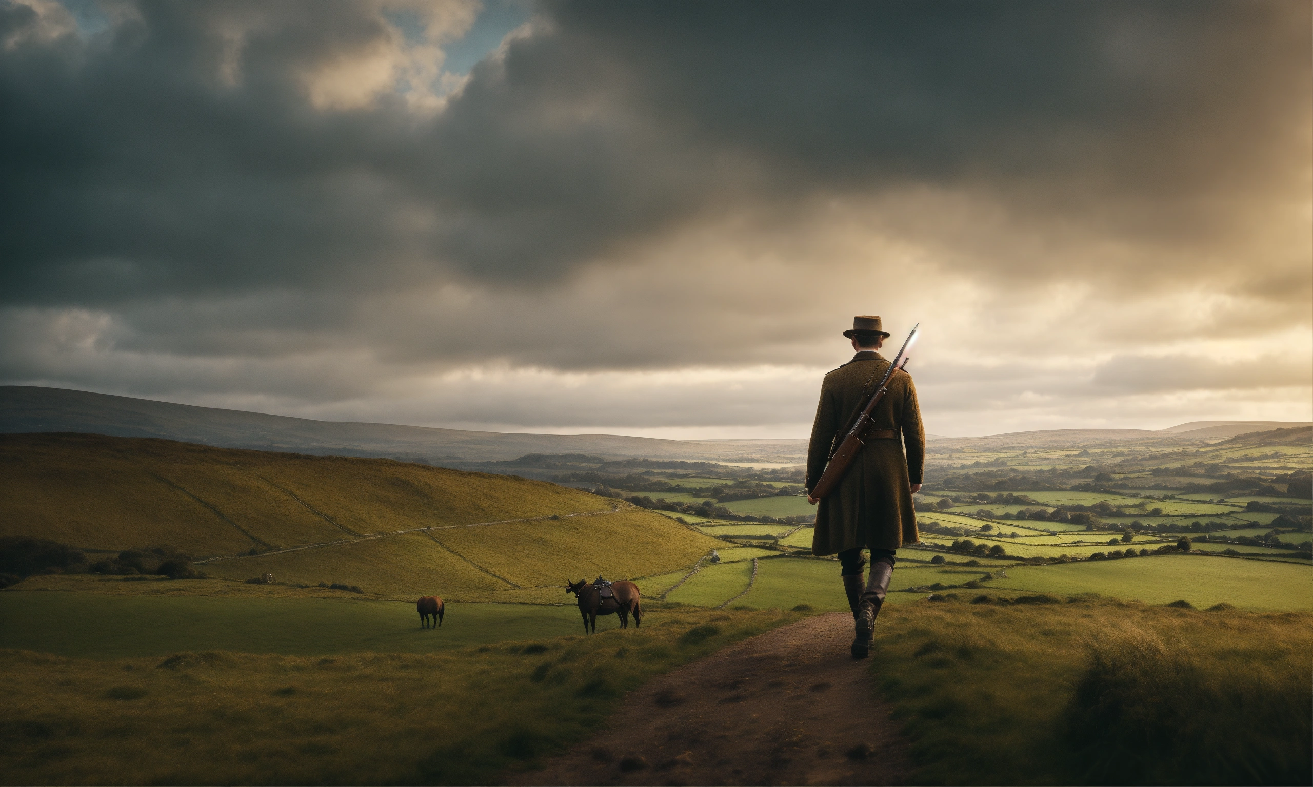 Cinematic wallpaper of a 1920s hunter, 35 years old with short hair, caucasian man, stoic, realistic body proportions, in ireland, irish countryside in the background, cinematic, grimdark, ultra detailed, realistic, hd