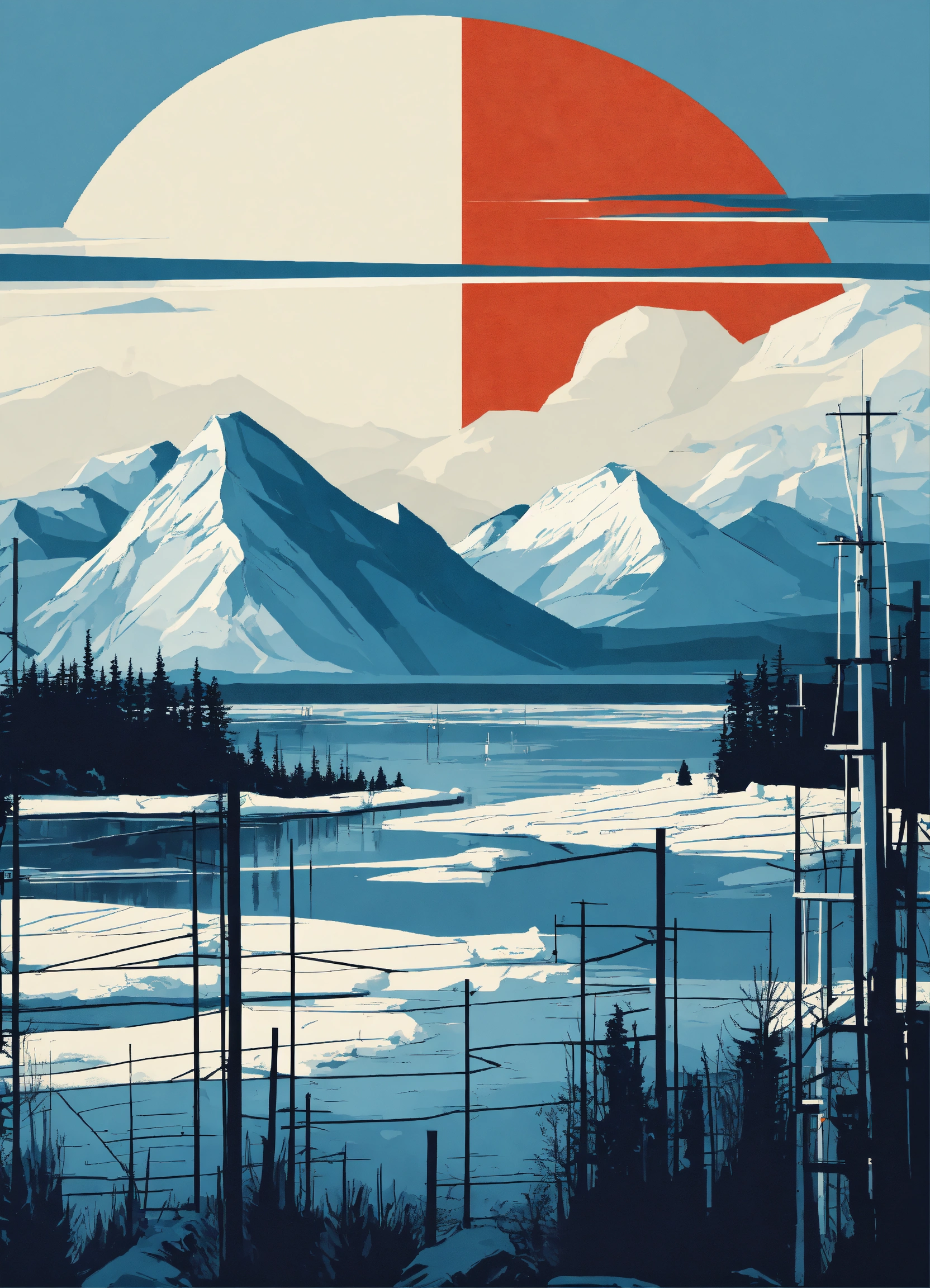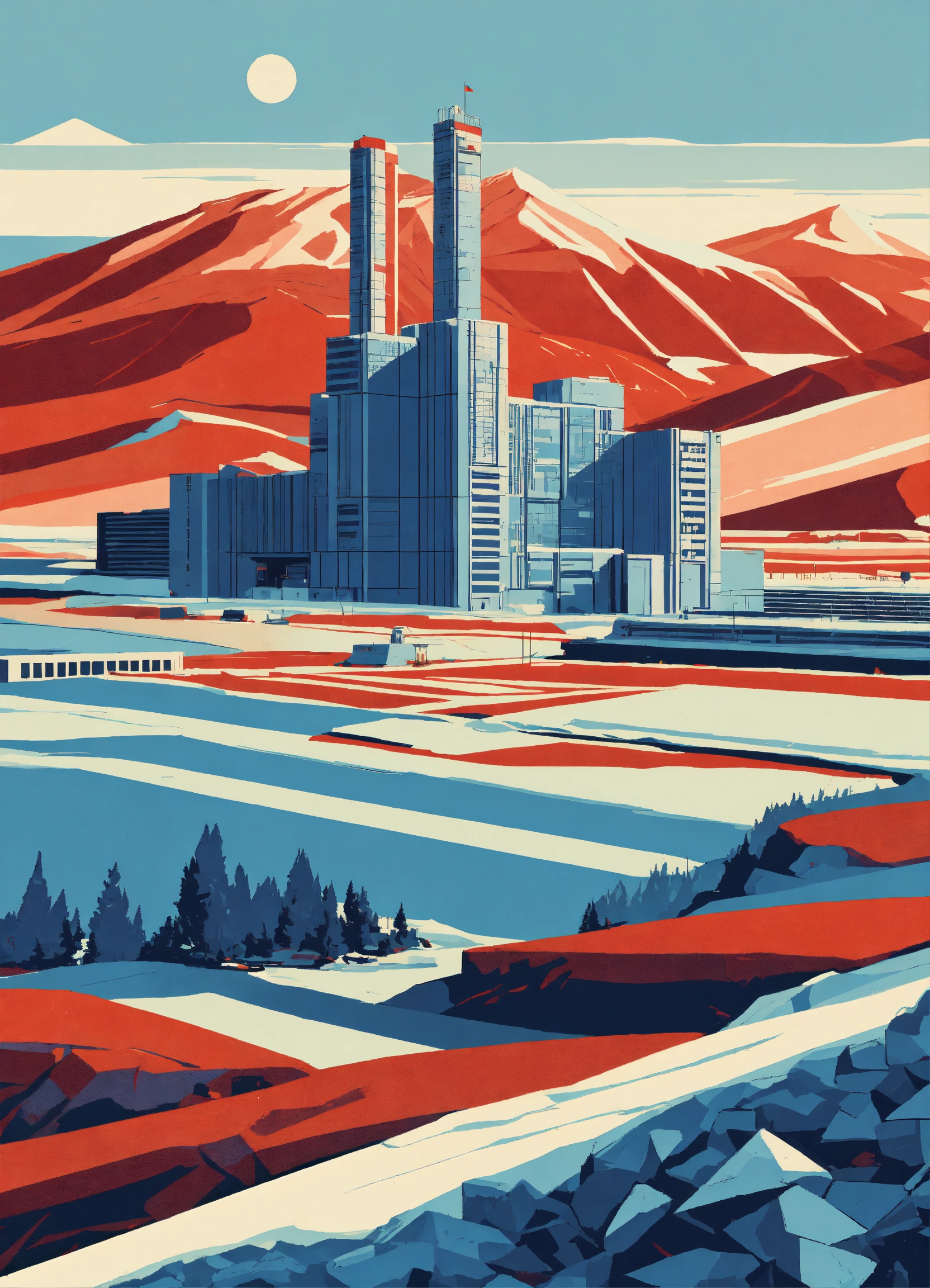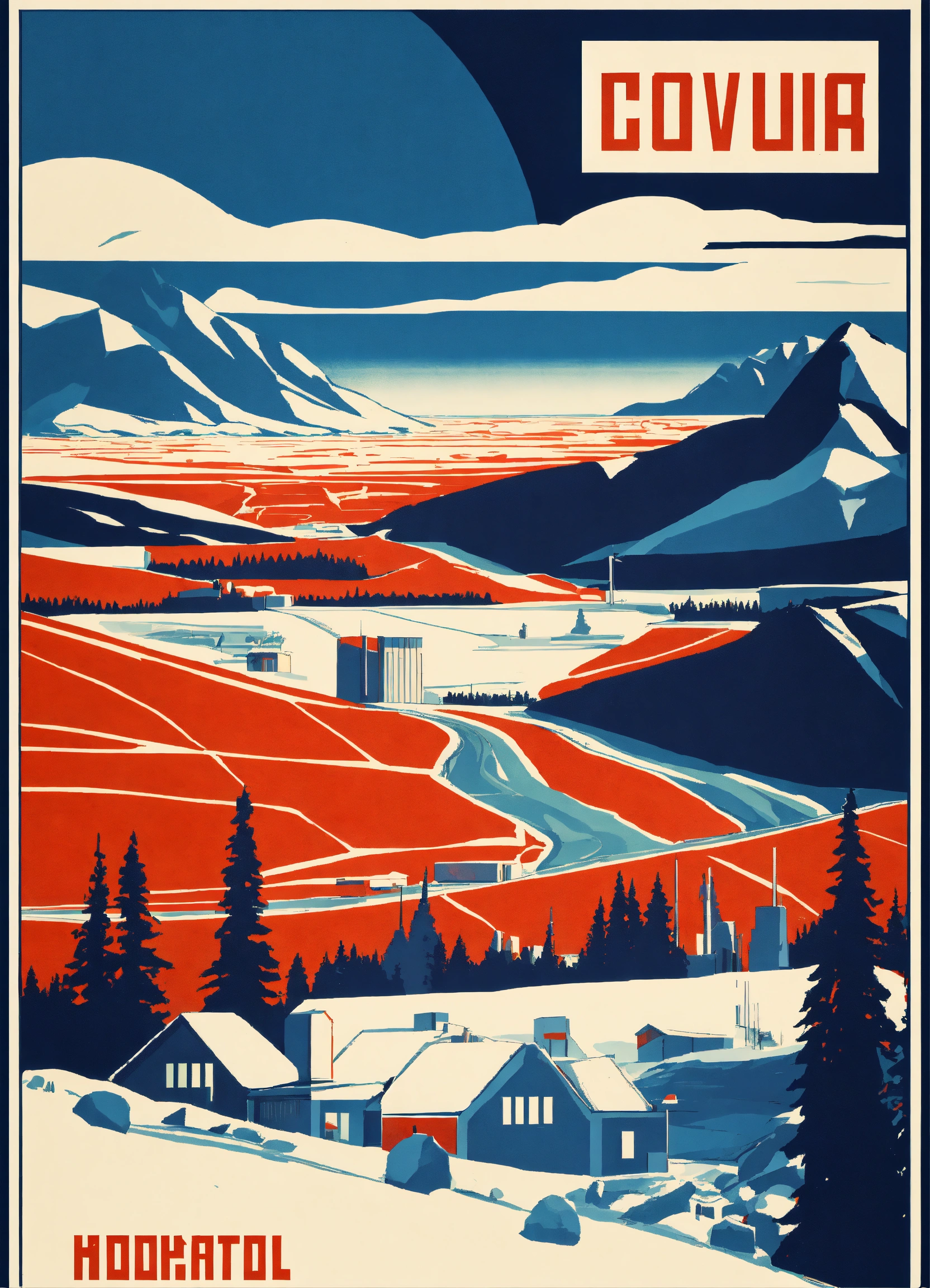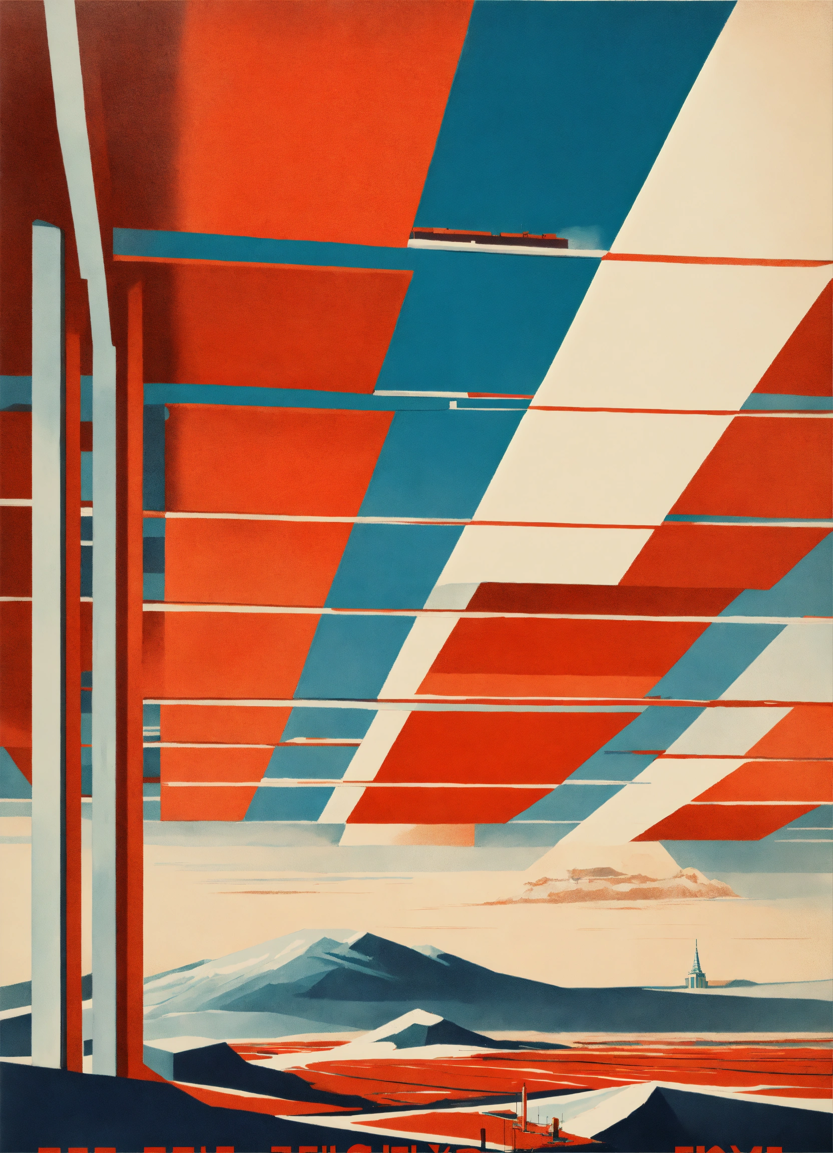 Brutal soviet poster of constructivism, beautiful russia, arctic field landscape, illustration, brutalism, high quality, blue color palette