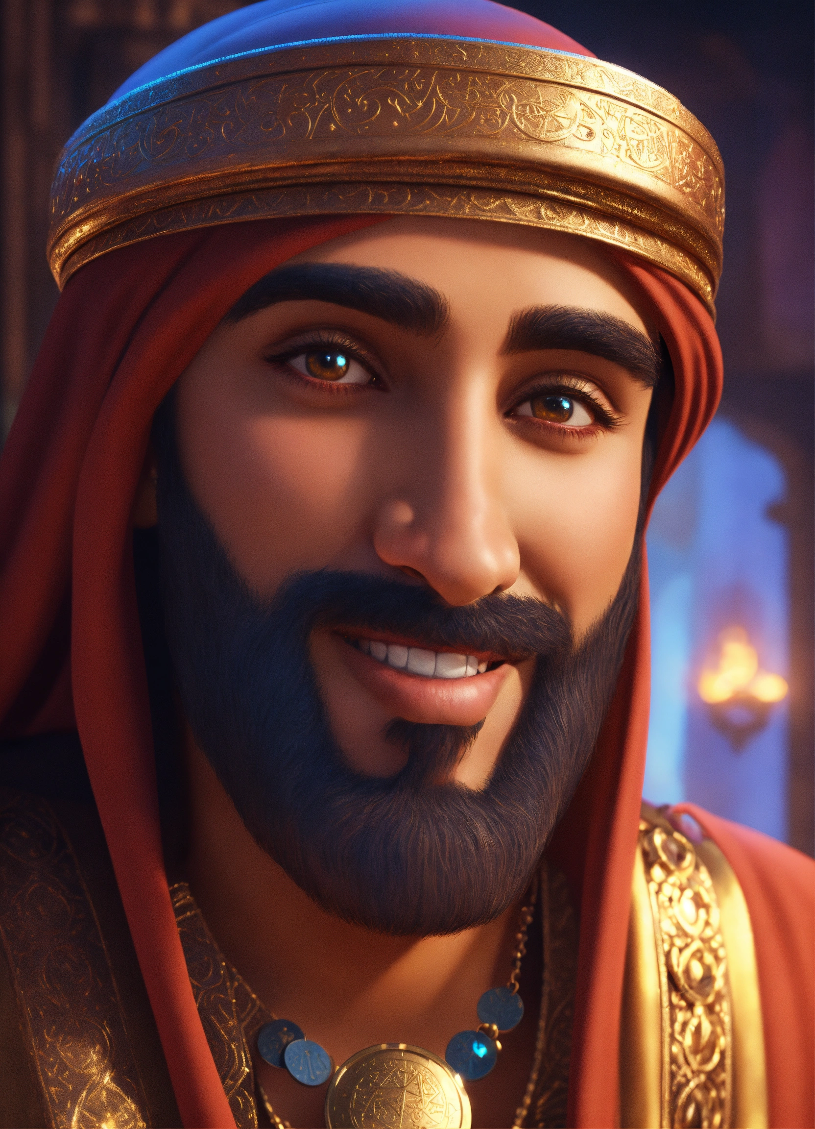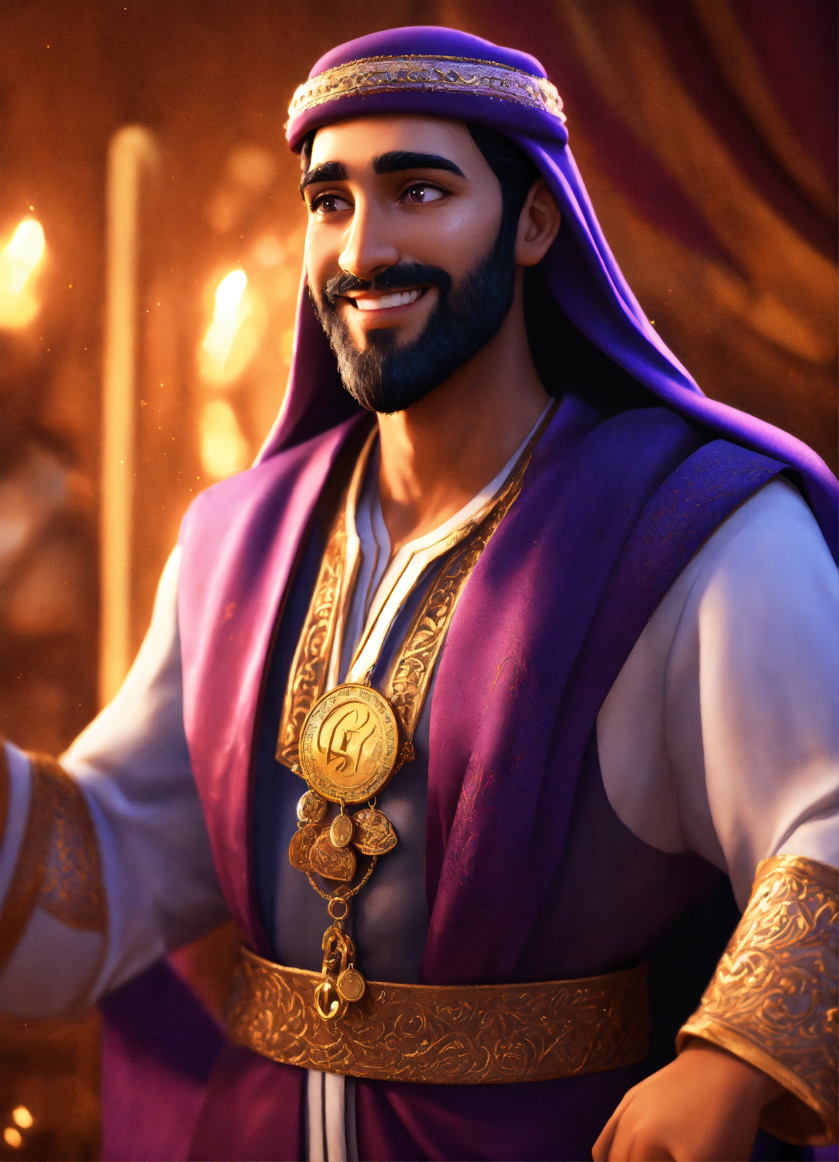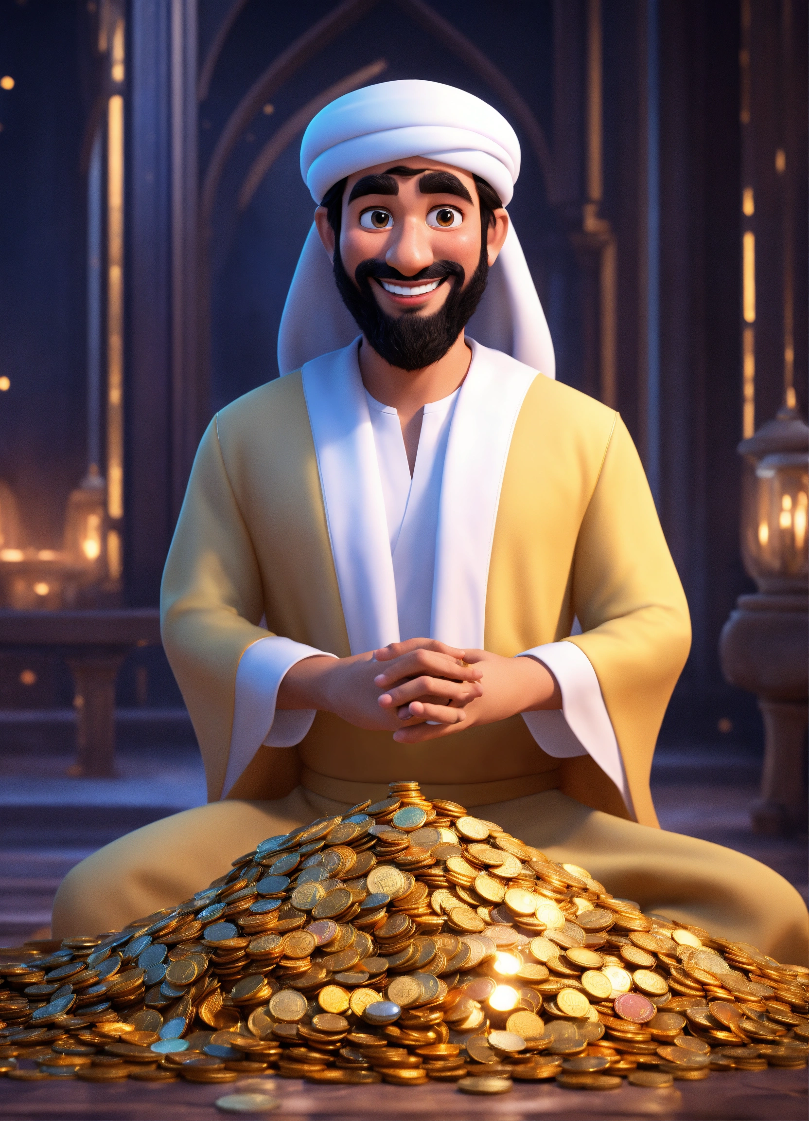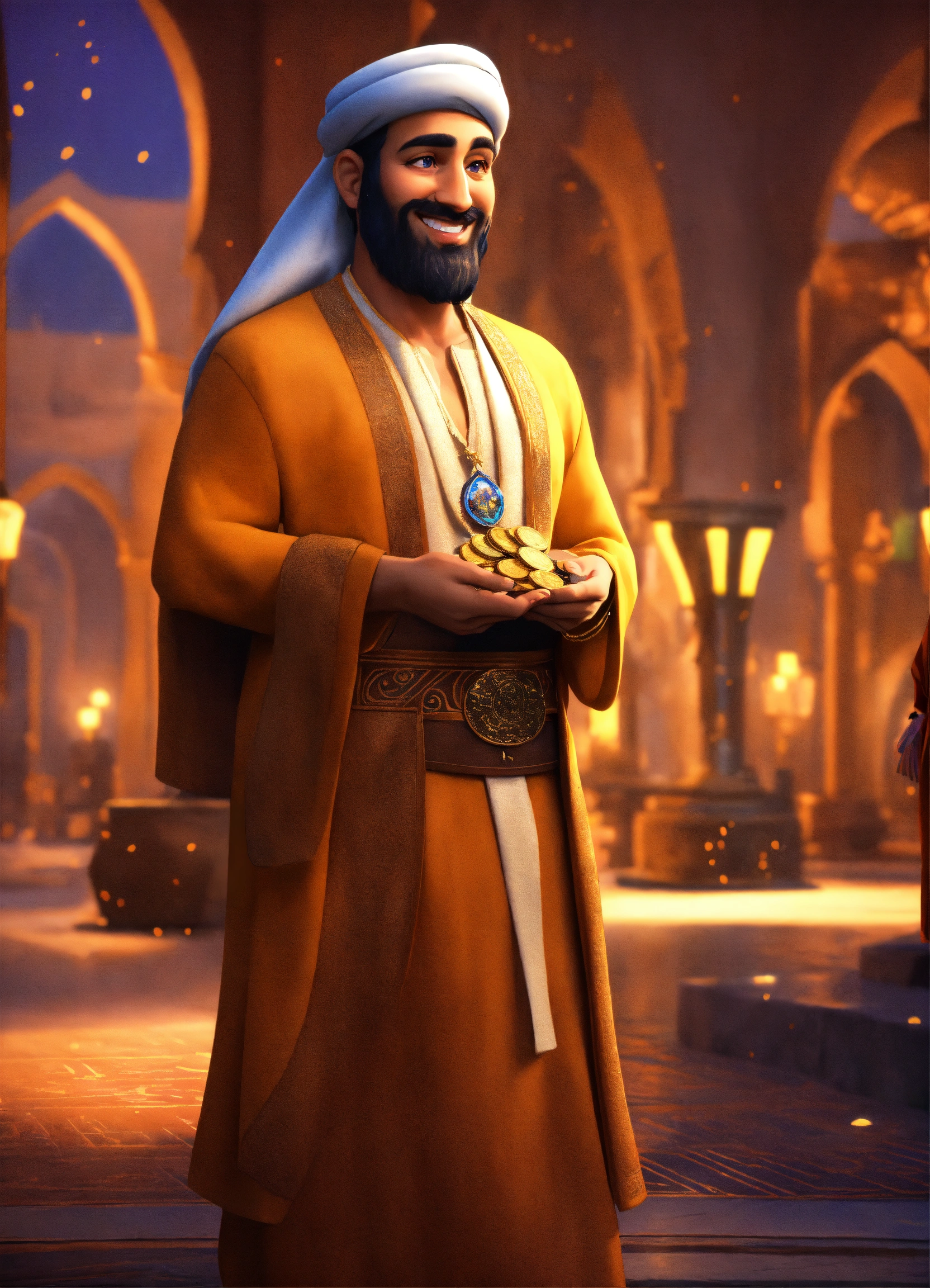 Create a 3d rendering of a wealthy arab male sheikh from dubai, inspired by the disney animation style. the sheikh must have a smile and a playful but wise character. place your character in the atmosphere of arabian nights and aladdin. the image must be in high resolution format. dynamic pose from the waist up, holding coins in your hands in front of you. (pixar art style)++ highly detailed digital painting, art stations, concept art, soft focus, hard focus, illustrations. cinematic, visual effects, hdr, unreal engine 5, ray tracing, soft light, 8k, high detail, sparkling backlighting, luxury gem, game art, 3d, cartoon, colorful, magical, mysterious