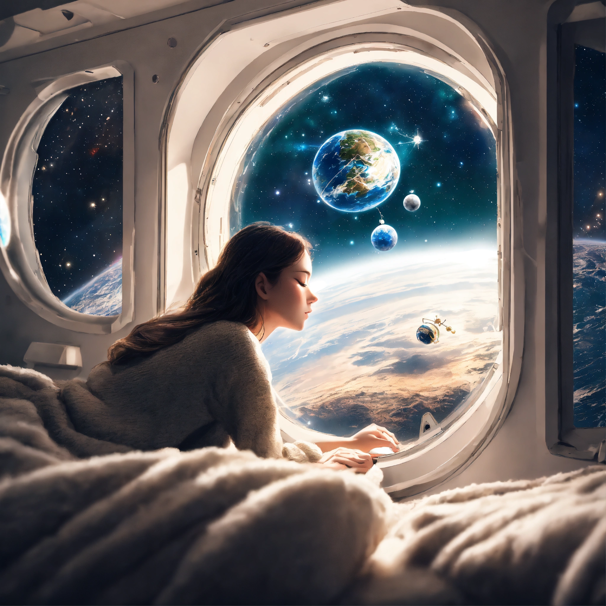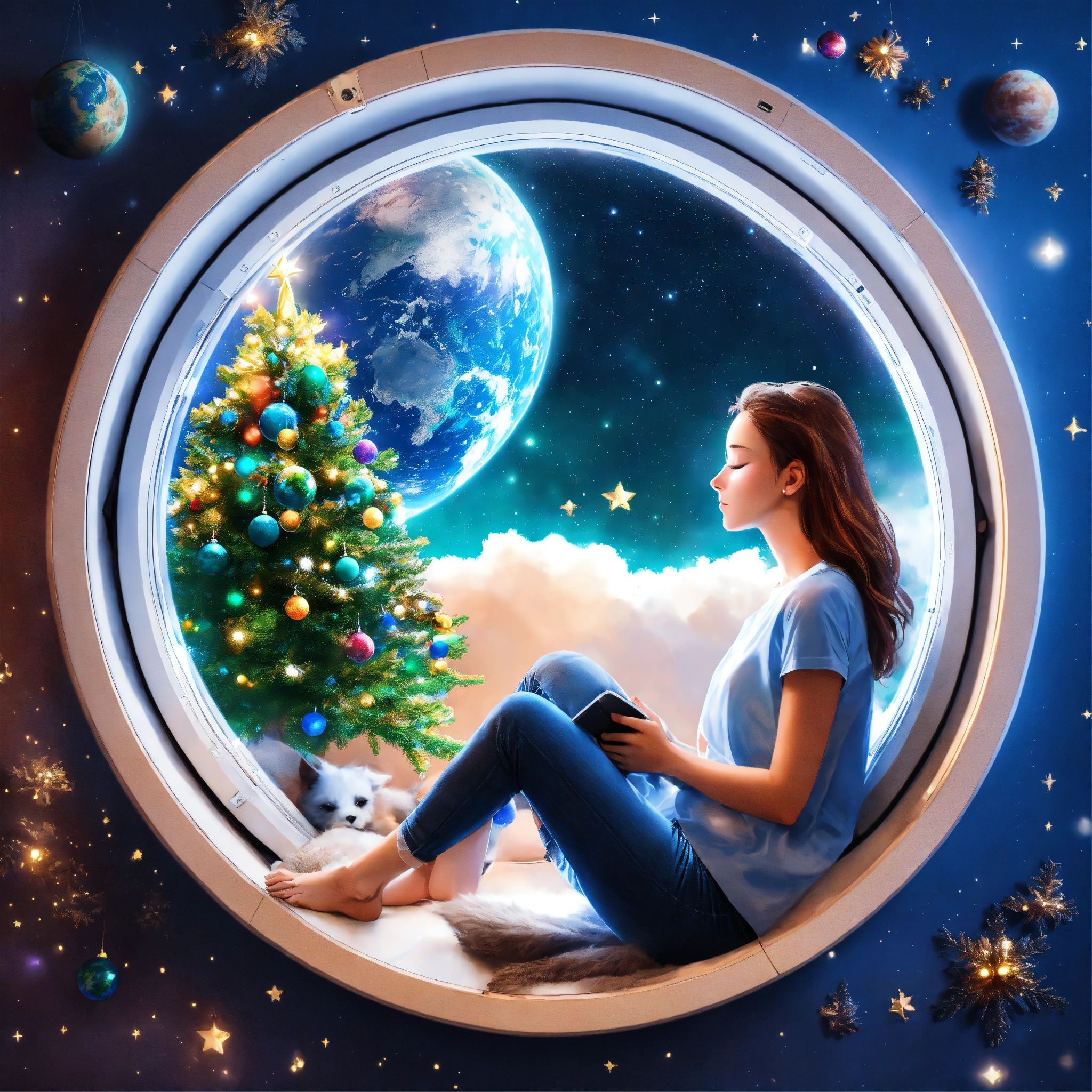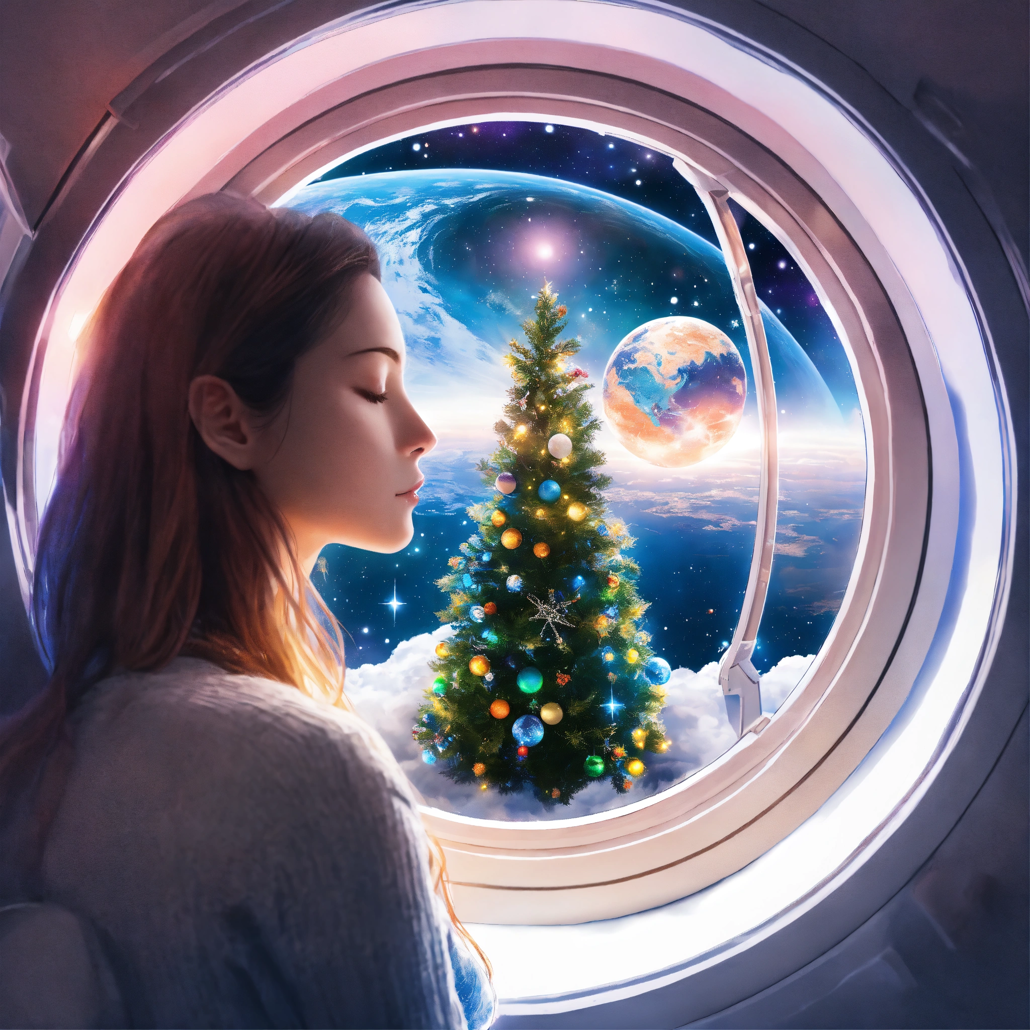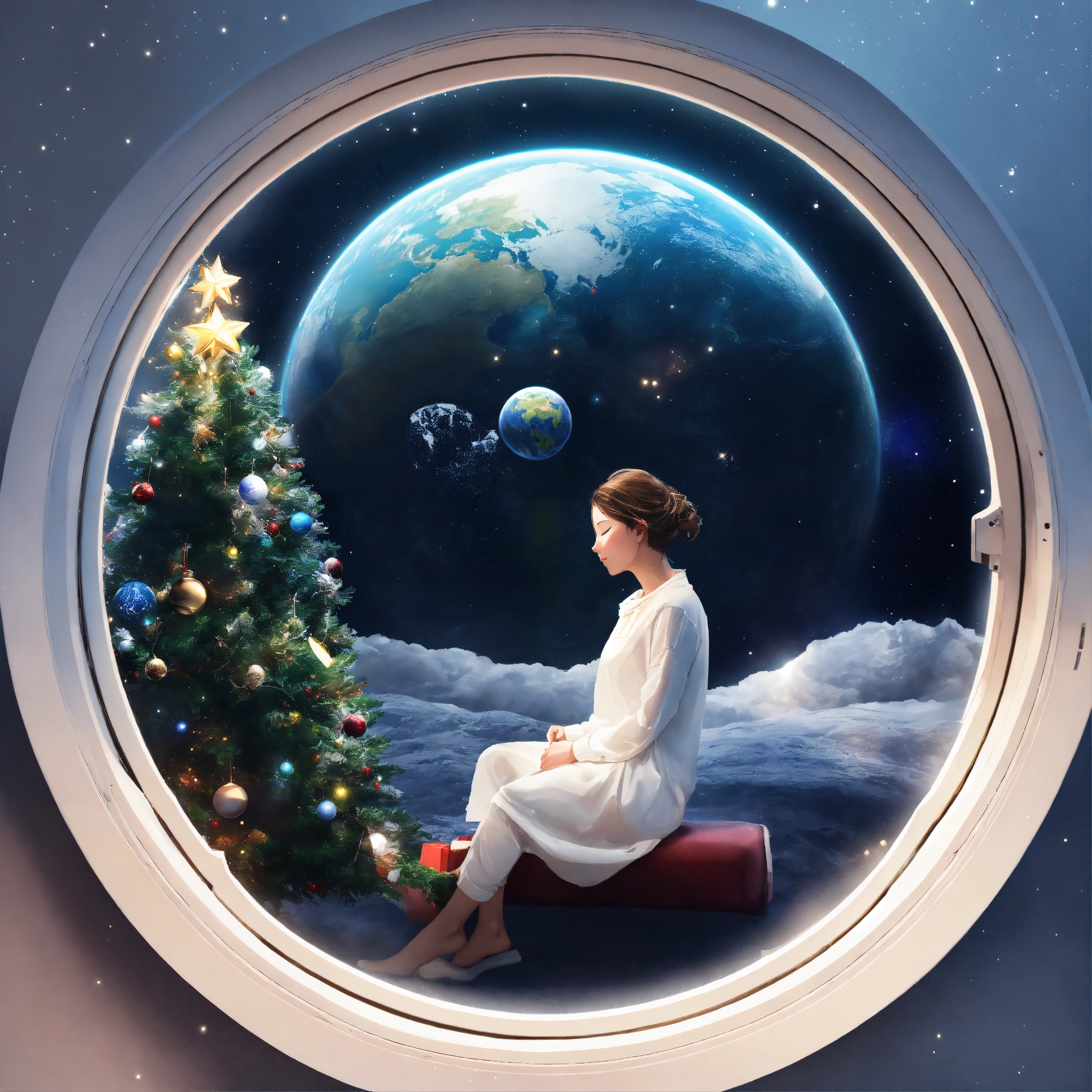 Woman sleeping near window and watching earth from spaceships window and have small chrismas tree inside spaceship, in circle image, holographic, best quality, white outside of circle, white background, just 1 planet