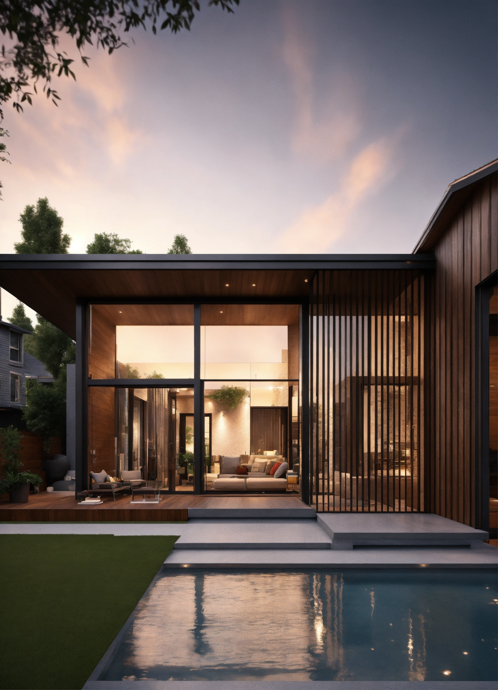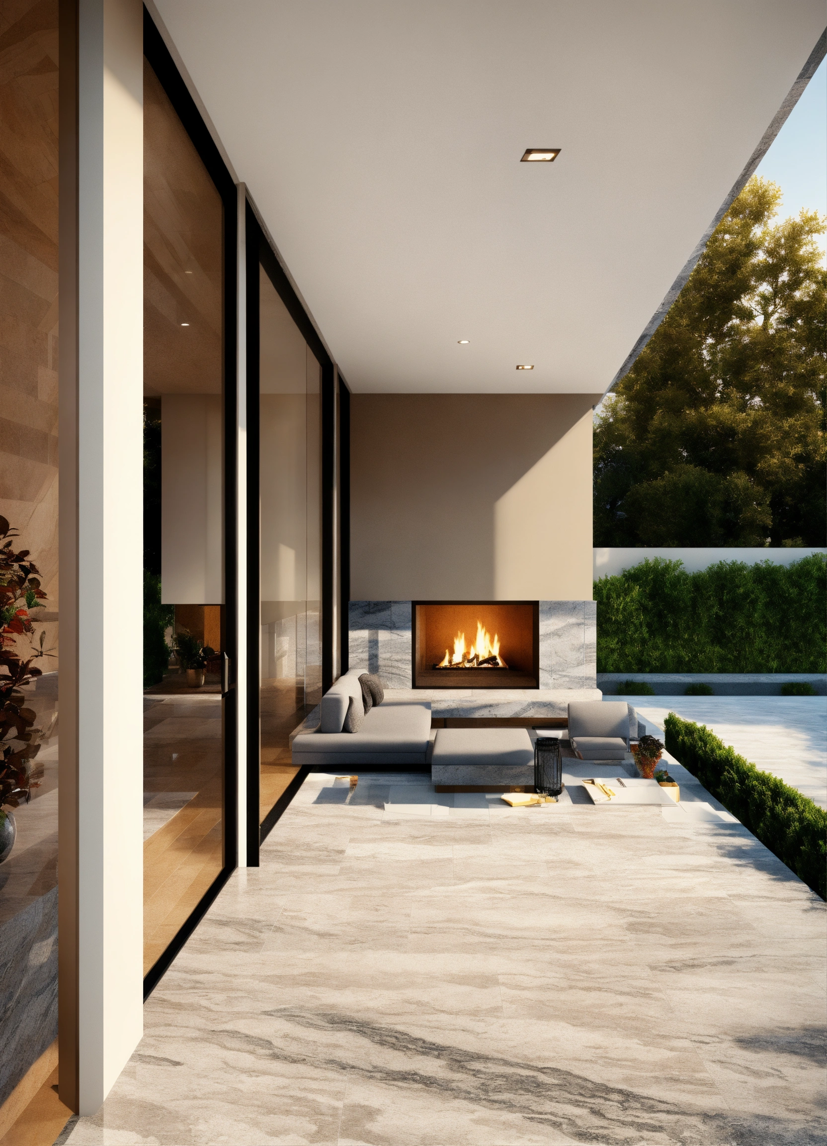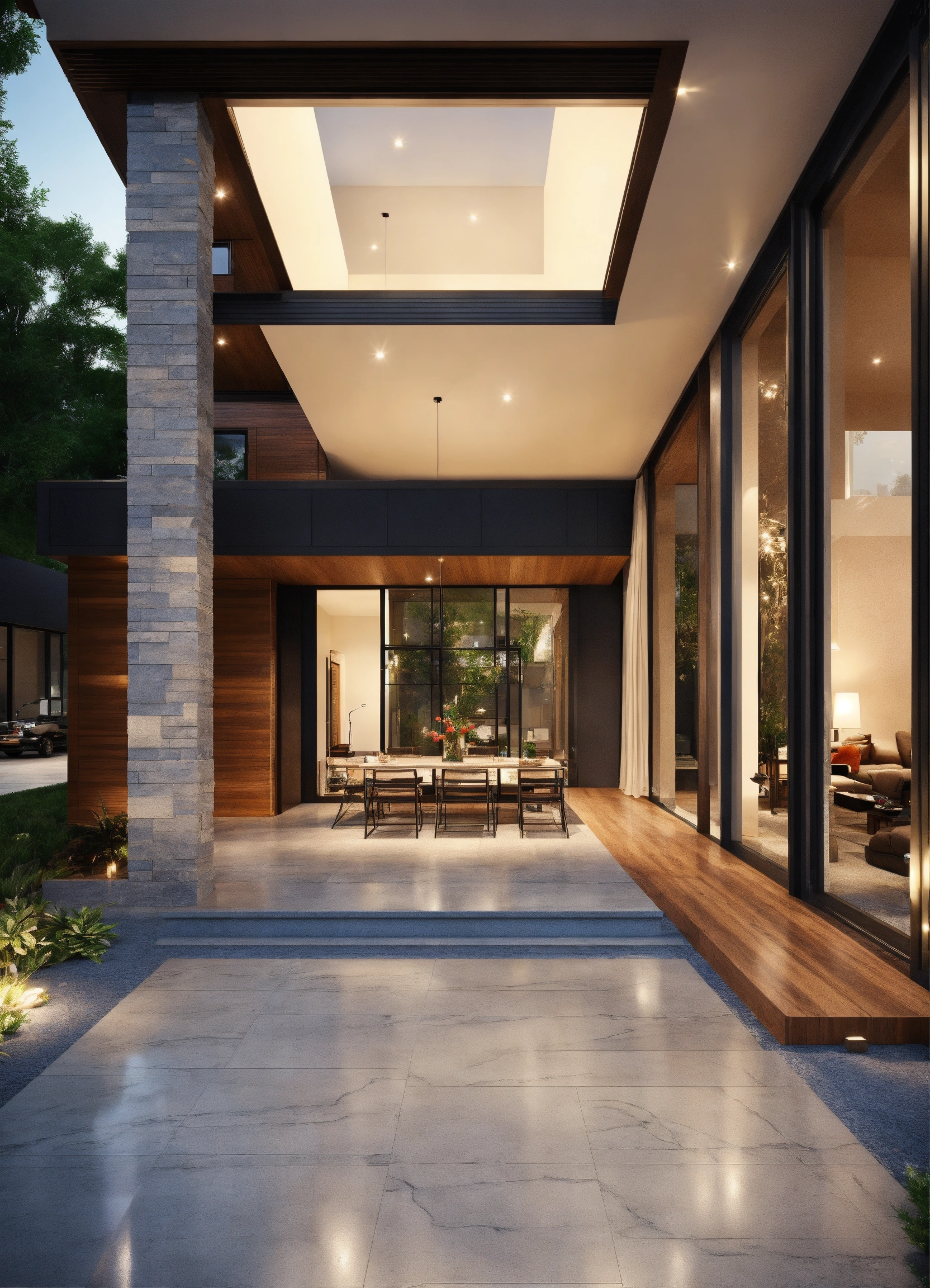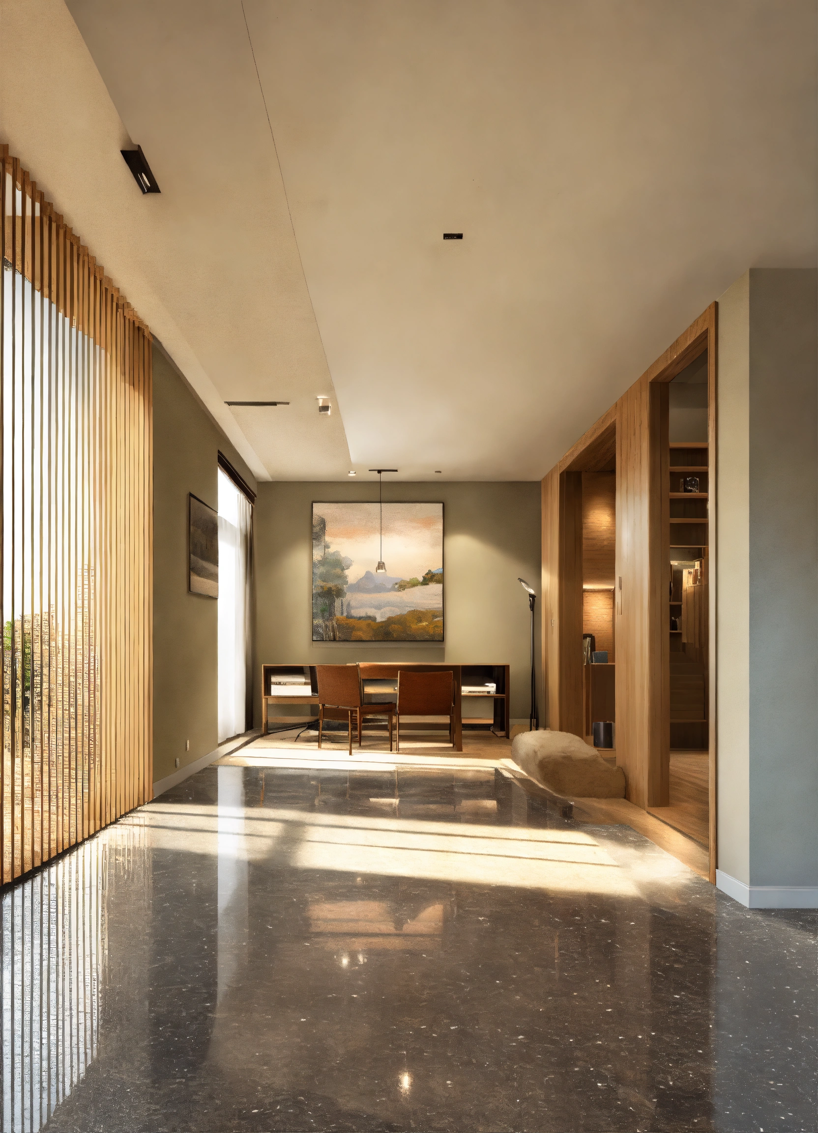 American modern style house in one level medium size house interior design, granite floor, photorealistic