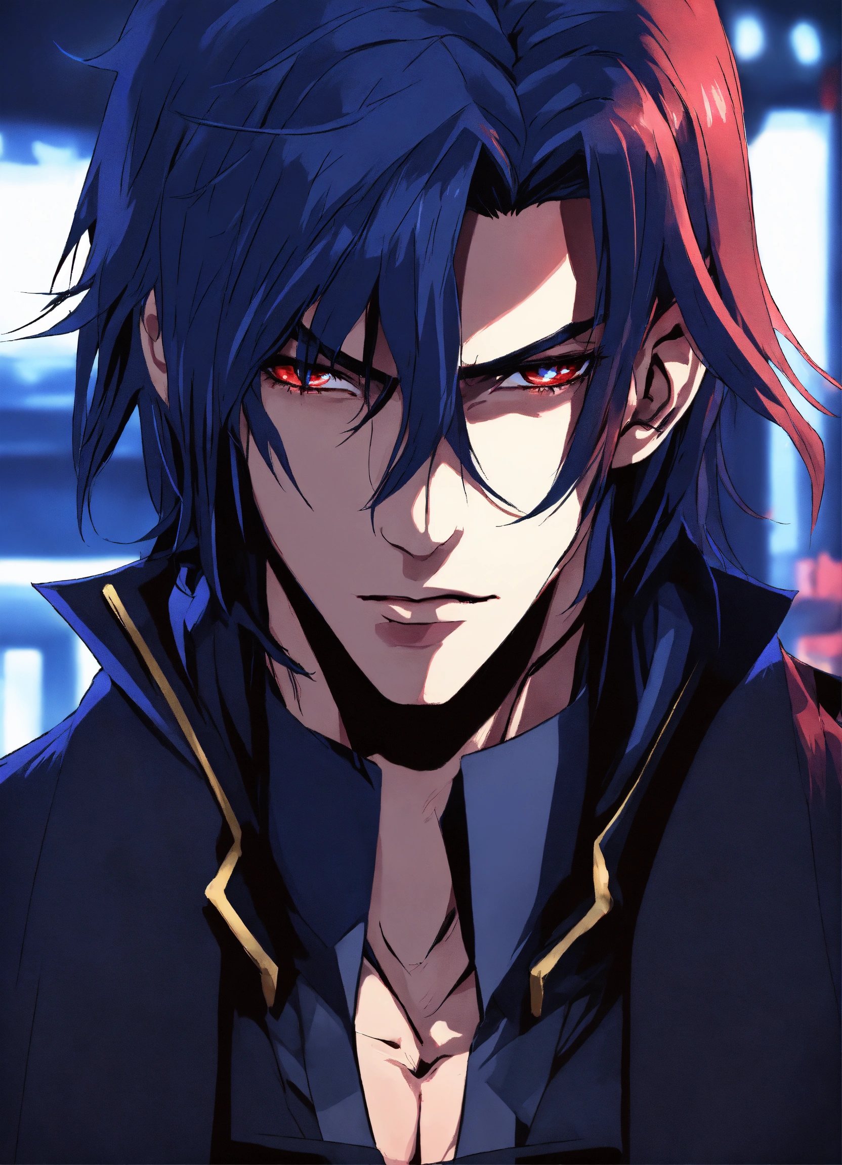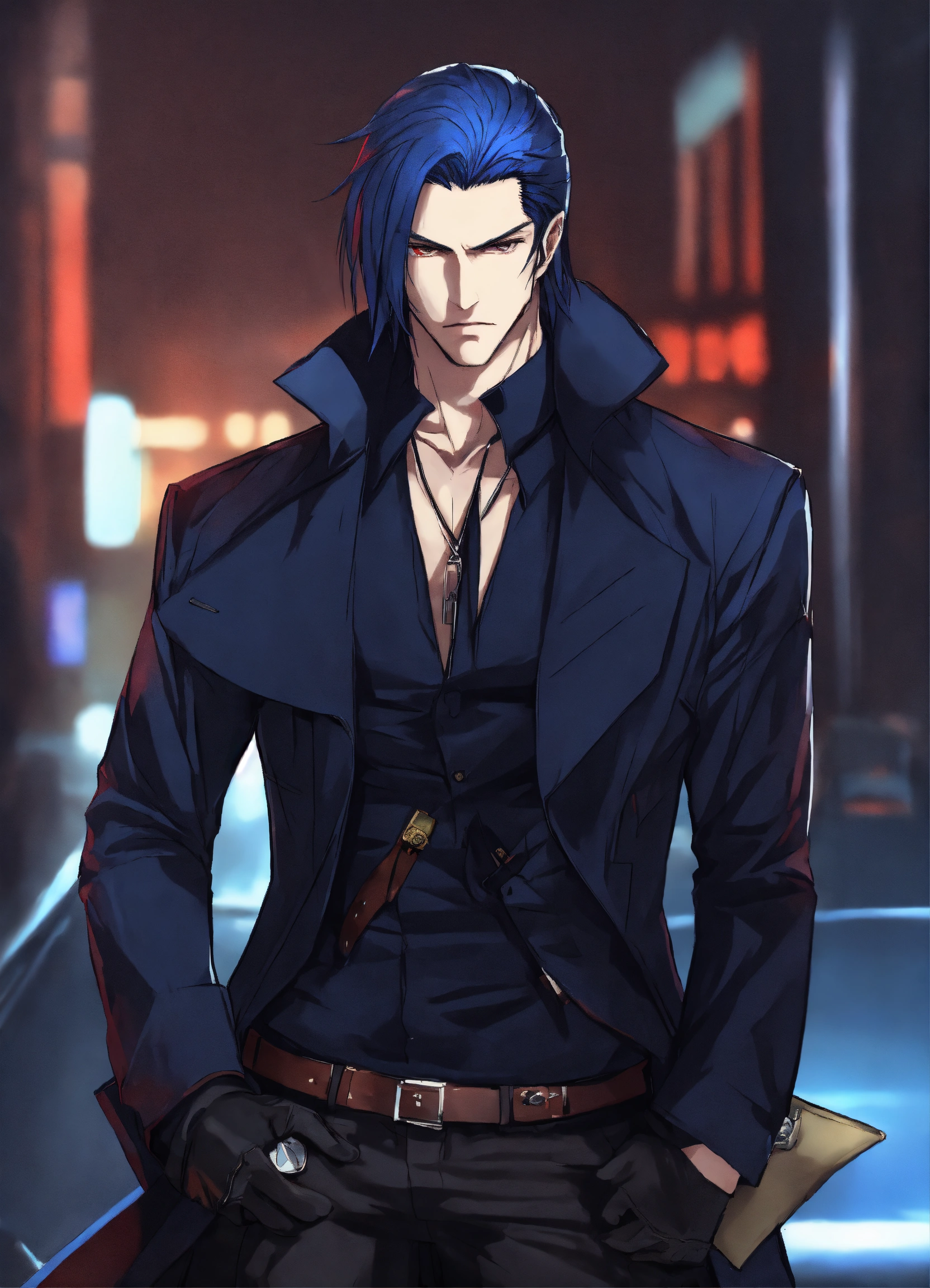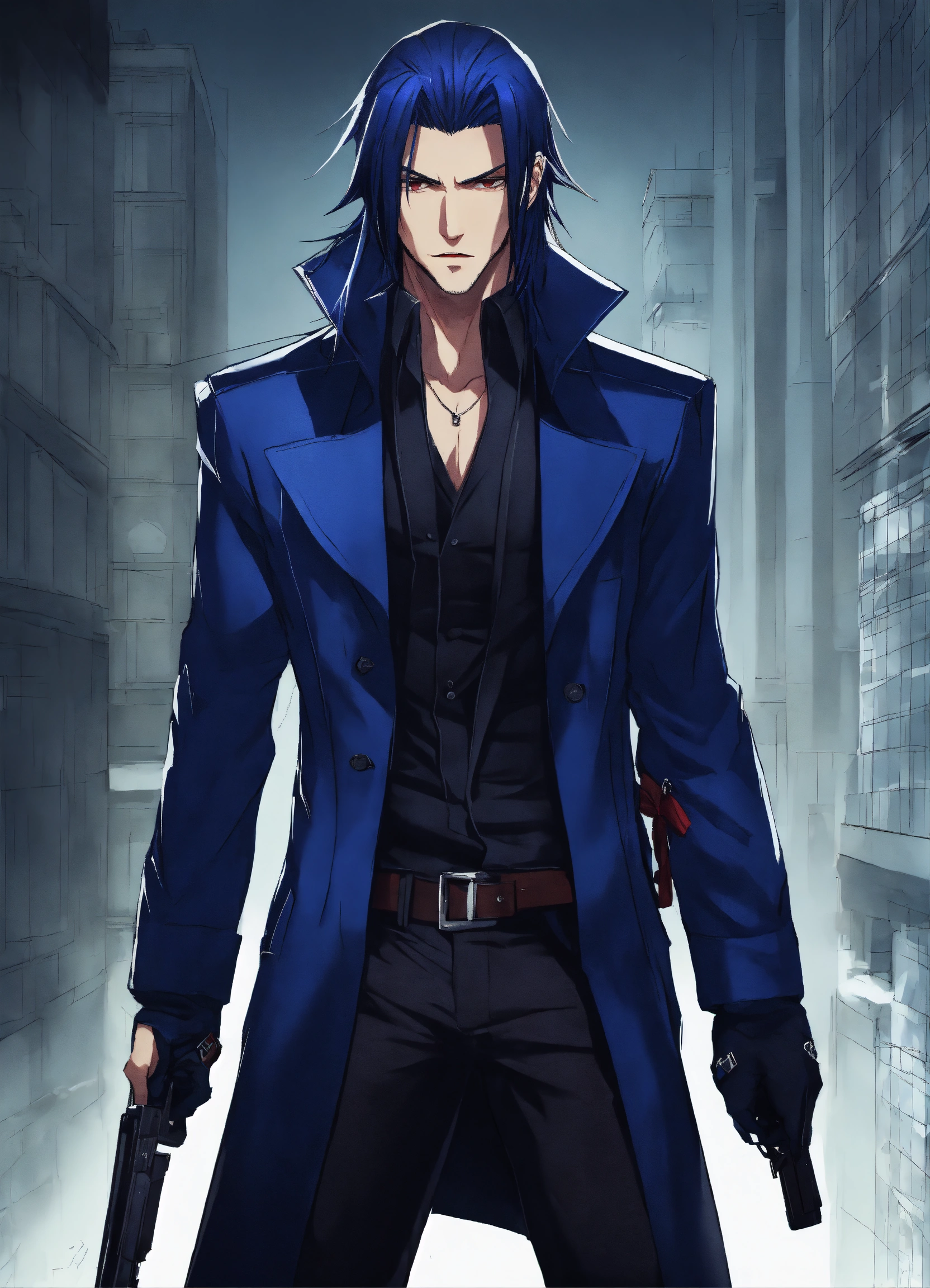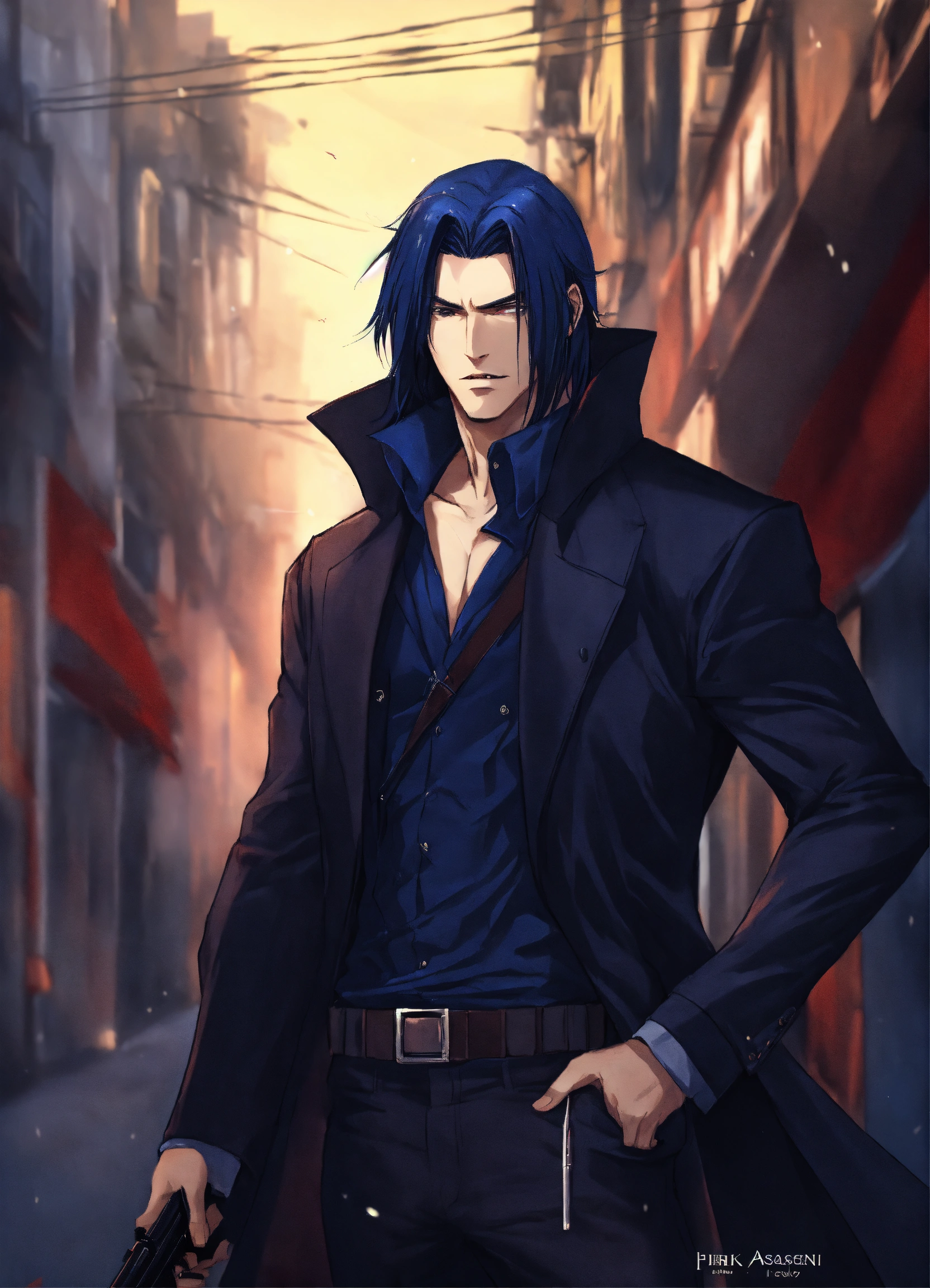 Dark blue hair, handsome man, assassin, modern, hitman, cold looks, long hair, anime, cartoon, cell shaded, vampire, black assassin outfit