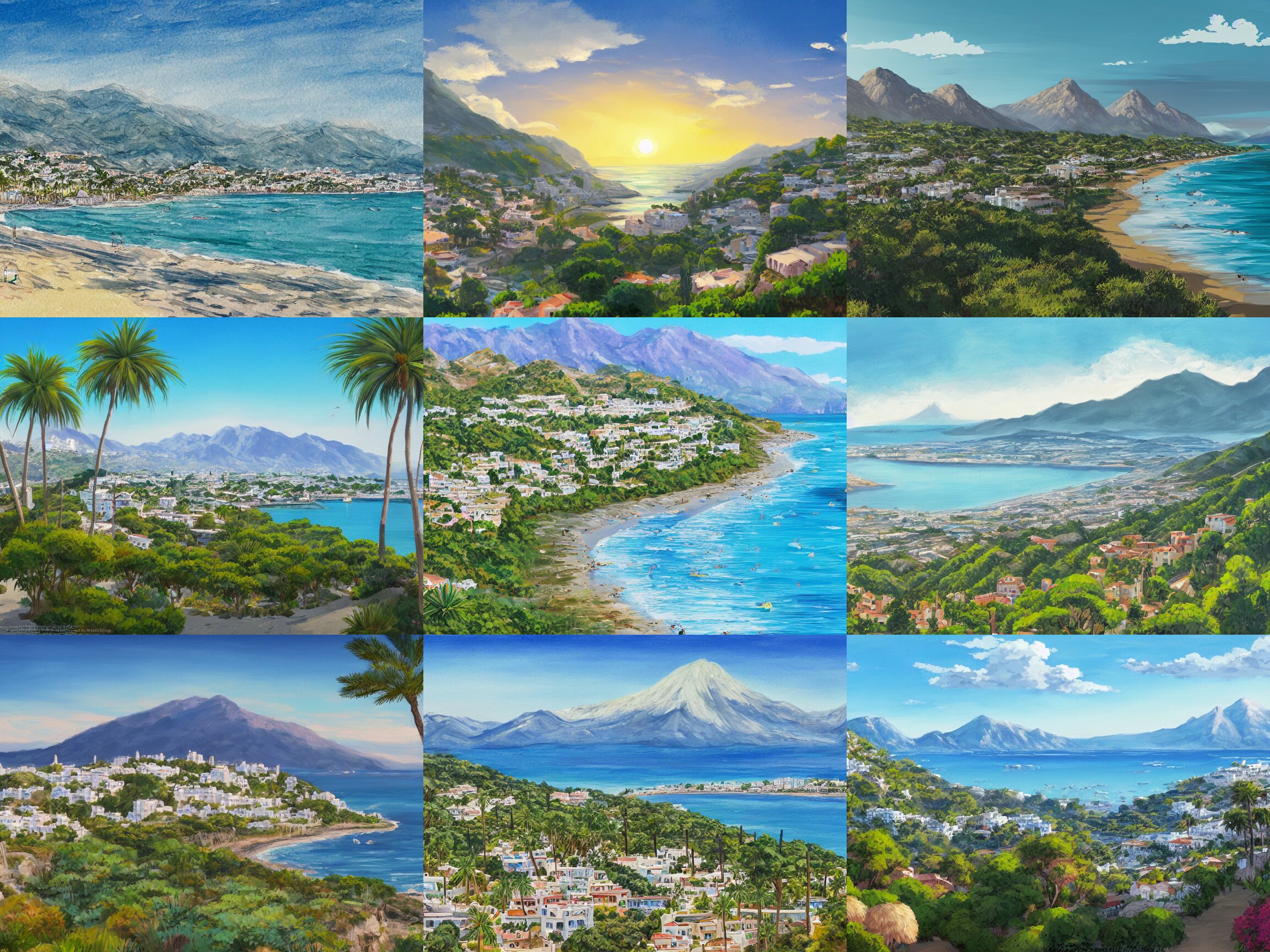 Very detailed view marbella landscape, sun coast, small city, beach, mountain in the background, trending on artstation, studio ghibli, fine art, 8 k resolution