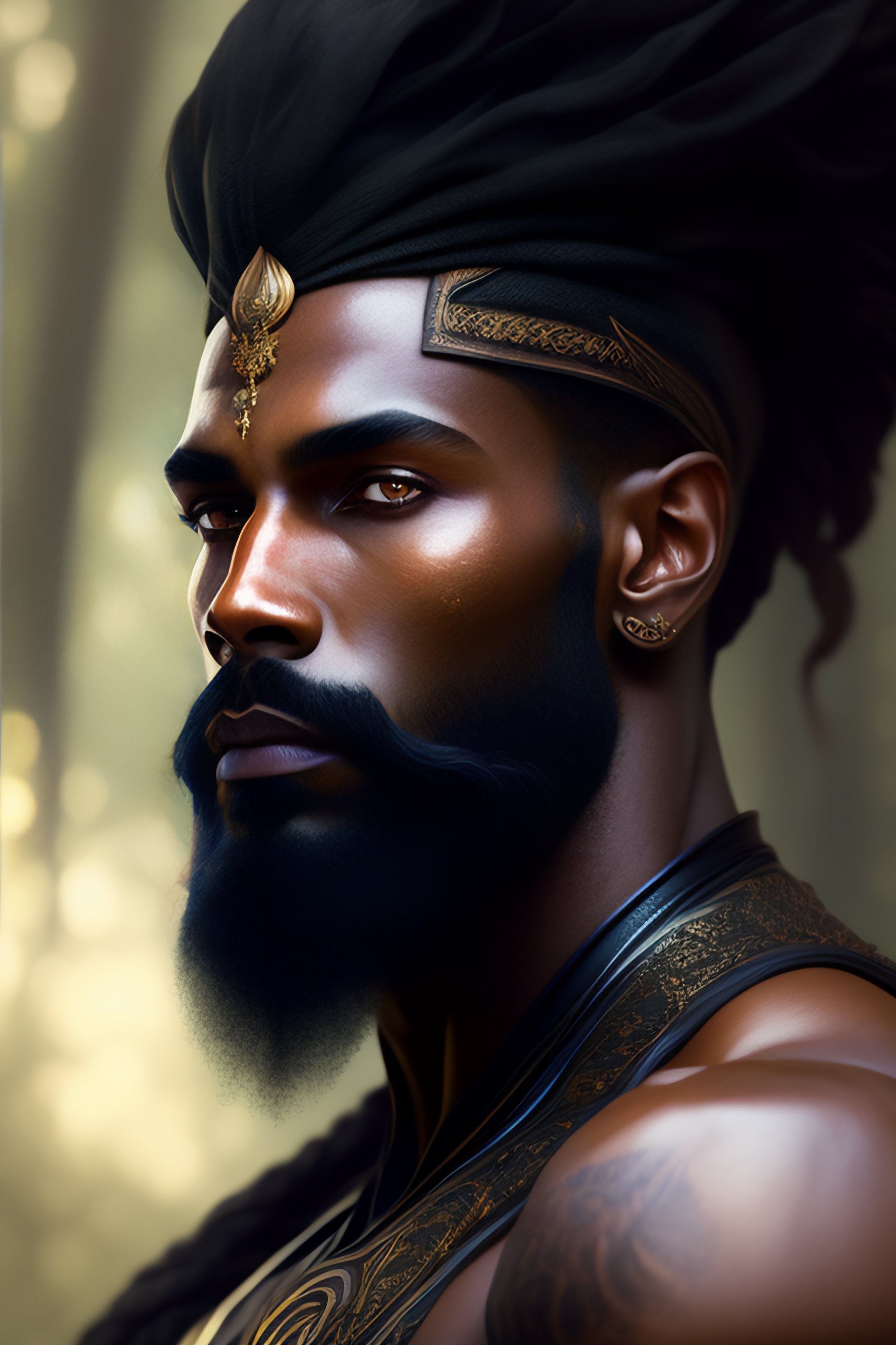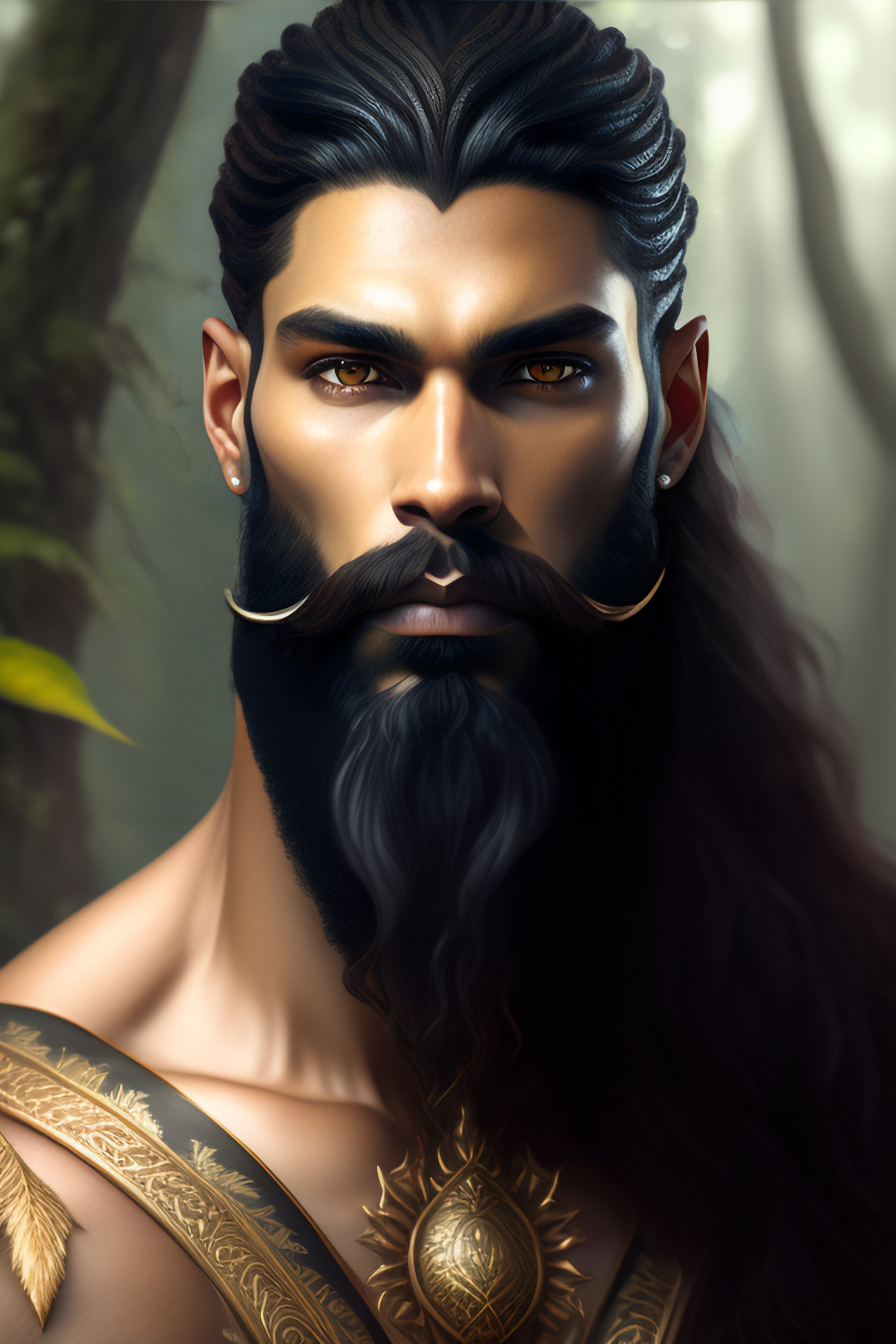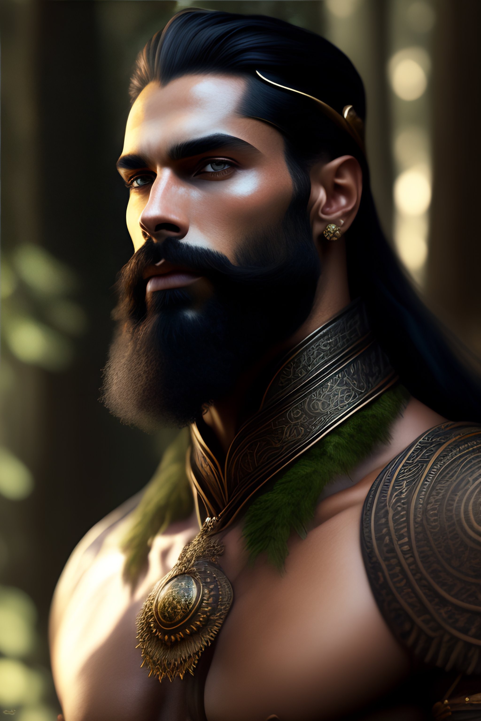 Portrait of forest god, fantasy alien forest, male, masculine, realistic textured black beard, full body, muscular, fantasy, intricate, elegant, highly detailed, digital painting, deviantart, artstation, concept art, matte, sharp focus, photo realistic, detailed face, realistic pale skin, greg rutkowski and alphonse mucha