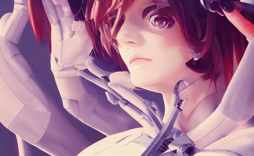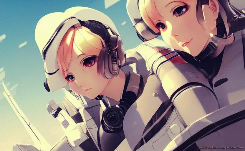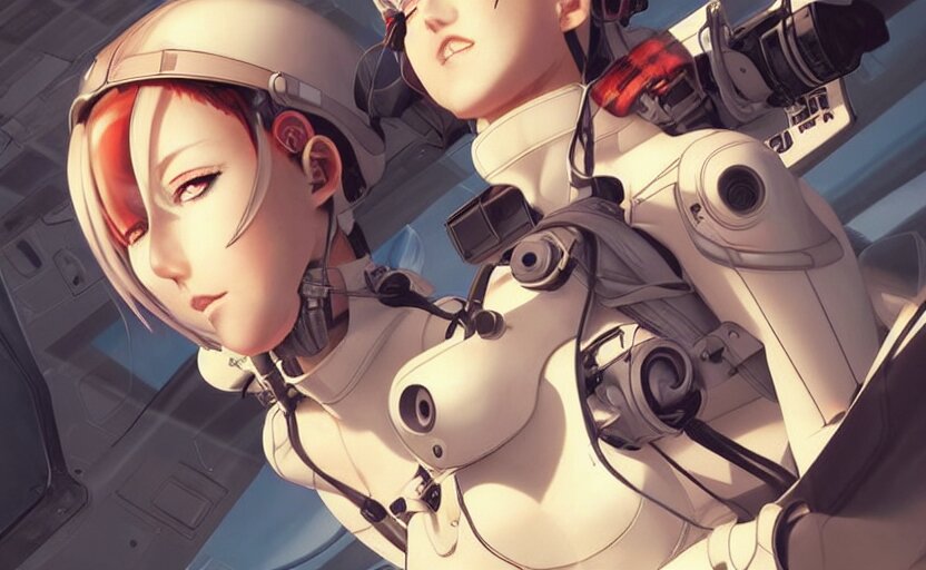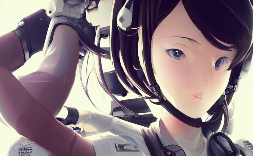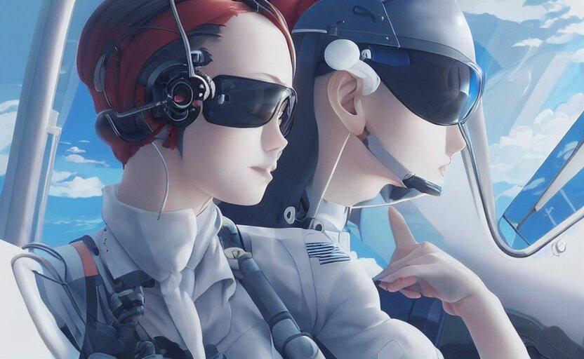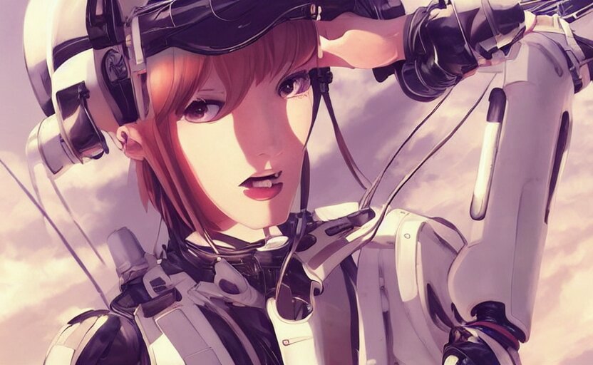 Pilot girl in her airplane, cyborg parts, anime style, occlusion shadow, specular reflection, rim light, unreal engine, range murata, artstation, pinterest, art by hiroaki samura and ilya kuvshinov and rossdraws, intricate, highly detailed 8 k, art deco illustration, extremely beautiful shape of face, neck, shoulders eyes
