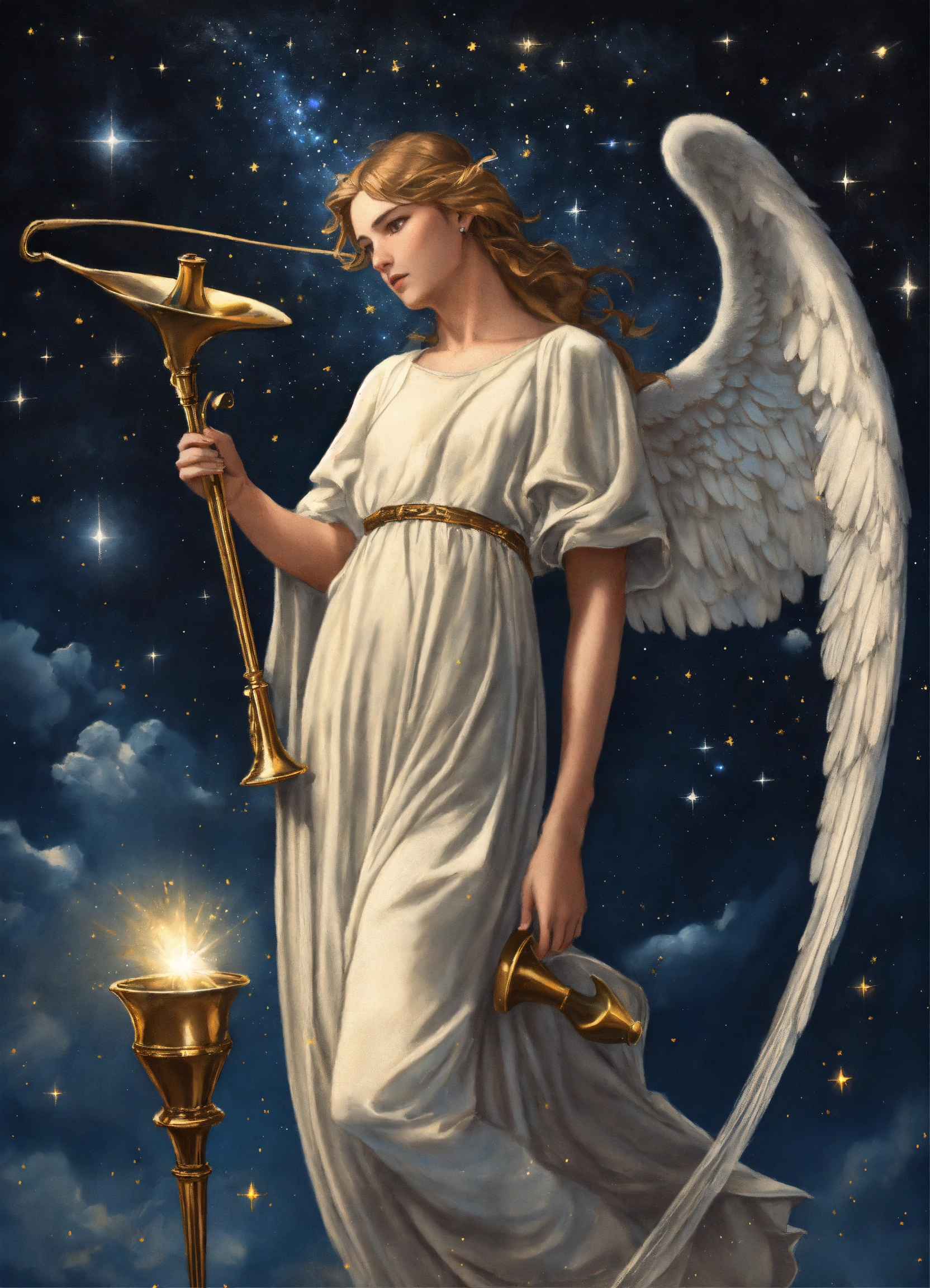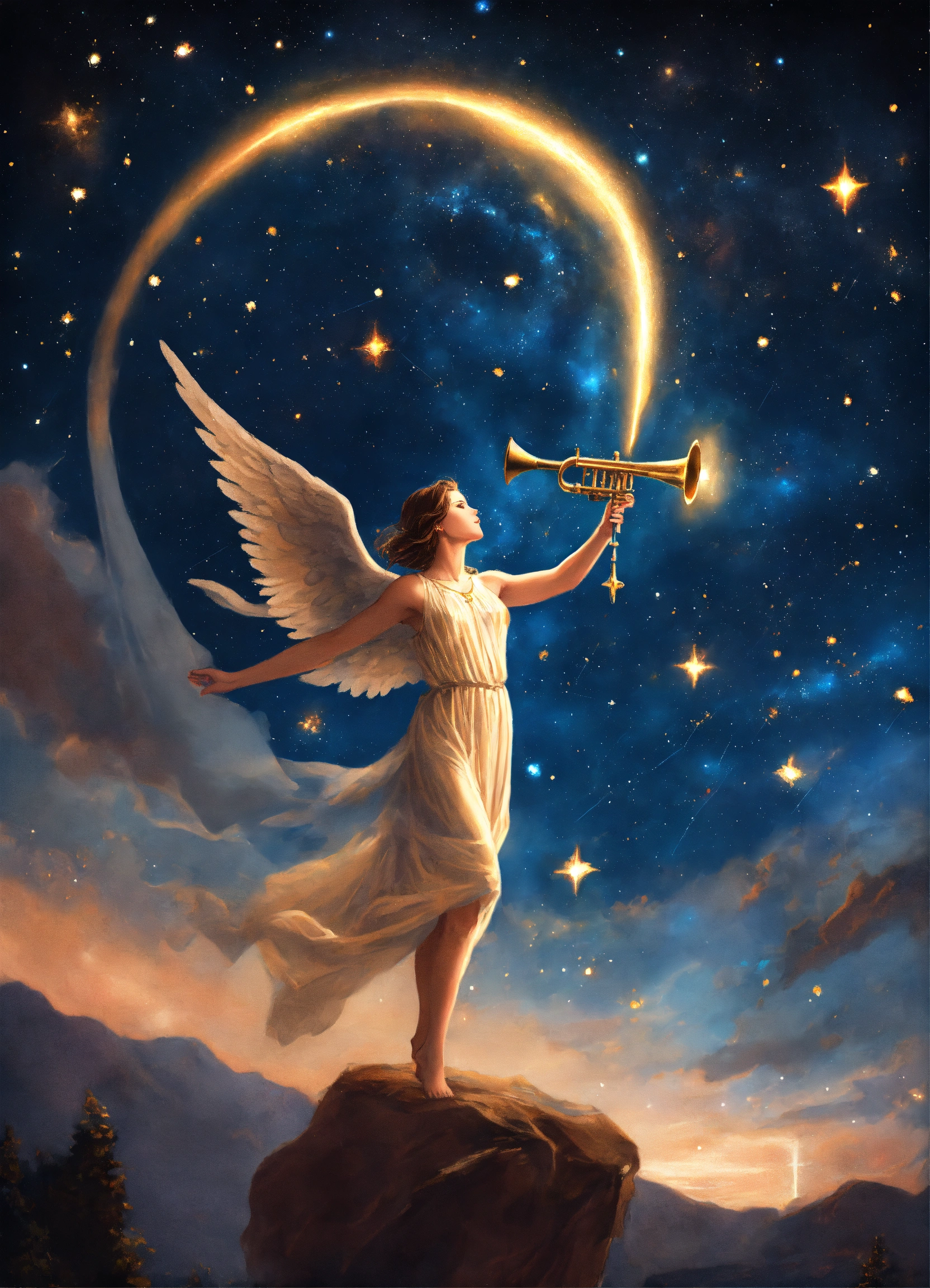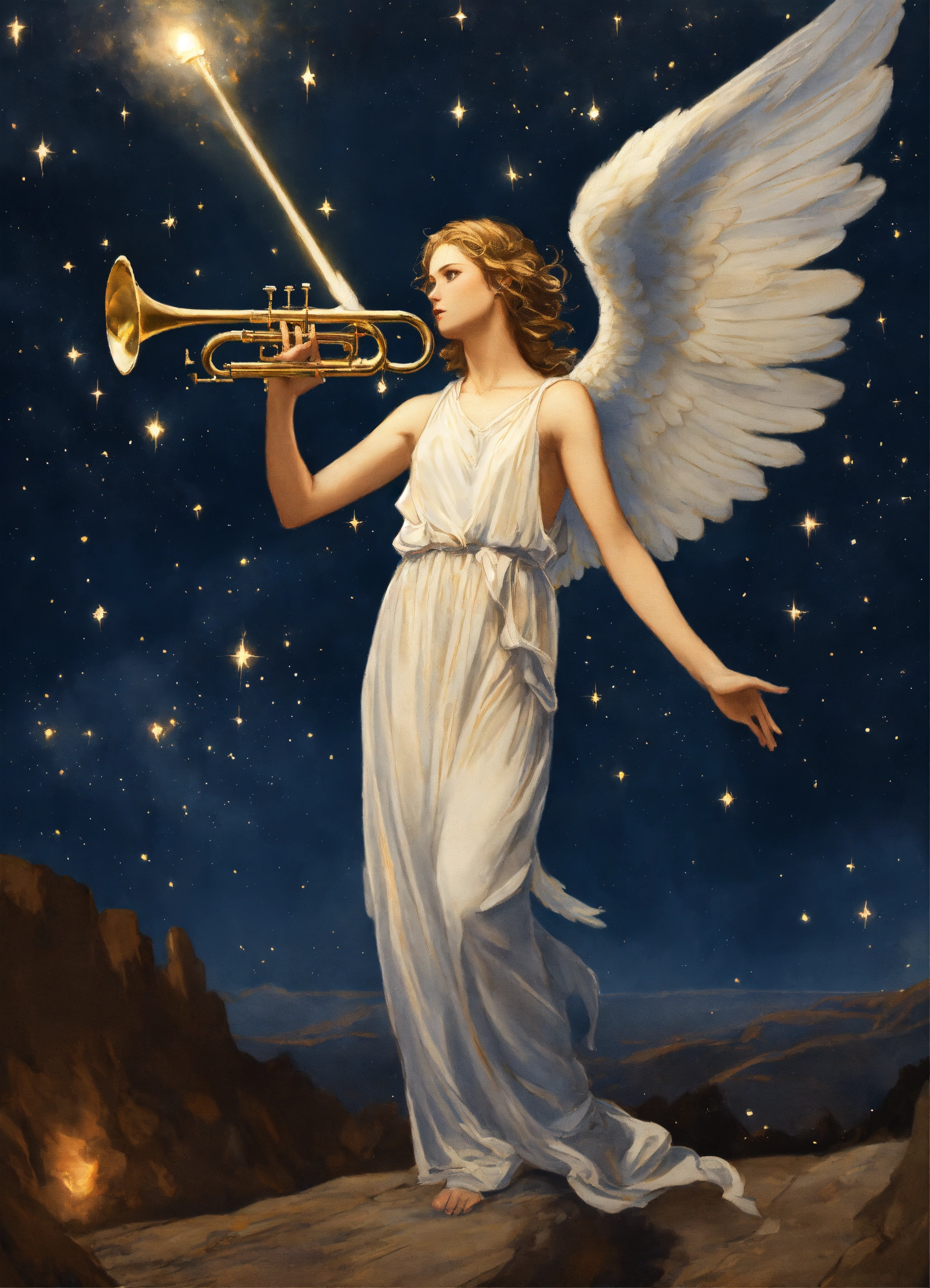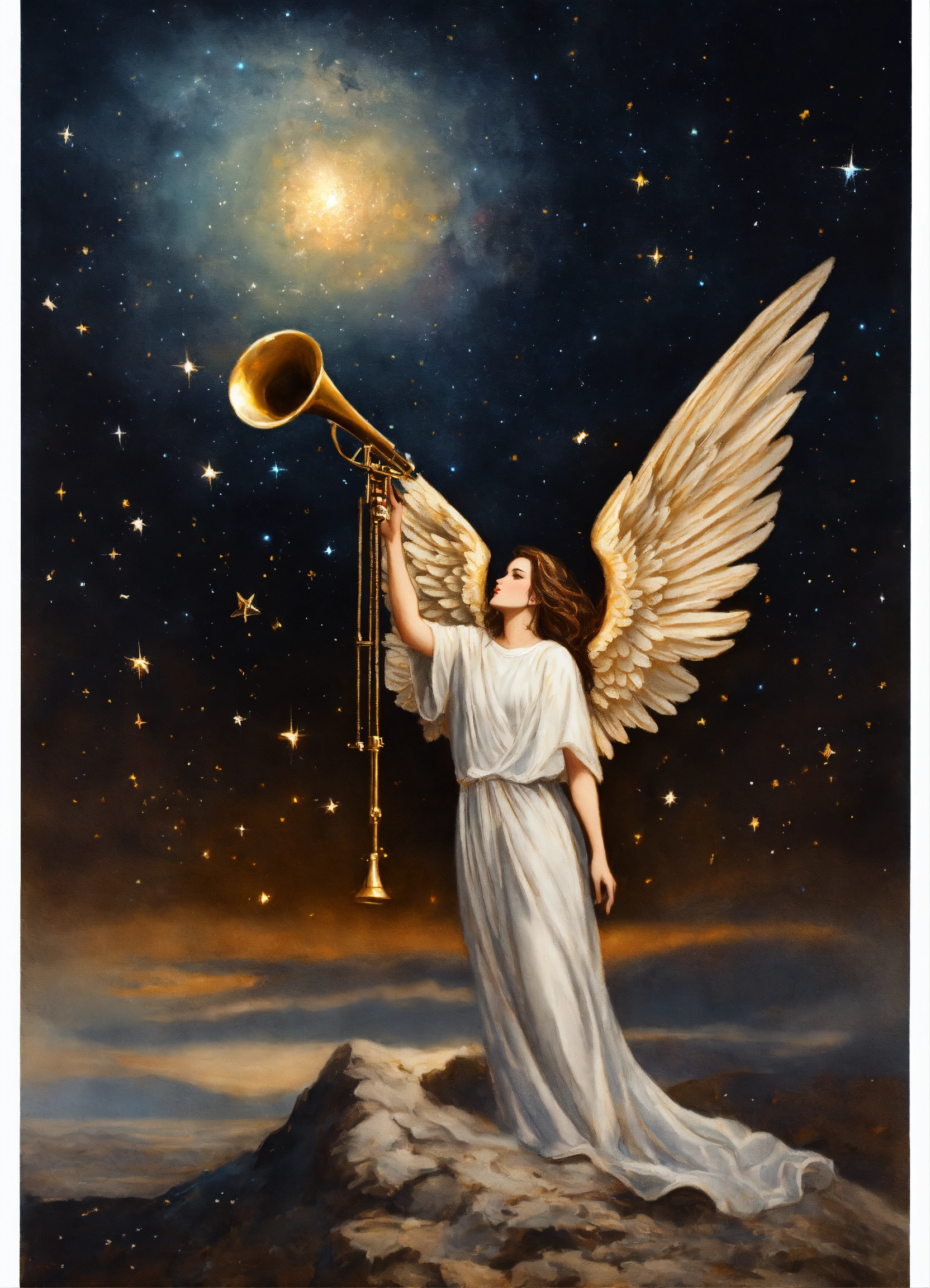 Realistic drawing of an angel holding an apocalypse trumpet, in the background starry sky in the universe