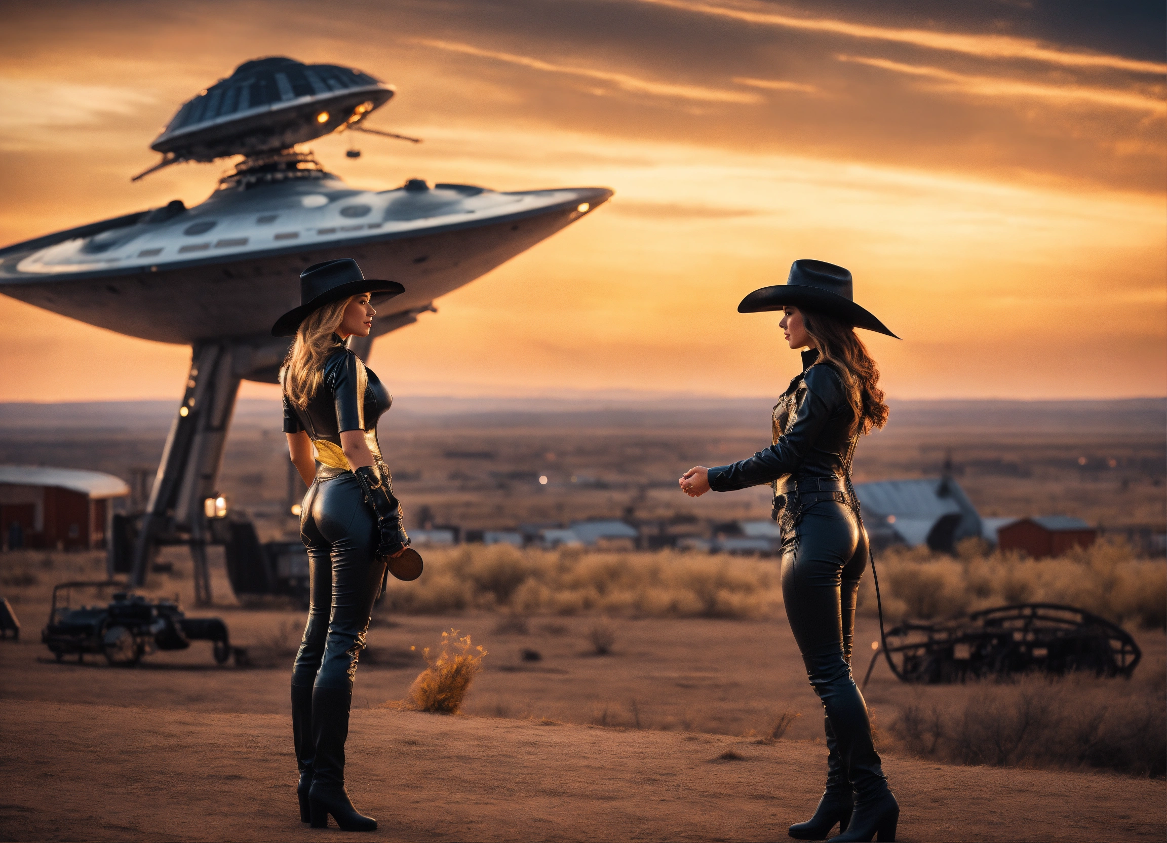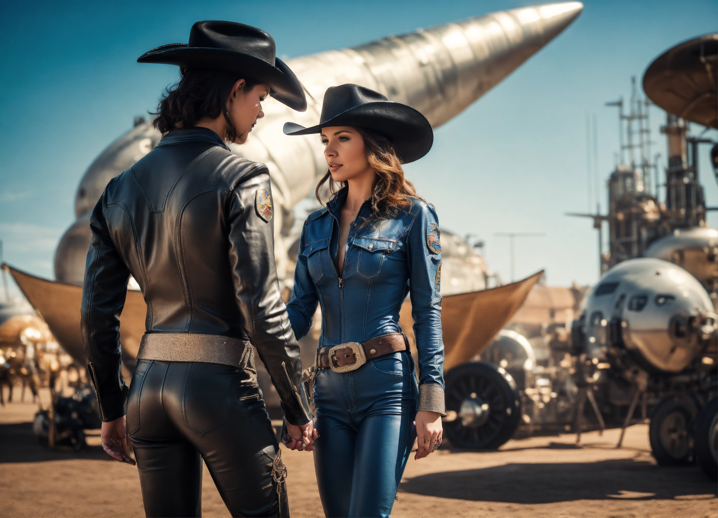 A real photo of a hot spacegirl in leather catsuit shakes hands with a hot cowgirl in a silk blouse and denim pants and cowboy-hat. in the background we see a old wester-town, and a spaceship. in the sky the galaxy