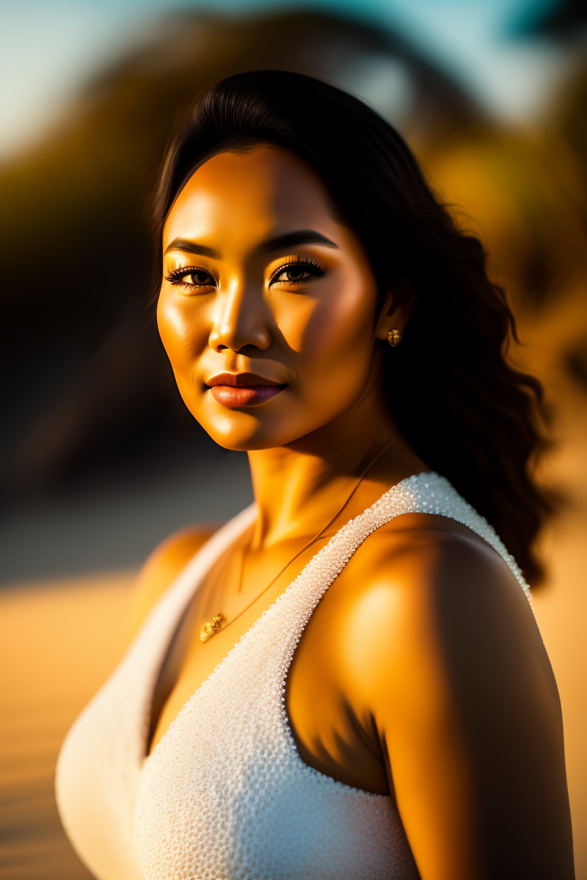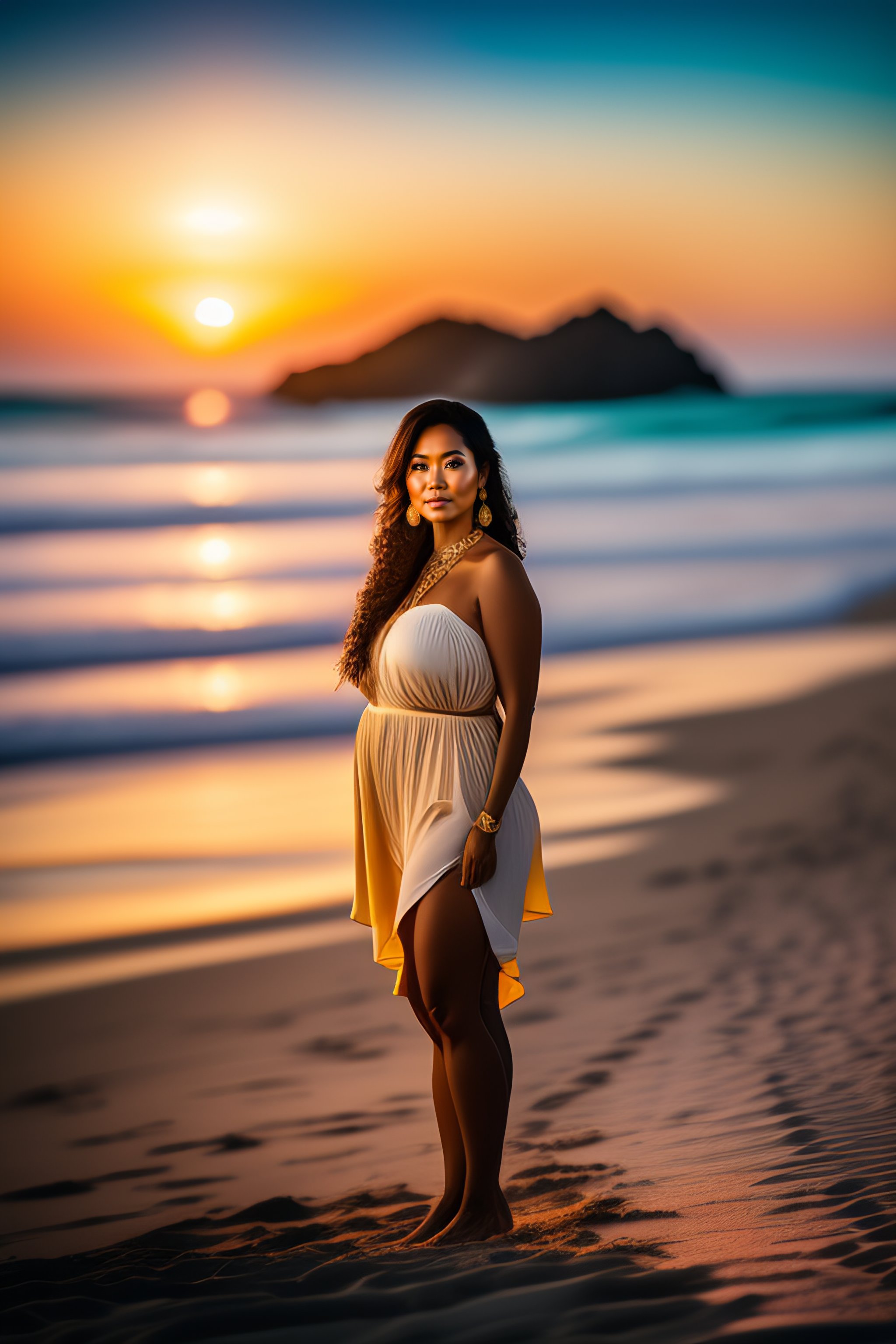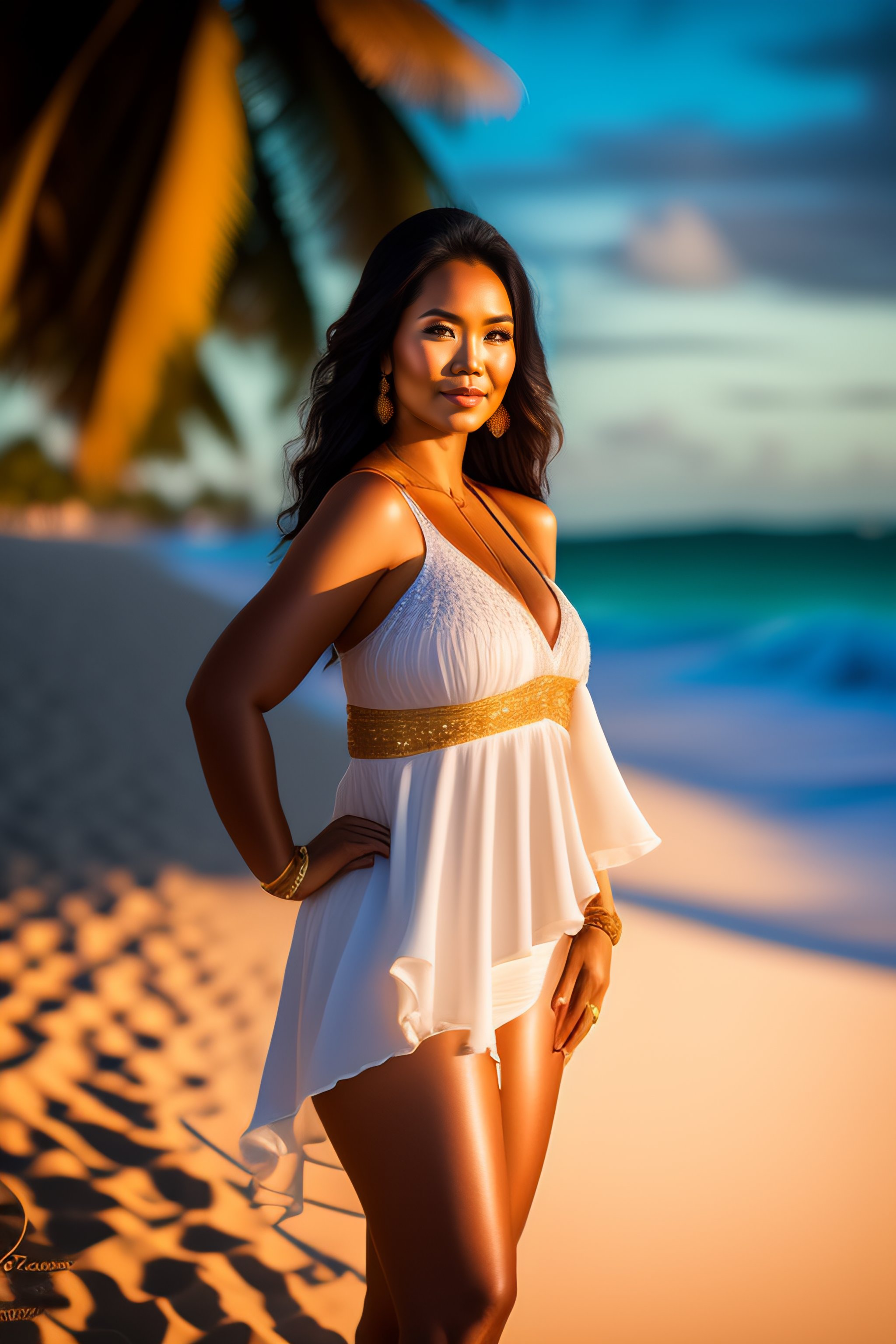A beautiful full body portrait of a slim hawaiian woman, beautiful detailed eyes, golden hour, standing on a beach in boracay, outdoors, professional award winning portrait photography, zeiss 150mm f/ 2.8 hasselblad