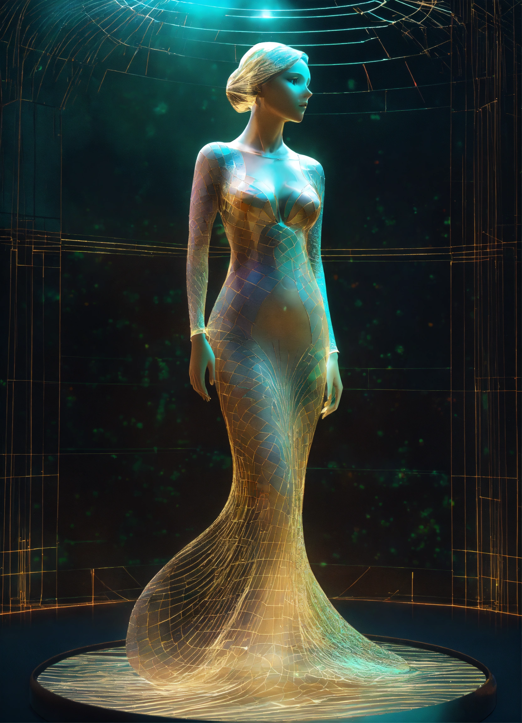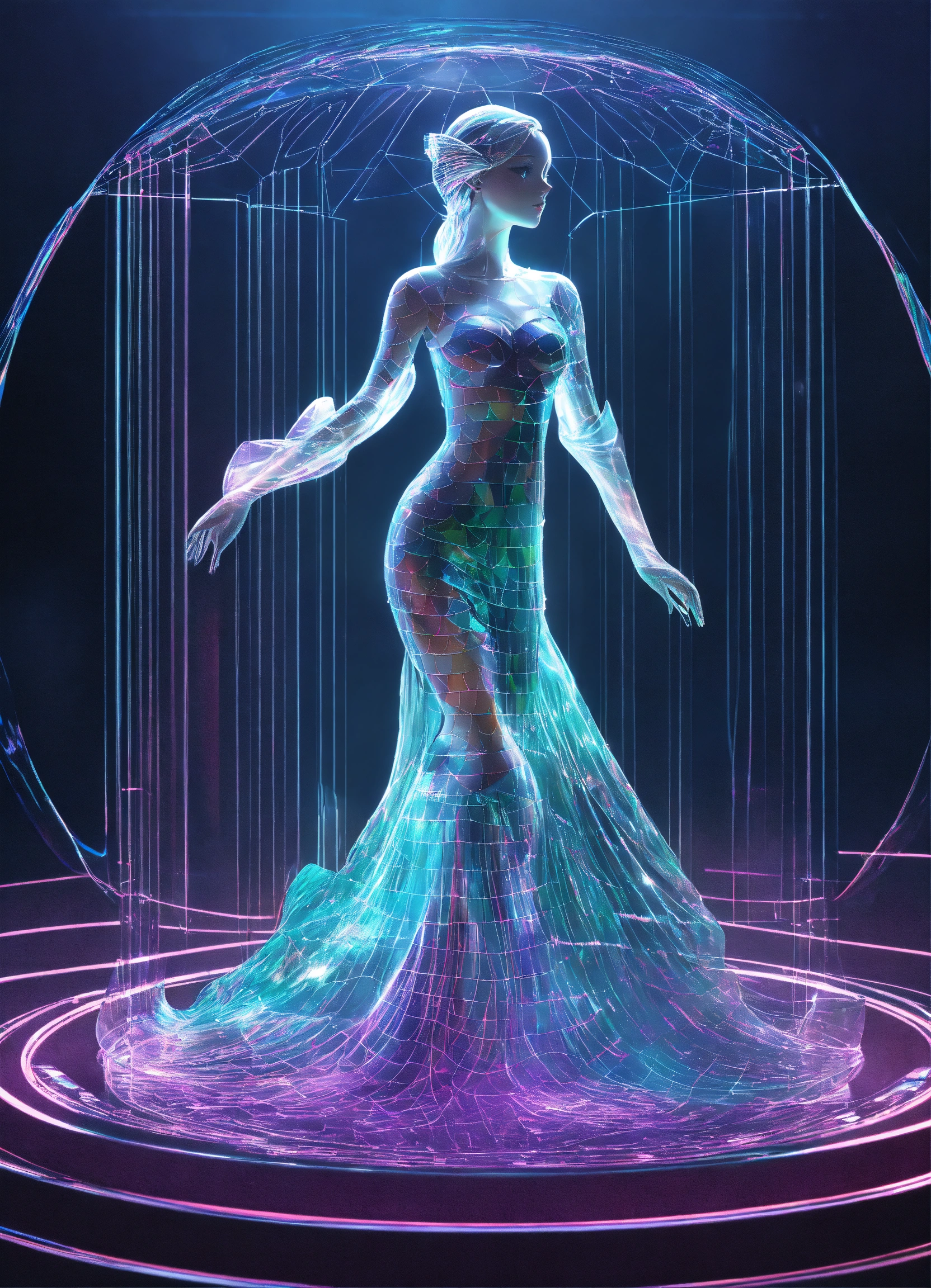 Design a 3d hologram of a mermaid with long gown, focusing on clean lines and shapes. the mermaid's form should be reduced to its most basic, abstract elements, resembling a wireframe or a digital projection. emphasize a transparent quality, with the mermaid image composed solely of luminescent lines, and geometric shapes. this hologram should give the impression of a digital projection, with no visible skin or physical features. it's a representation of the mermaid as a pure, abstract form, evoking a sense of futuristic, technological elegance. the lines and shapes in this hologram should be predominantly white in color