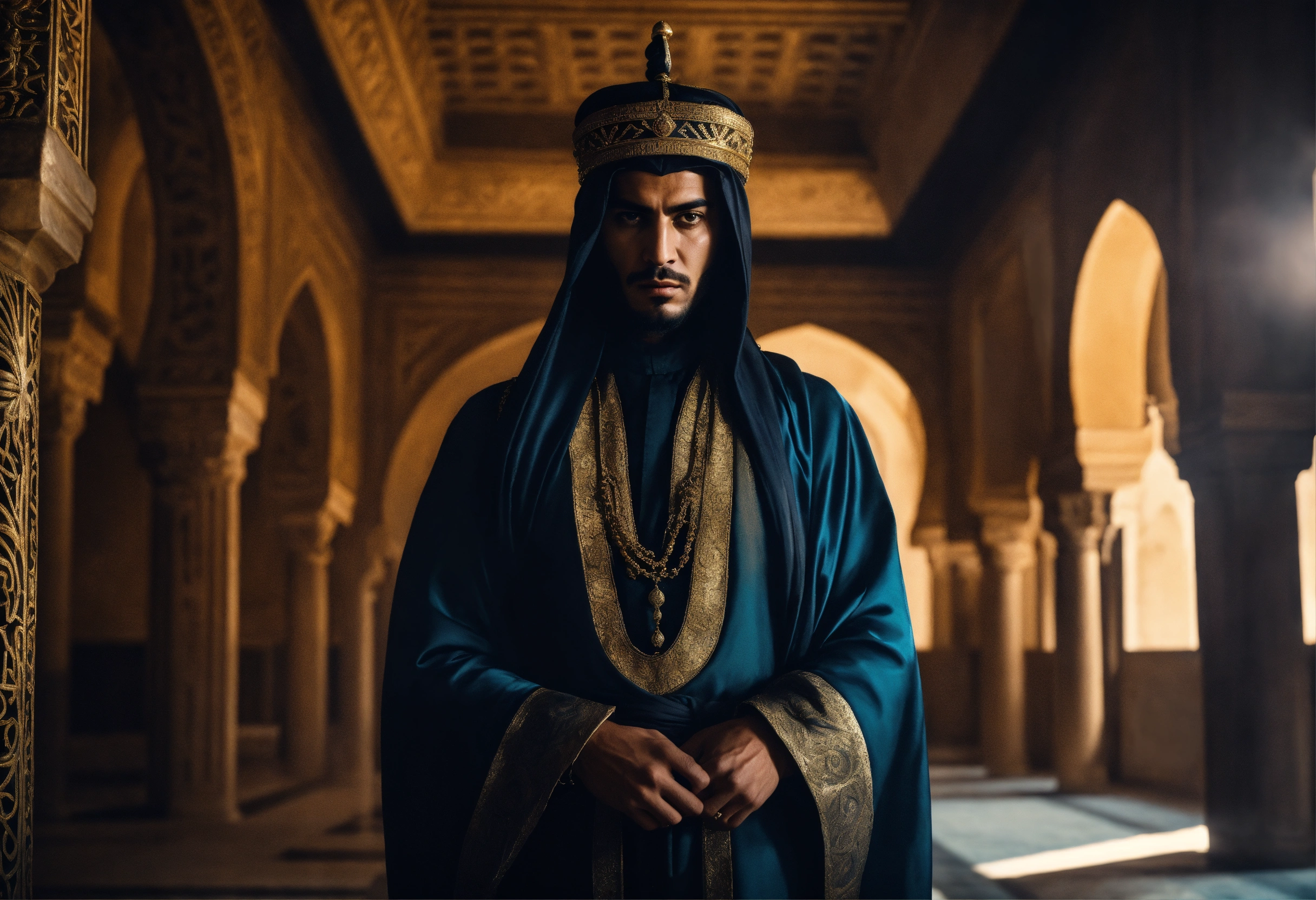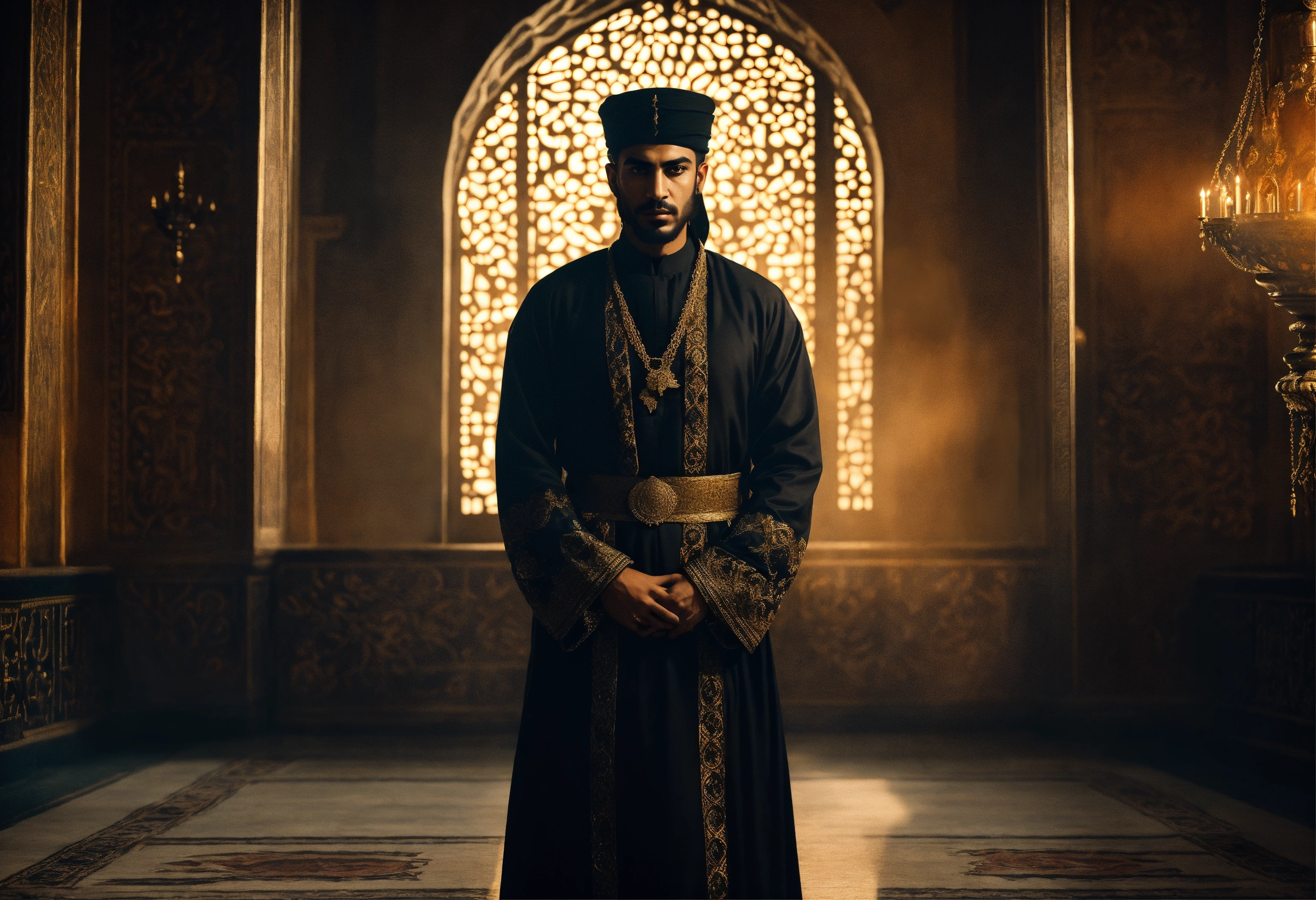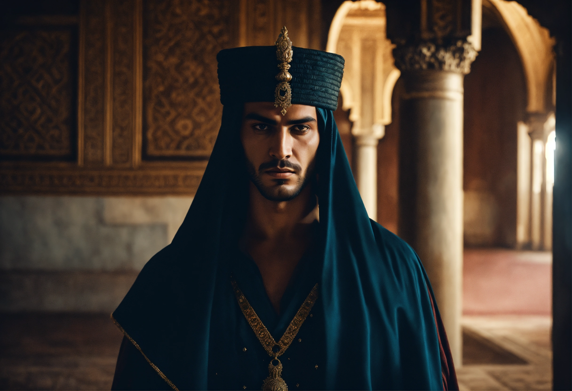 Sinister fantasy portrait of a handsome young ancient male arabic evil ruler in a palace with sinister shadows