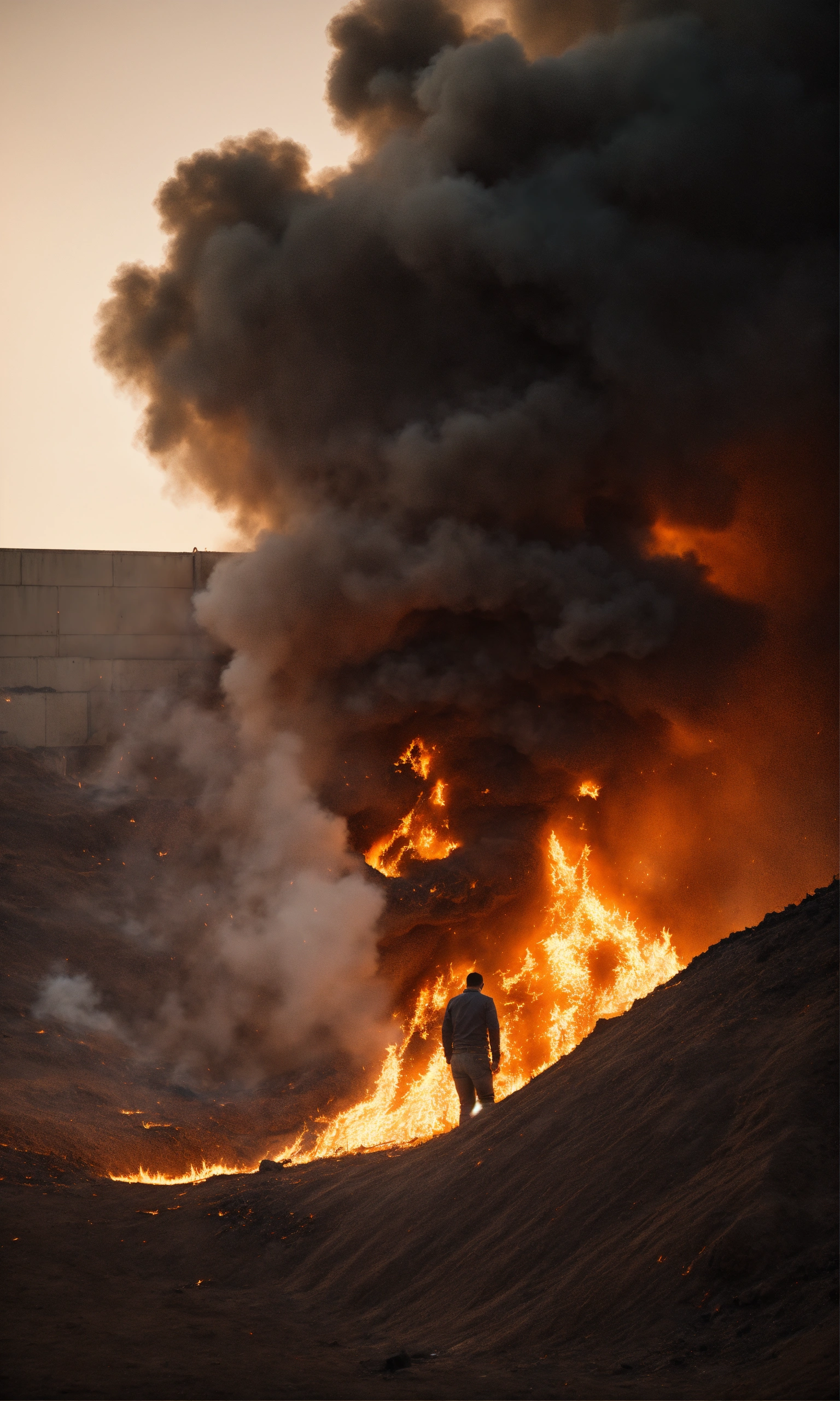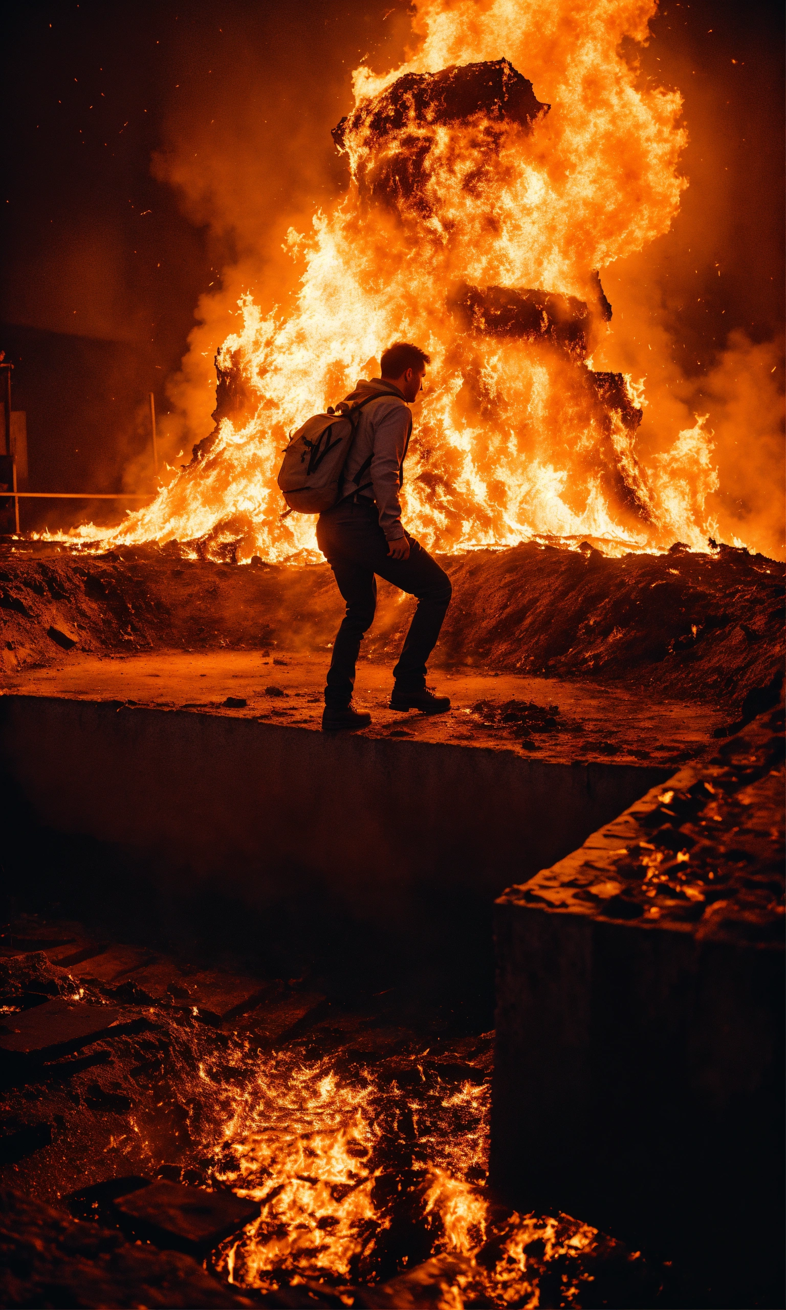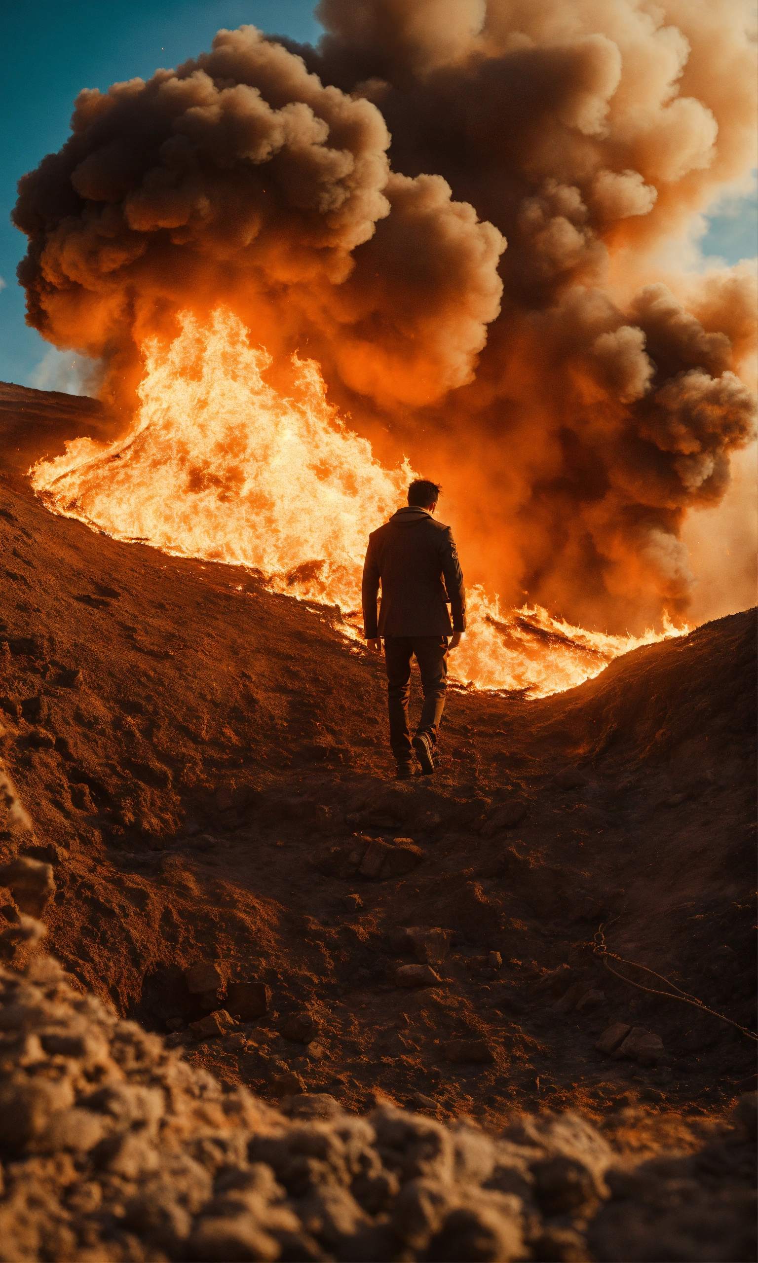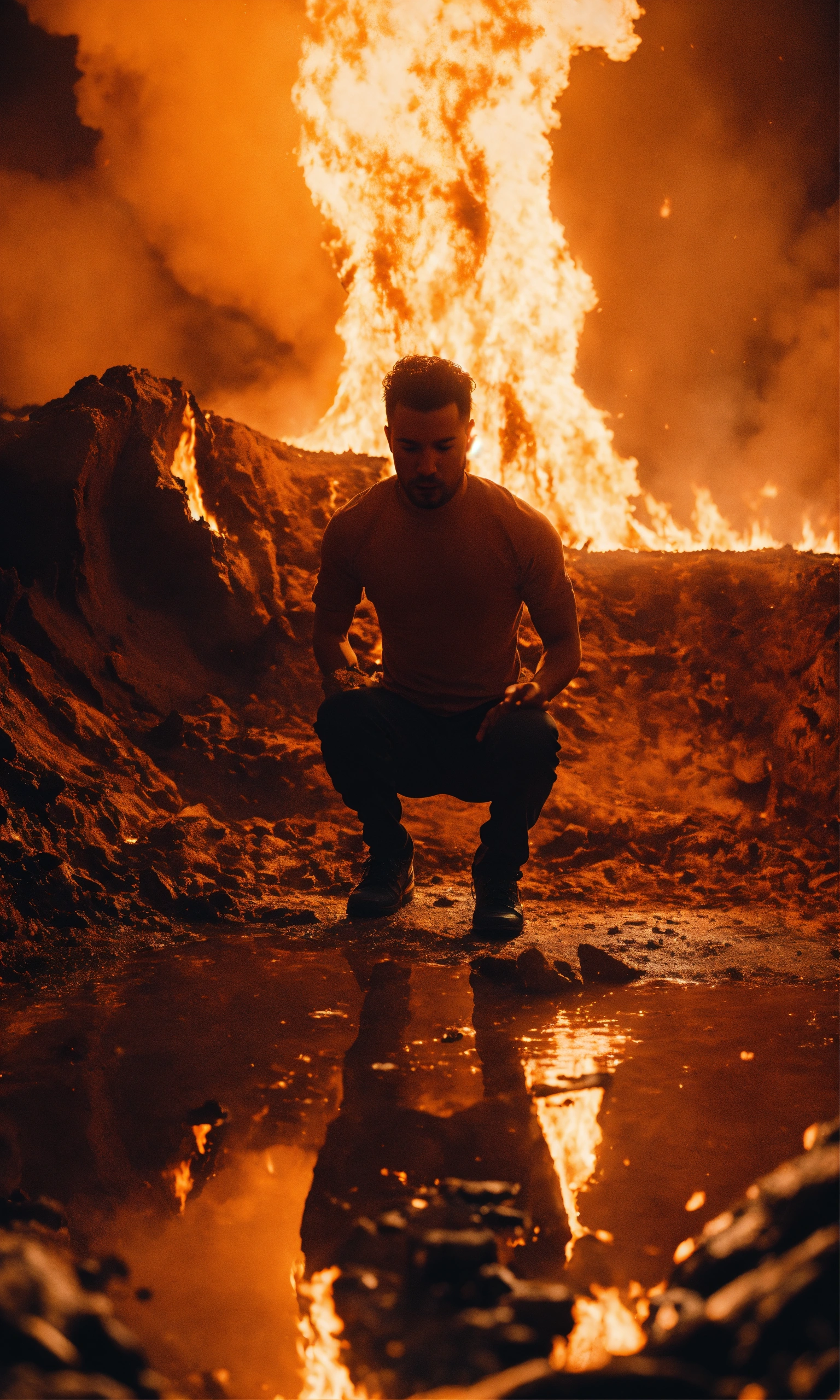 A man falling on his knees on the edge of a huge burning pit, fujifilm xt3, outdoor, a little lighting, raw photo, 8k uhd, film grain, unreal engine 5, ray trace