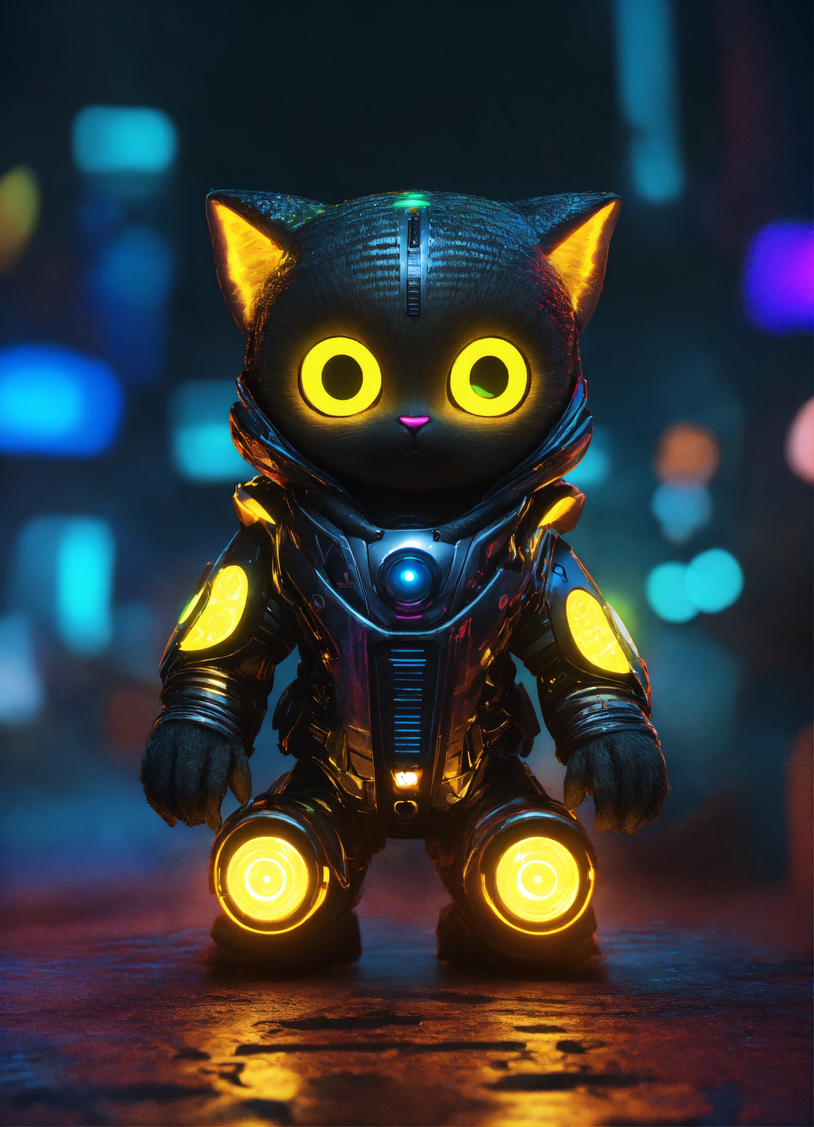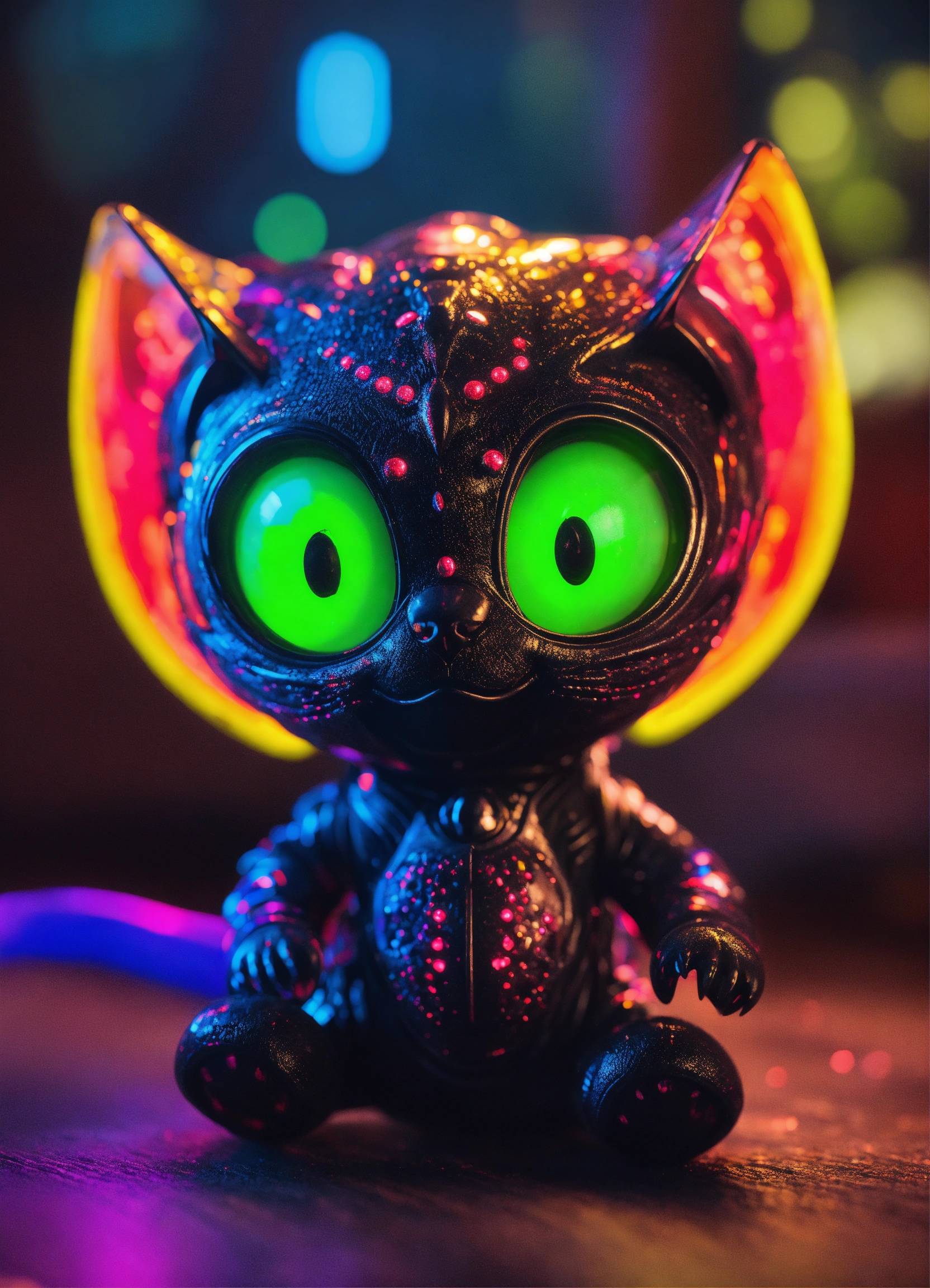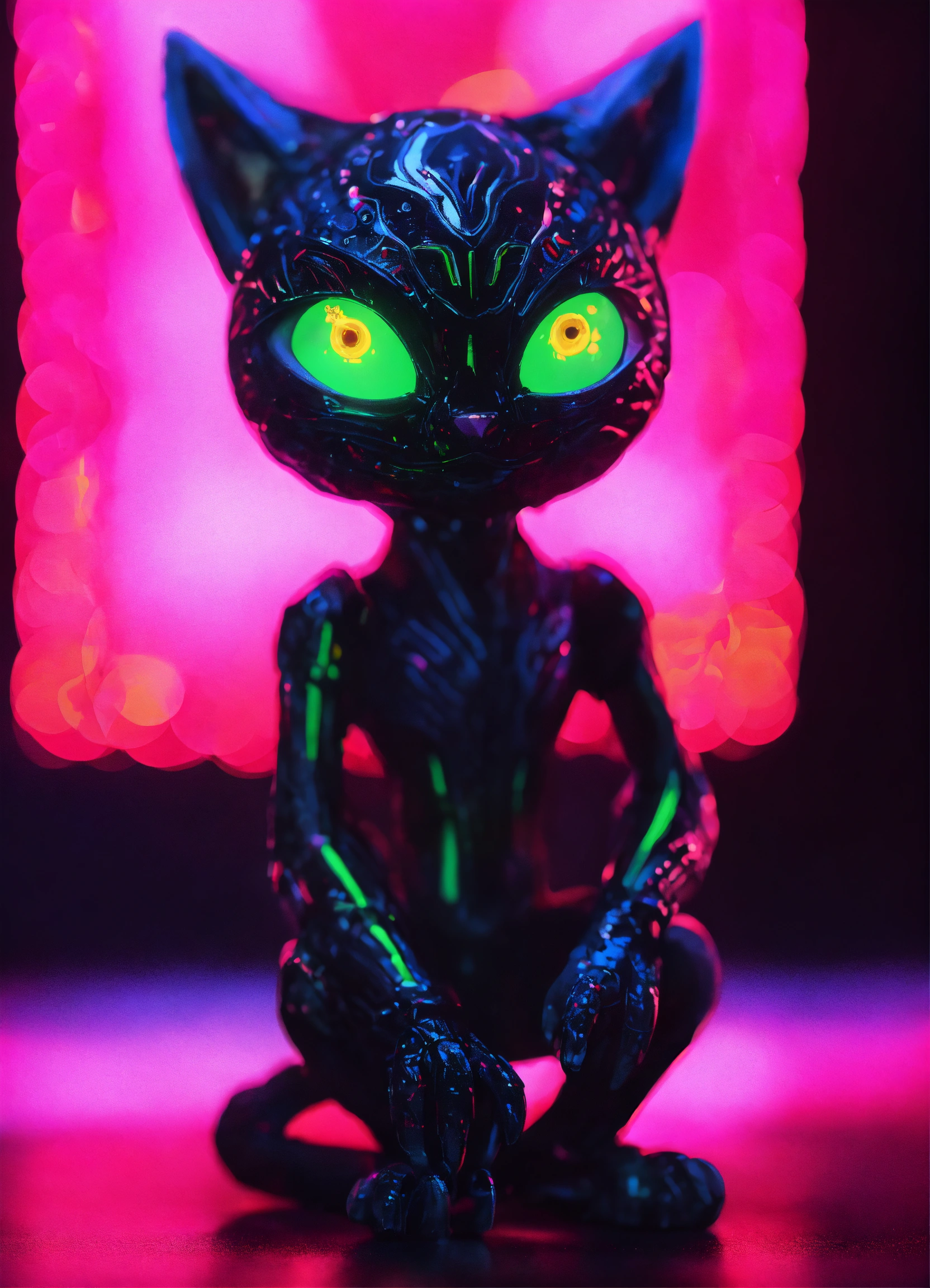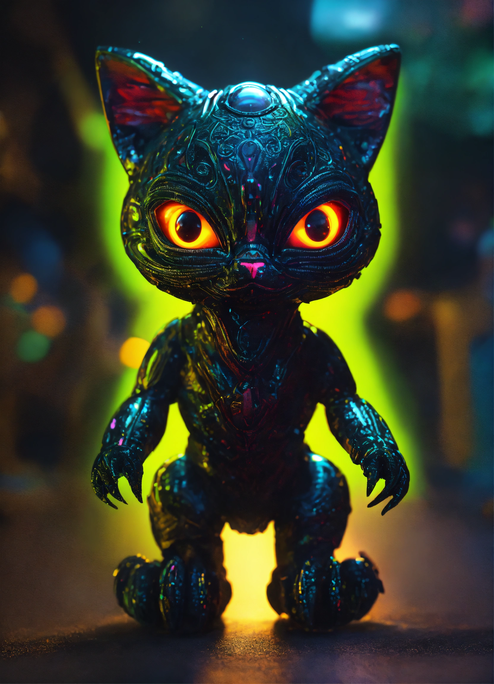 Gelly cute adorable alien monster, full-body, neon glow colors, highly intricate details, 3d, cgi, realistic light, trending on cgsociety, glowing eyes, facing camera, neon details, ultra realistic details, portrait, sci fi atmosphere, global illumination, shadows, octane render, 8 k, ultra sharp, cat attributes, smooth skin, friendly, luxury toy, black with yellow eyes