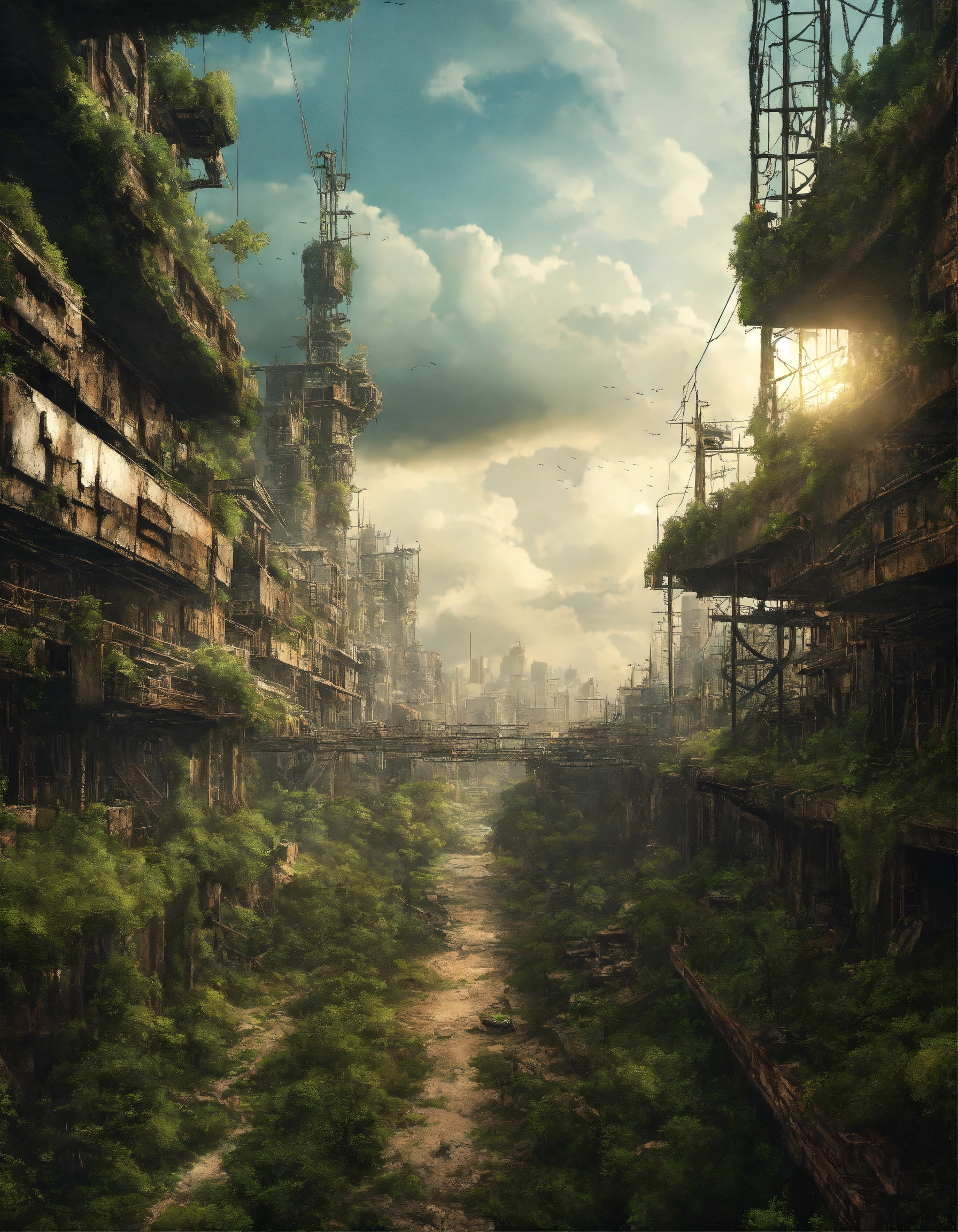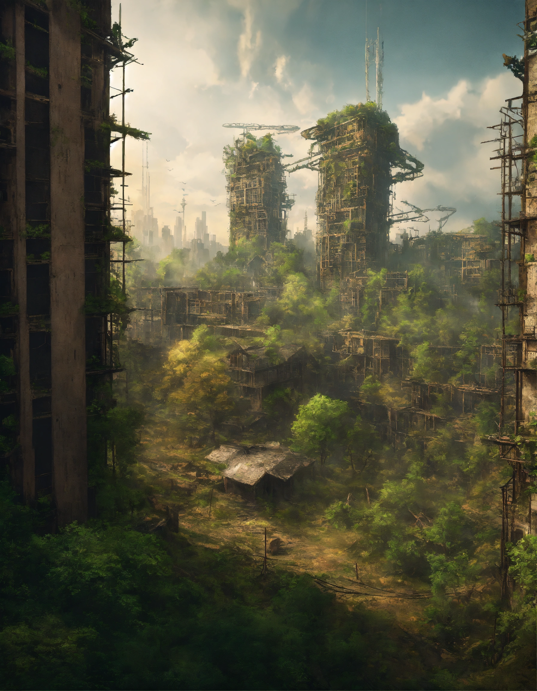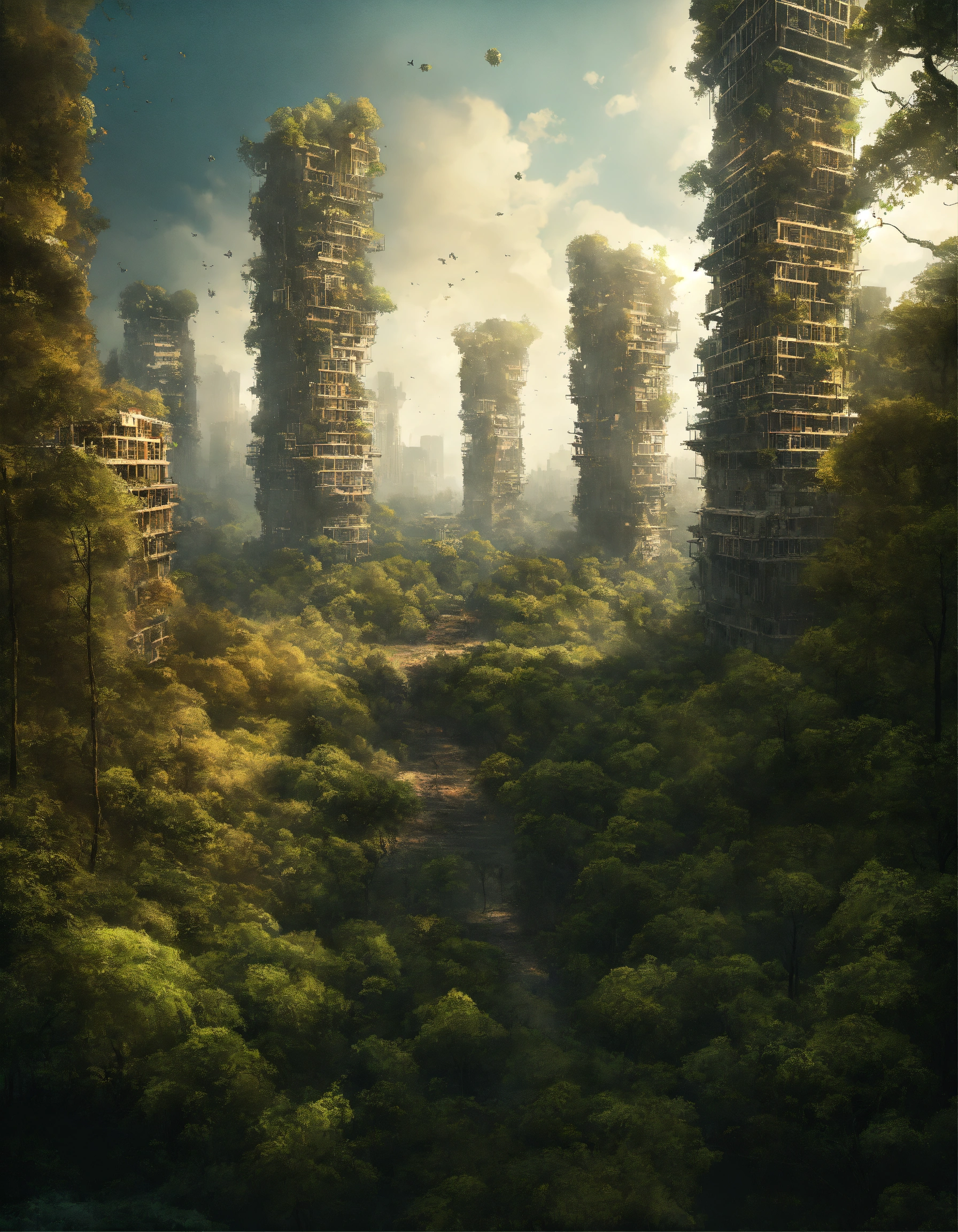 Sky-facing view from the depths of a post-apocalyptic forest-city