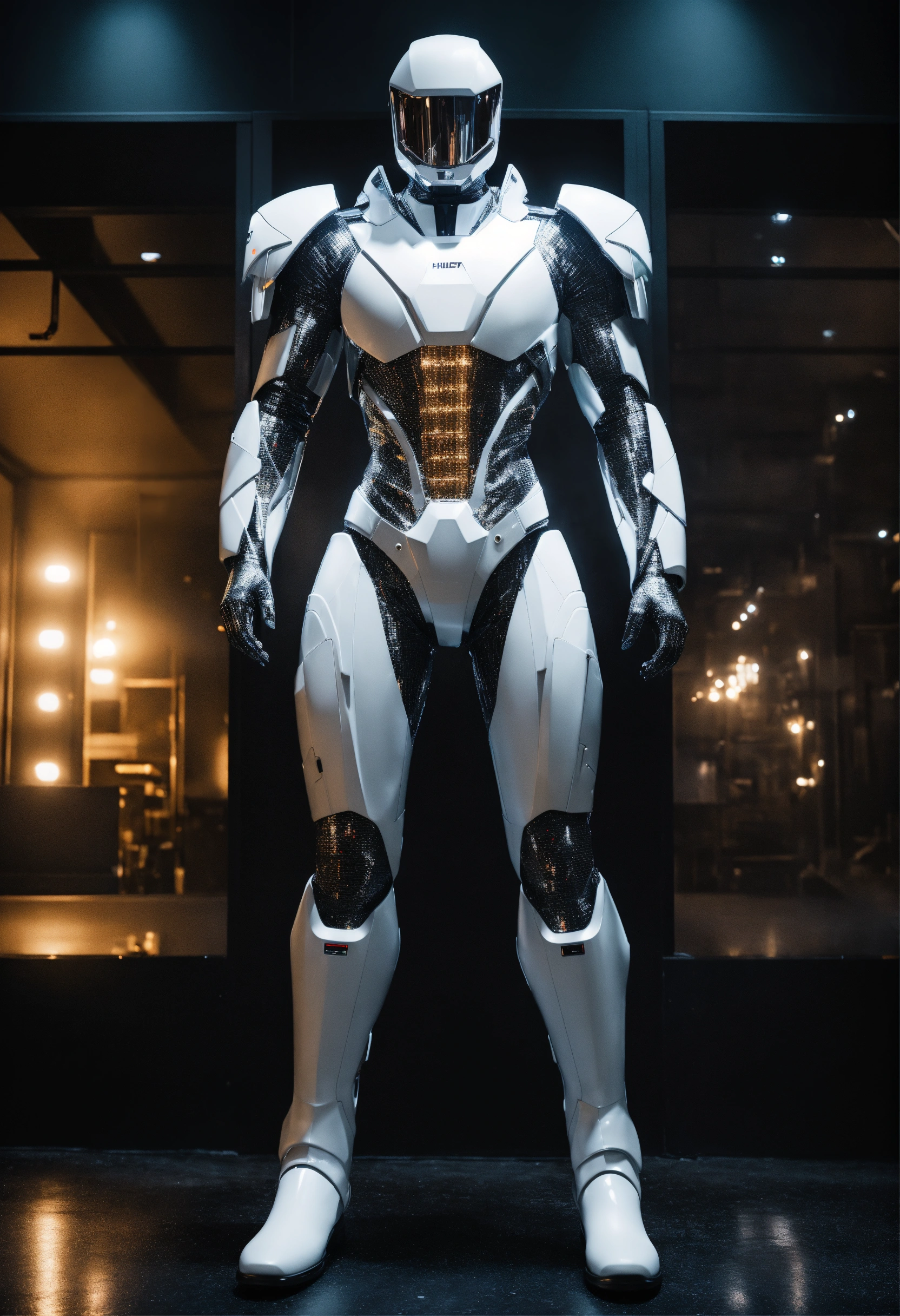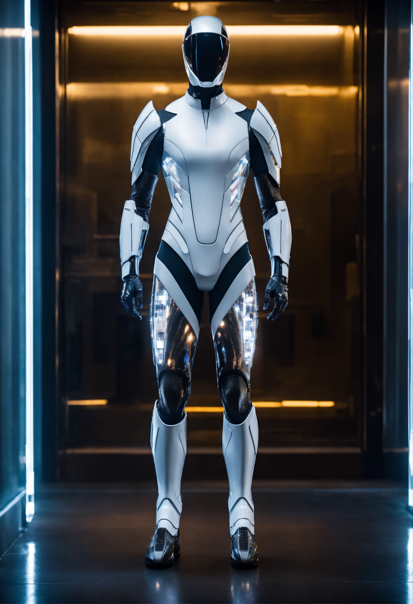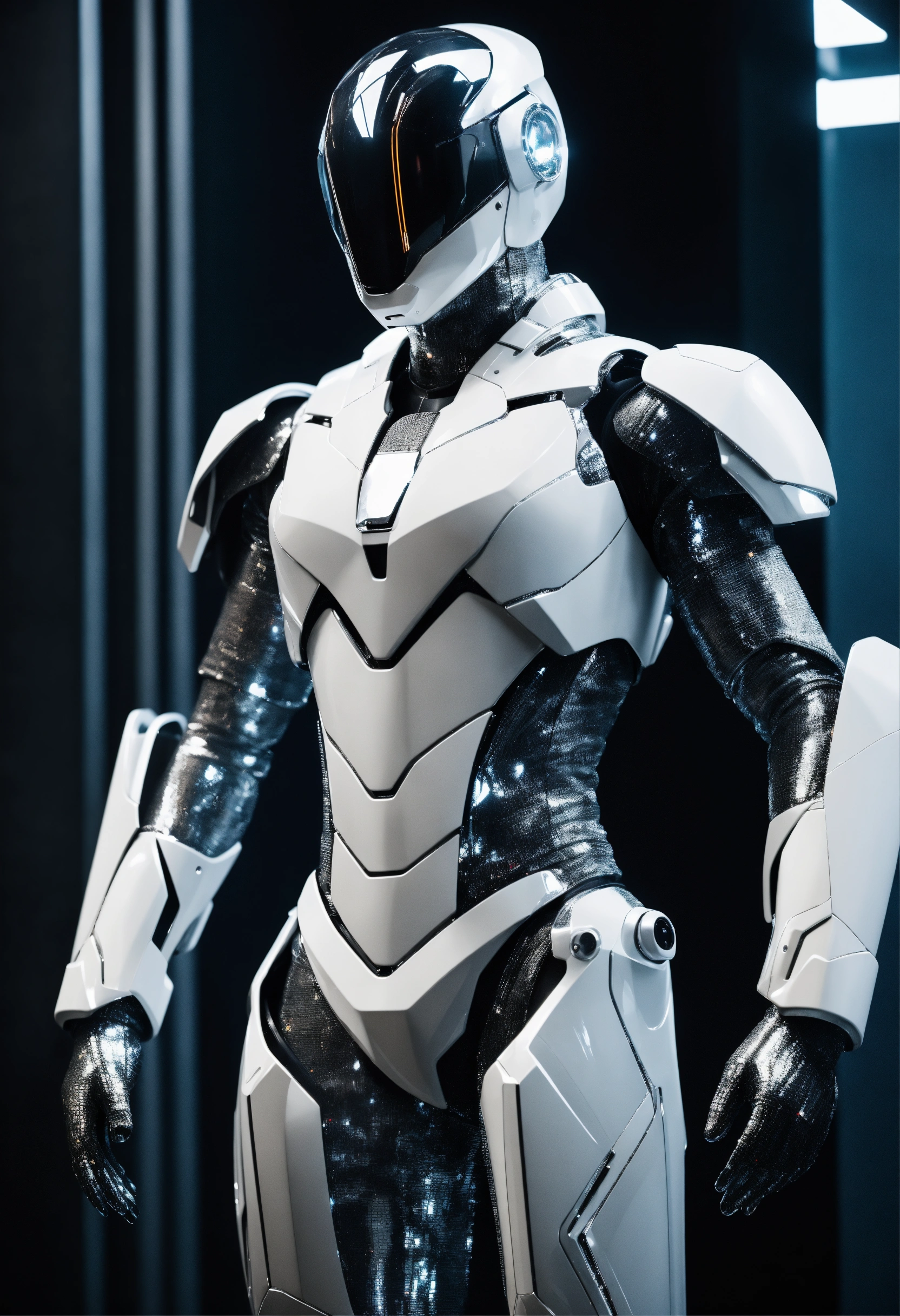 An ultrarealistic photograph of an enormous minimalist futuristic full body power suit, without lights, made of white metal and polymer, full crystal hull, for a fit man, imposing, modern minimalism, elegant, dystopia, mysterious, godlike, scary, in a dark room, 8k