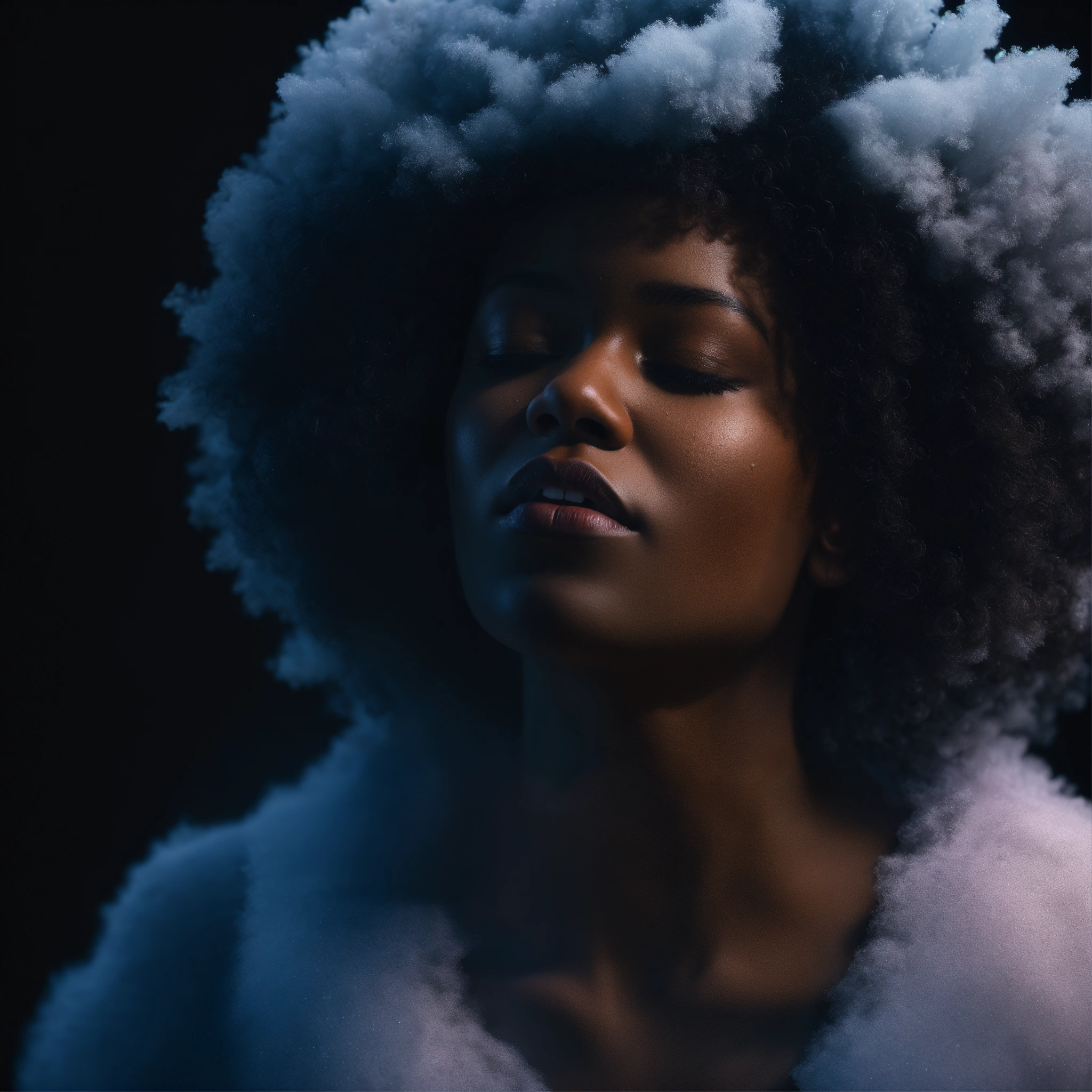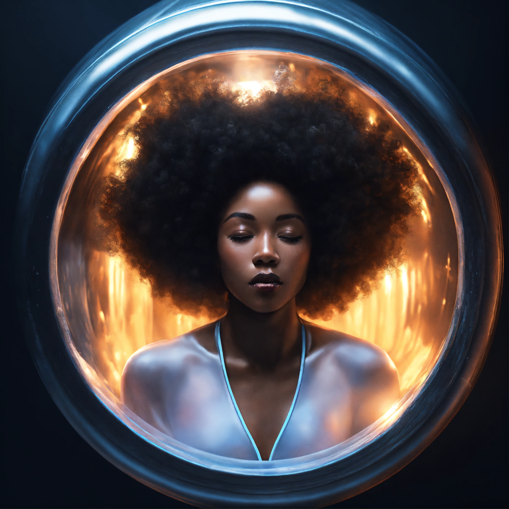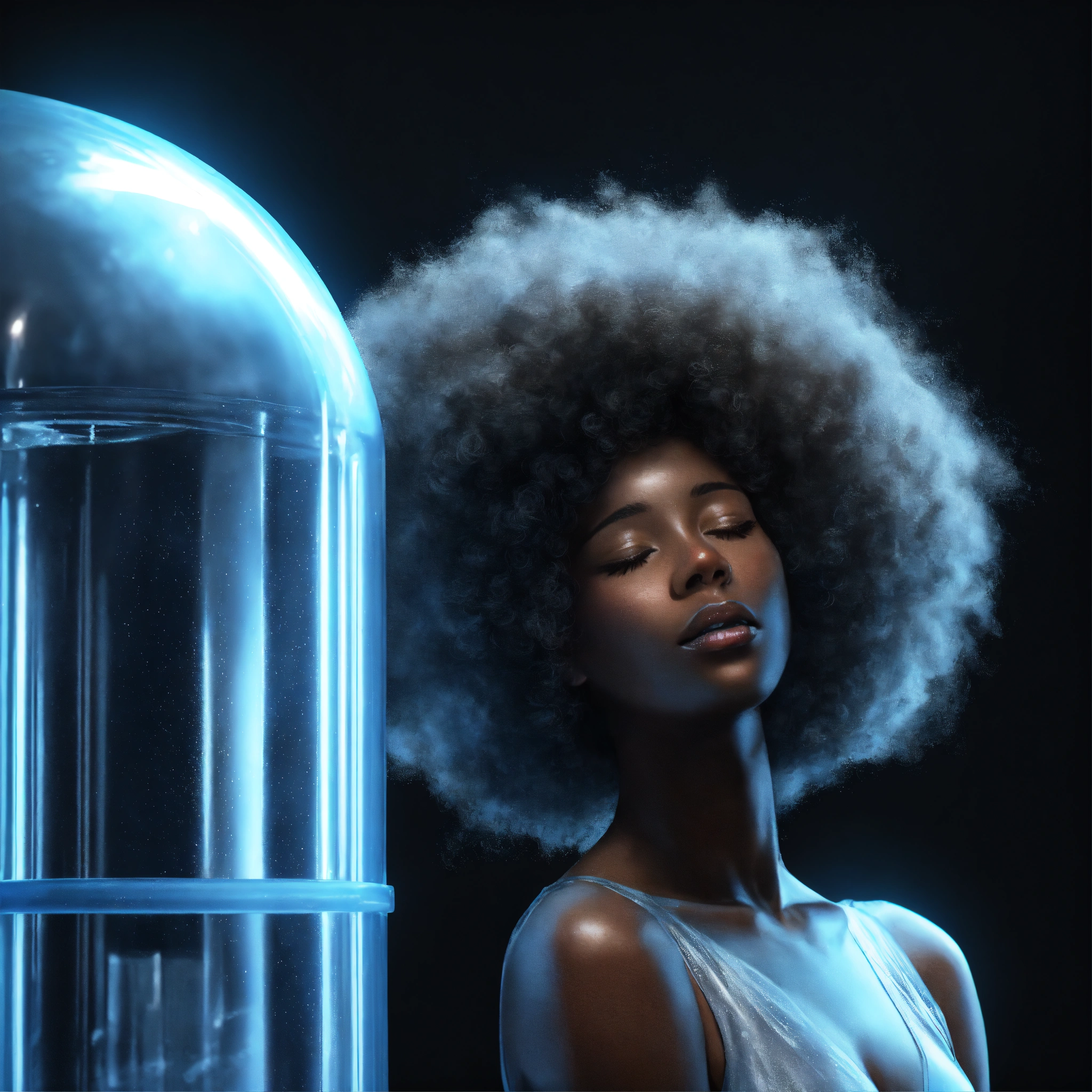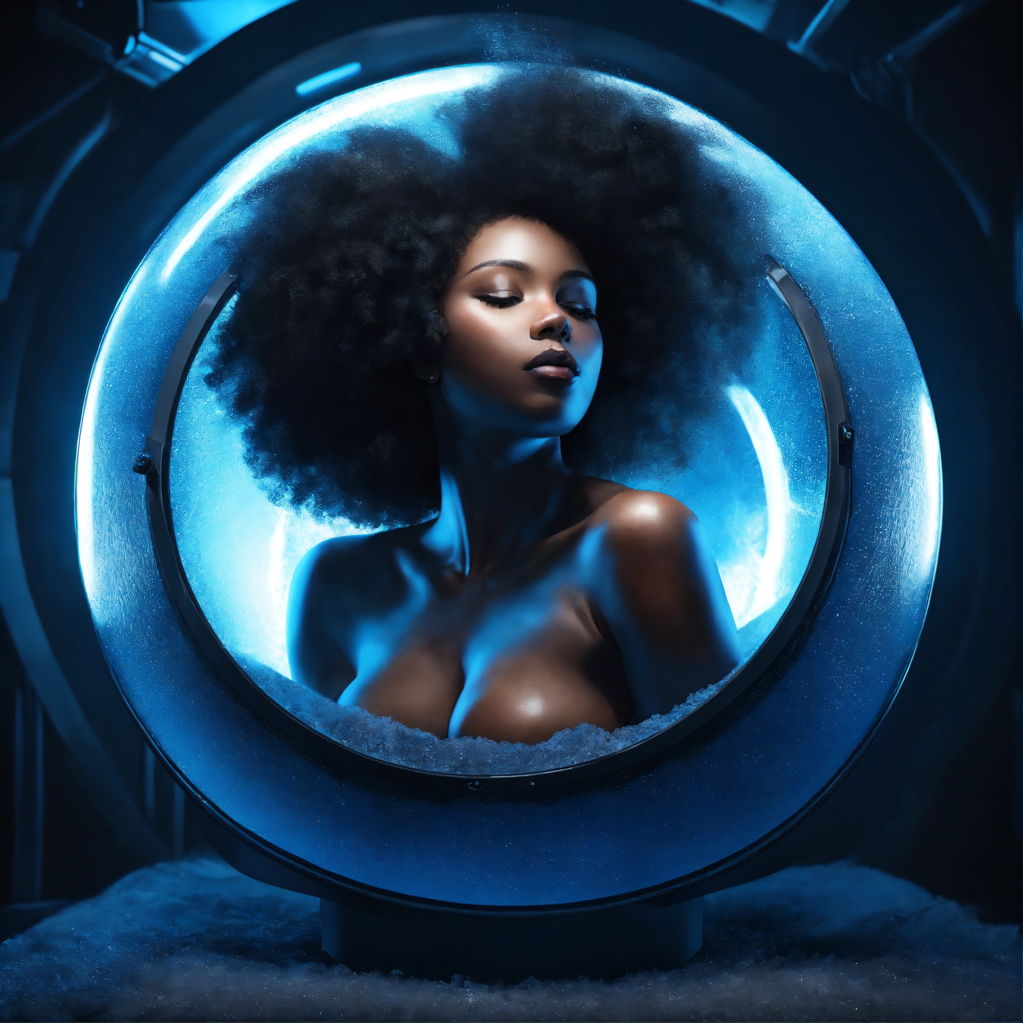 A frozen black woman with an afro sleeping, cryogenically frozen inside of a cryotube, 4k render, hyperrealistic, black background, image of full body