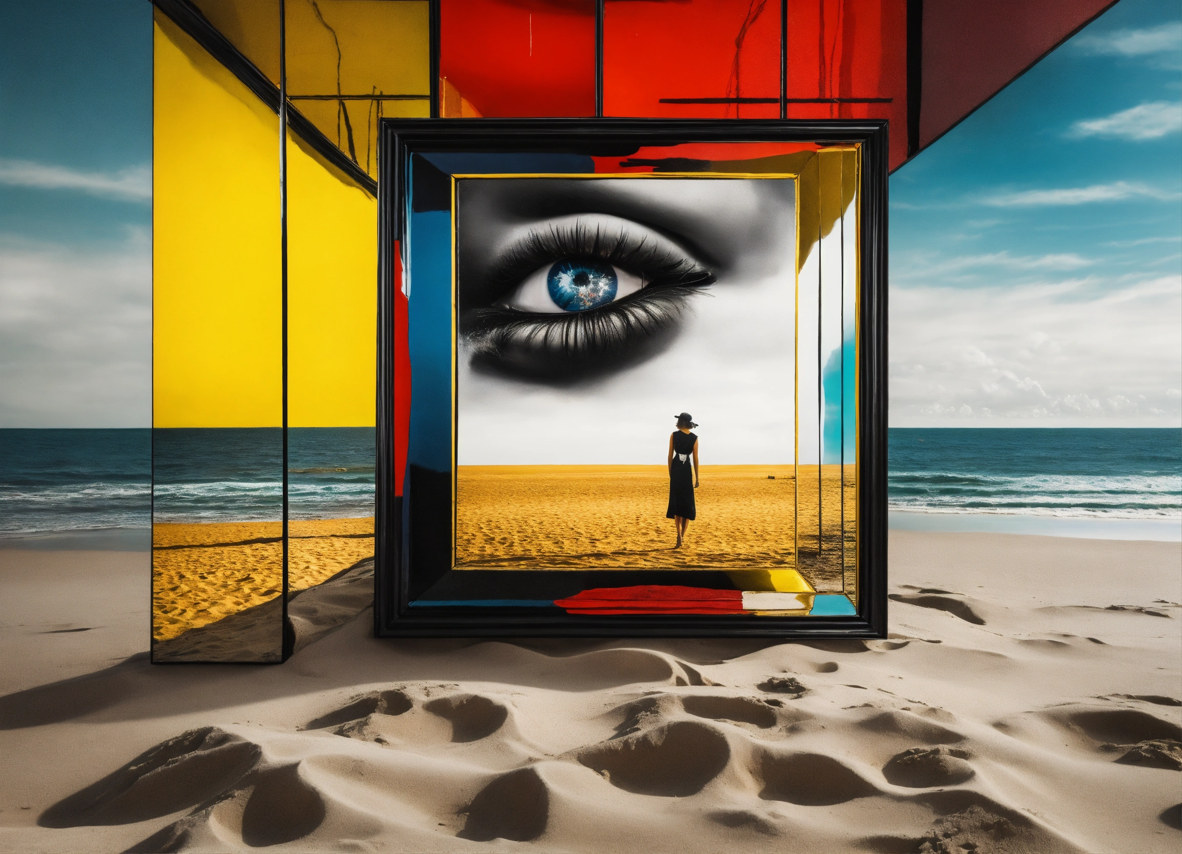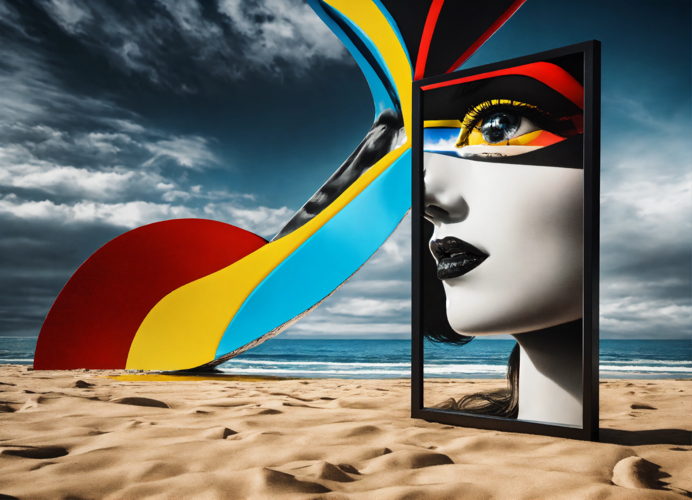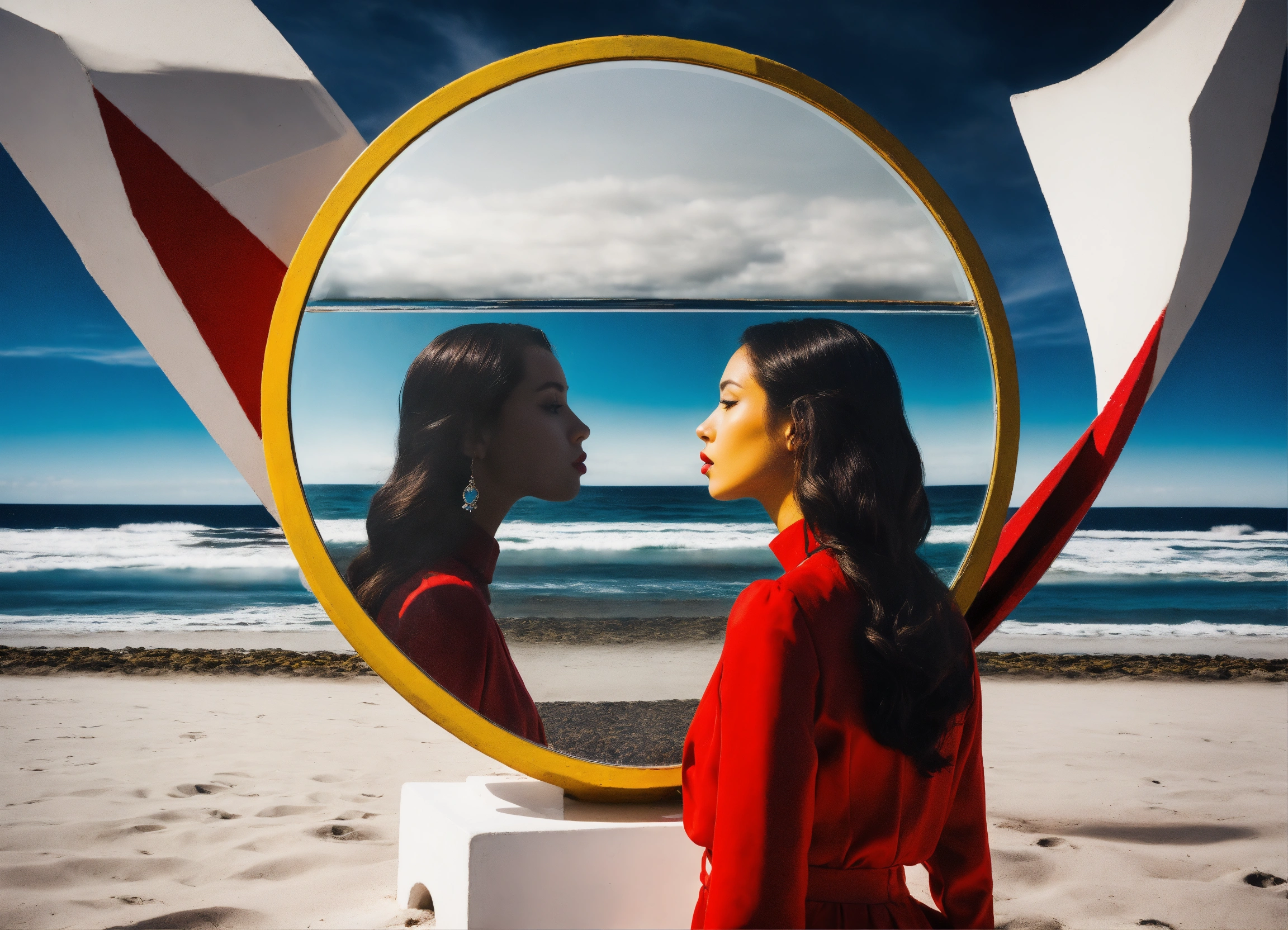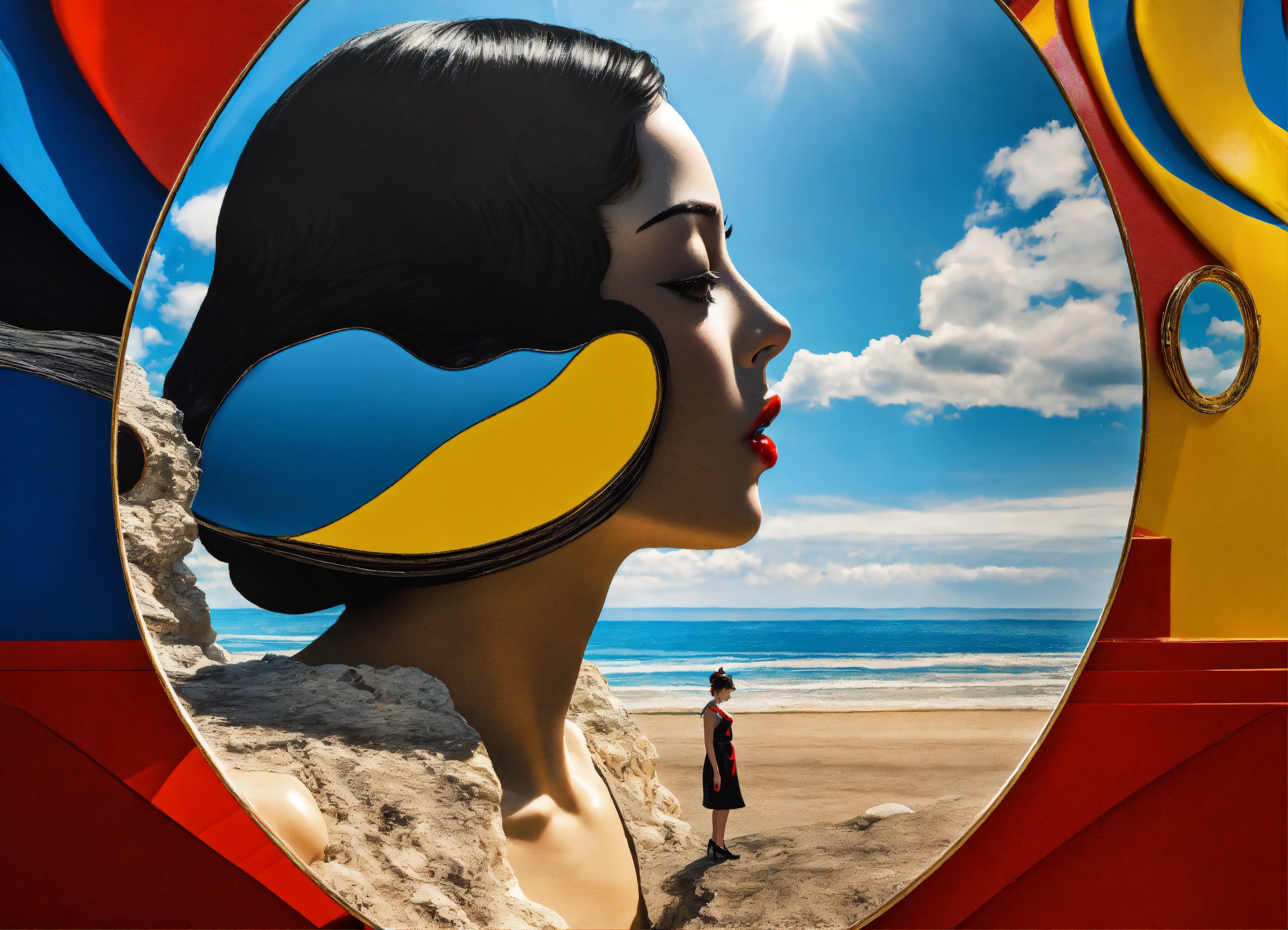 Black and white and primary colors, 3d surreal seascape, realistic women kisses portrait, immersive inspired art deco beach, upside down mirror, salvador dali inspiration.