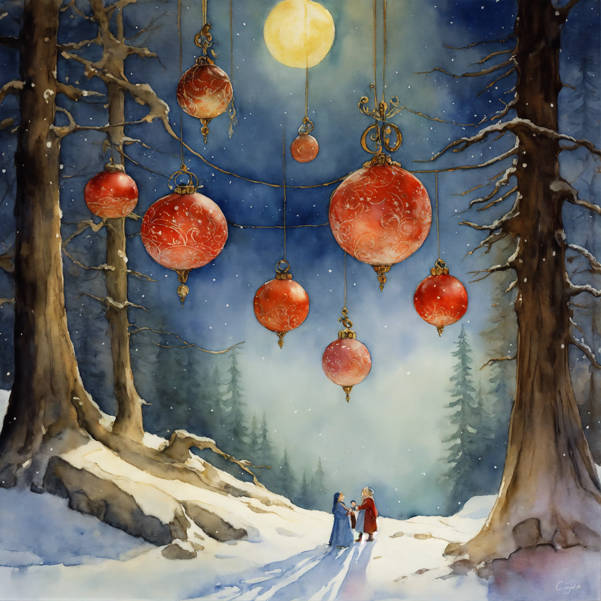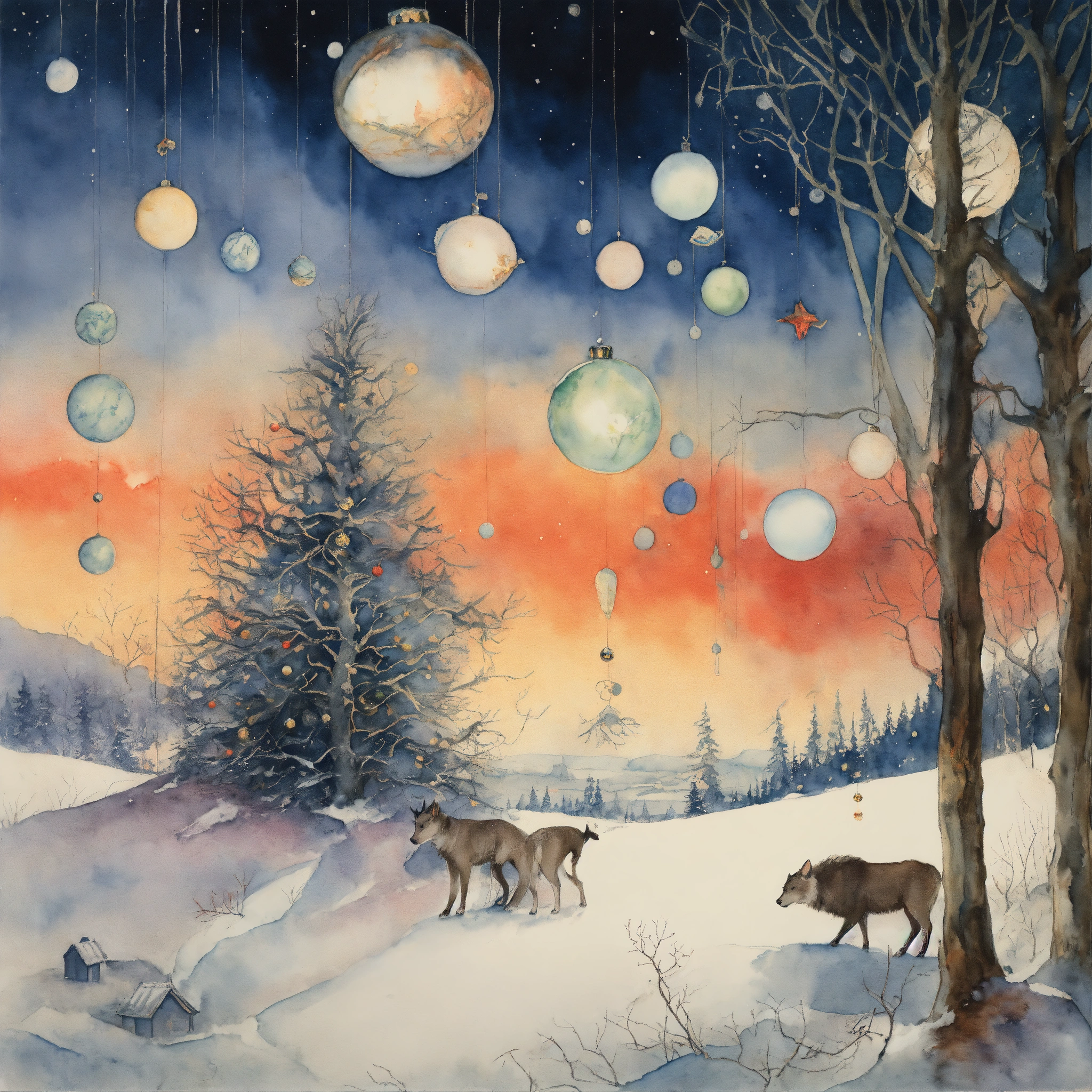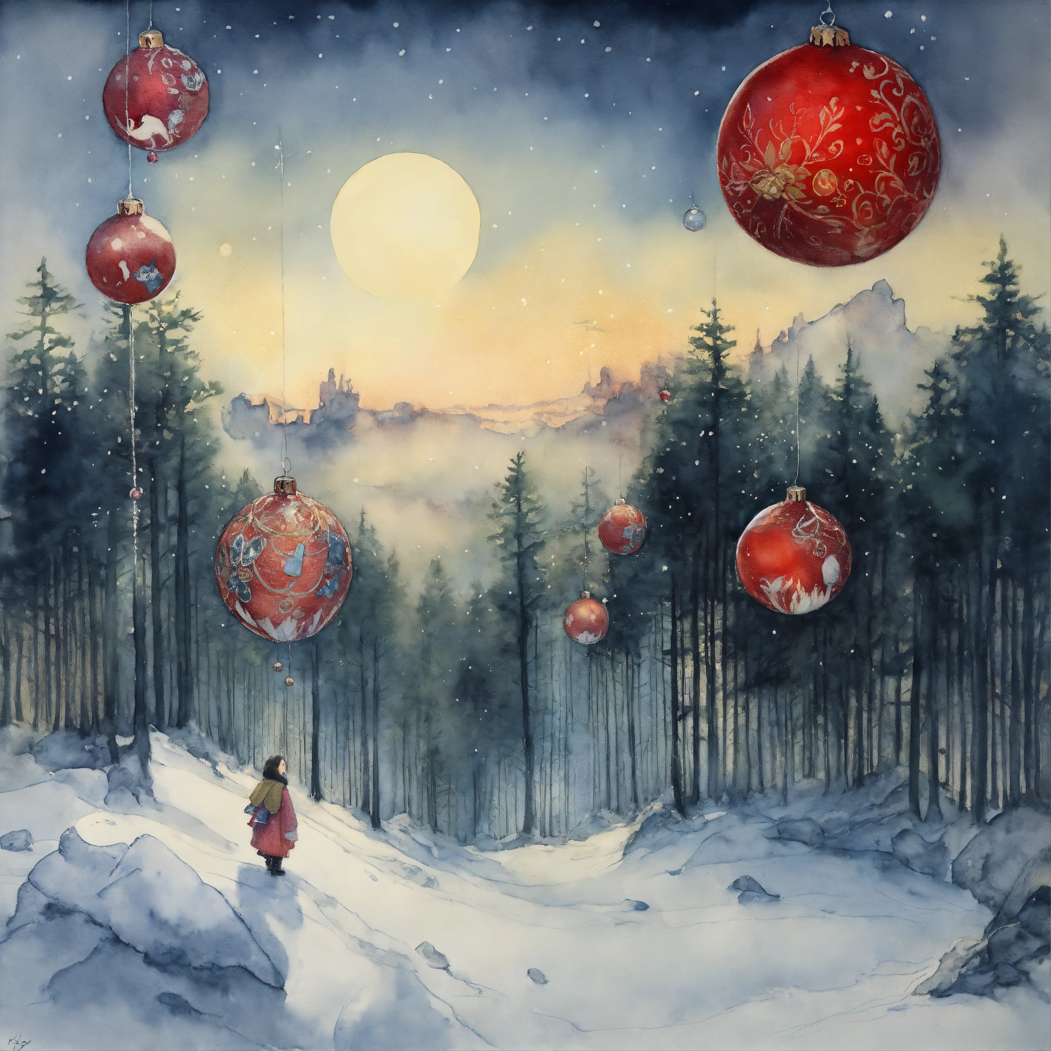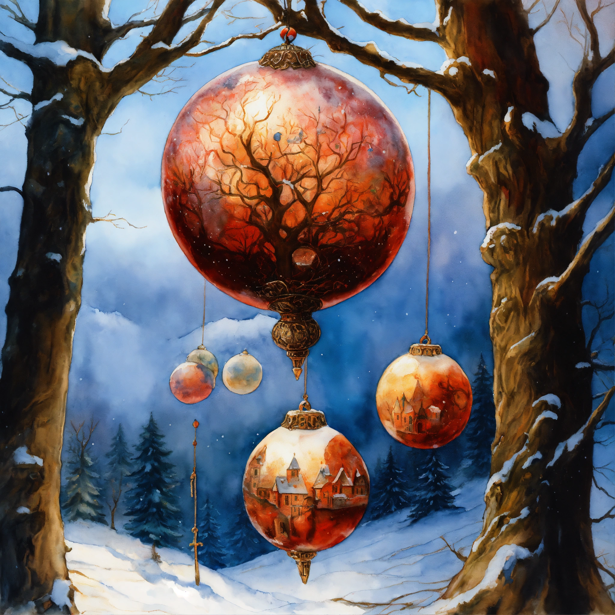 Watercolor painting portraying christmas baubles dangling from the sky, elaborate in detail, reflecting the artistic styles of cicely mary barker, h. r. giger, and beksiński, centered within a magical children's tale setting of a snow-filled wonderland, encrusted forest asleep in winter's grasp, the stark isolation of north pole, foggy afternoon, long shadows, chill in the air, white highlights