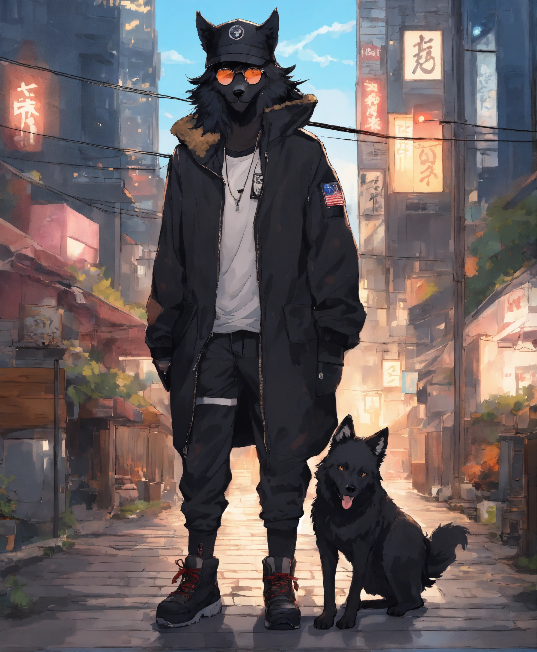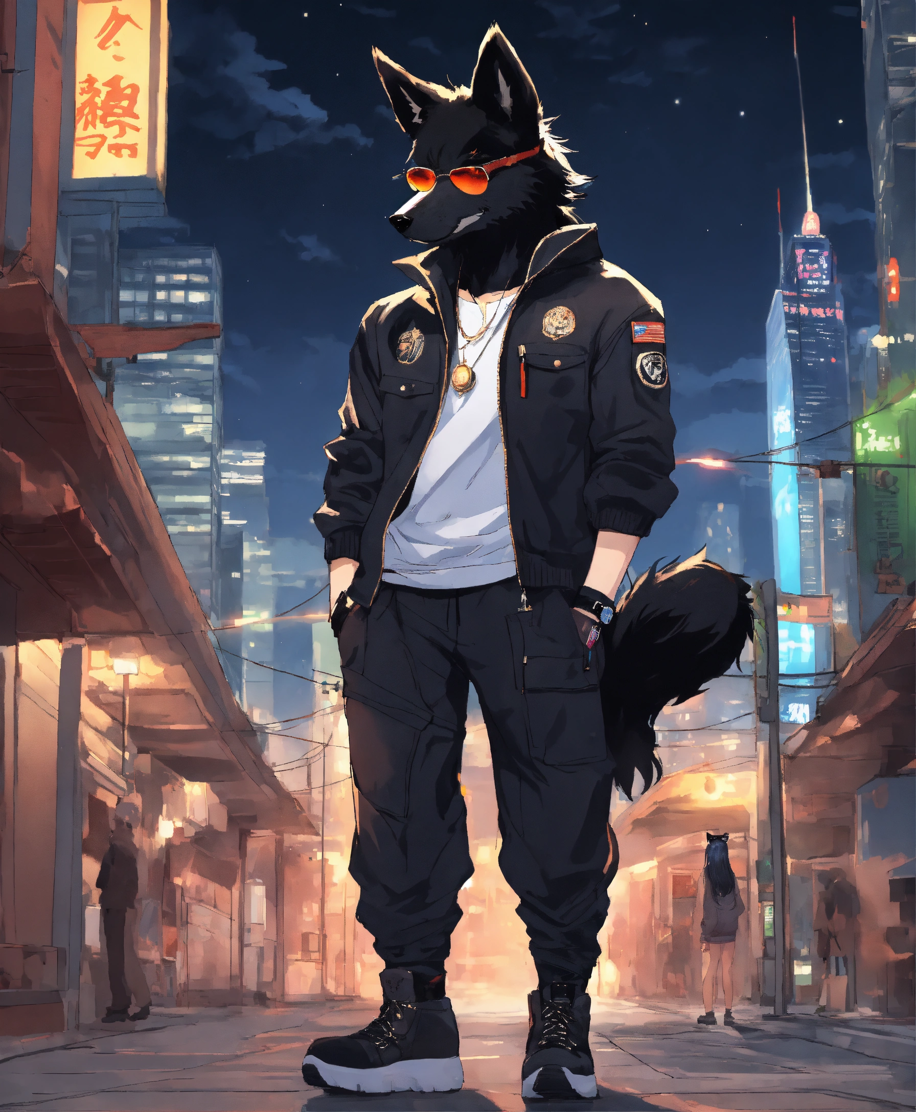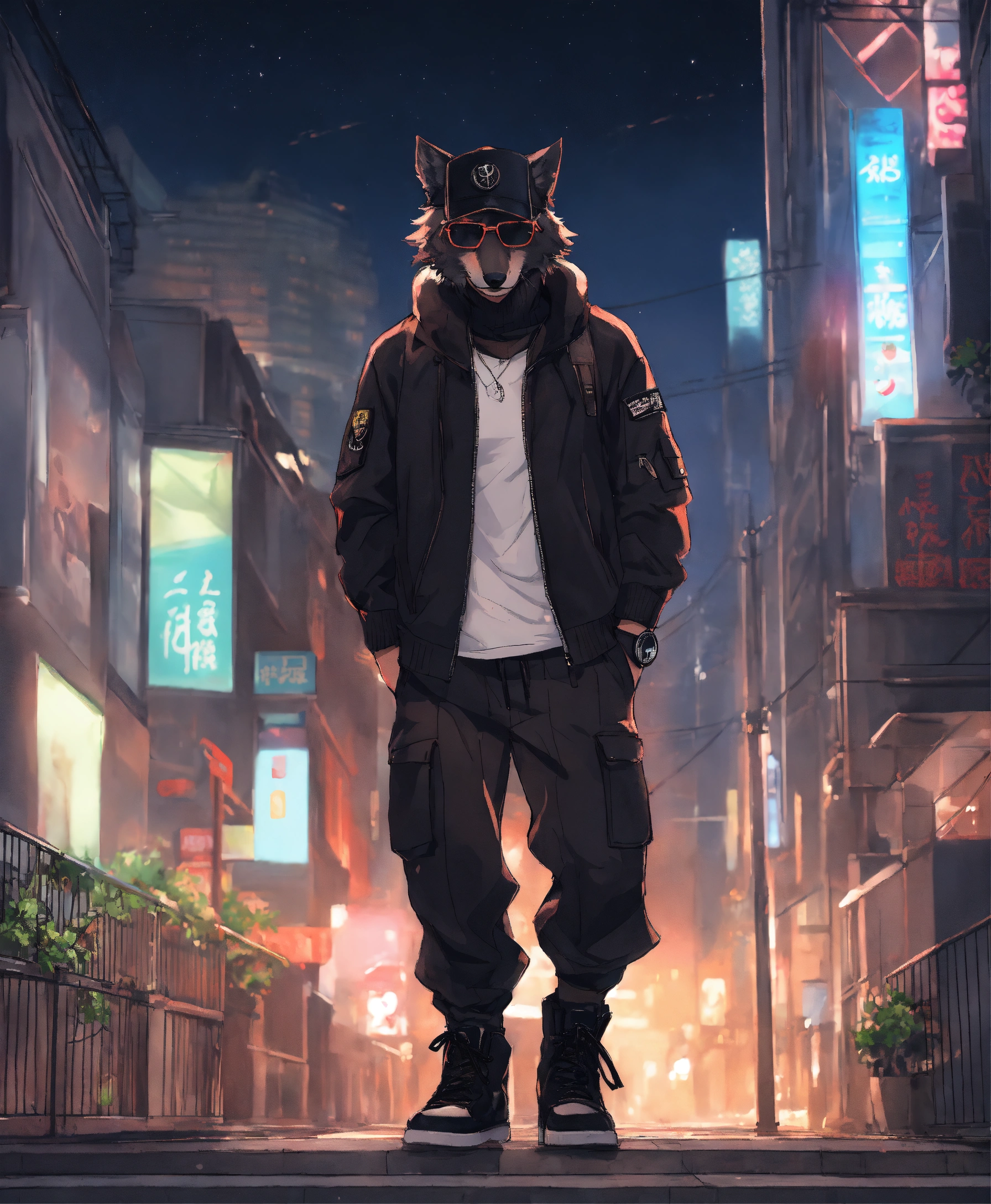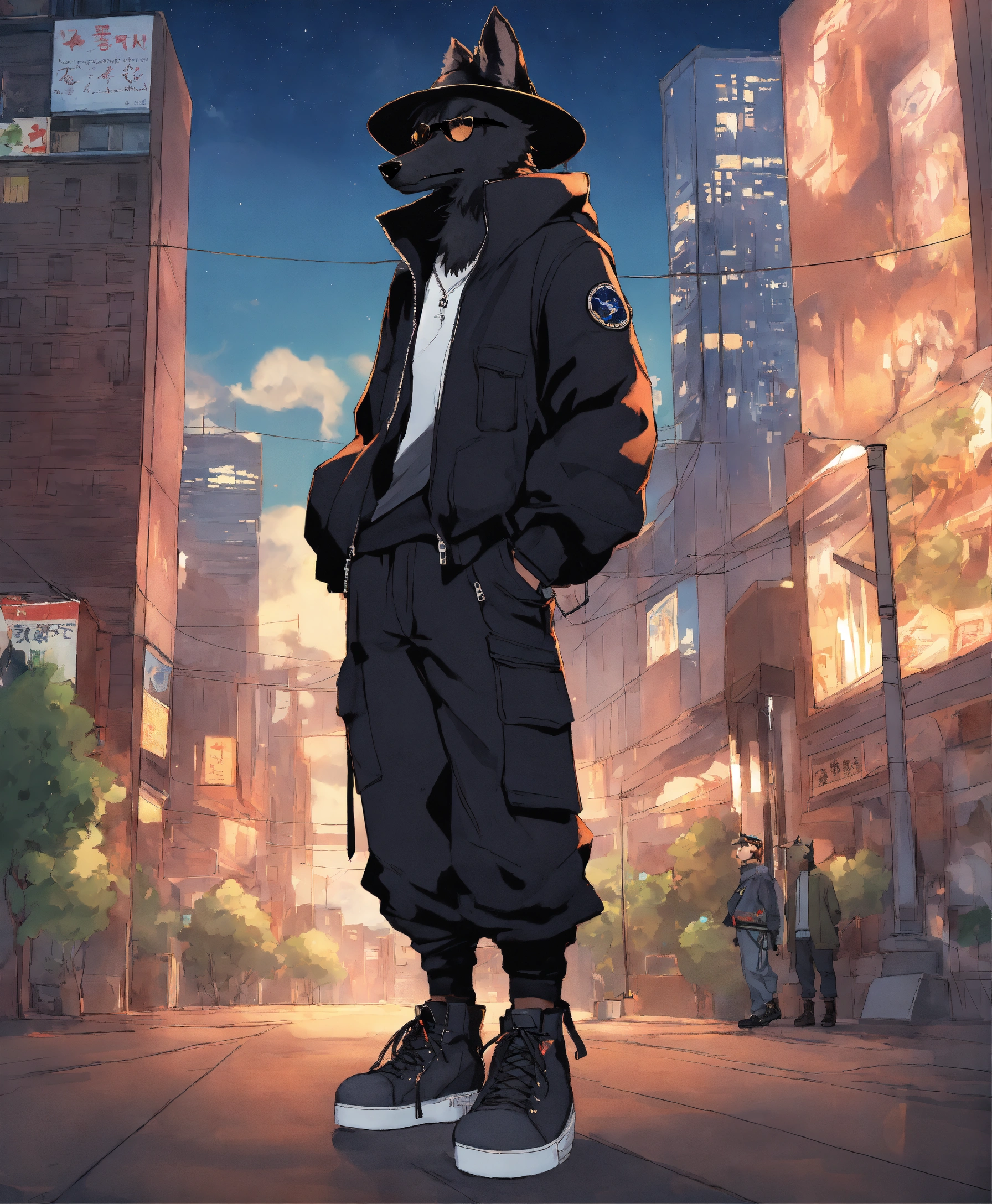 Furry black wolf with human anatomy, wearing white t-shirt, black zip up sweater, black sweat pants, black military boots, wearing a military black hat with black sunglasses on top of his hat, full body, three quarter view, standing, anime style, big eye anime style, tezuka, takahashi, toriyama, miyazaki, dark empty street with dark buildings and skyscrapers background with beautiful night sky with clouds and stars.