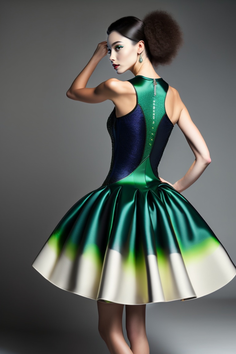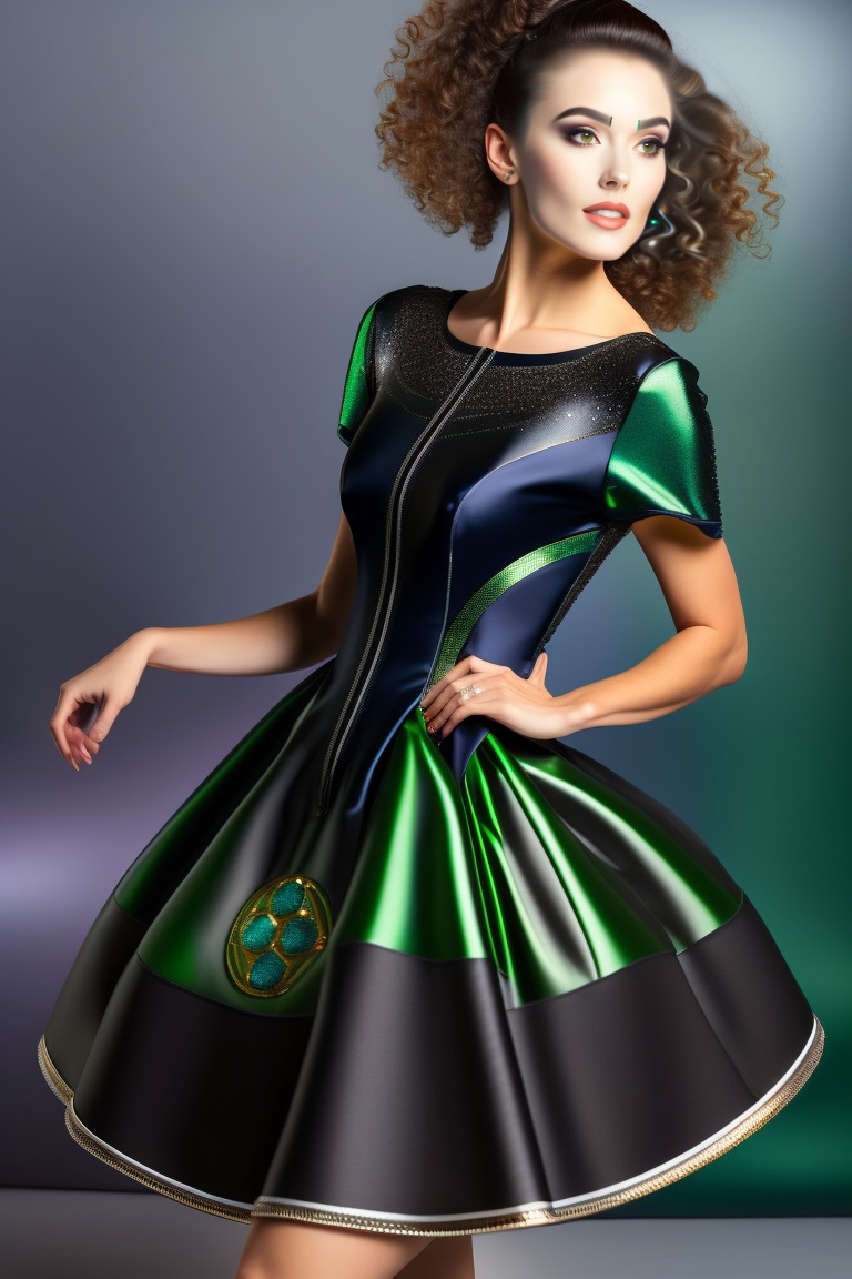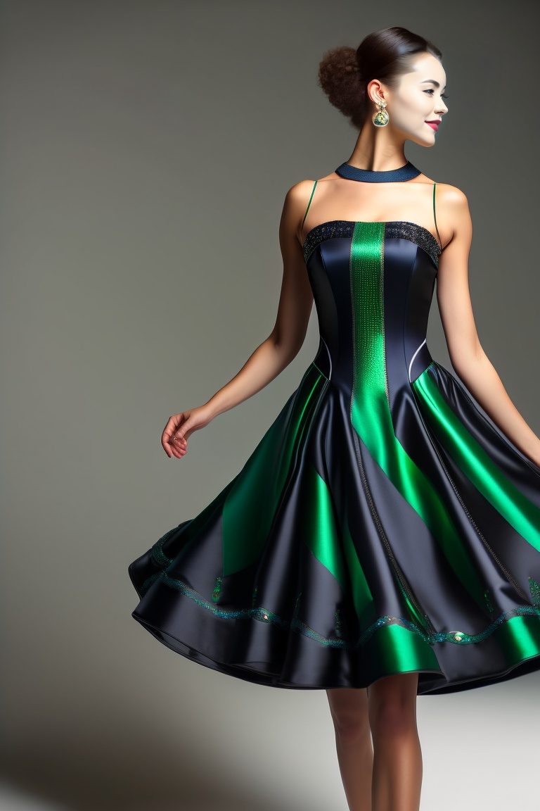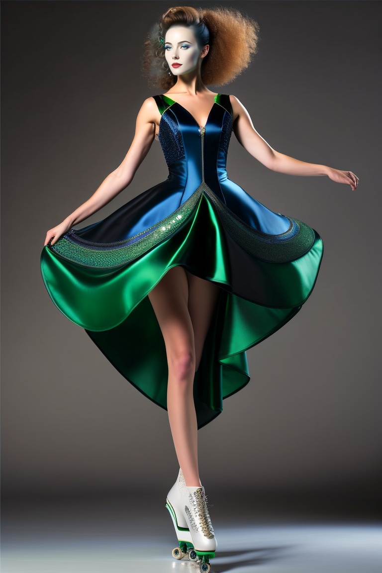 This artistic roller skating dress, inspired by marie curie, elegantly combines dark blue, black, and emerald green with a subtle silver shimmer to symbolize radiation's mystery. the sleek design allows fluid movement, featuring wave patterns resembling radiation's spread on the fabric. swarovski crystals add radiant elegance, and subtle movie references adorn the dress with test tube and atom embroideries. crafted for comfort and mobility, it's perfect for artistic roller skating routines with high-quality materials and an invisible zipper for a secure fit.