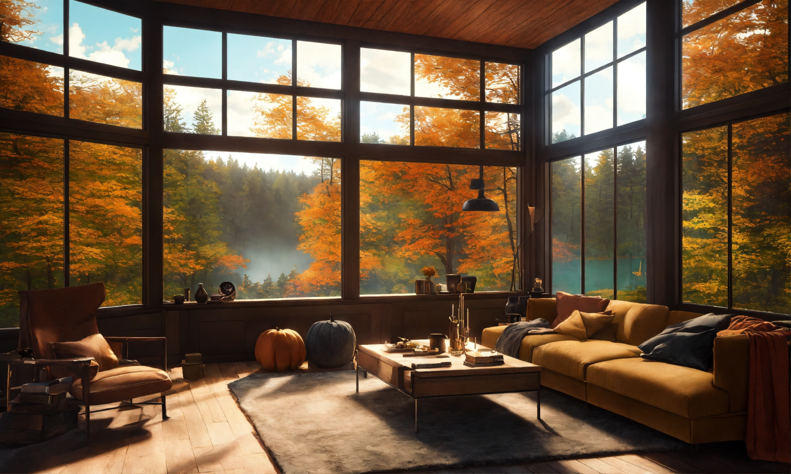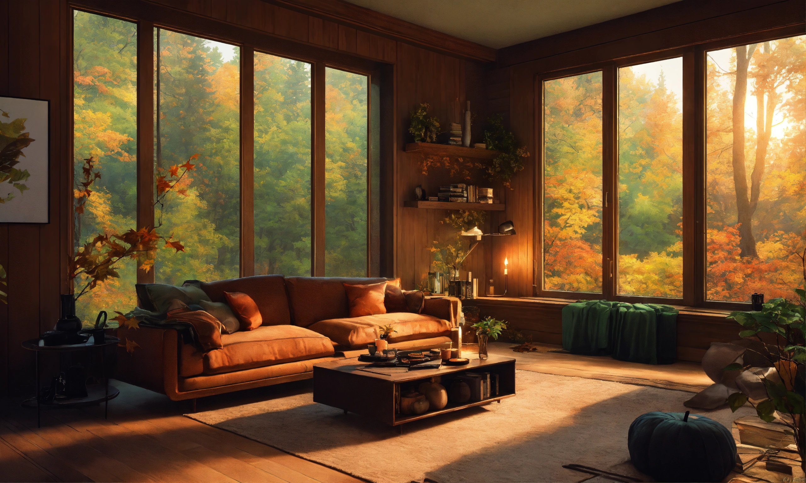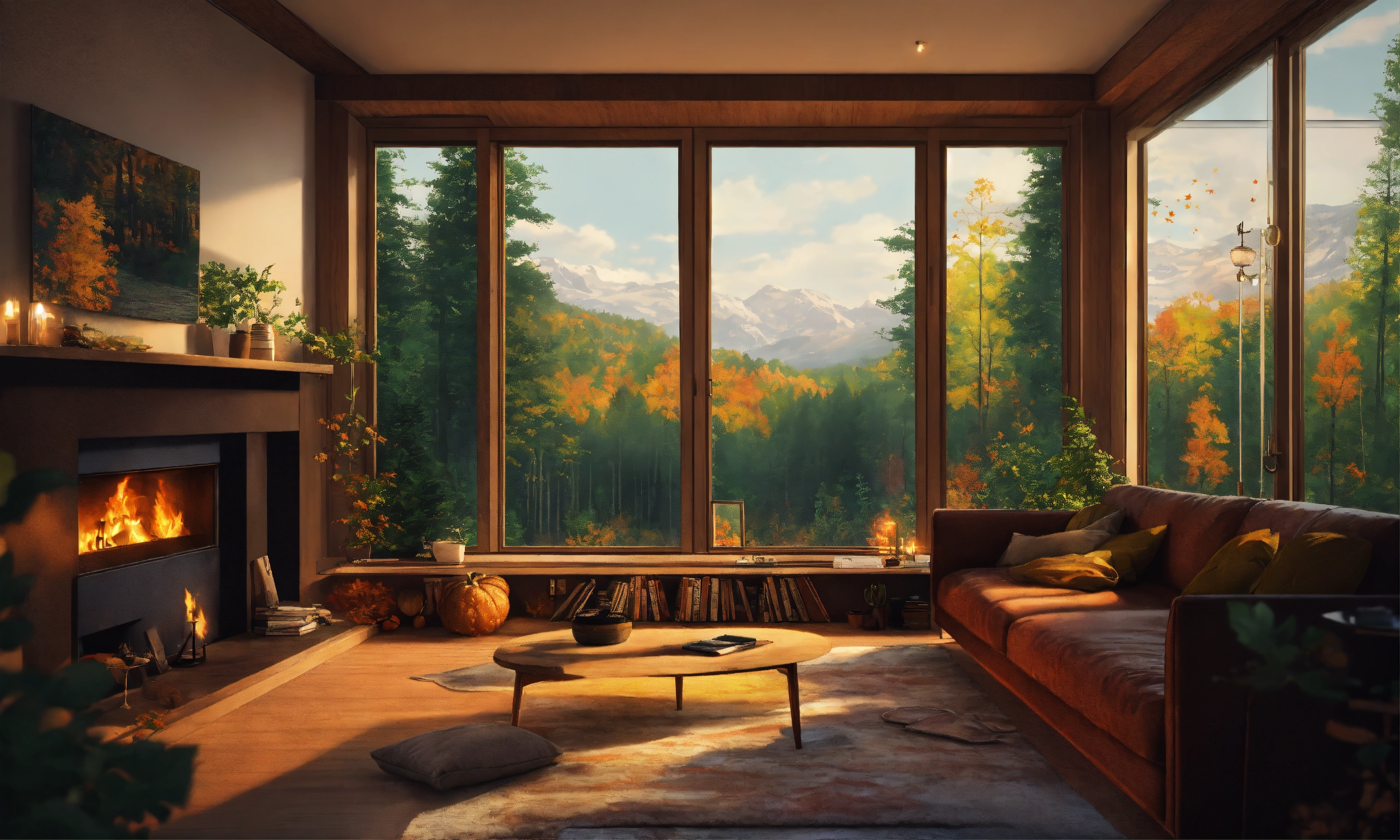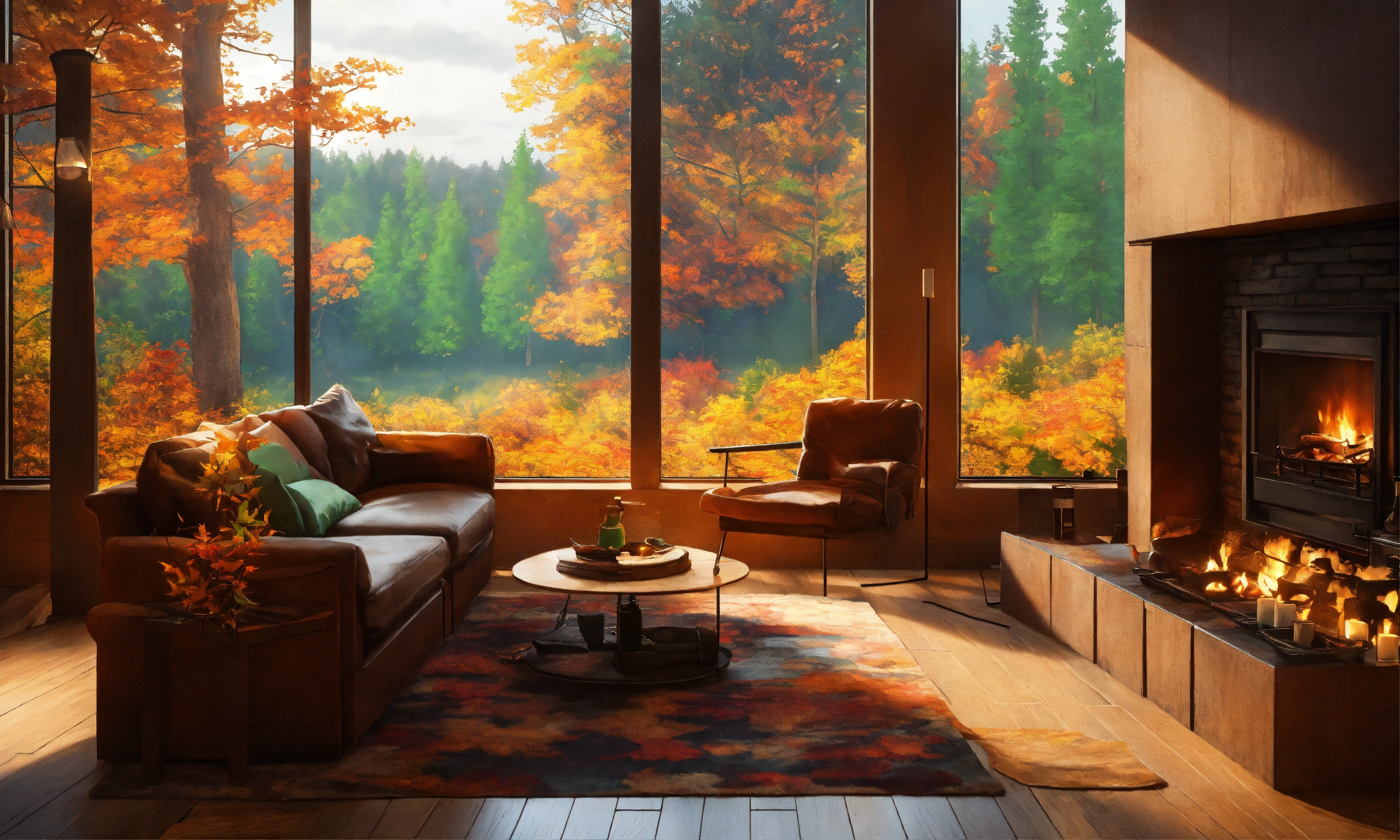 Anime nordic forrest house minimalistic cozy living room with fireplace, big centered window with view over forrest, big open living room, fireplace in the middle, dark brown wooden living room, green color tints in the room, fall season, fall lofi artwork, fall view, fall leaves
