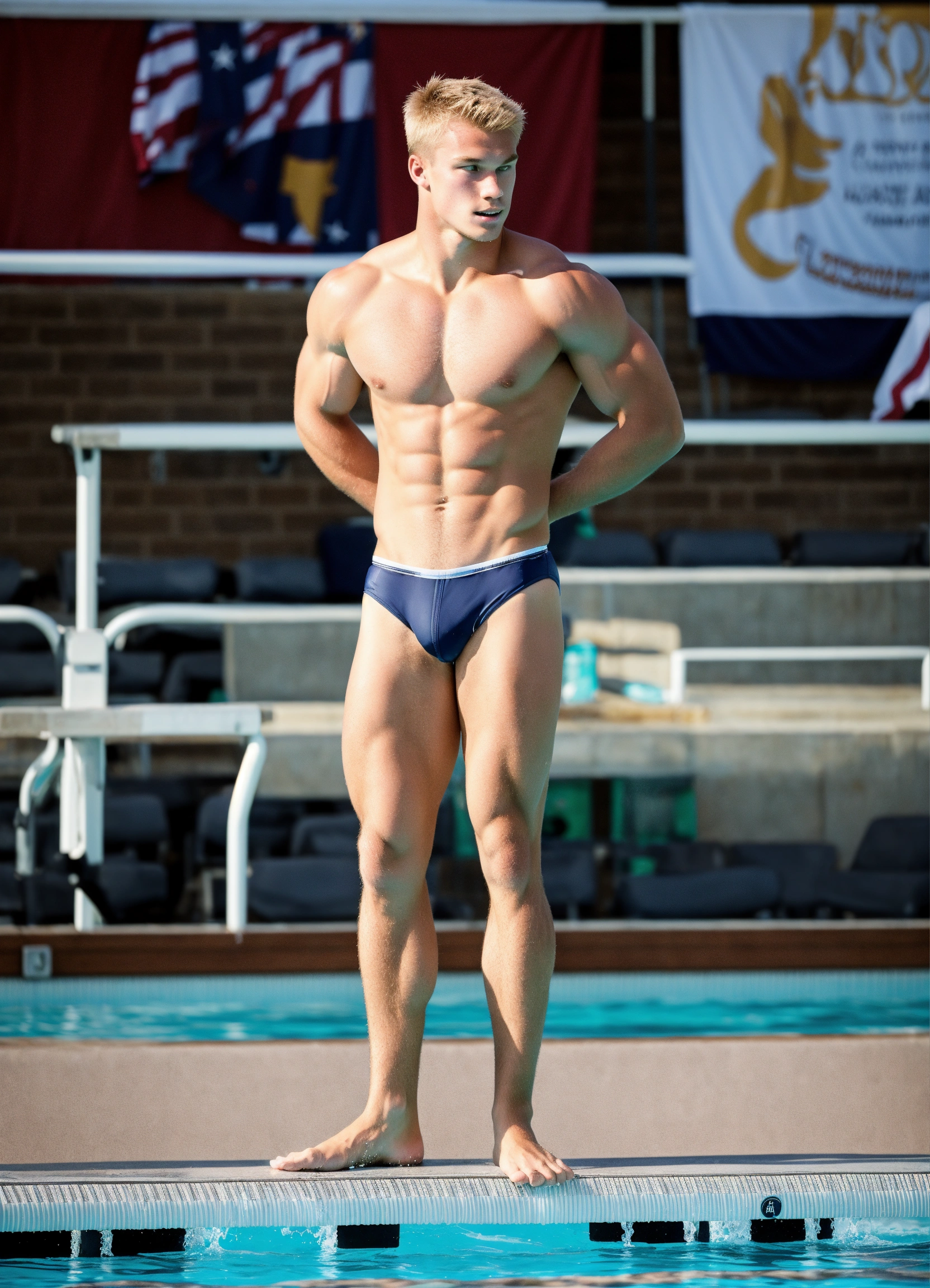 A muscular blond male college diving athlete wearing a small speedo on a dive board