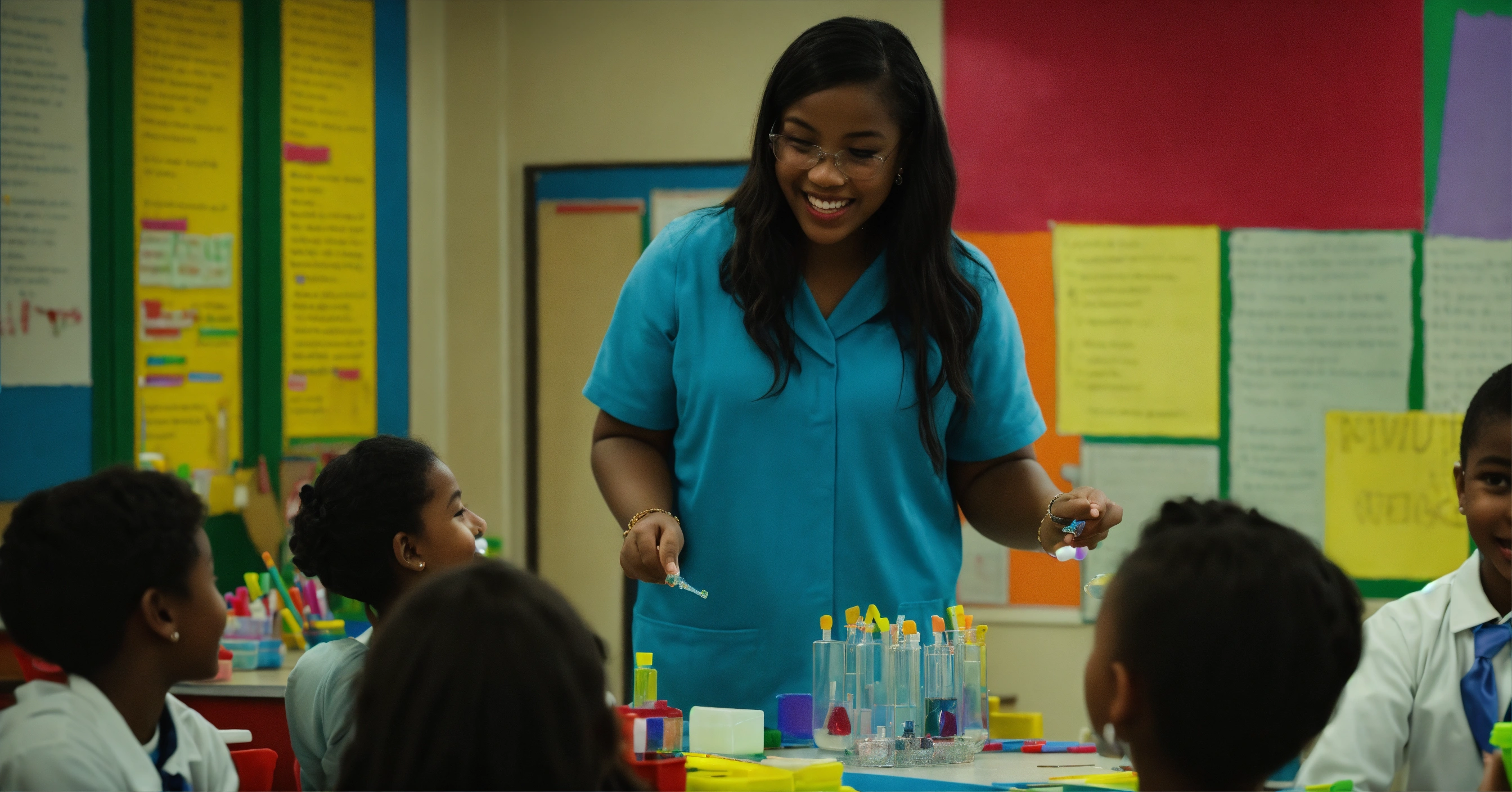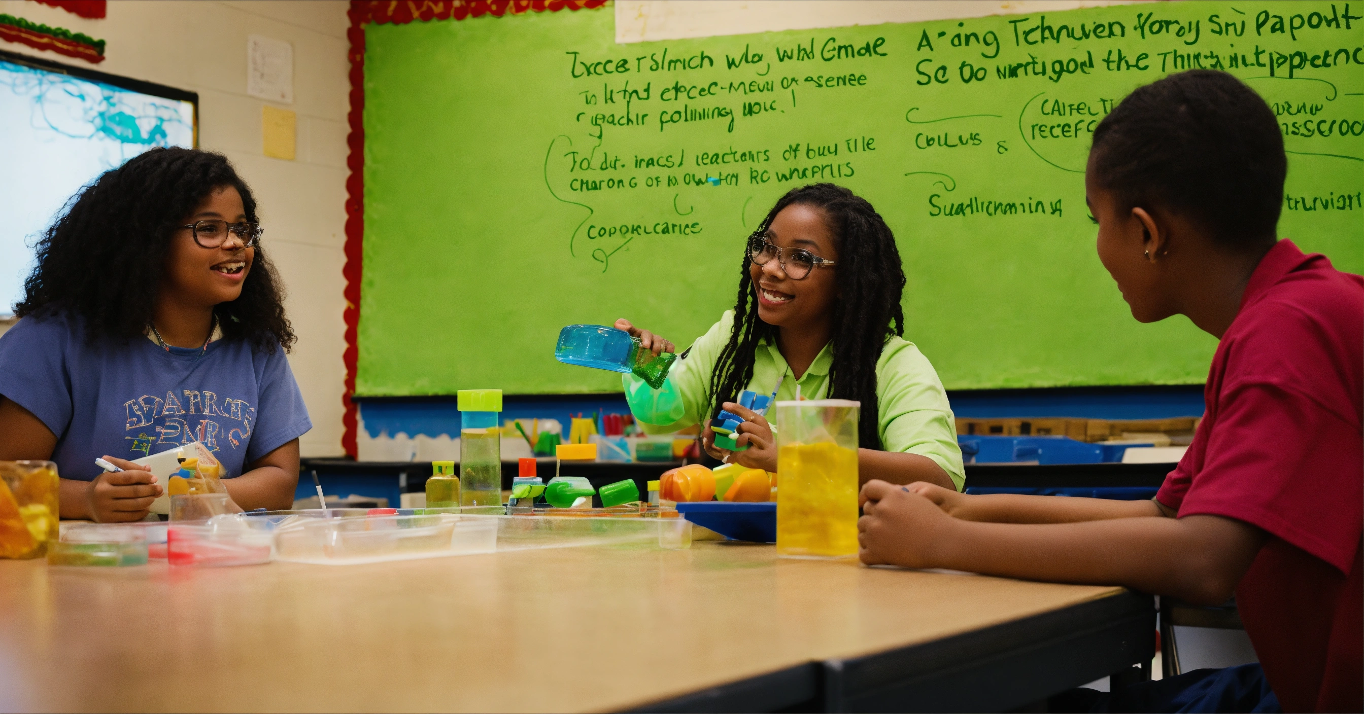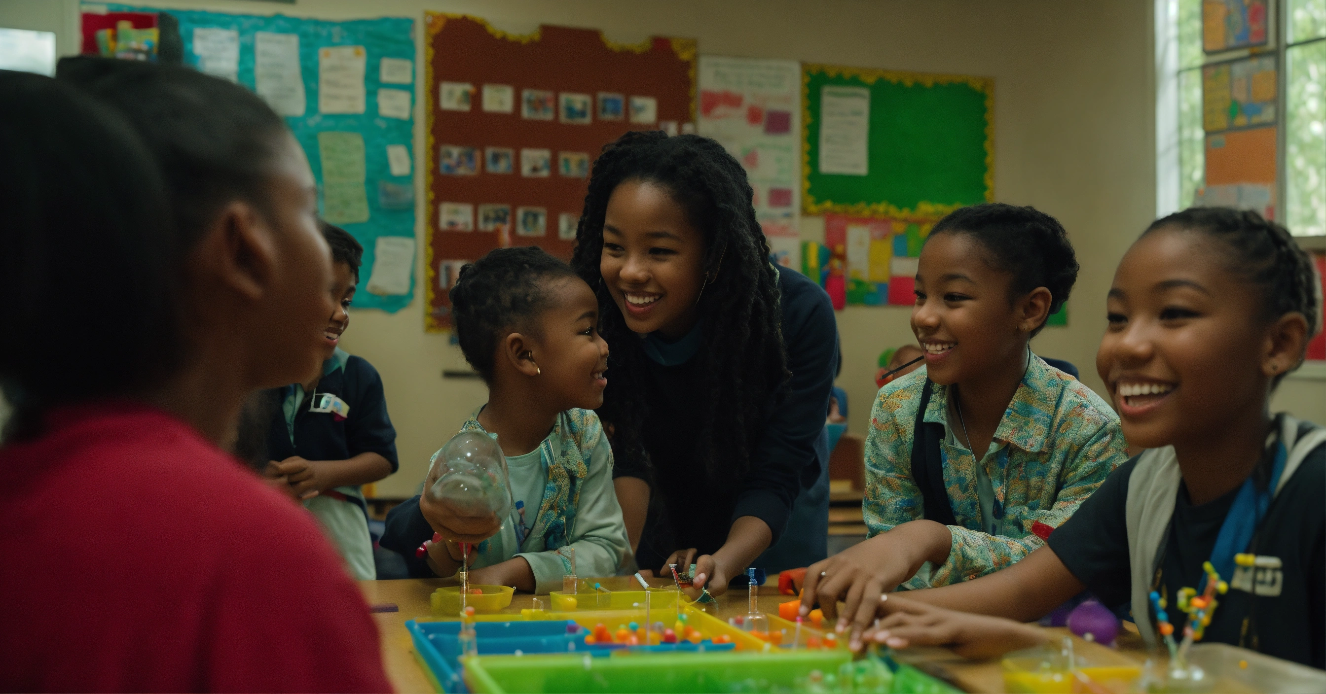Color photo of a school professional of color interacting with middle school students of color, striking photo cinematic, a dedicated teacher guiding a small group of students through a hands-on science experiment, a passionate storyteller captivating the children with animated gestures and expressions, a mentor offering encouraging words of wisdom to a student facing a challenge, a warm and nurturing presence providing a safe space for the students to express themselves, a vibrant and lively classroom filled with the energy of learning and discovery, an atmosphere of inclusivity and empowerment that resonates with every interaction, a camera capturing the scene with precision and artistry, a lens focusing on the genuine smiles and engaged expressions of the students, a film that enhances the vibrant colors of the classroom, adding depth and richness to the image, techniques that play with light and shadow, creating a captivating play of highlights and contrasts