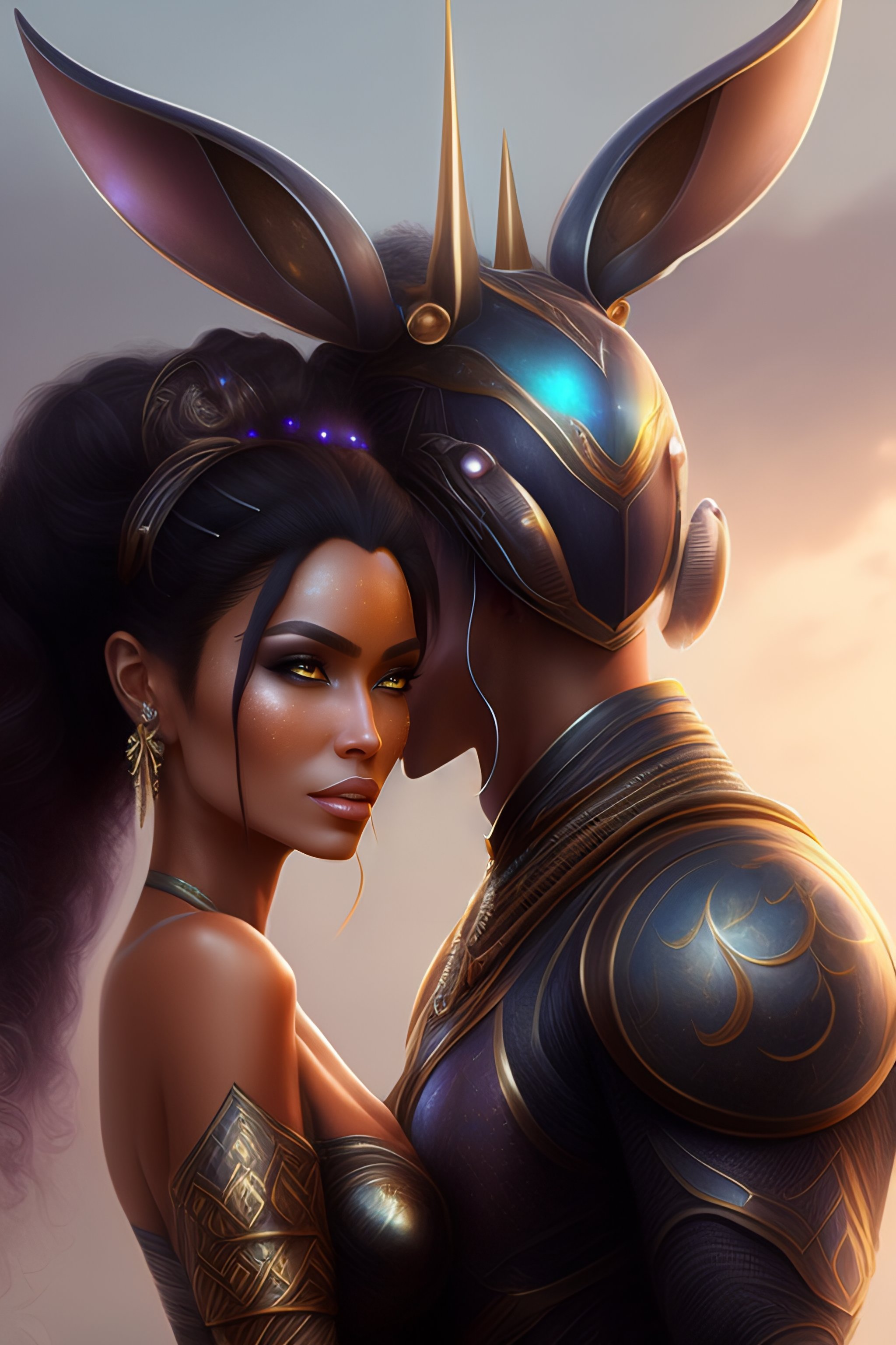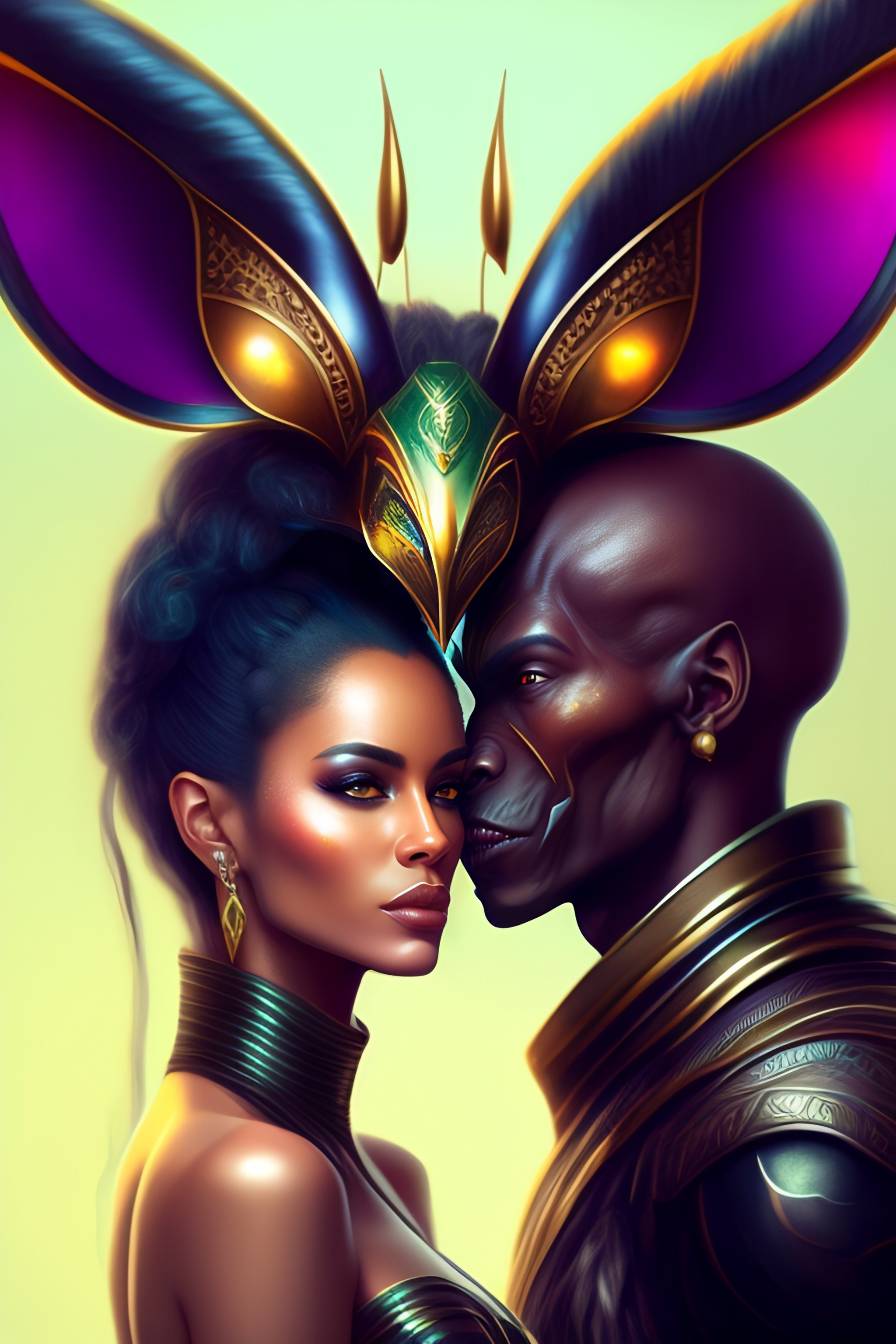 Detailed concept art of a fantasy alien couple, with antennas in the head and a special sensory on the forehead.