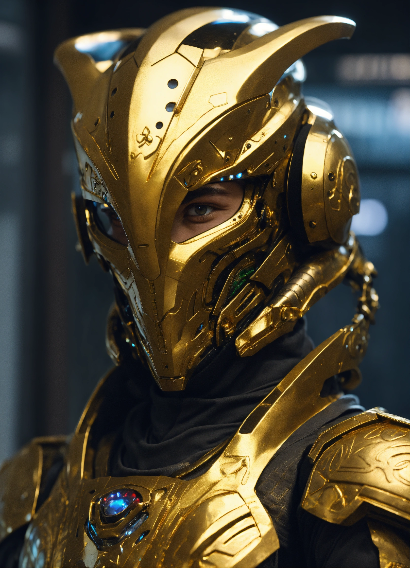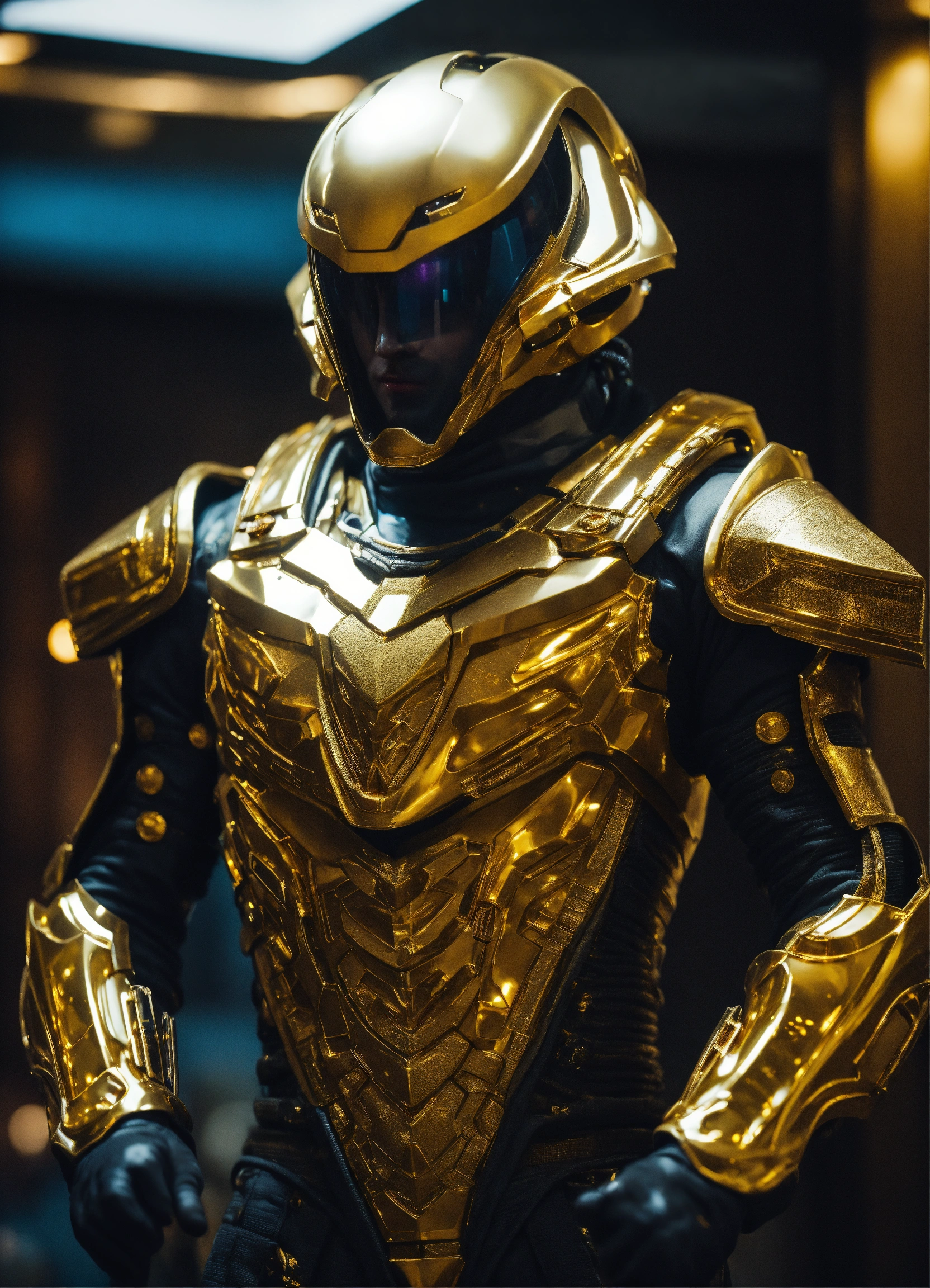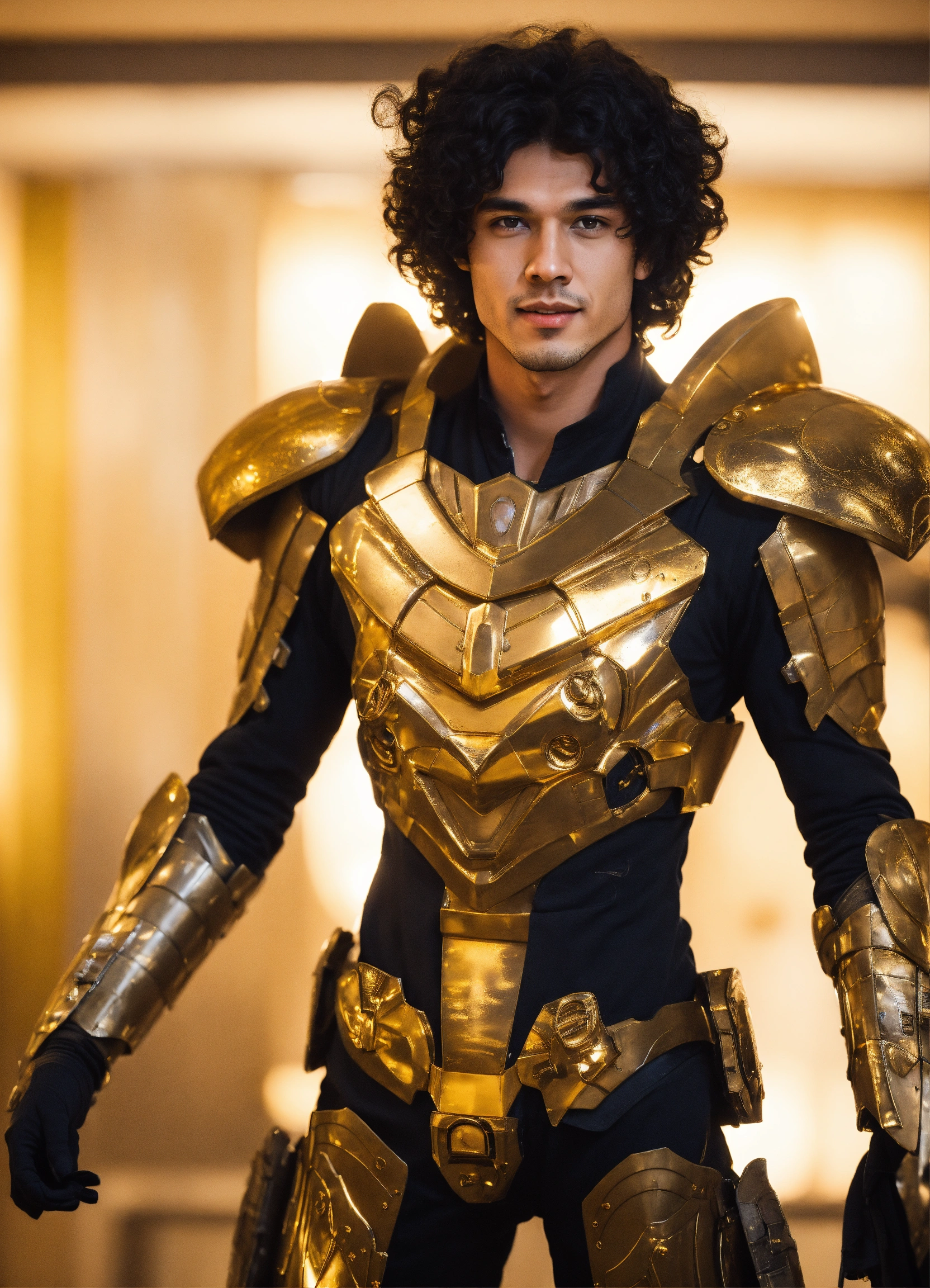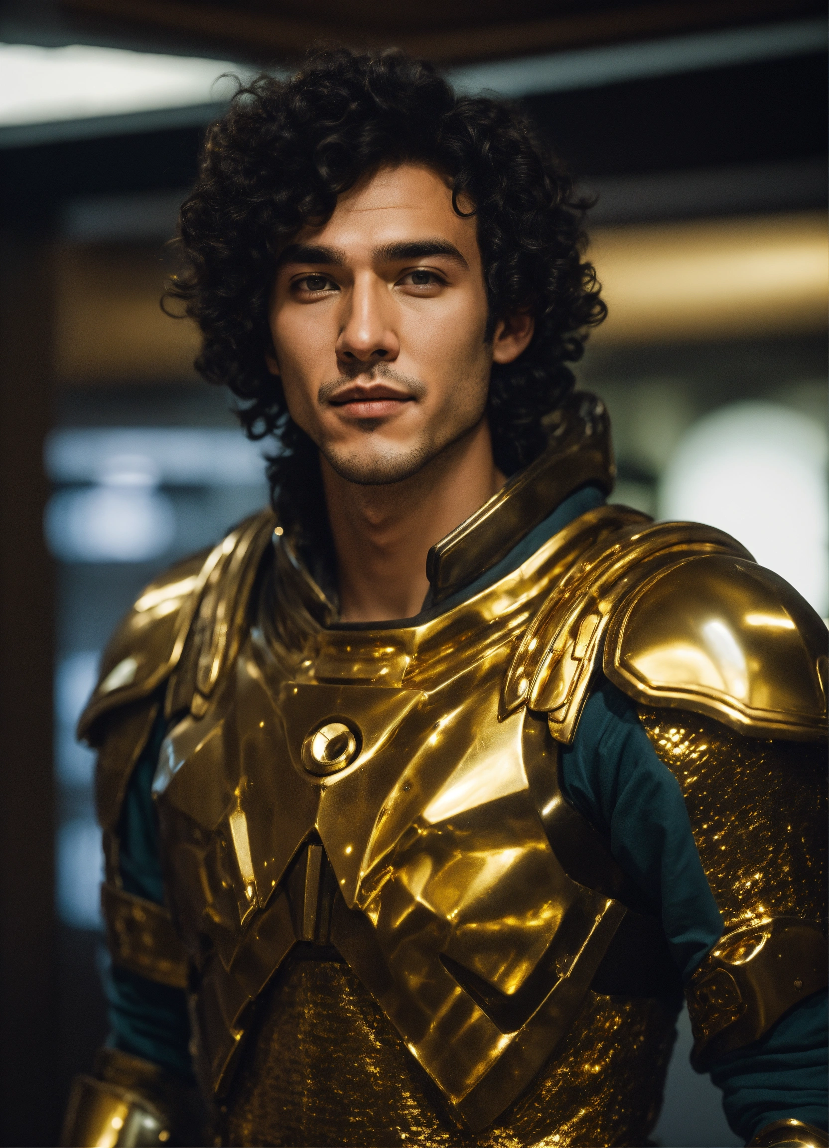 Happy alien 25 year old male, black curly hair. angular face, dimpled chin, spotted skin. in gold battle armor. athelitic build. in upscale lobby.