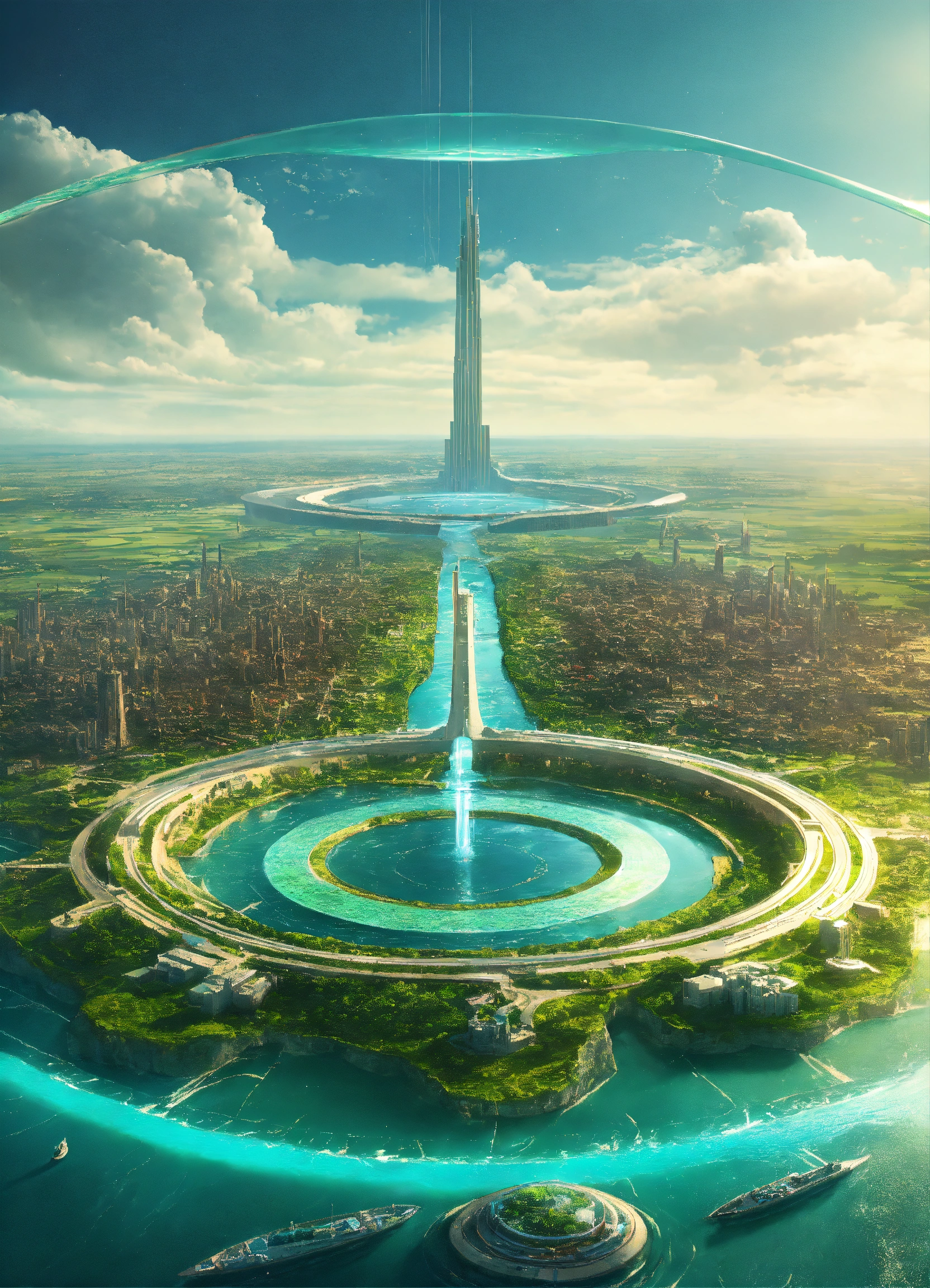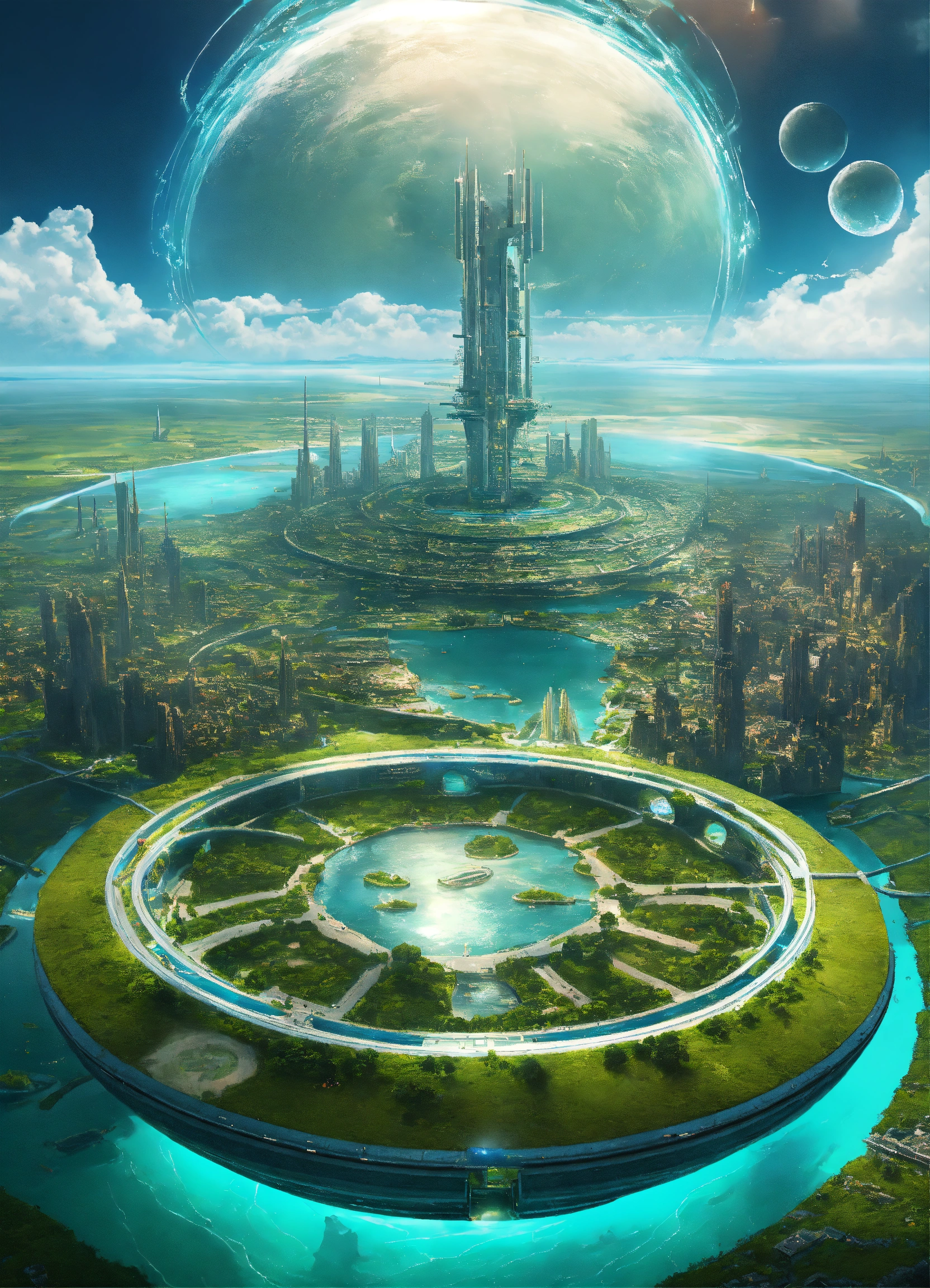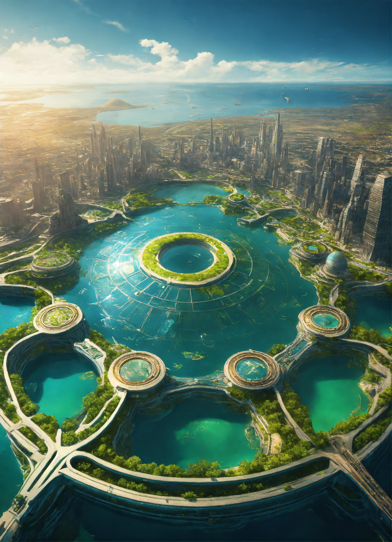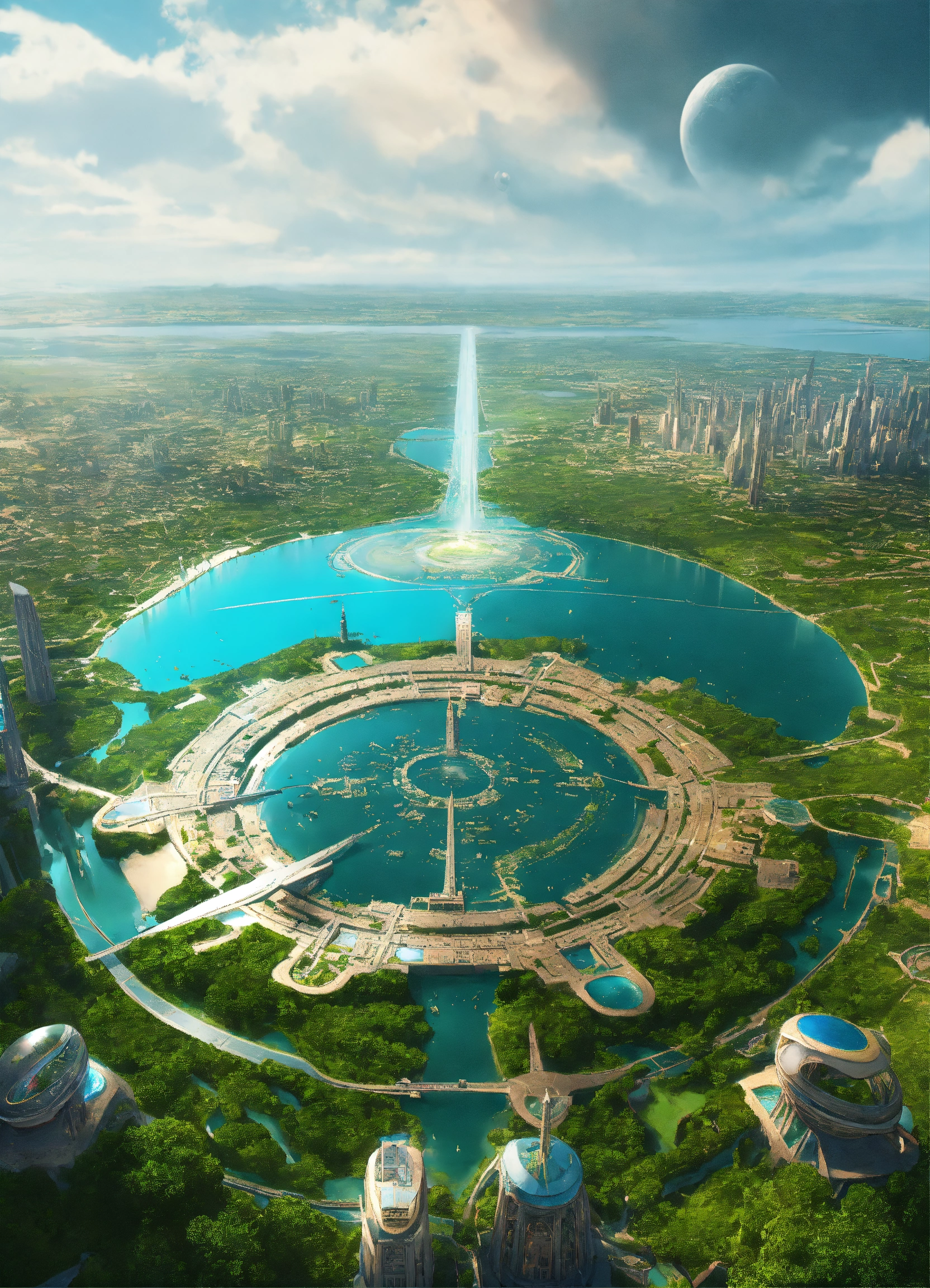 Futuristic city surrounded by a large ring of water, the ring was connected to the ocean with a four canals at each of the four corners, surrounded by lush green plains