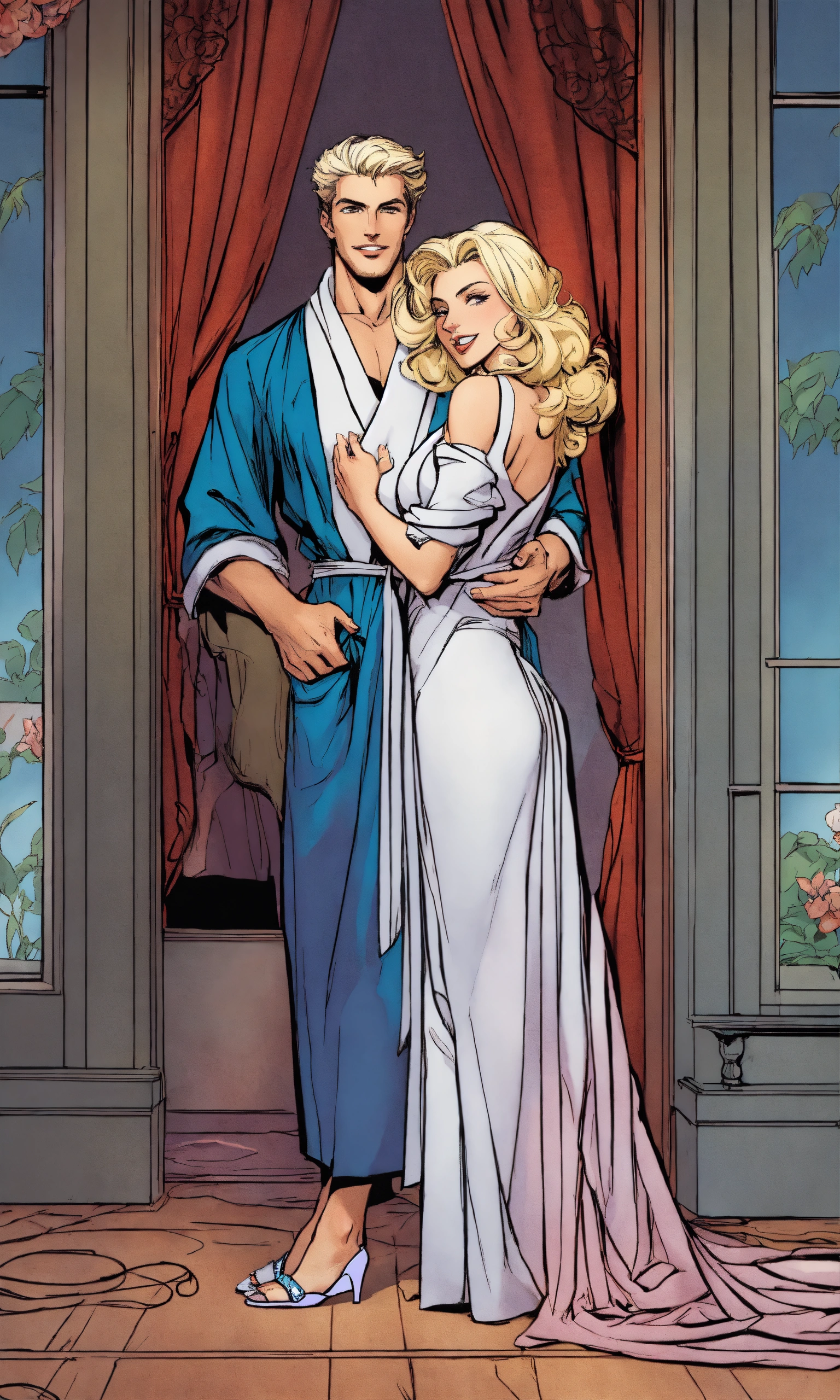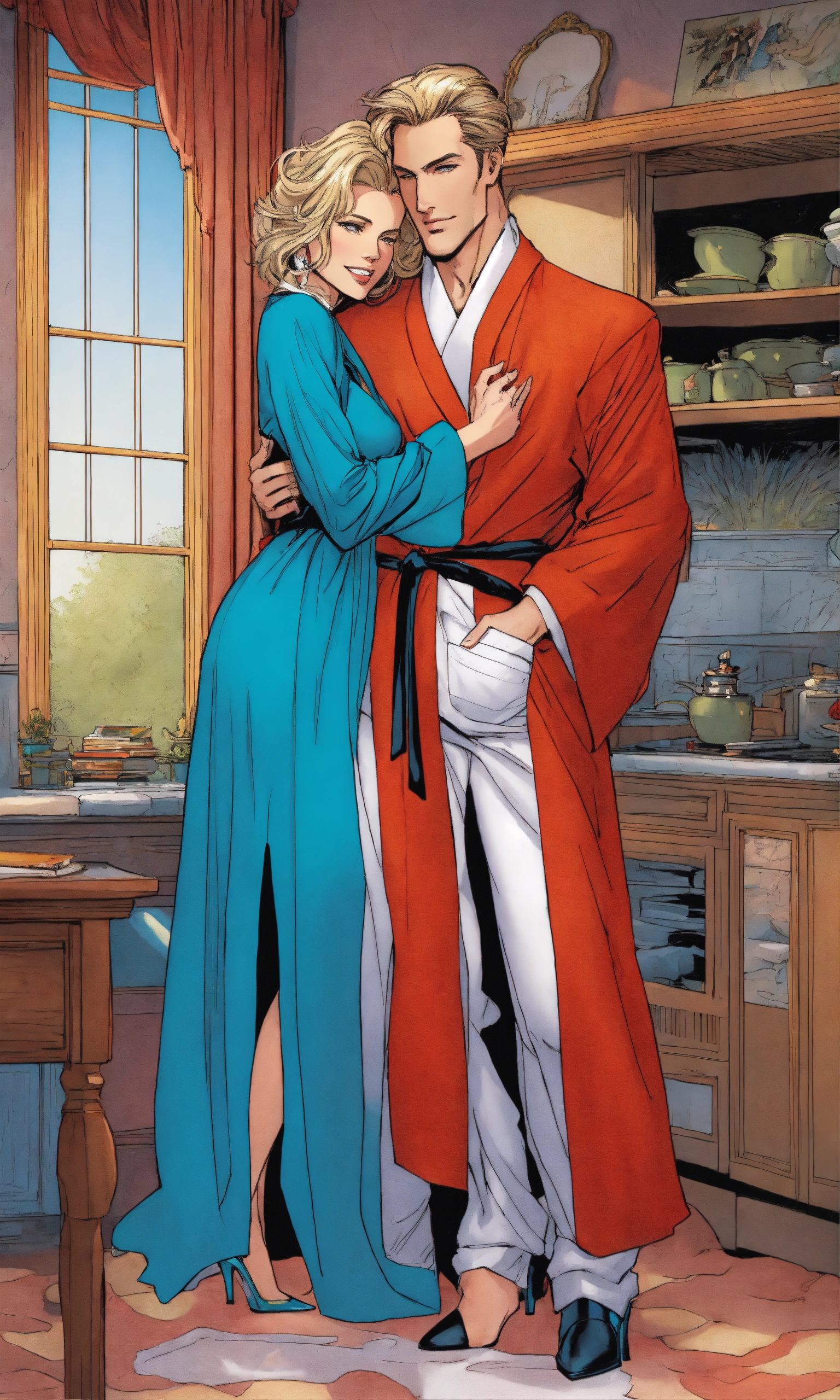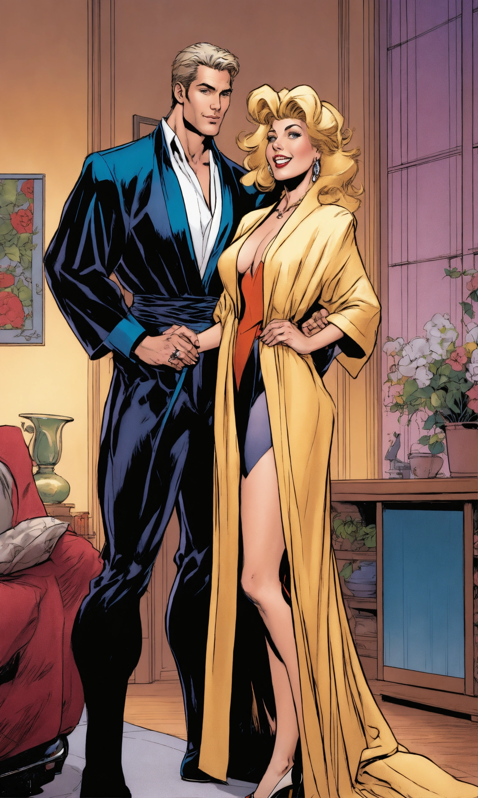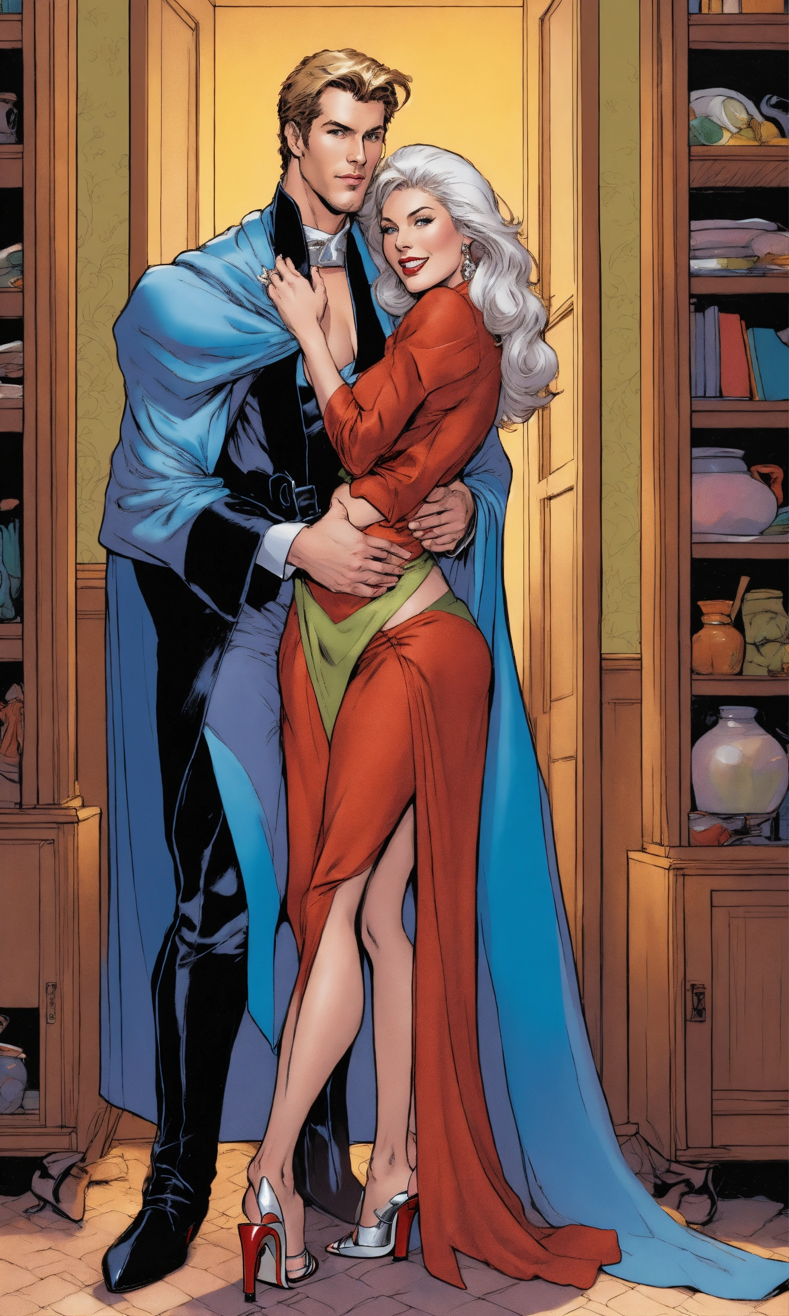 Older jane herron as a housewife, wearing a silk robe and stiletto high heels, hugged from behind by her handsome son, art by j. scott campbell, art by todd mcfarlane