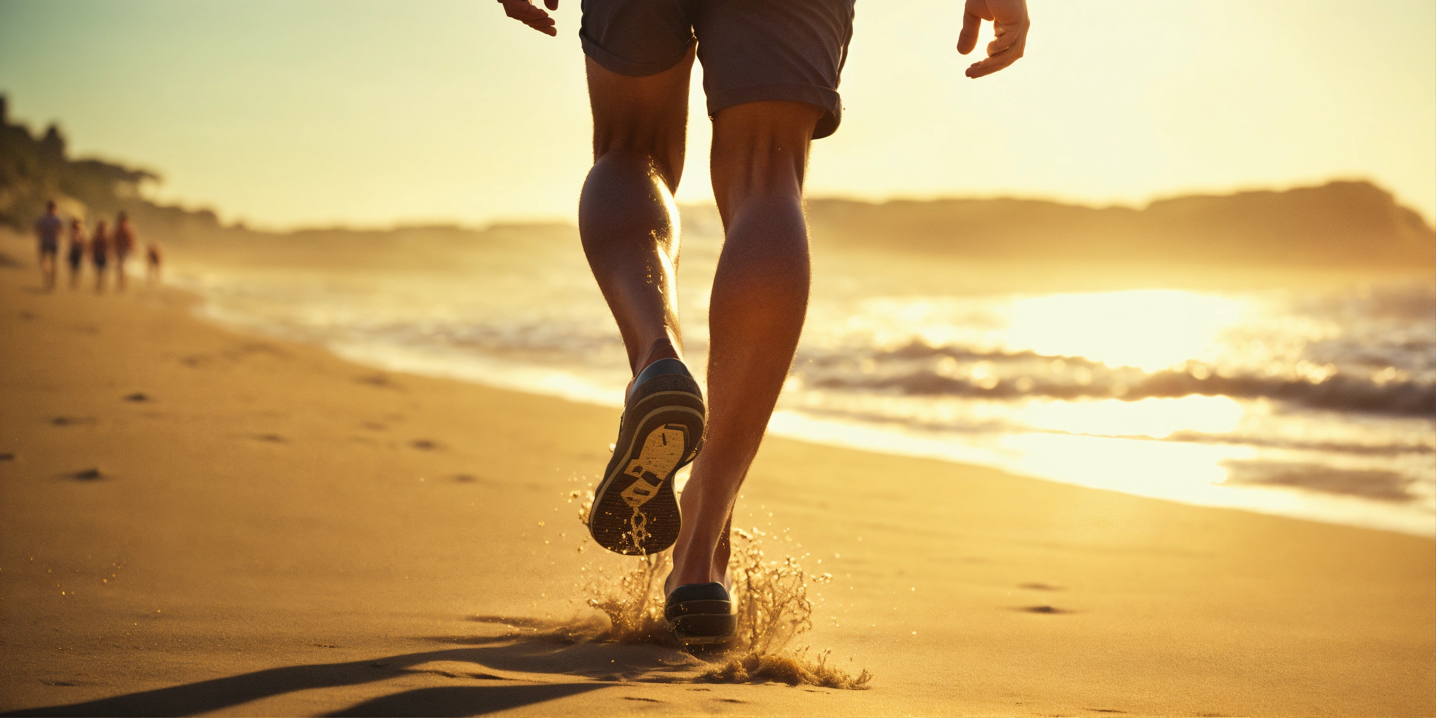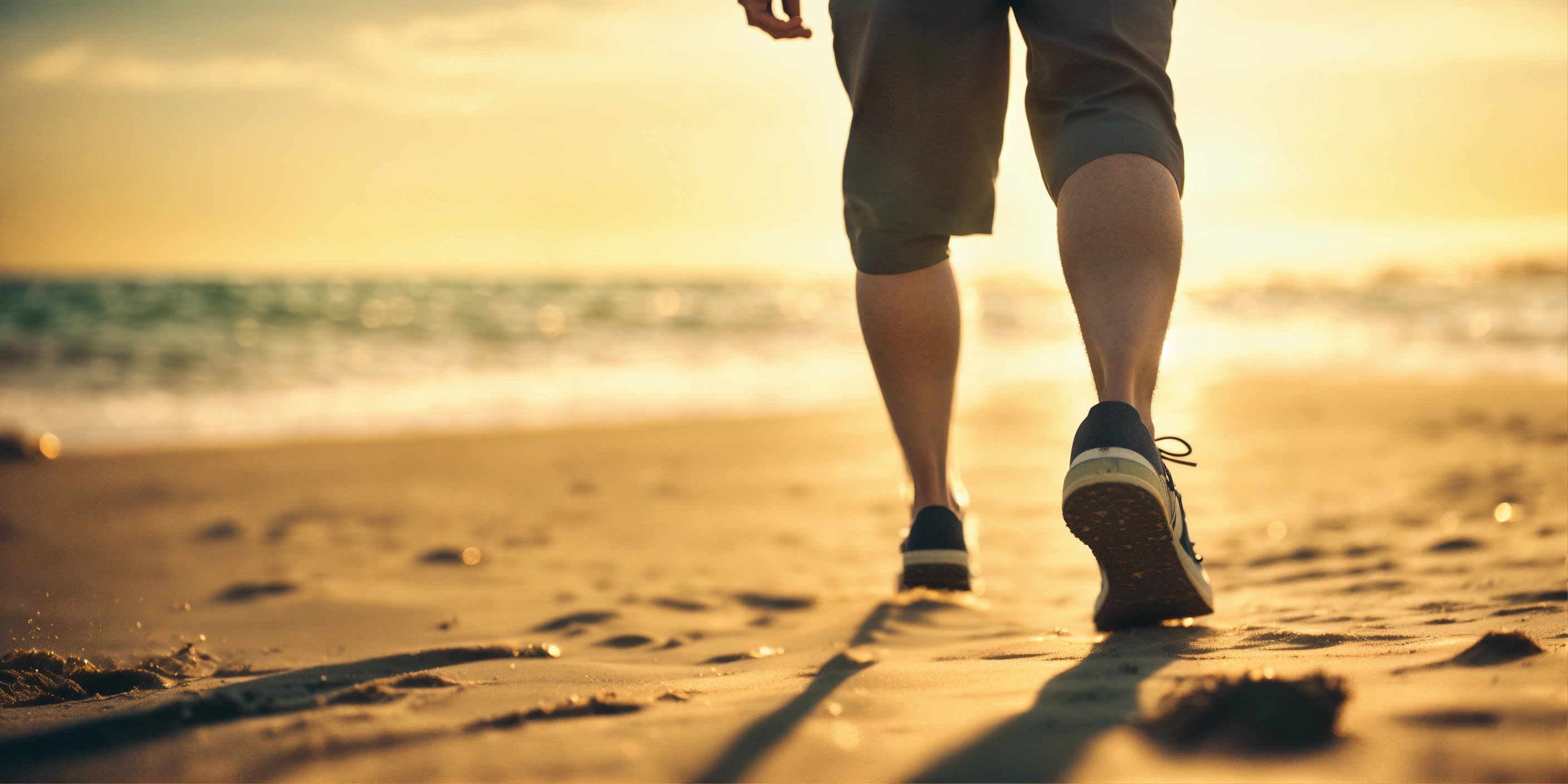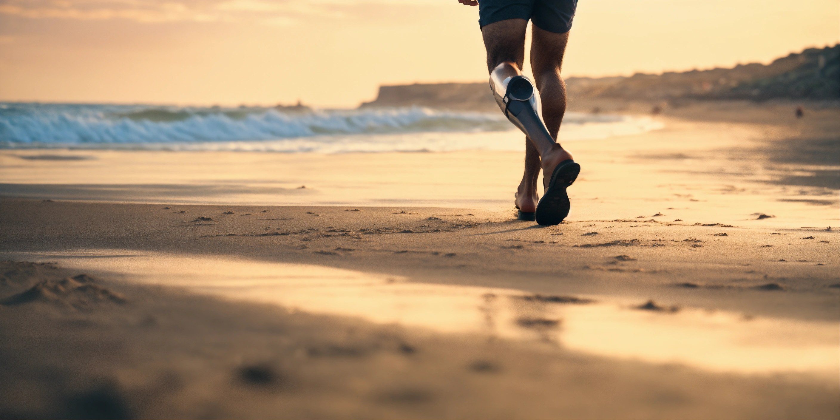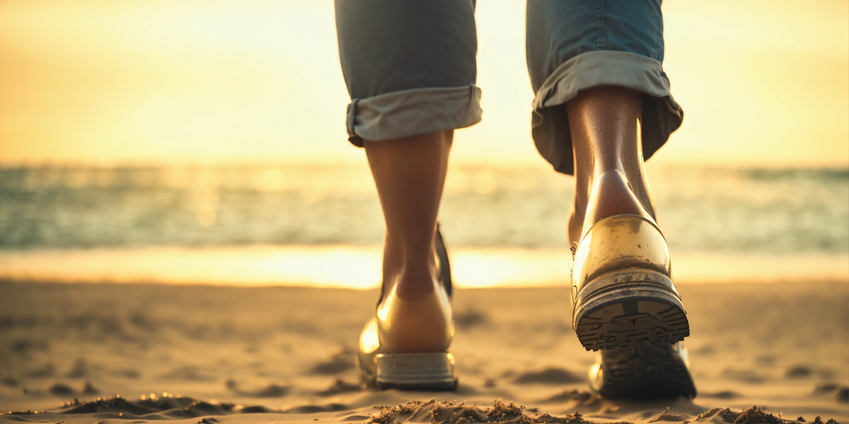 Closeup on prosthetic legs of a man walking in a beach, blurred beach, vintage filter, 16k, cinematic shot, cinematic, realistic, film grain, volumetric light, imax, photorealistic, hyperdetailed textures, sharp focus, ambience light, center view, ground view