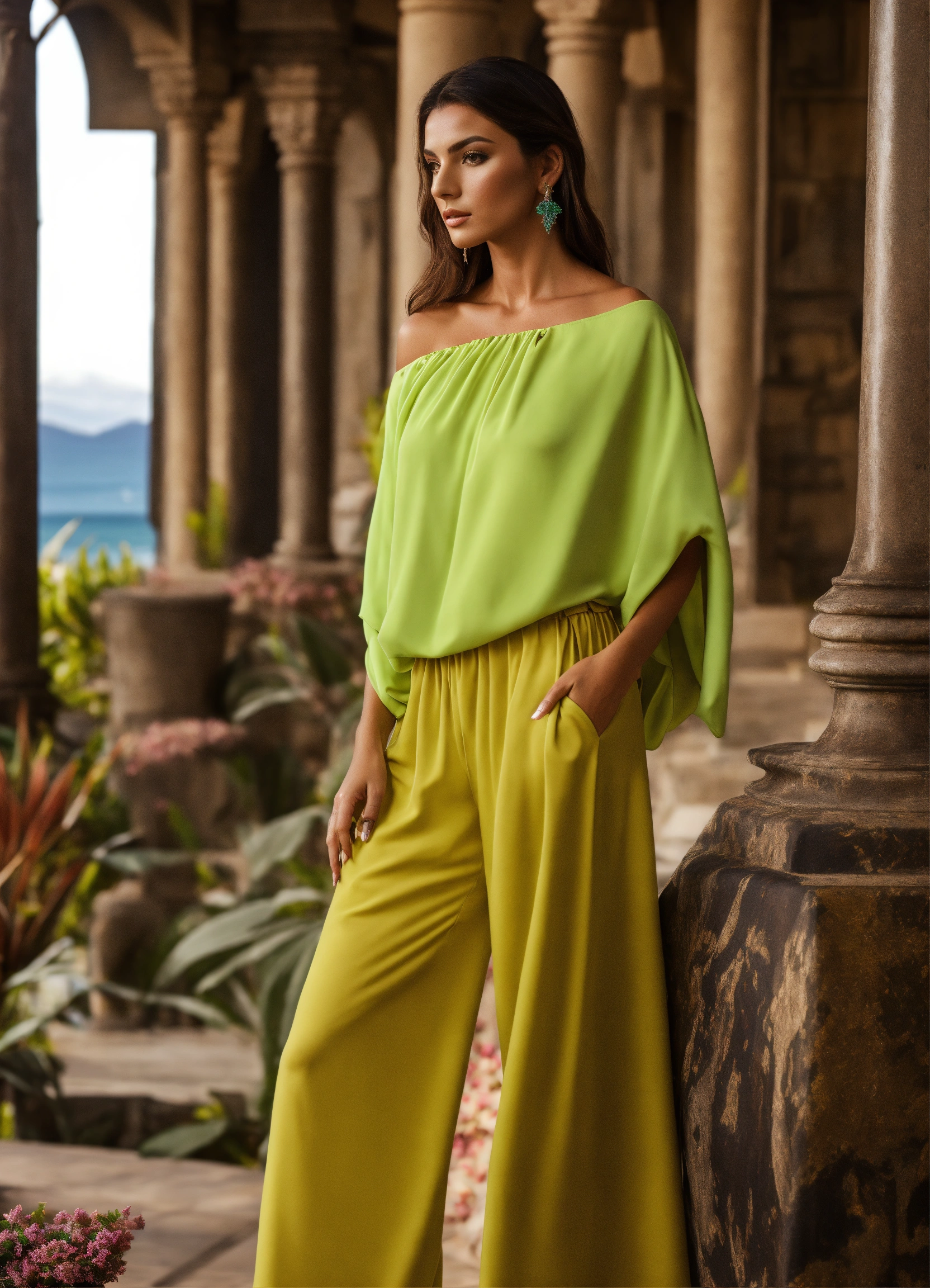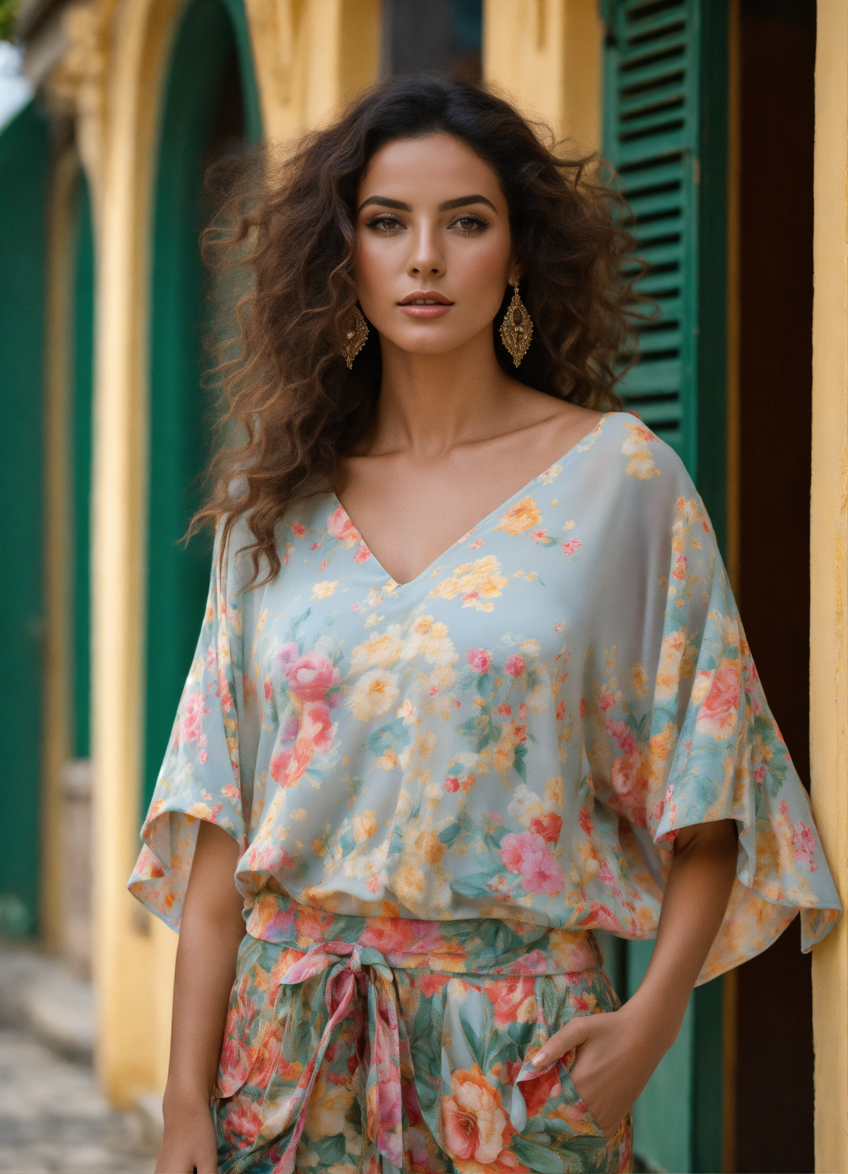 Ultra realistic full body photo of italian female model modeling layered dolman sleeve royalty inspired outfit in mauritius