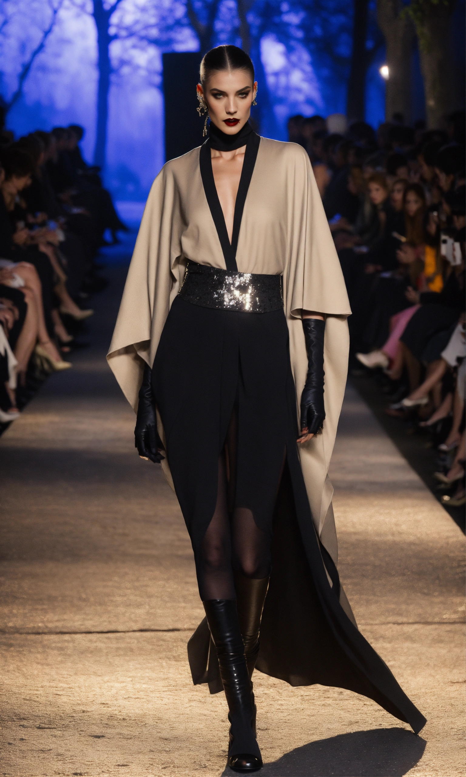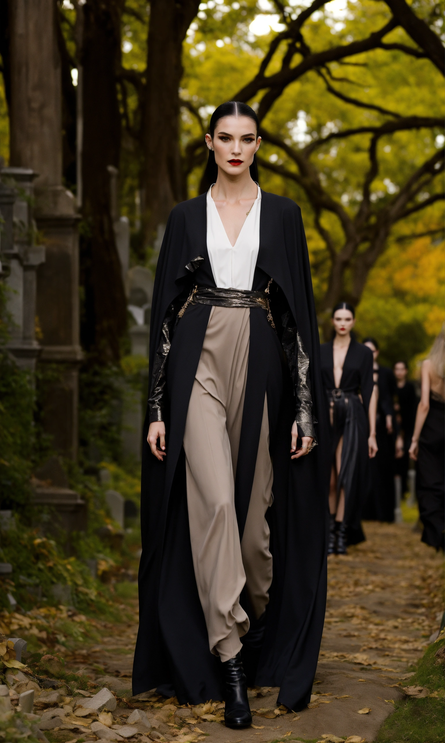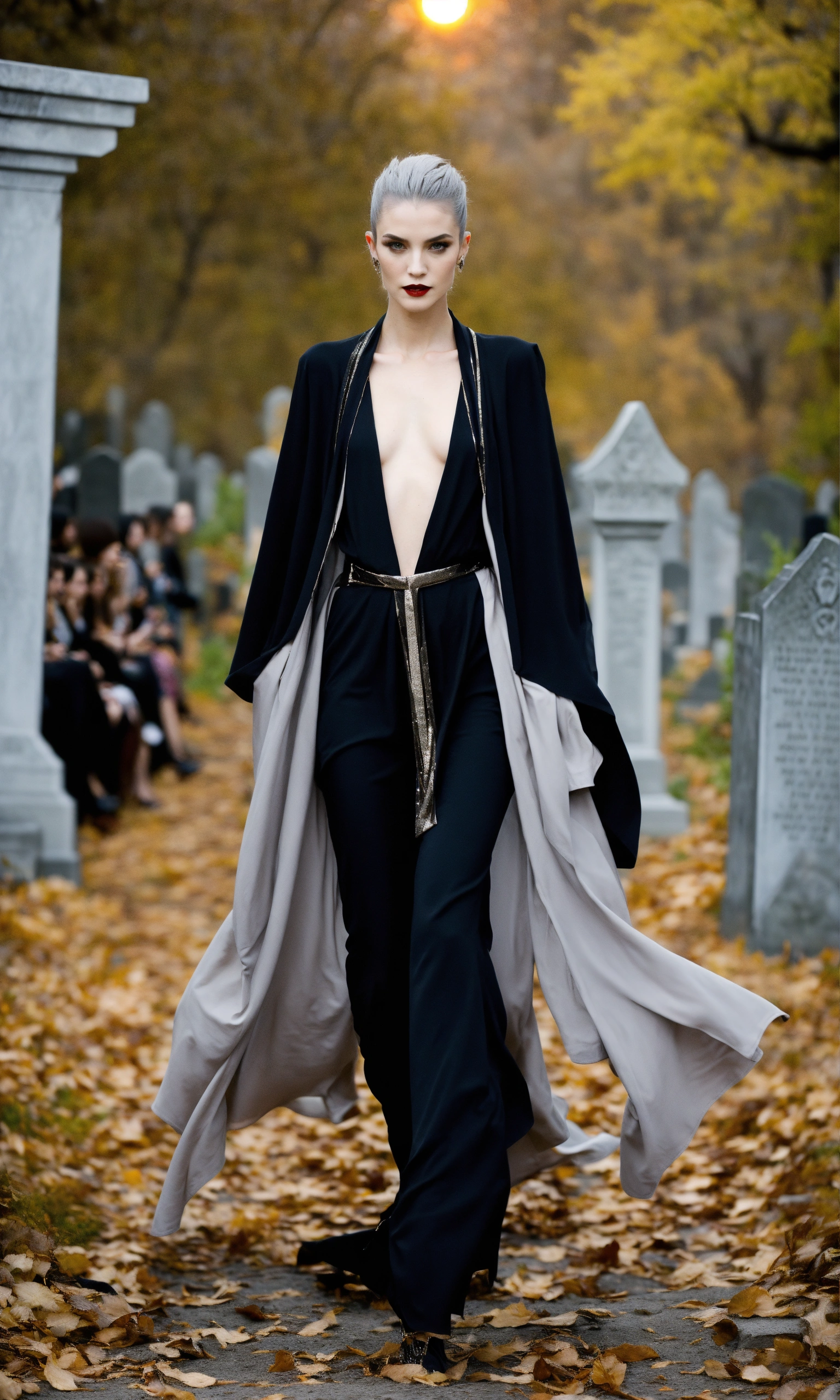 Lothlorien androgynous vampires walking runway during vamp fashion week wearing dolman sleeve dark donna karan vamp fashion in black, white, grey, beige, stone, metallics, shimmer at a cemetery runway at bright nighttime