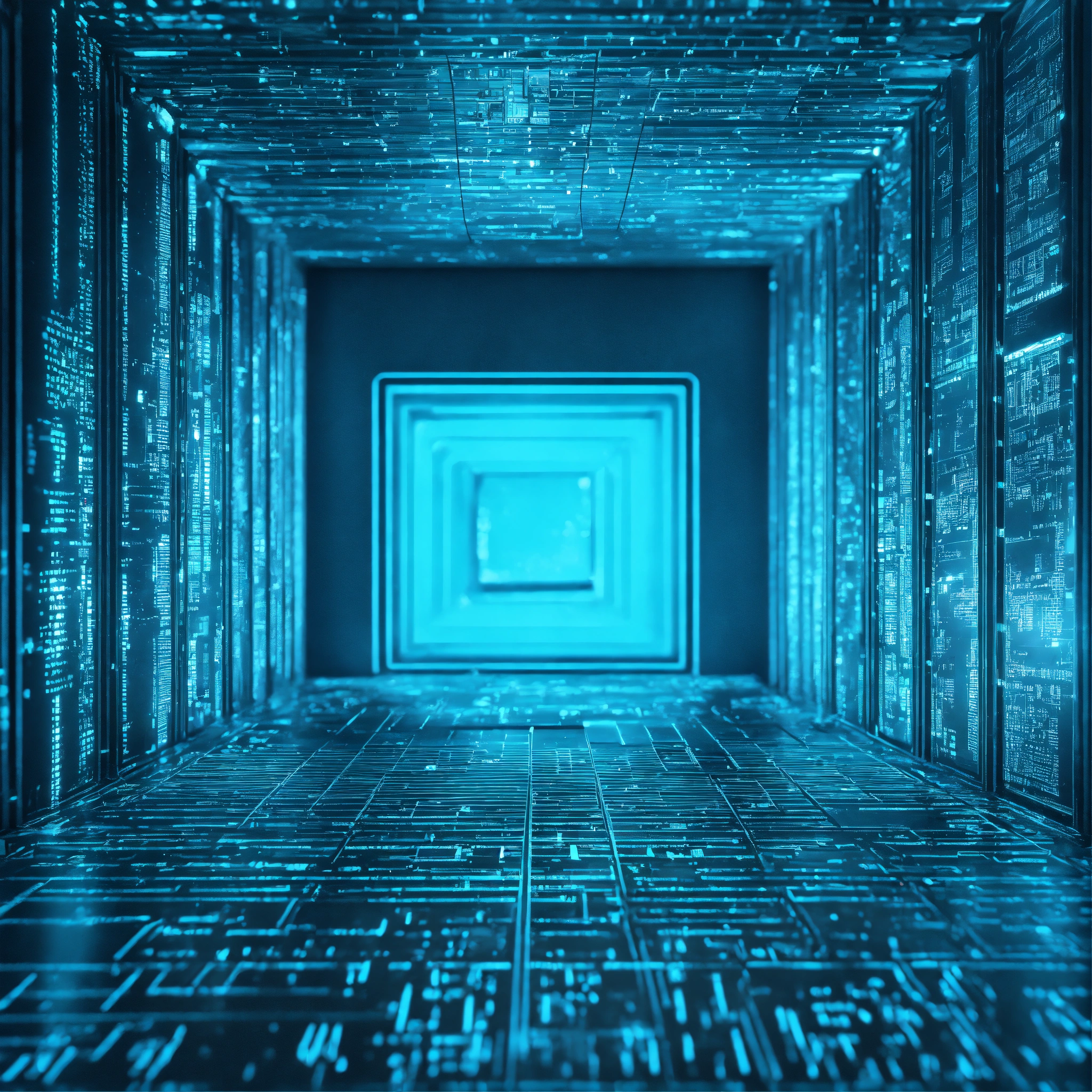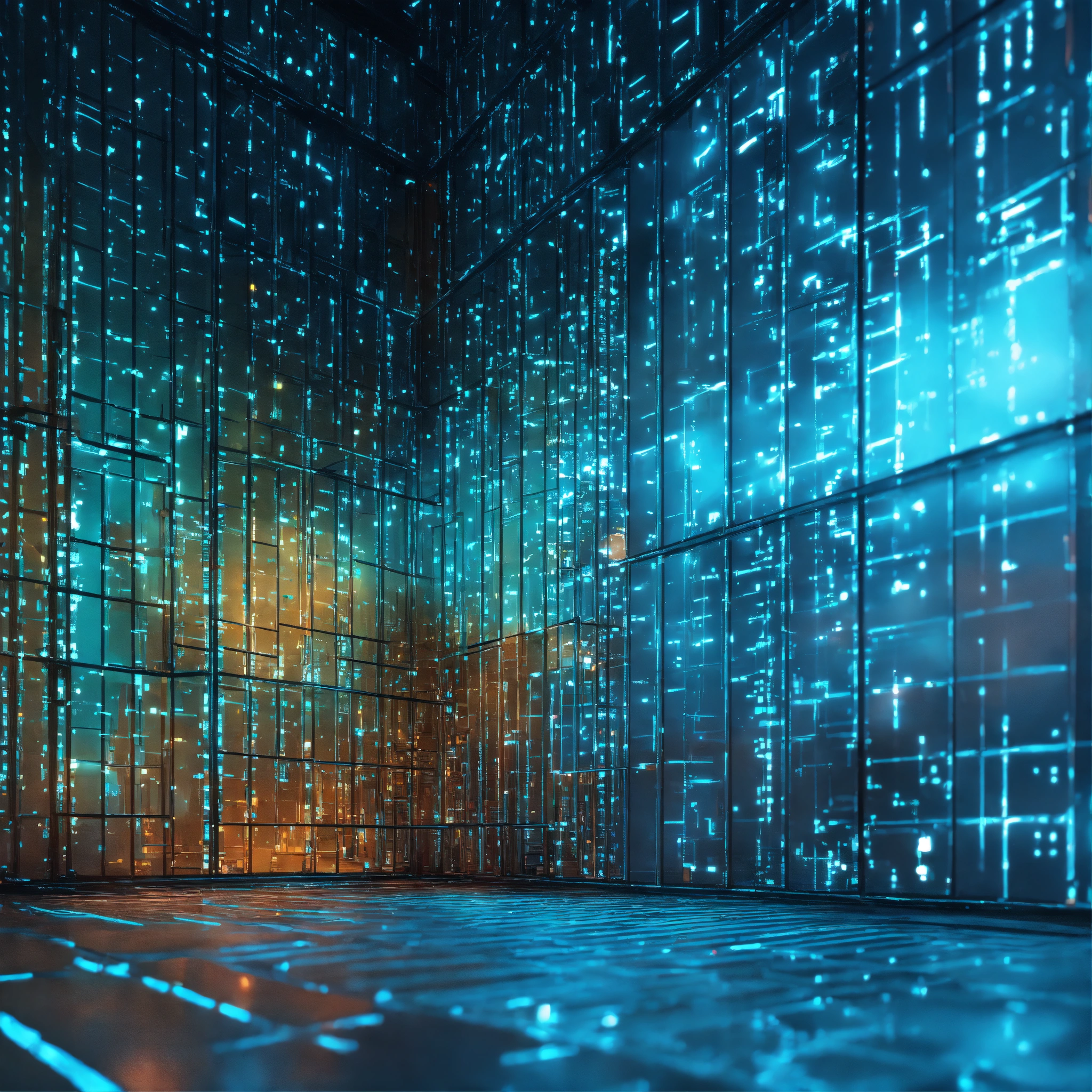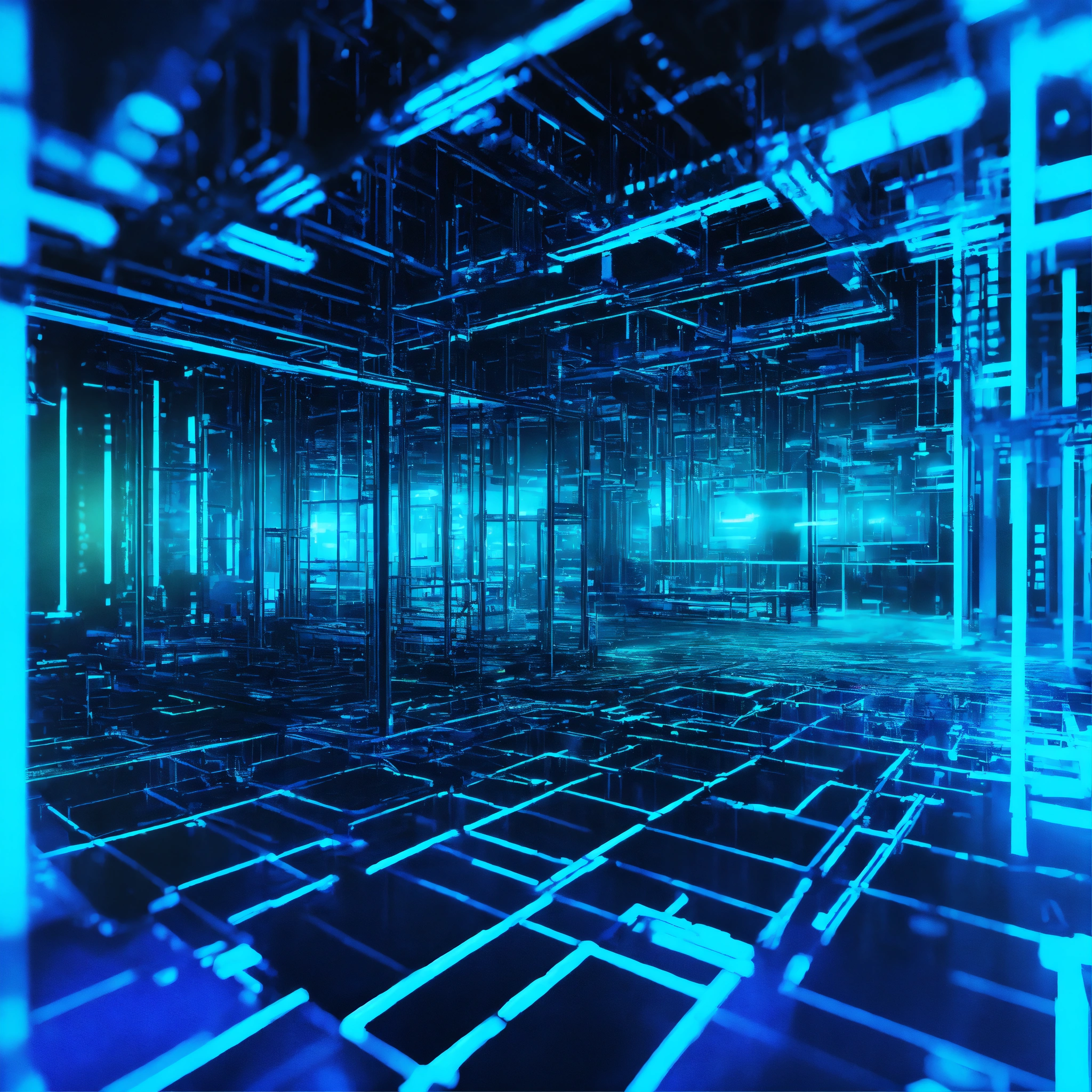 Ultra realistic bright photo of a very high tech 3d software code structure lit with bright blue and turquoise light