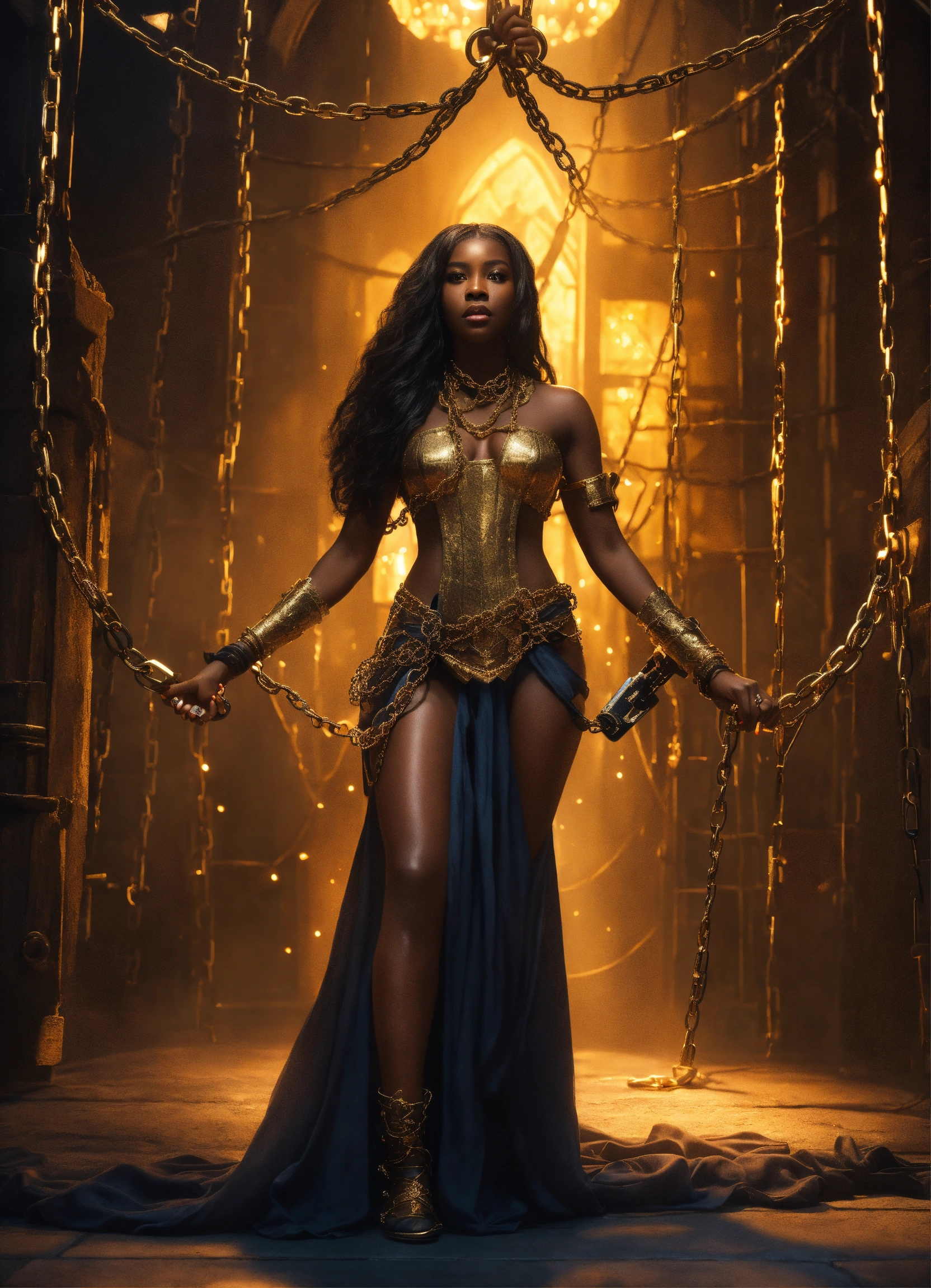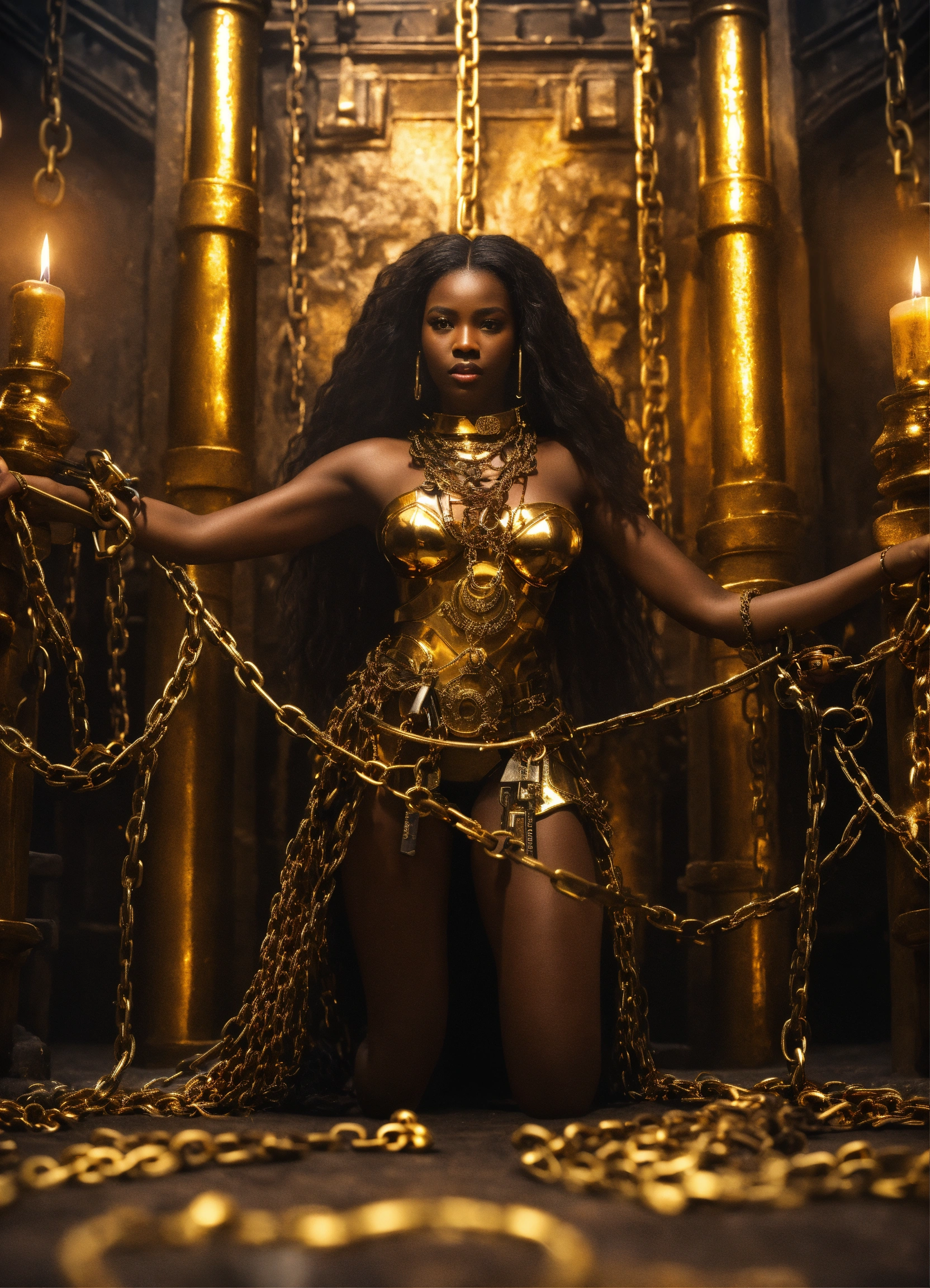 Full body beautiful black goddess chained by enemies chained to the ceiling of a dark dungeon hands chained above her, beautiful black woman with dark brown skin, beautiful perfect face, shapely hour-glass figure long flowing hair, fully clothed sparkling gold armor and gold accessories, chained by enemies chained to the ceiling of a dark dungeon hands chained above her, high detail, realistic photo, high detail, digital painting, cinematic, stunning, hyper-realistic, sharp focus, high resolution 8k, insanely detailed