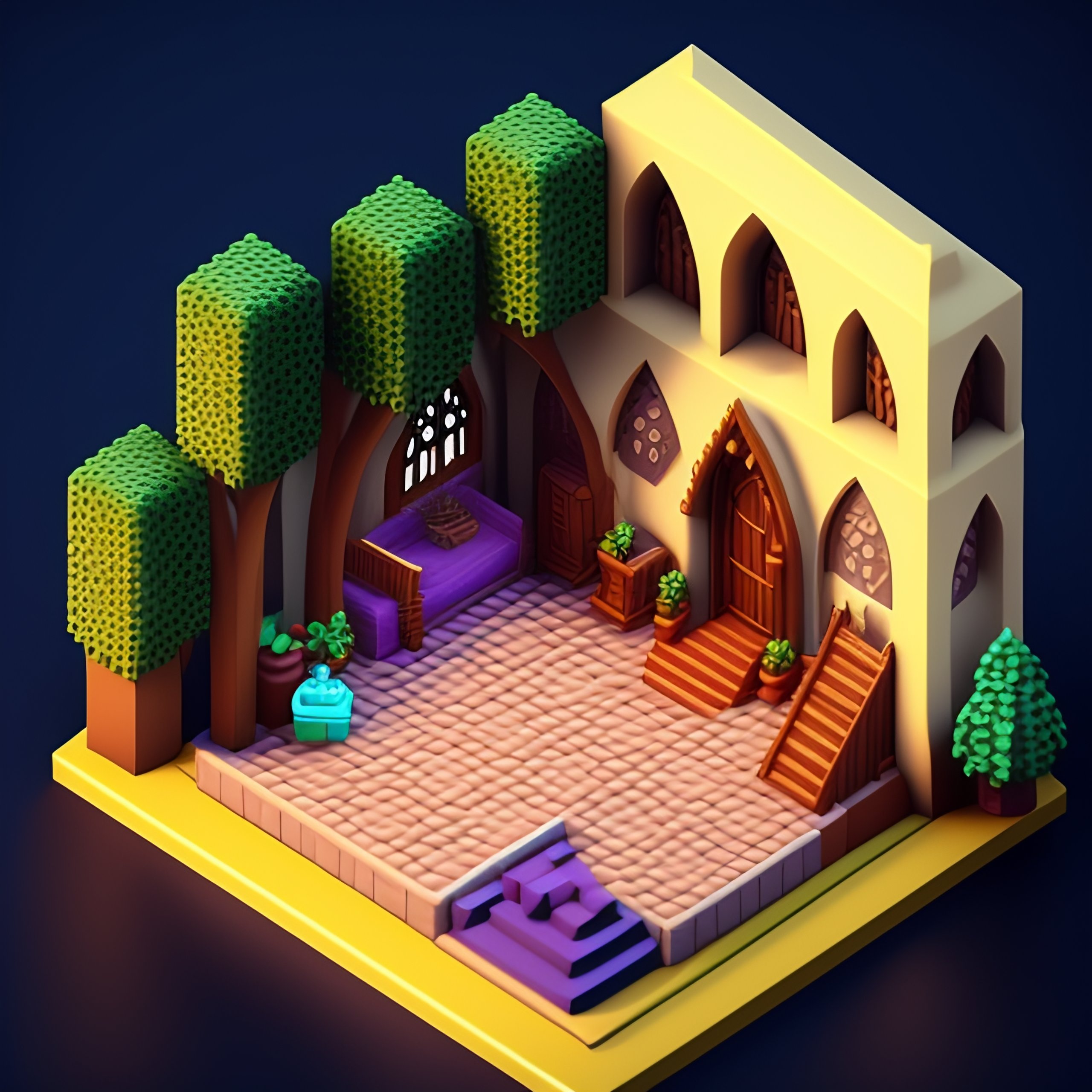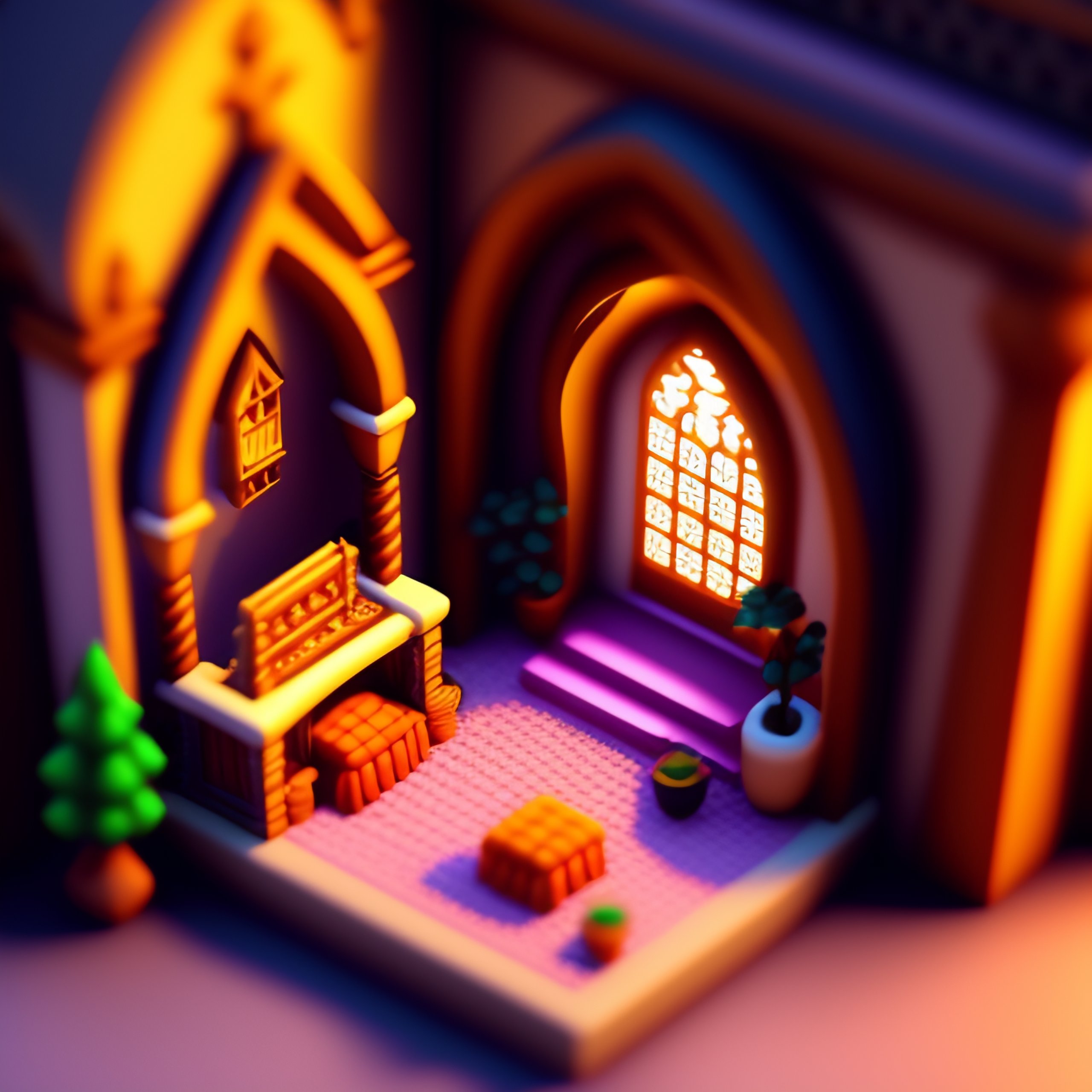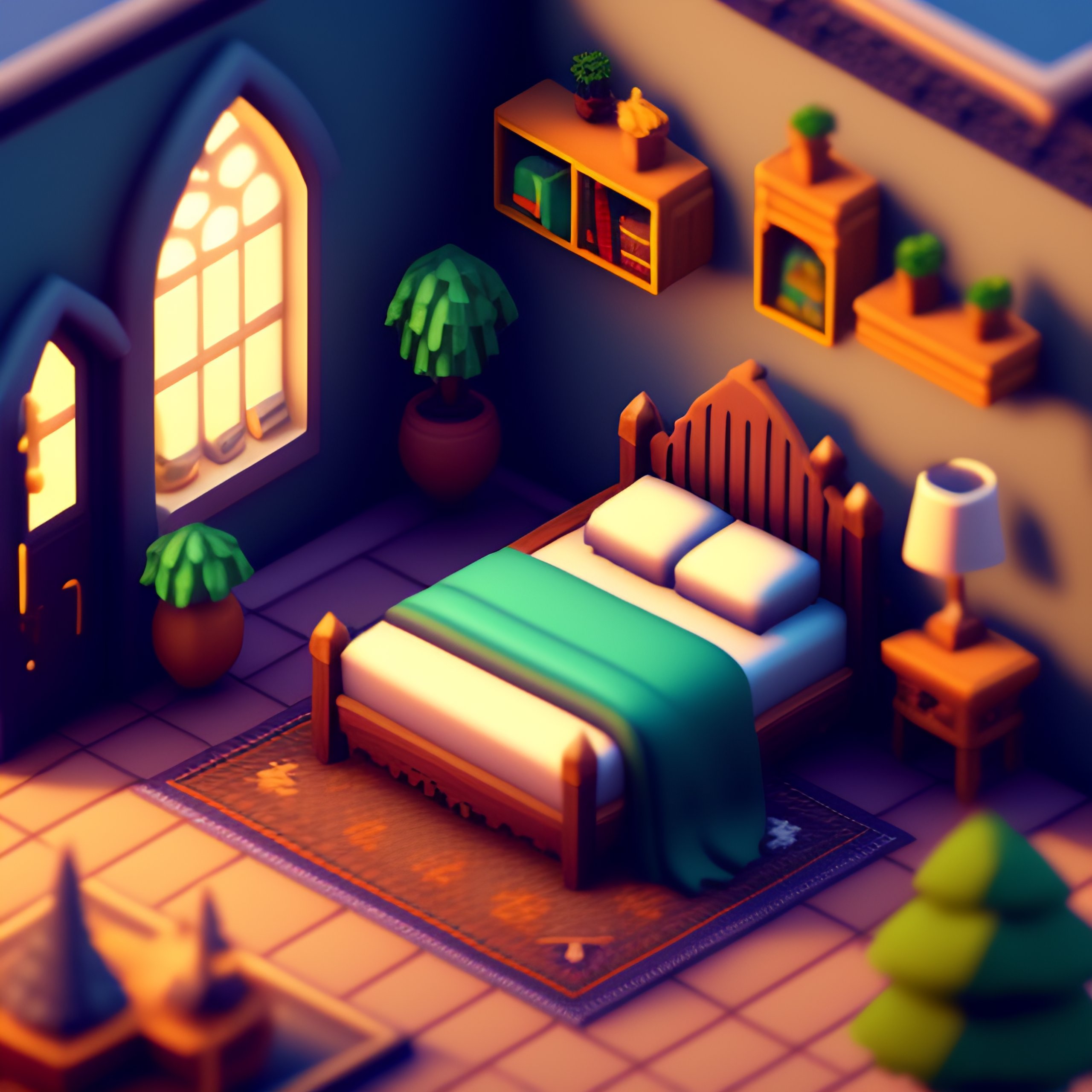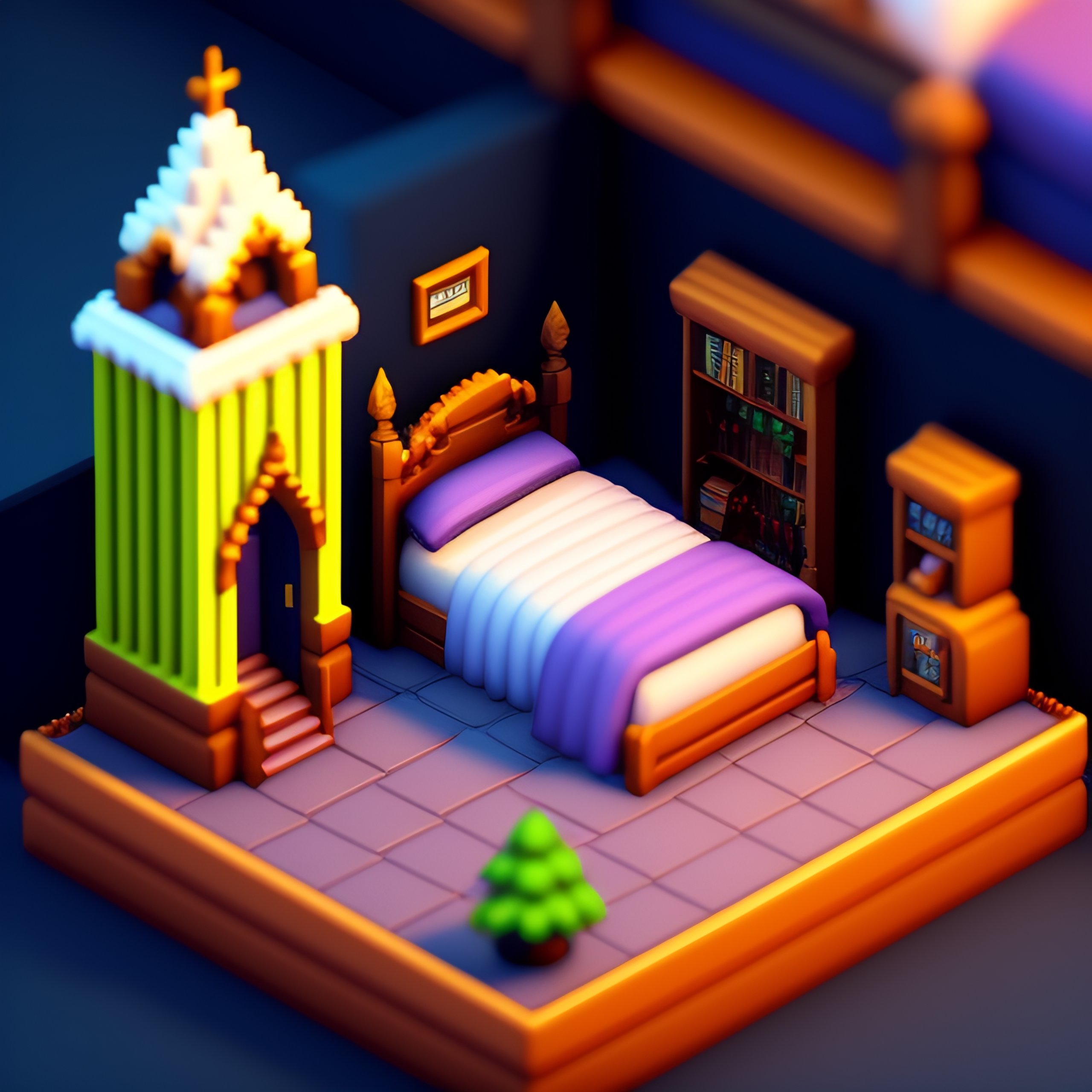 Detailed isometric habbo cathedral bedroom, video games, very cozy, nostalgia, unreal engine voxel render